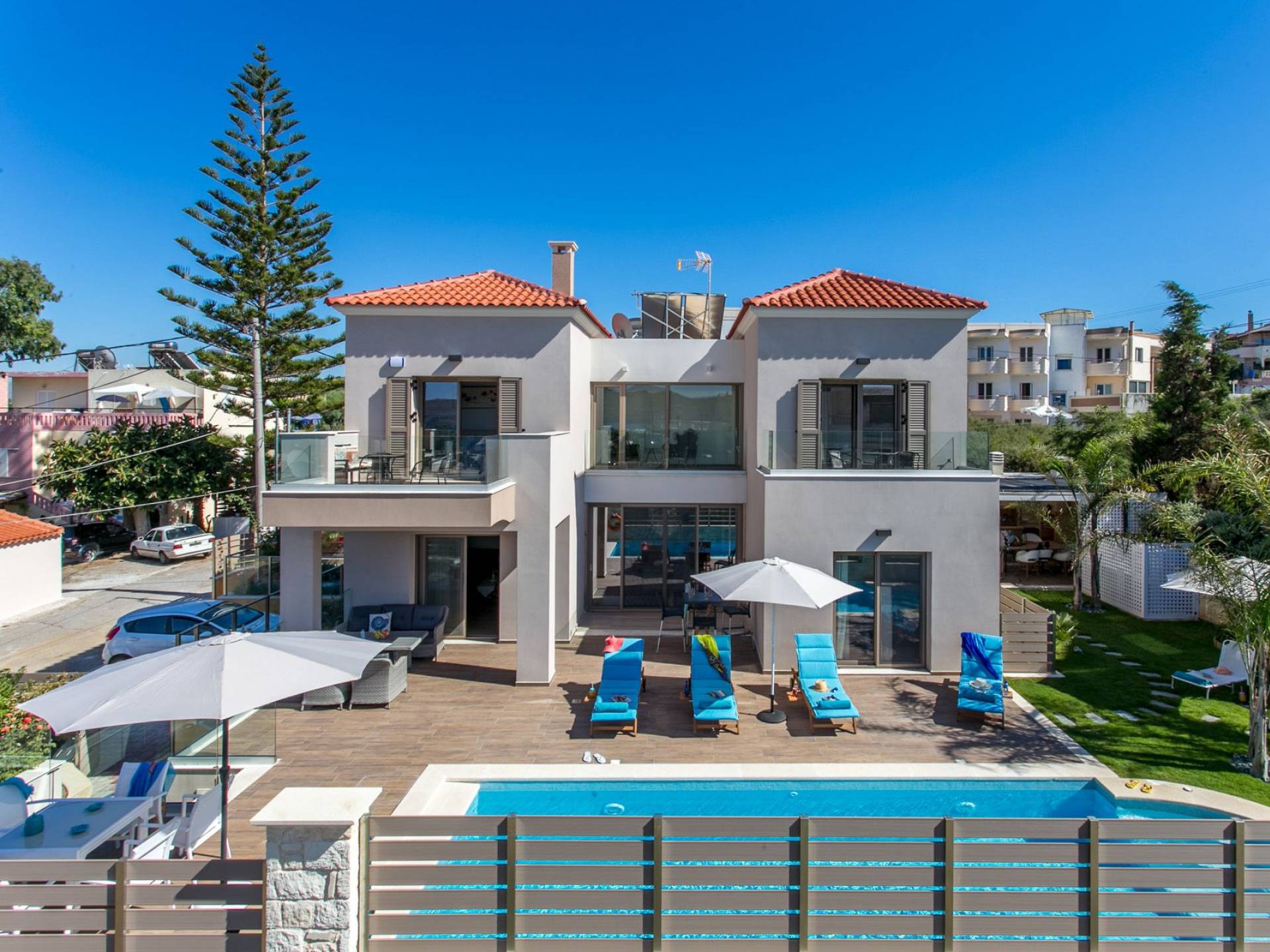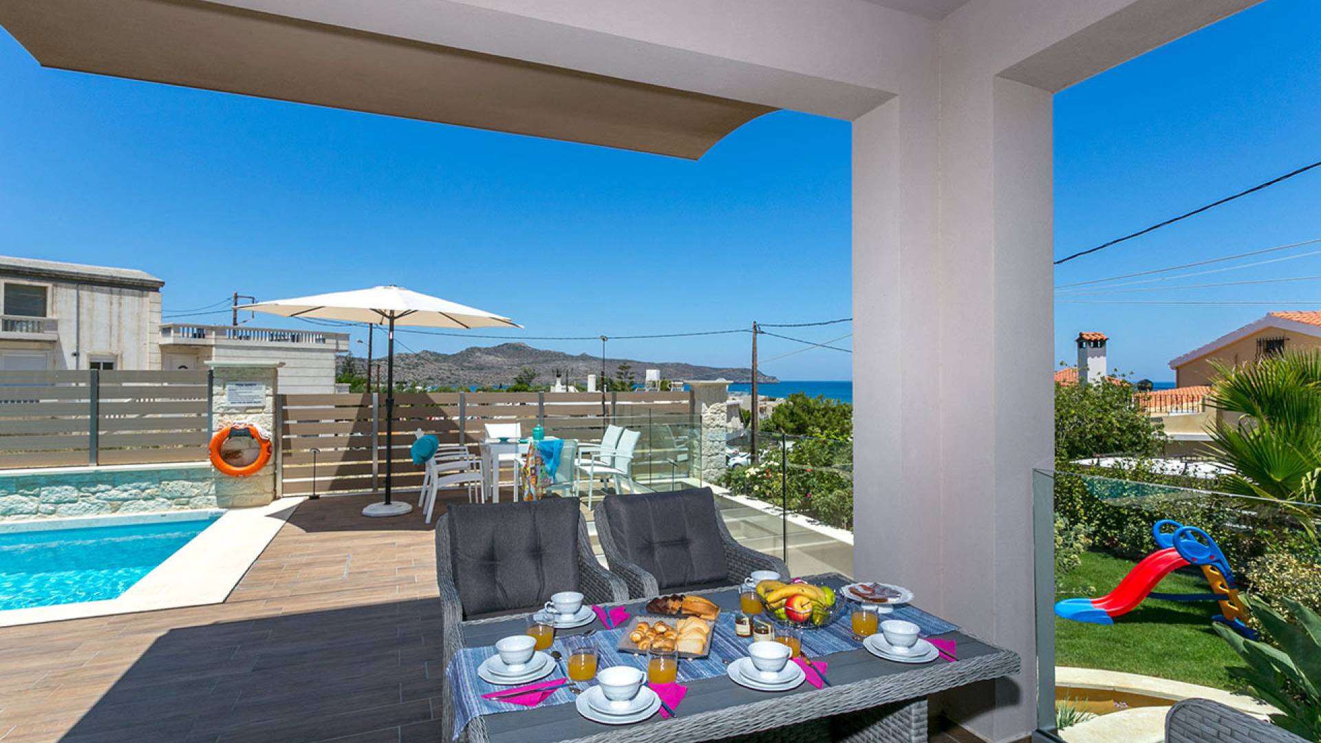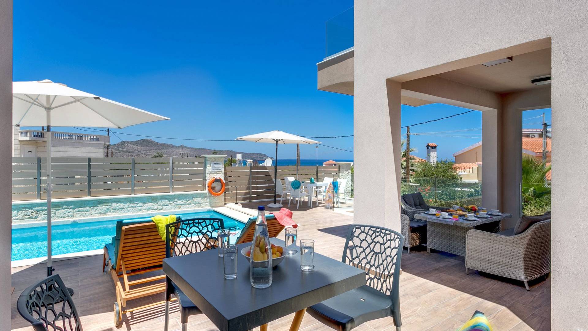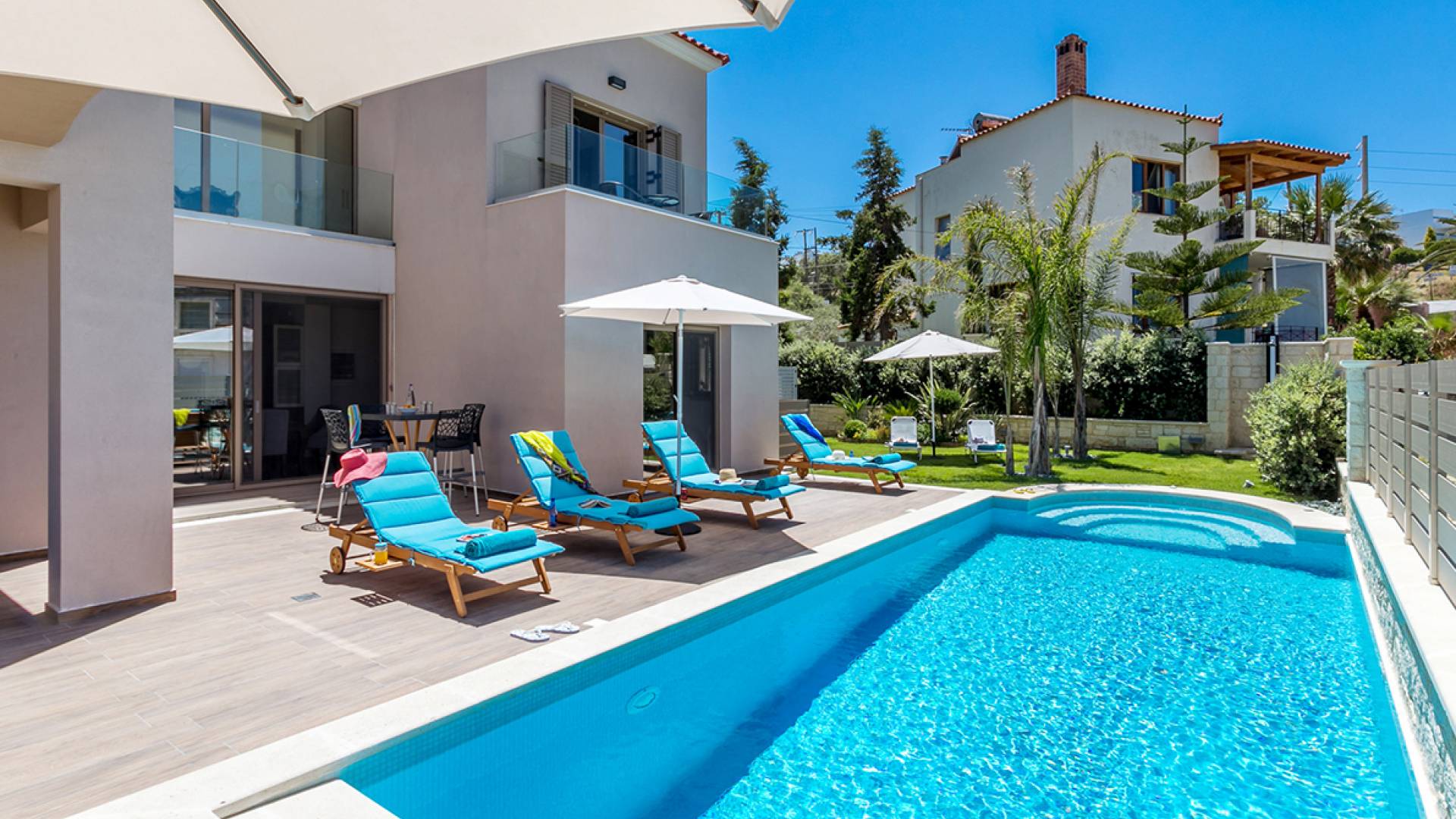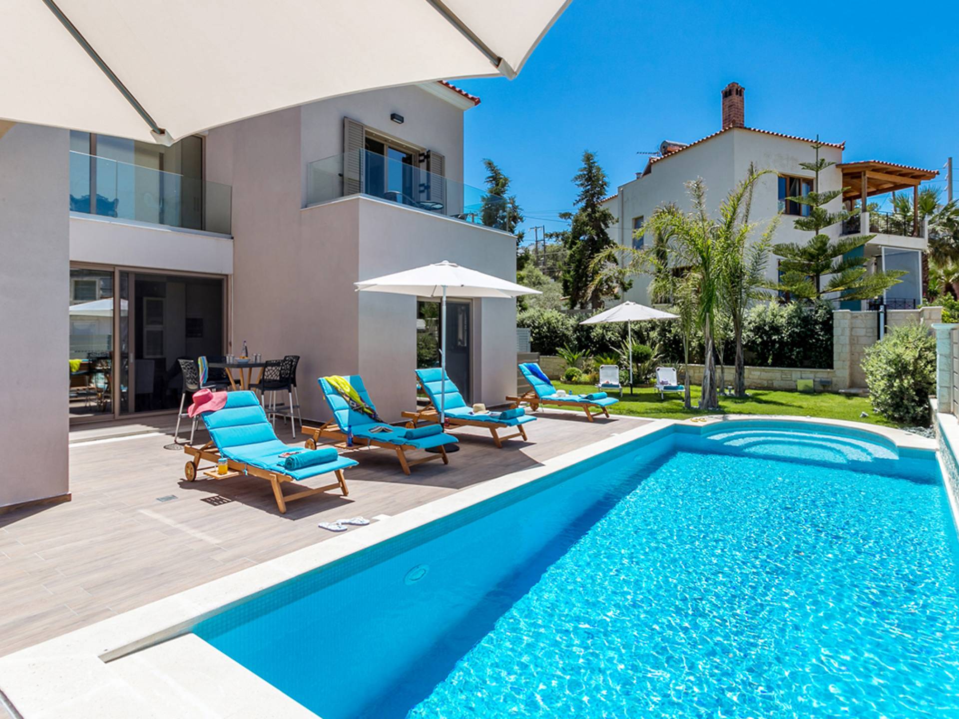 Séjourner dans une villa à Agia Marina, c’est vivre des vacances haut de gamme. Imaginez vue panoramique sur la mer, piscine privée, jardin verdoyant et intérieur méditerranéen moderne. Que vous voyagiez en couple, en famille ou entre amis, vous trouverez des villas pour tous les goûts — des retraites cosy aux résidences luxueuses.