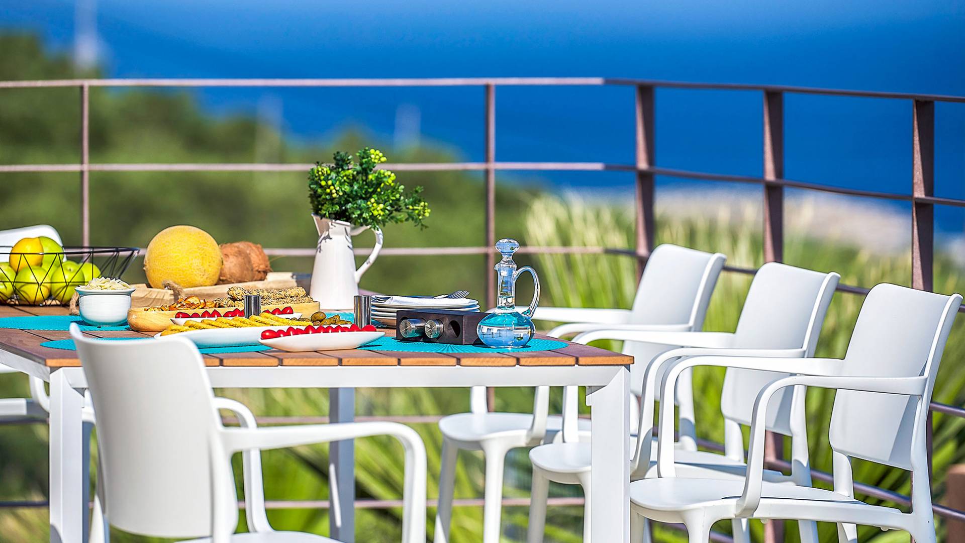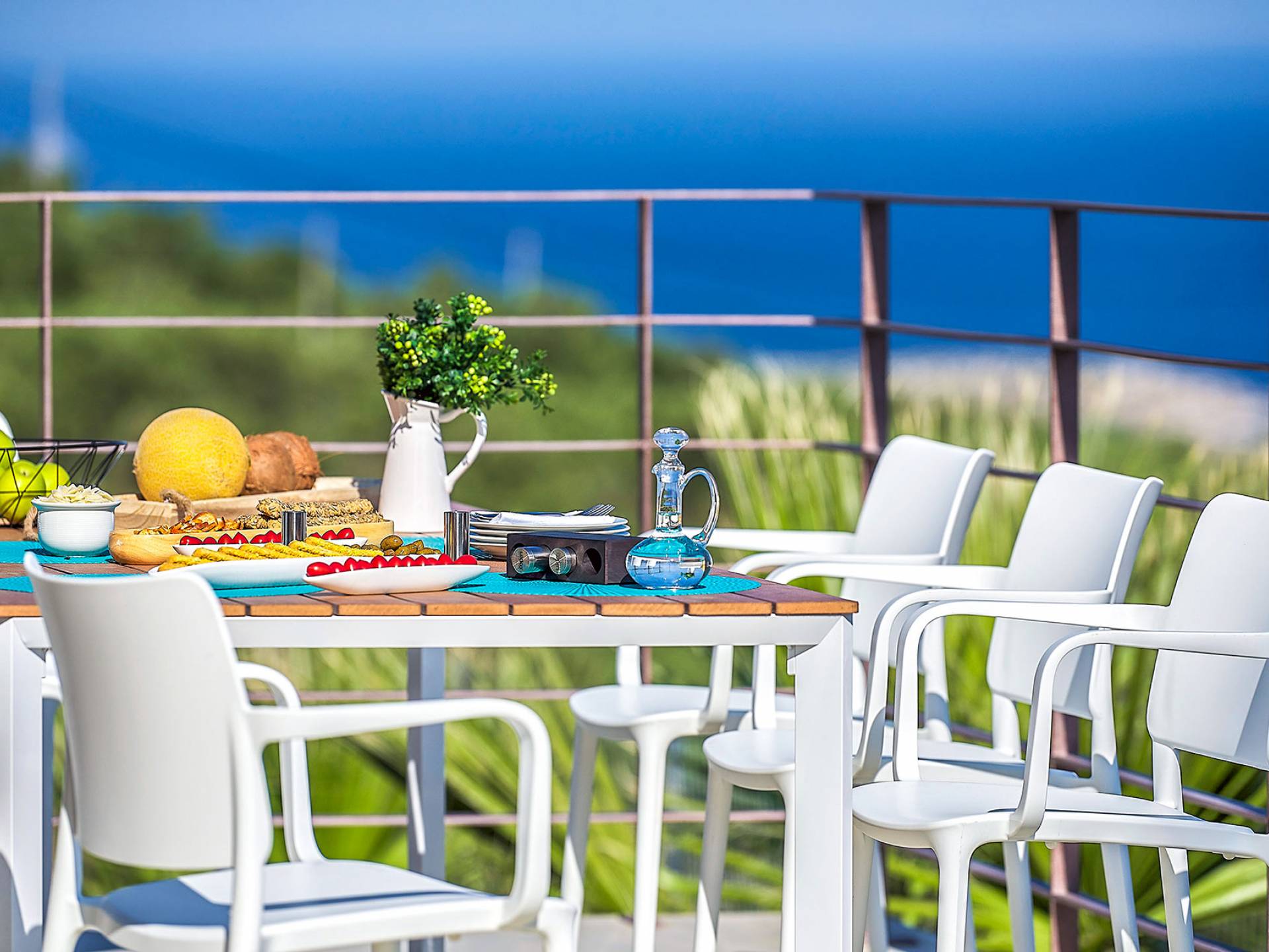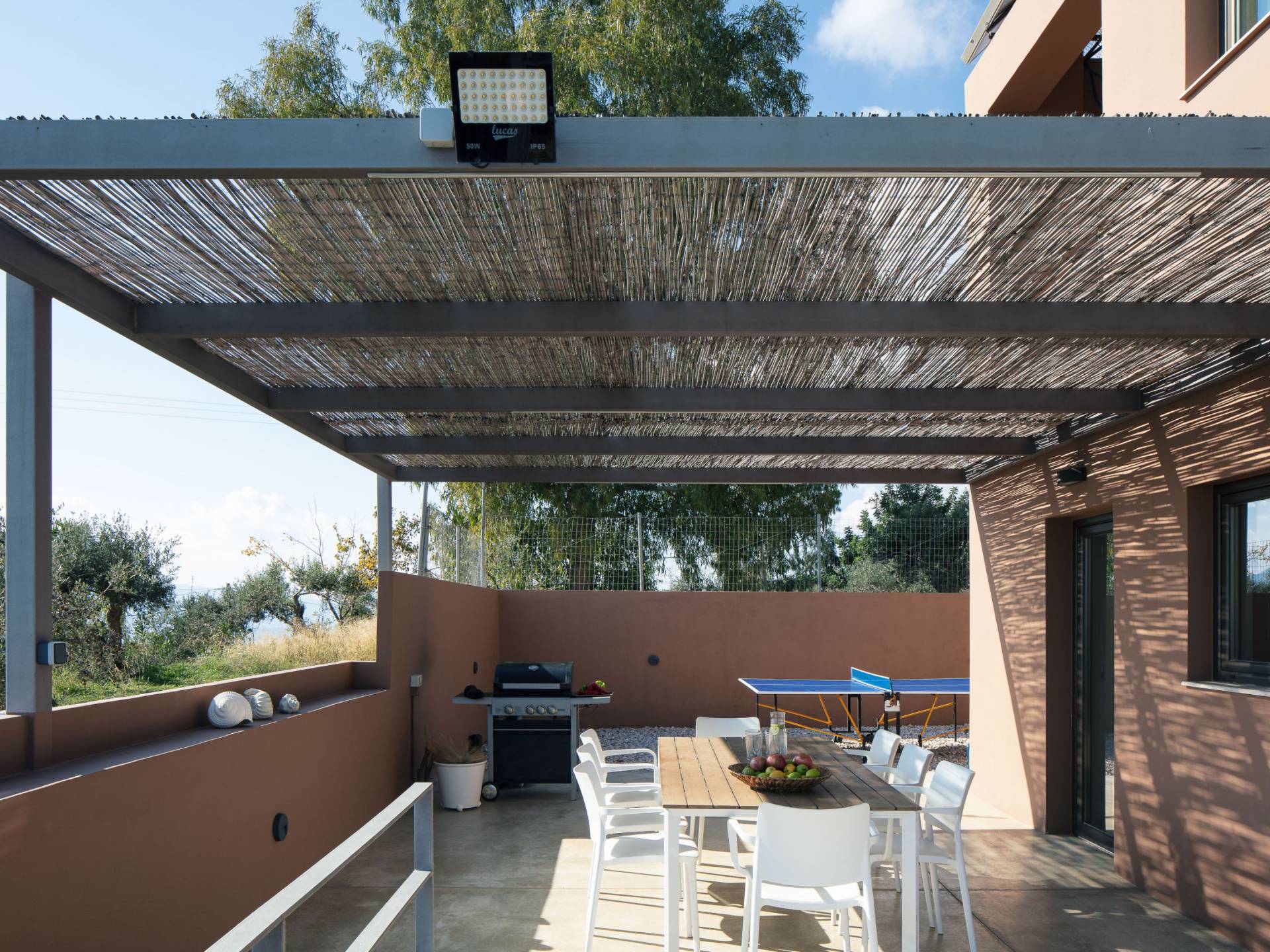 L'espace extérieur magnifiquement aménagé de la Villa Niolos 2, rempli de fleurs et de palmiers, offre une vue imprenable sur la mer, ainsi qu'une variété d'installations qui comprennent : - Un espace privé de 50 m². piscine avec un compartiment spécial pour les enfants - Barbecue à gaz entièrement équipé - Espaces repas extérieurs - Espace couvert de pelouse au bord de la piscine, idéal pour les jeux des enfants - Table de ping-pong - Divers emplacements aménagés (avec transats, parasols, ombre salon extérieur et hamacs) pour se détendre dans les jardins autour de la villa, la terrasse de la piscine, la véranda et les balcons. - Tout l'espace extérieur est entièrement clôturé, offrant intimité et sécurité à nos clients - Place de parking pour 3 voitures