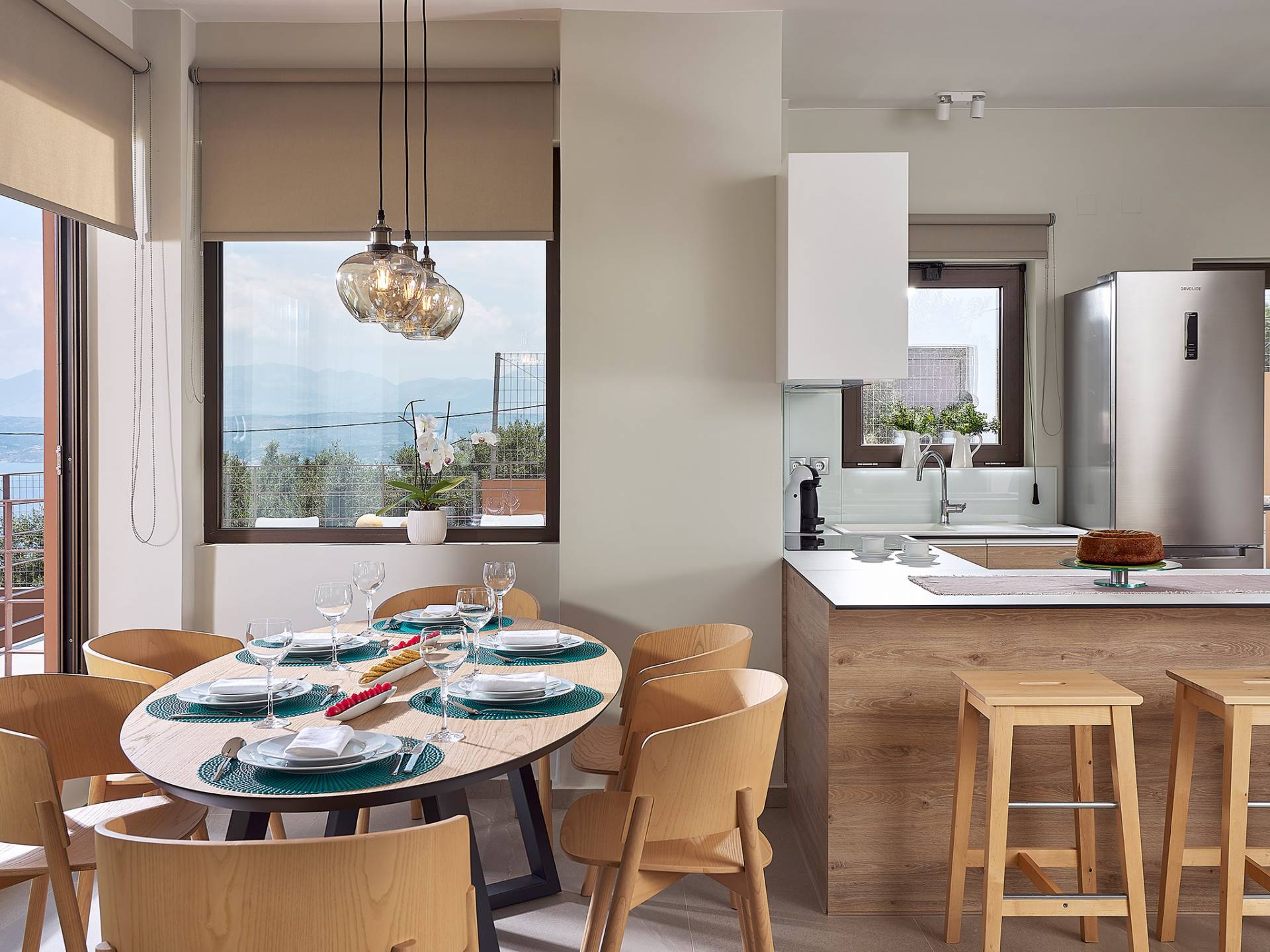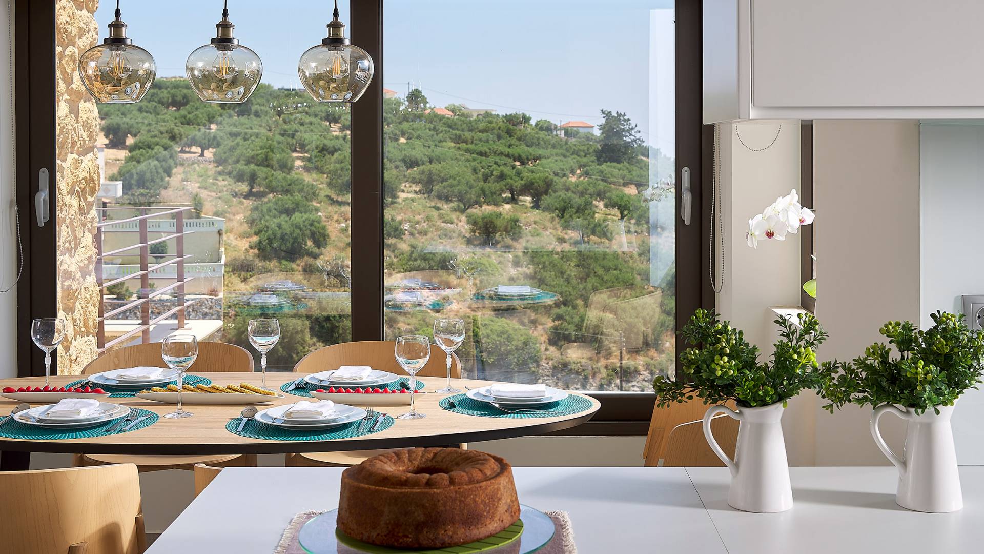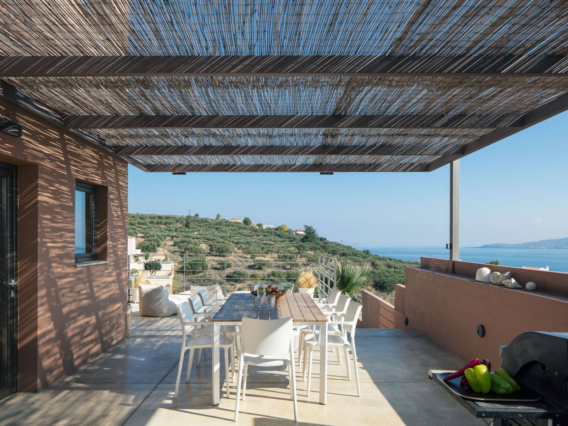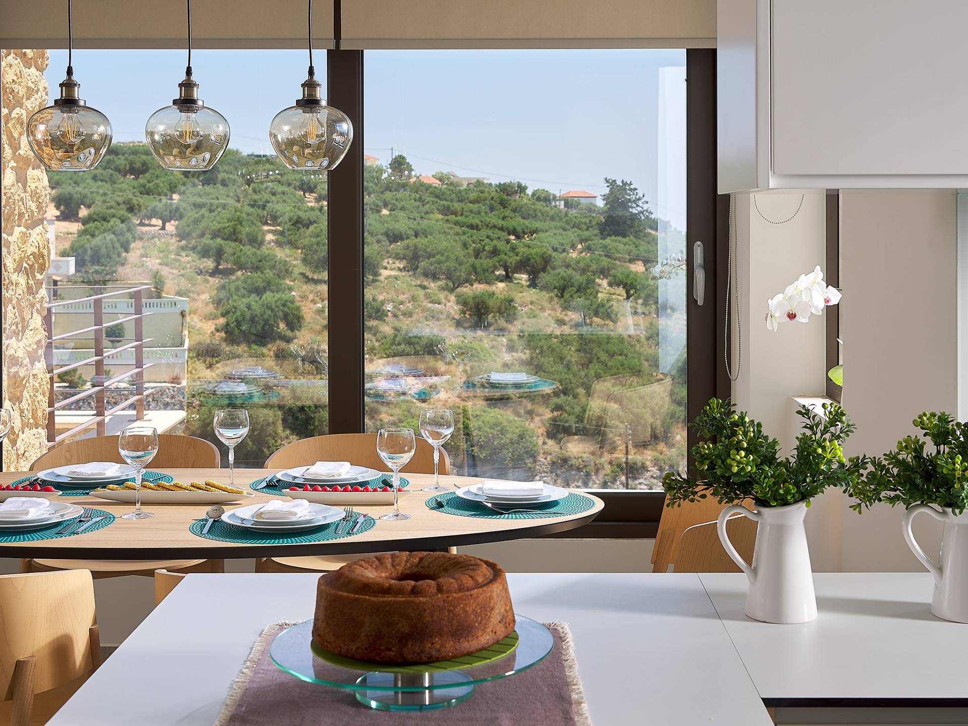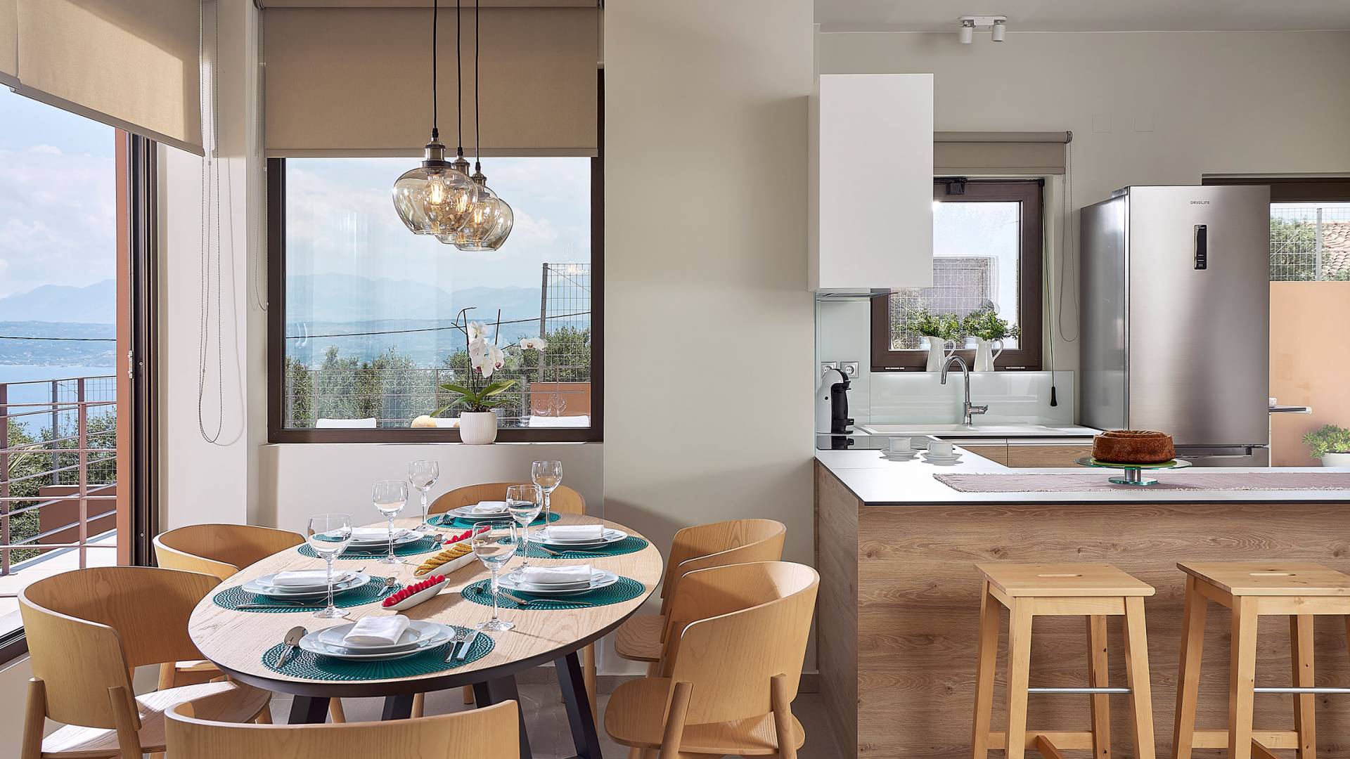 La décoration intérieure de la Villa Niolos 2 est moderne et son agencement fonctionnel, pouvant accueillir confortablement 5 personnes dans ses 3 chambres et jusqu'à 7 personnes si nécessaire. En entrant dans la villa au rez-de-chaussée, vous trouverez un spacieux espace ouvert composé du salon et de la cuisine. Le salon dispose d'un confortable canapé d'angle, d'une table basse, d'un téléviseur HD 55'' et d'un coin repas intérieur et offre un accès direct à une véranda équipée de mobilier de jardin. À côté, la cuisine est entièrement équipée avec tous les appareils essentiels pour rendre vos vacances indépendantes aussi faciles que possible et offre un comptoir de petit-déjeuner et un accès direct à une véranda avec un coin repas extérieur et un barbecue à gaz. Toute la pièce est lumineuse et aérée et bénéficie de belles vues sur la mer. Une salle de bains avec douche et un débarras séparé avec lave-linge se trouvent également au même étage.