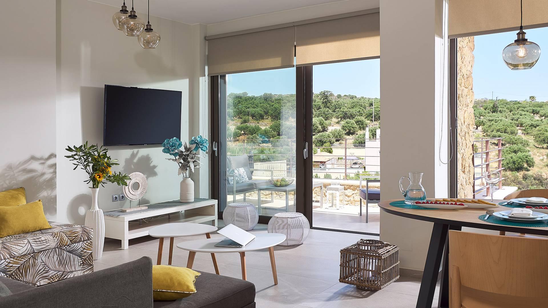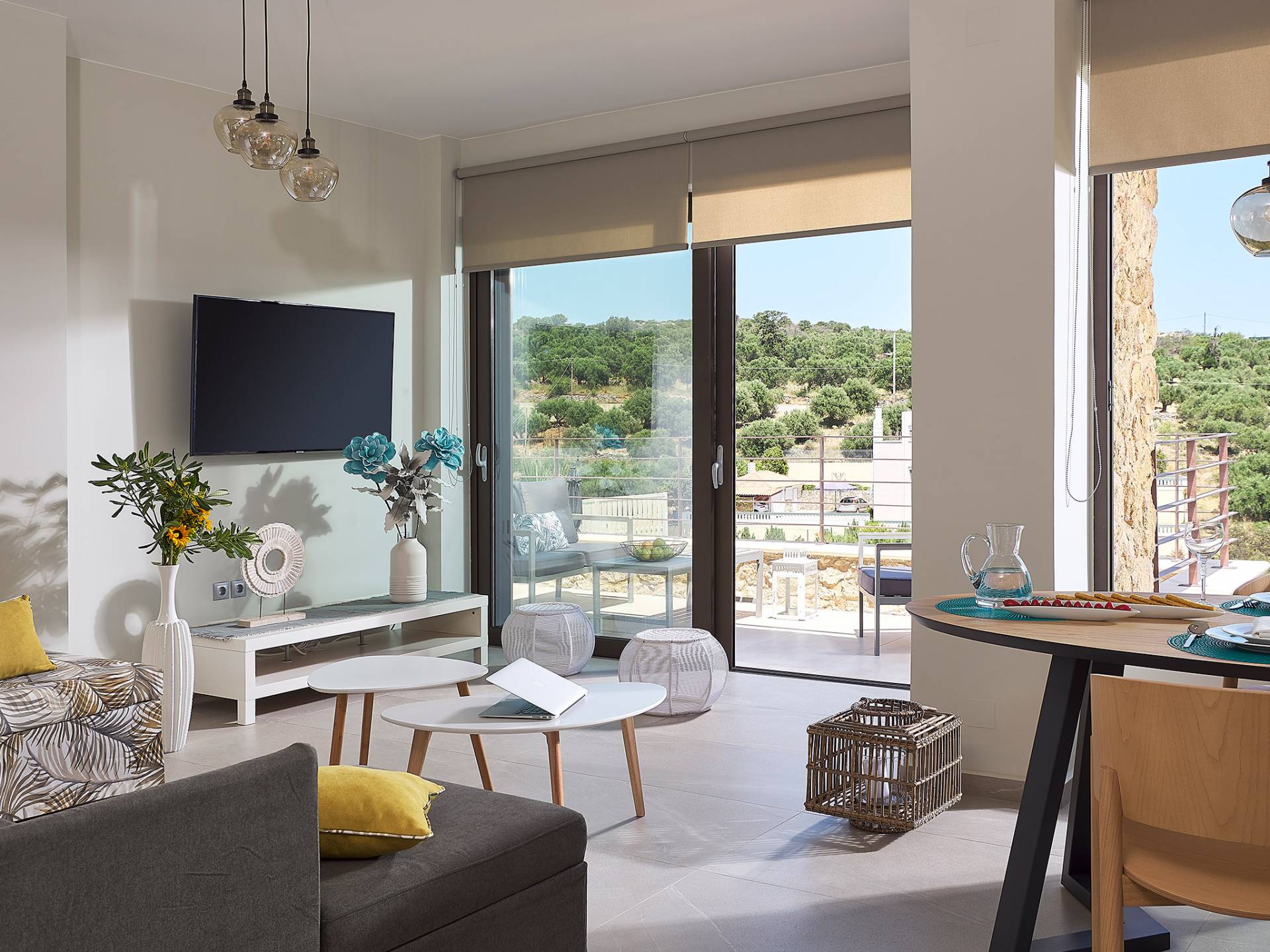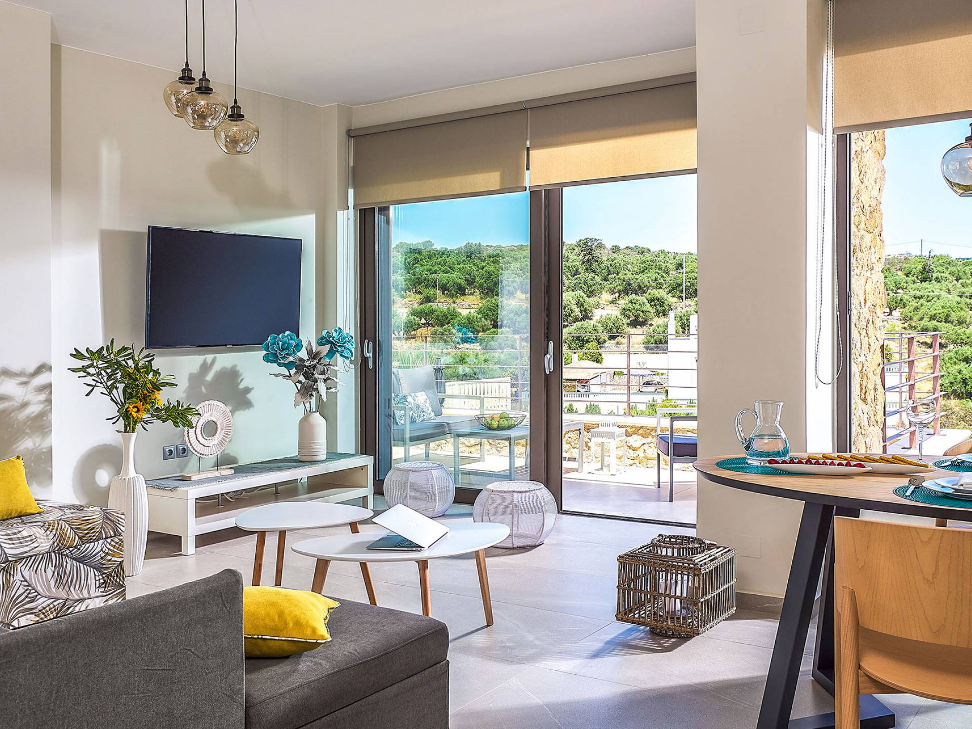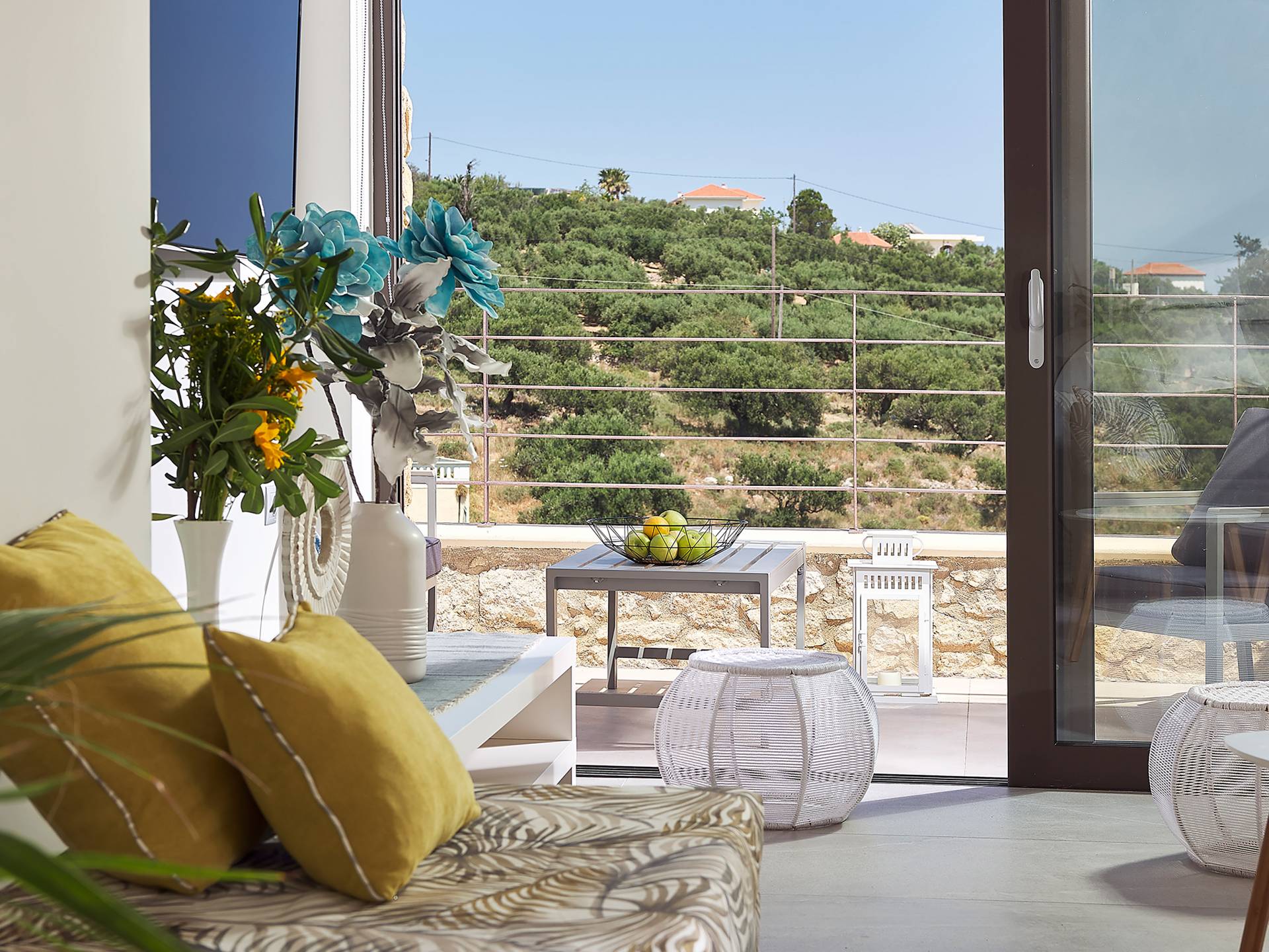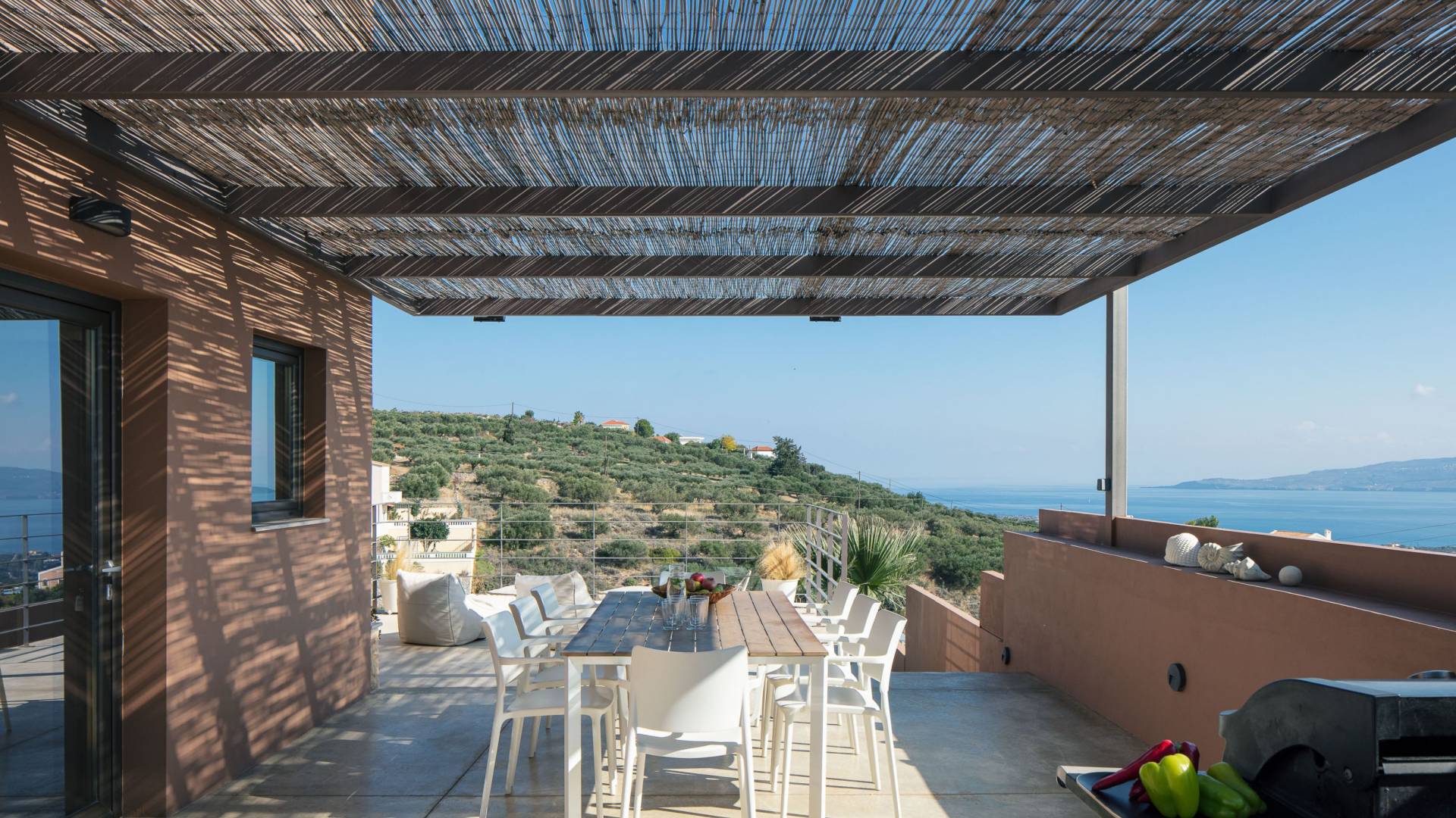 La décoration intérieure de la Villa Niolos 2 est moderne et son agencement fonctionnel, pouvant accueillir confortablement 5 personnes dans ses 3 chambres et jusqu'à 7 personnes si nécessaire. En entrant dans la villa au rez-de-chaussée, vous trouverez un spacieux espace ouvert composé du salon et de la cuisine. Le salon dispose d'un confortable canapé d'angle, d'une table basse, d'un téléviseur HD 55'' et d'un coin repas intérieur et offre un accès direct à une véranda équipée de mobilier de jardin. À côté, la cuisine est entièrement équipée avec tous les appareils essentiels pour rendre vos vacances indépendantes aussi faciles que possible et offre un comptoir de petit-déjeuner et un accès direct à une véranda avec un coin repas extérieur et un barbecue à gaz. Toute la pièce est lumineuse et aérée et bénéficie de belles vues sur la mer. Une salle de bains avec douche et un débarras séparé avec lave-linge se trouvent également au même étage.