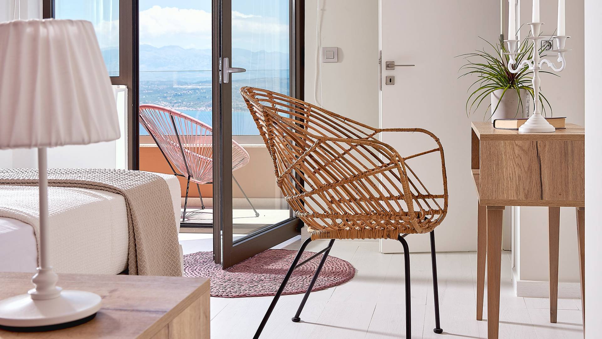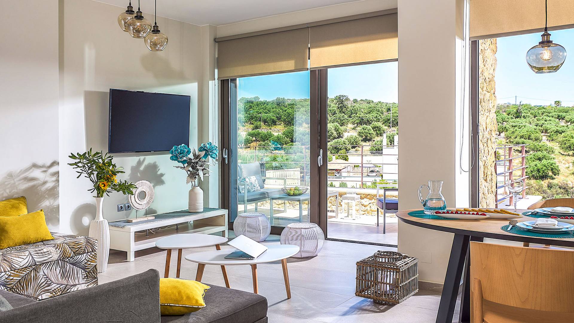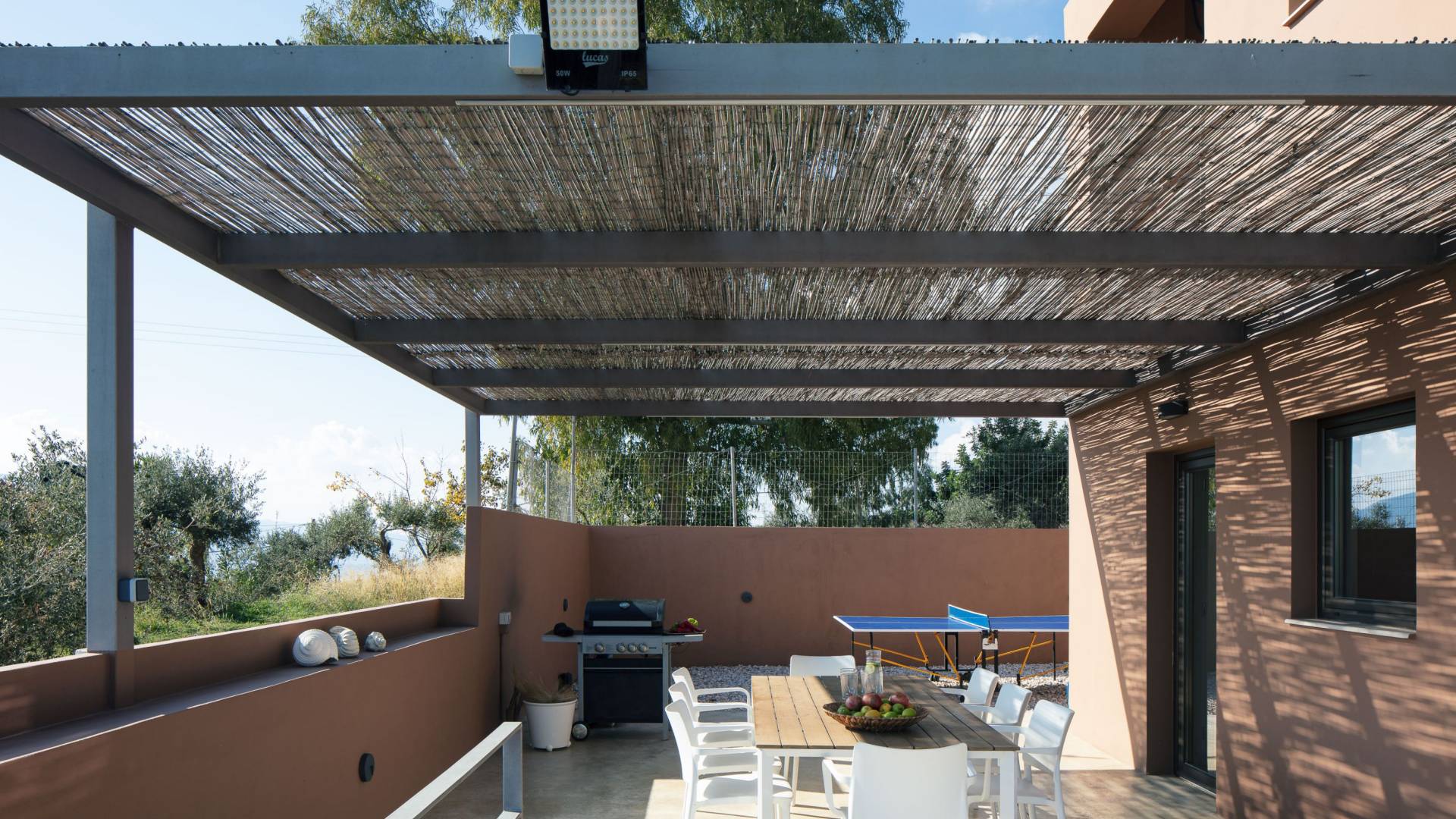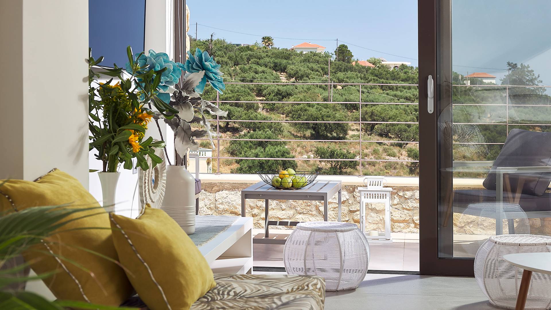 La décoration intérieure de la Villa Niolos 2 est moderne et son agencement fonctionnel, pouvant accueillir confortablement 5 personnes dans ses 3 chambres et jusqu'à 7 personnes si nécessaire. En entrant dans la villa au rez-de-chaussée, vous trouverez un spacieux espace ouvert composé du salon et de la cuisine. Le salon dispose d'un confortable canapé d'angle, d'une table basse, d'un téléviseur HD 55'' et d'un coin repas intérieur et offre un accès direct à une véranda équipée de mobilier de jardin. À côté, la cuisine est entièrement équipée avec tous les appareils essentiels pour rendre vos vacances indépendantes aussi faciles que possible et offre un comptoir de petit-déjeuner et un accès direct à une véranda avec un coin repas extérieur et un barbecue à gaz. Toute la pièce est lumineuse et aérée et bénéficie de belles vues sur la mer. Une salle de bains avec douche et un débarras séparé avec lave-linge se trouvent également au même étage.