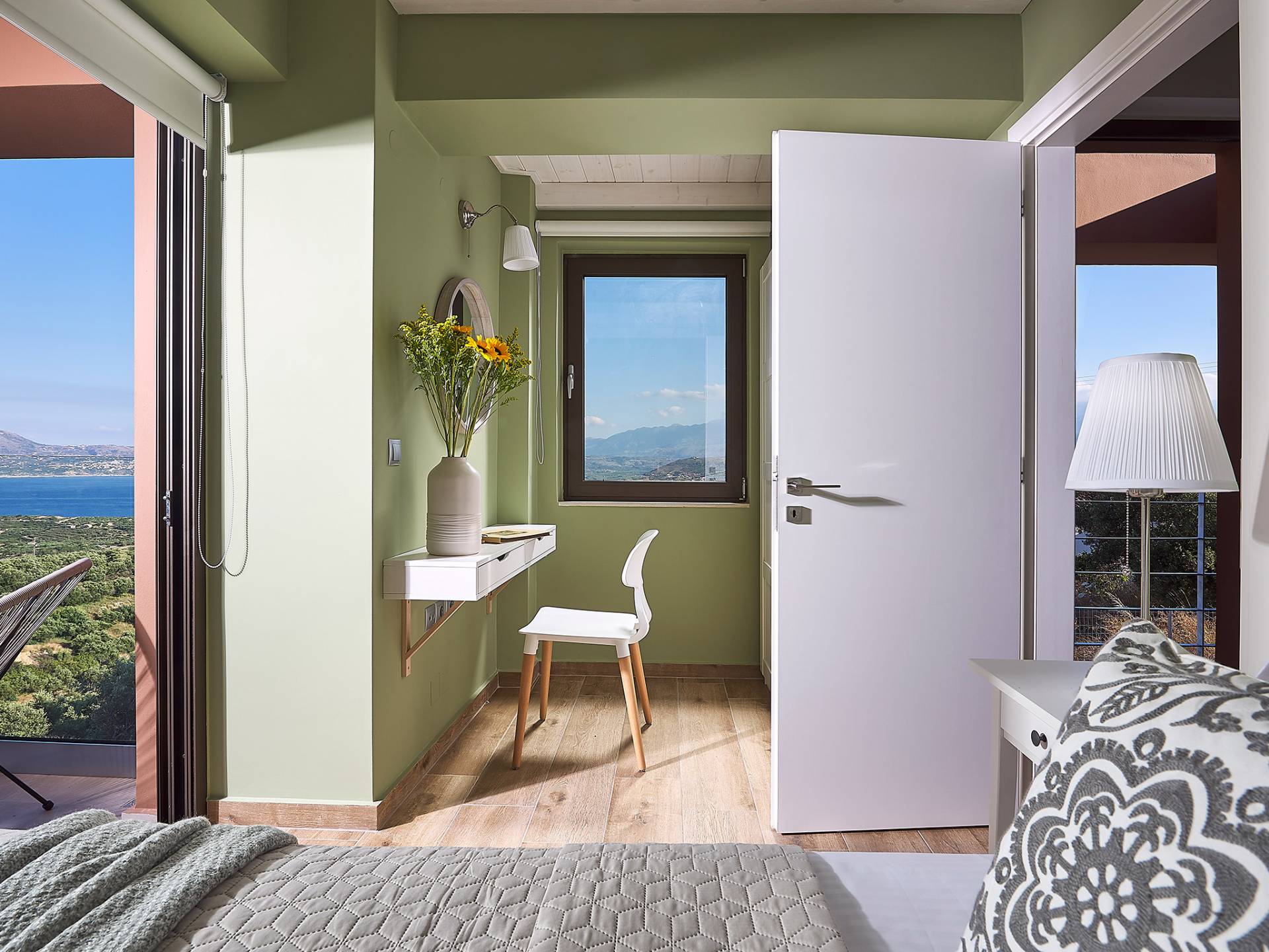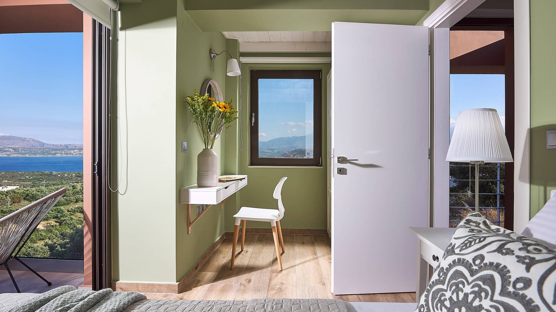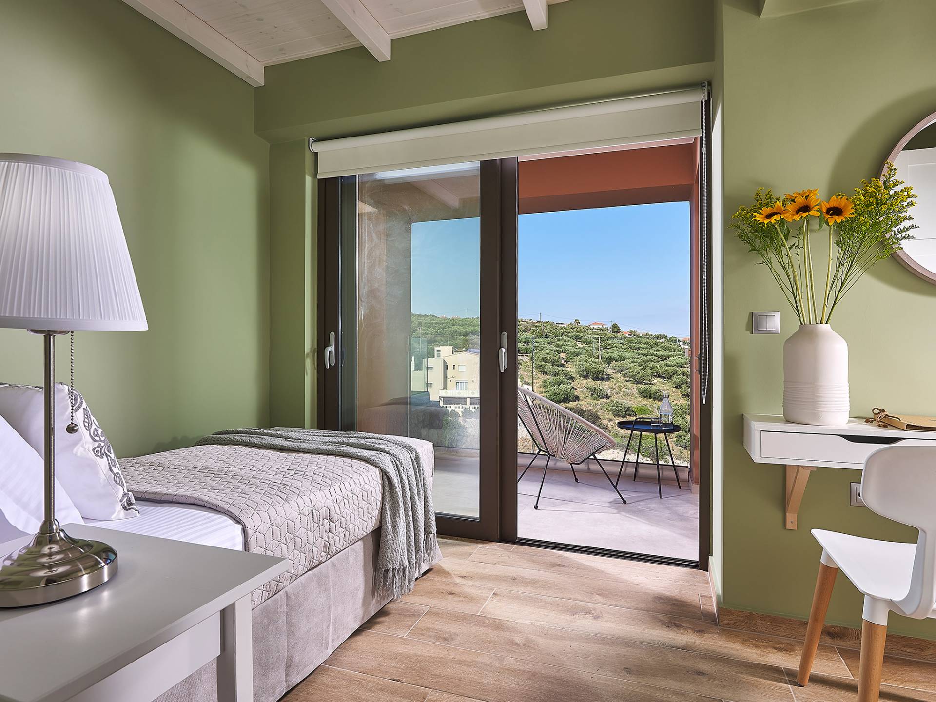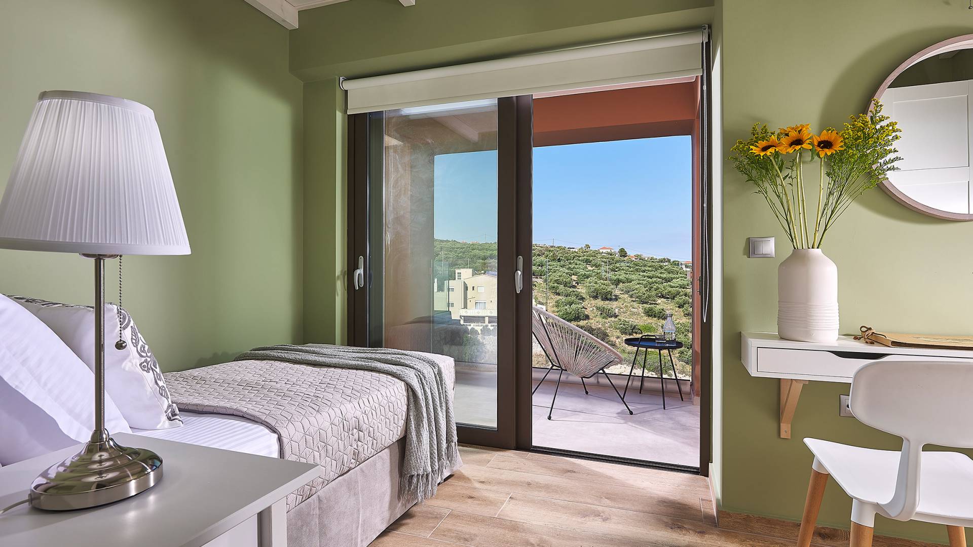 En suivant les escaliers jusqu'au deuxième étage, vous arriverez à un magnifique grenier qui abrite la chambre principale. La chambre dispose d'un lit double (1,60 X 2,00), d'un placard ouvert, d'un petit réfrigérateur et d'une salle de bain attenante avec cabine de douche. De grandes portes et fenêtres donnent sur un balcon privé avec un coin salon offrant une vue panoramique sur la baie de Souda, la mer et les environs et surplombant également la piscine.