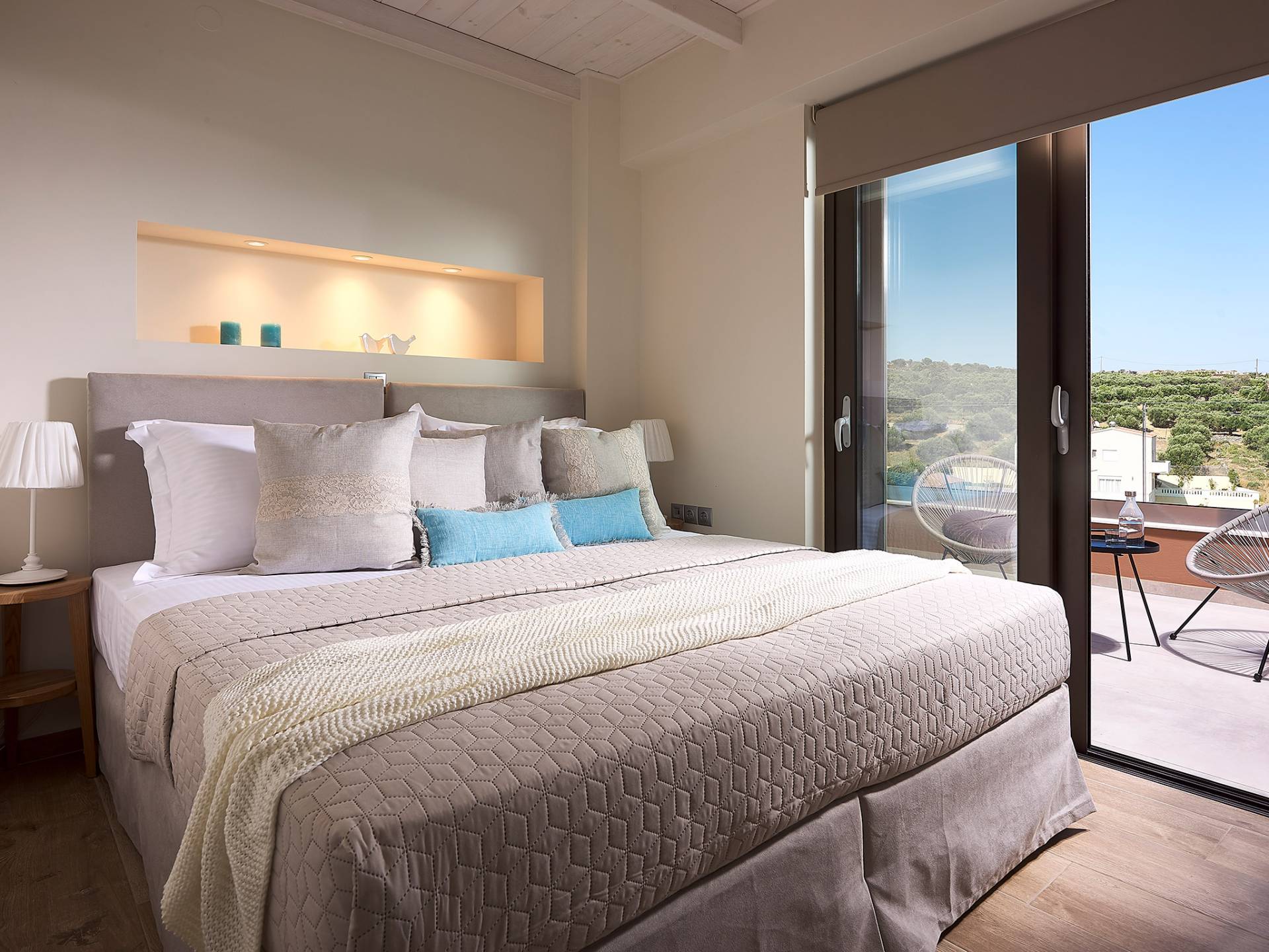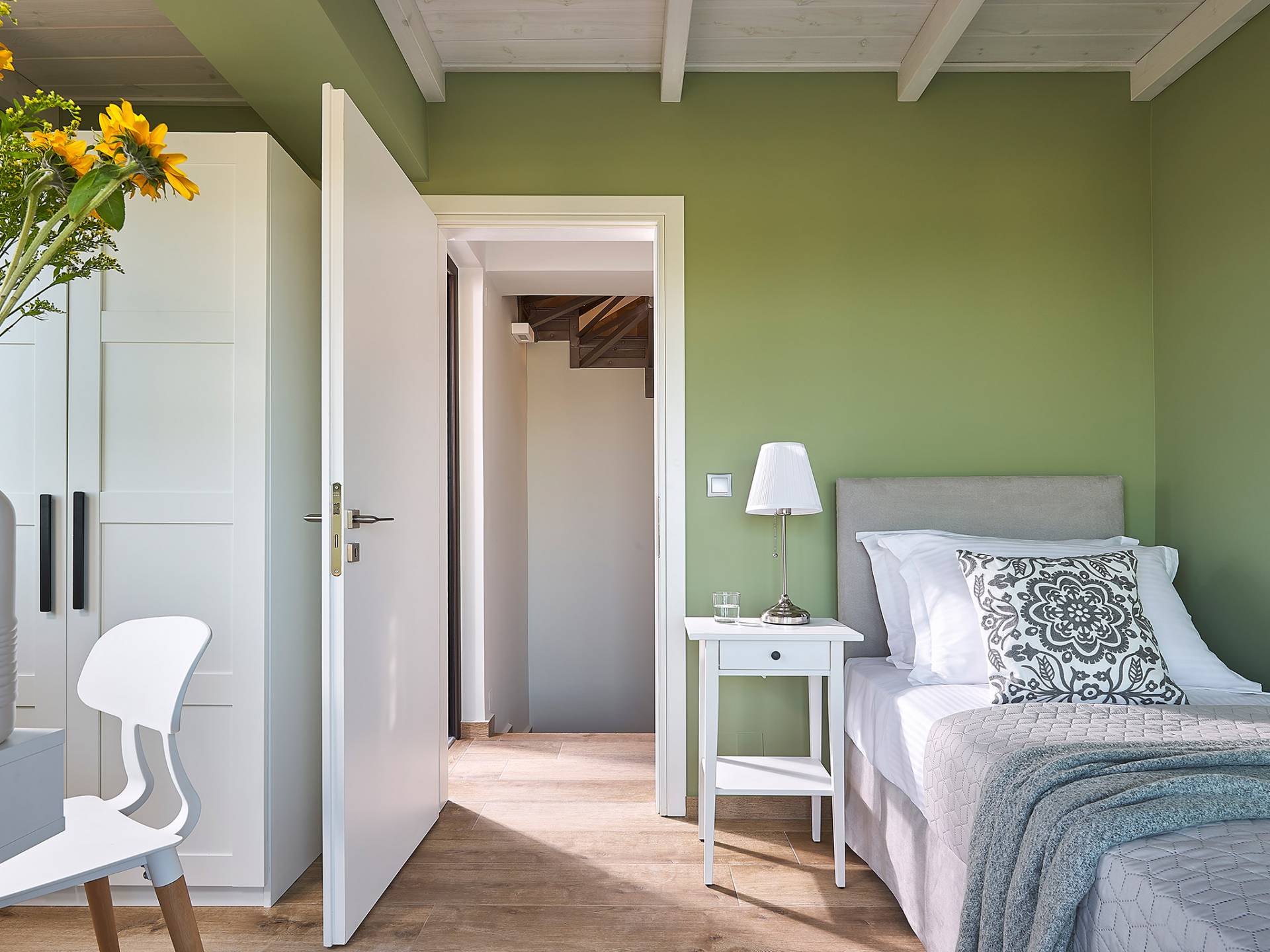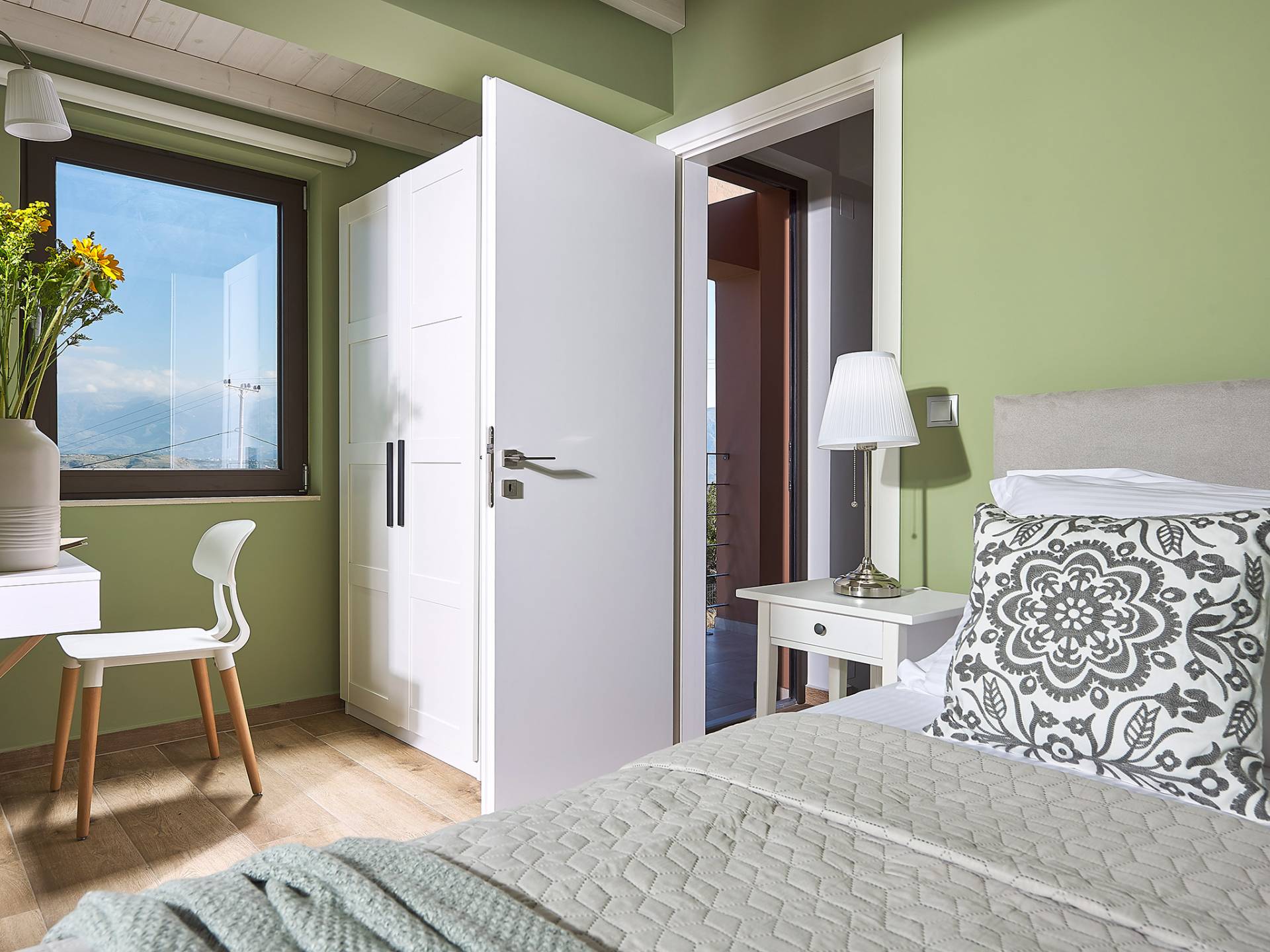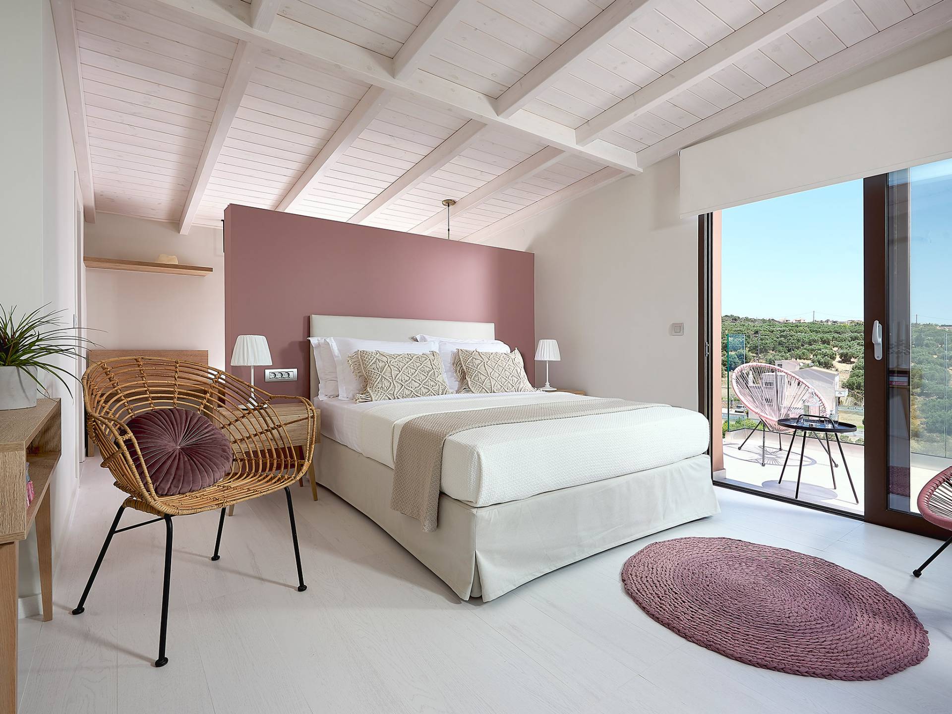 En suivant les escaliers jusqu'au deuxième étage, vous arriverez à un magnifique grenier qui abrite la chambre principale. La chambre dispose d'un lit double (1,60 X 2,00), d'un placard ouvert, d'un petit réfrigérateur et d'une salle de bain attenante avec cabine de douche. De grandes portes et fenêtres donnent sur un balcon privé avec un coin salon offrant une vue panoramique sur la baie de Souda, la mer et les environs et surplombant également la piscine.