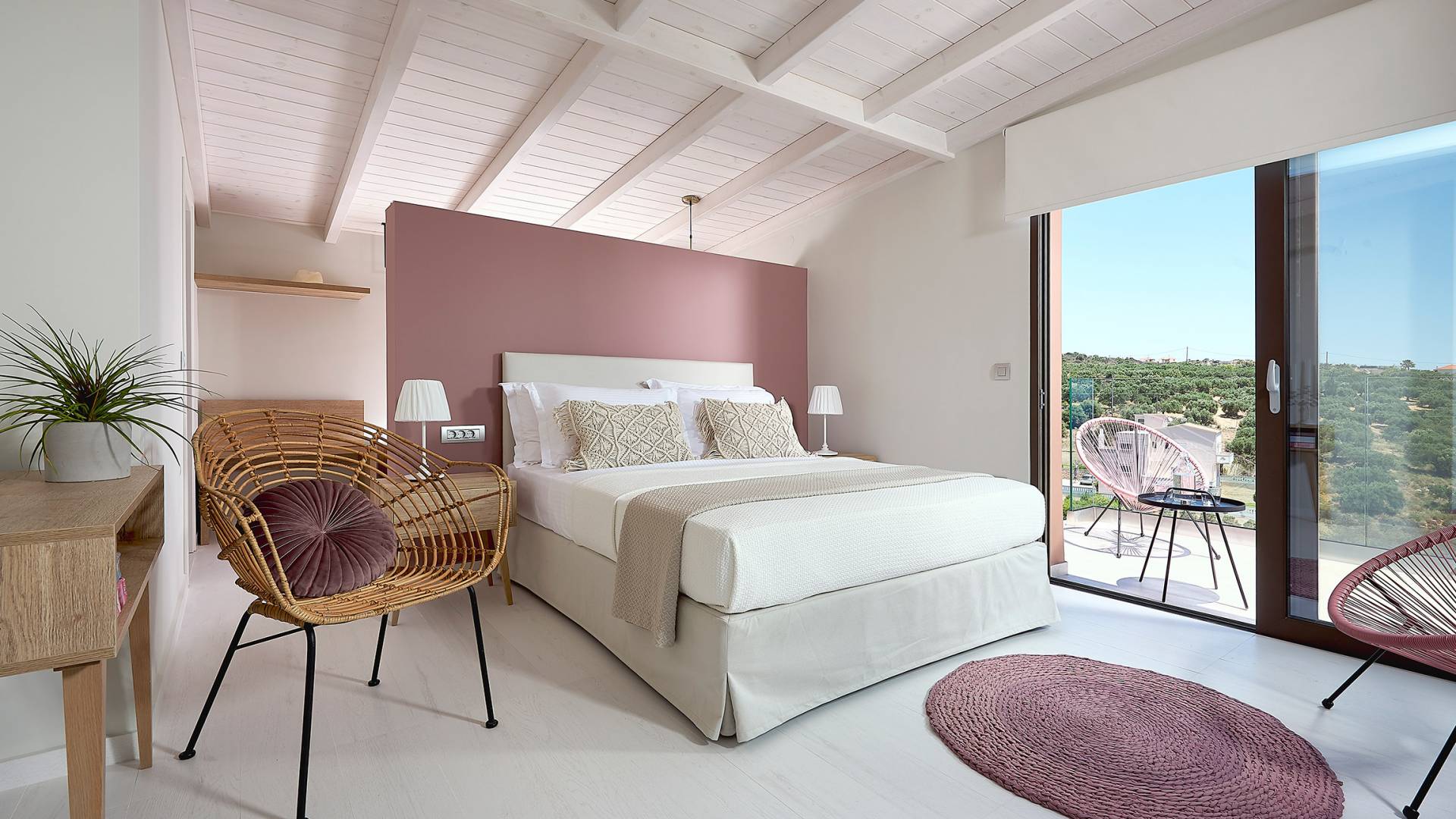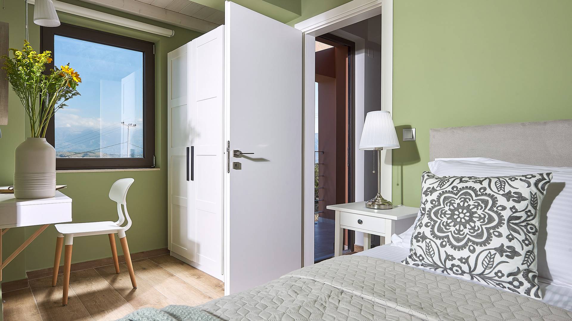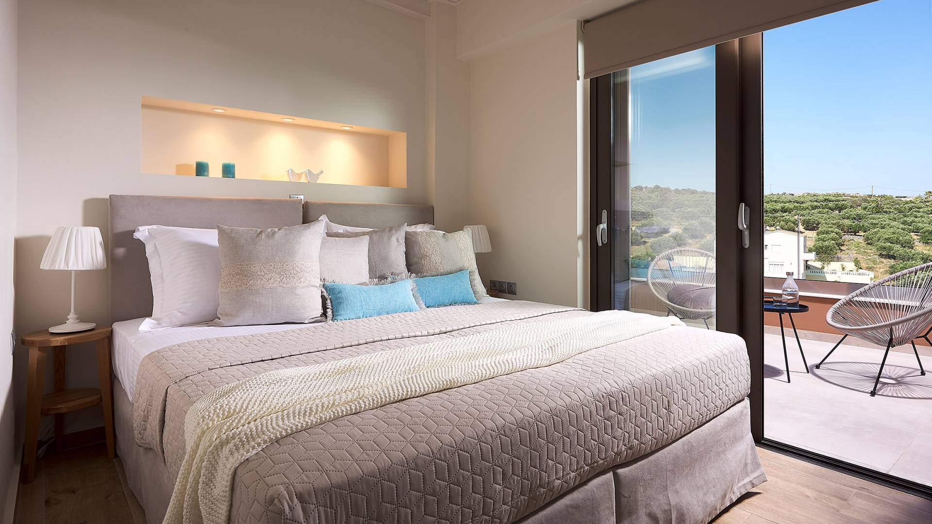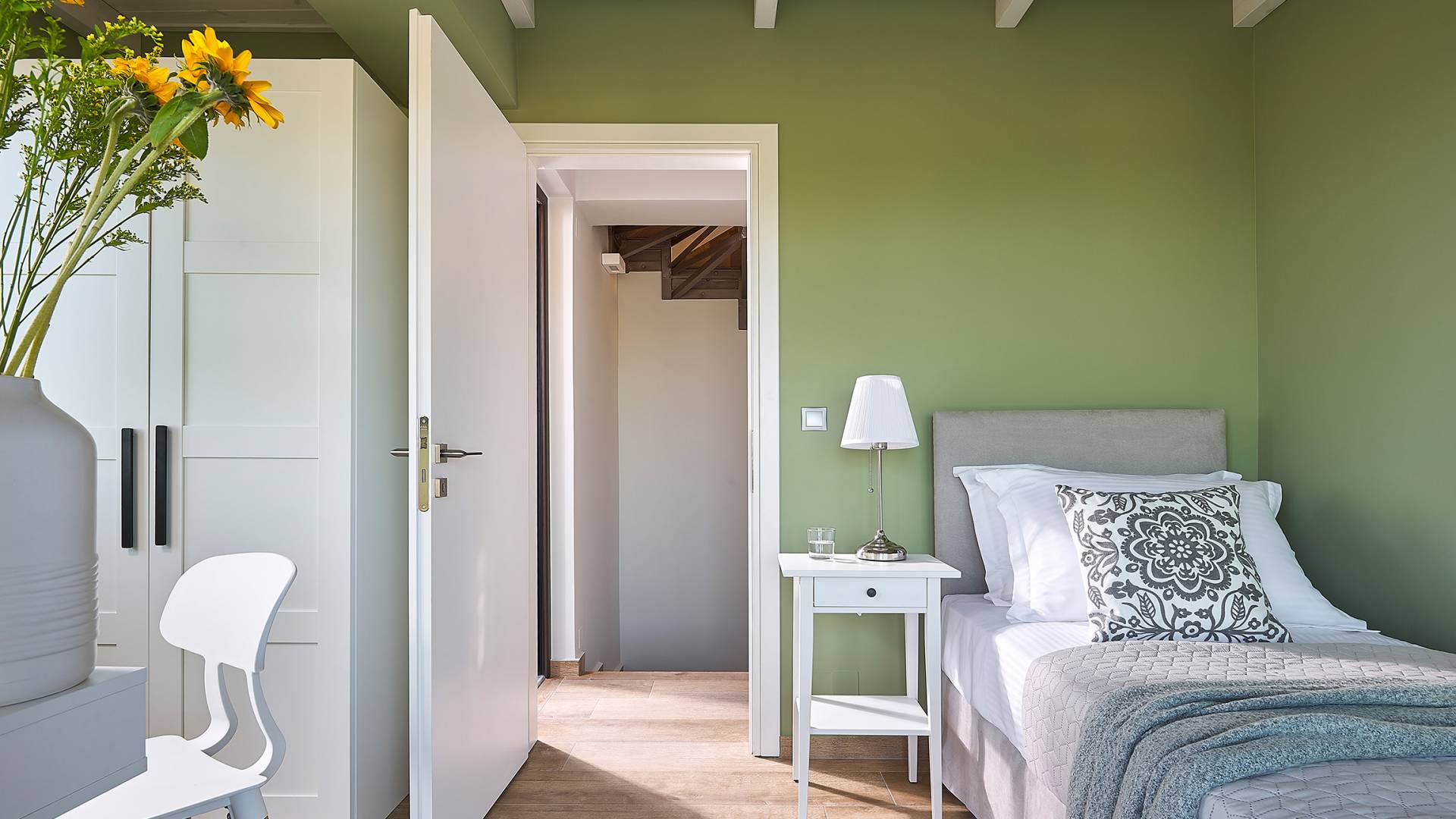 En suivant les escaliers jusqu'au deuxième étage, vous arriverez à un magnifique grenier qui abrite la chambre principale. La chambre dispose d'un lit double (1,60 X 2,00), d'un placard ouvert, d'un petit réfrigérateur et d'une salle de bain attenante avec cabine de douche. De grandes portes et fenêtres donnent sur un balcon privé avec un coin salon offrant une vue panoramique sur la baie de Souda, la mer et les environs et surplombant également la piscine.