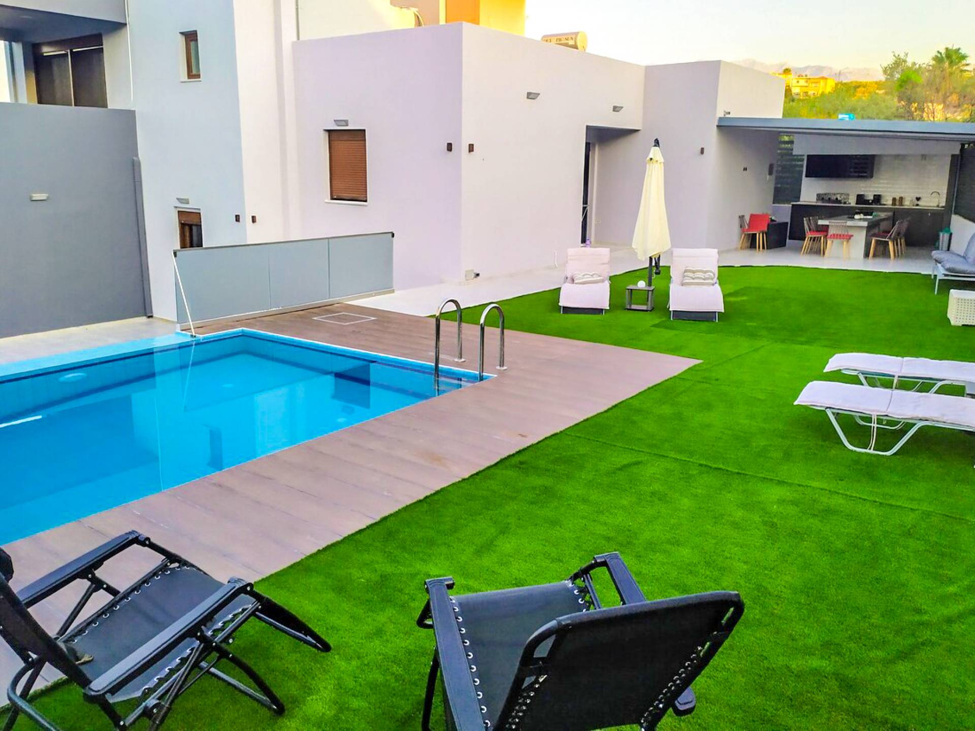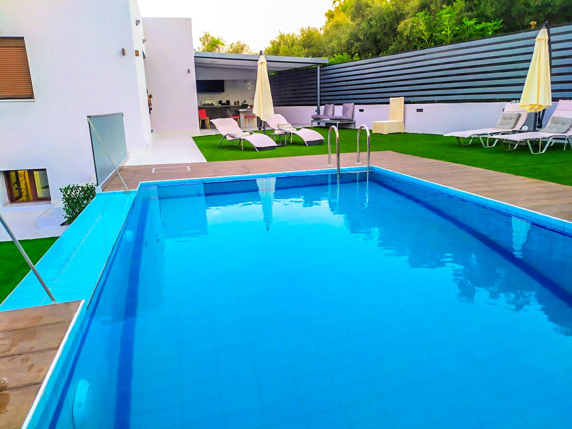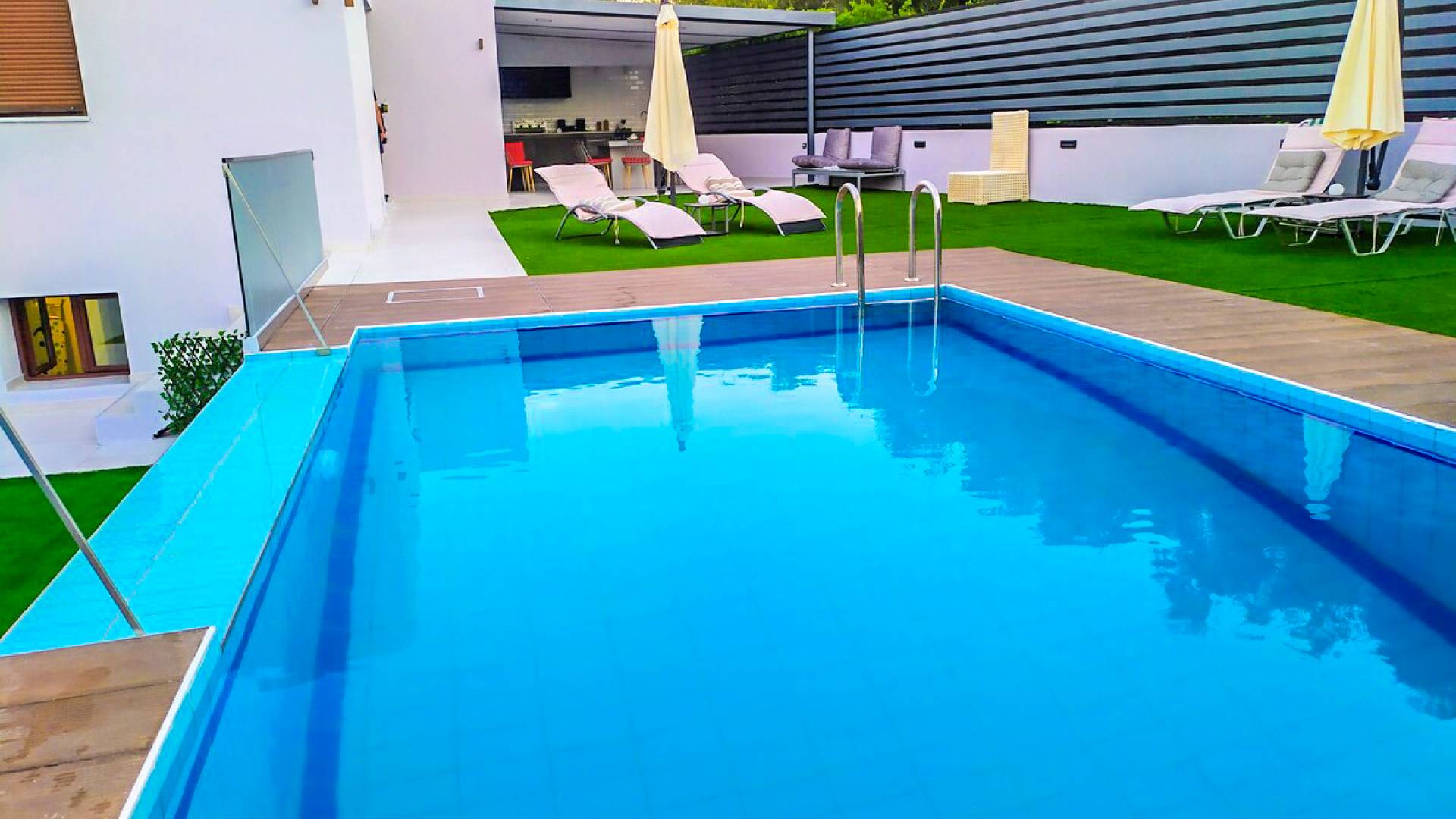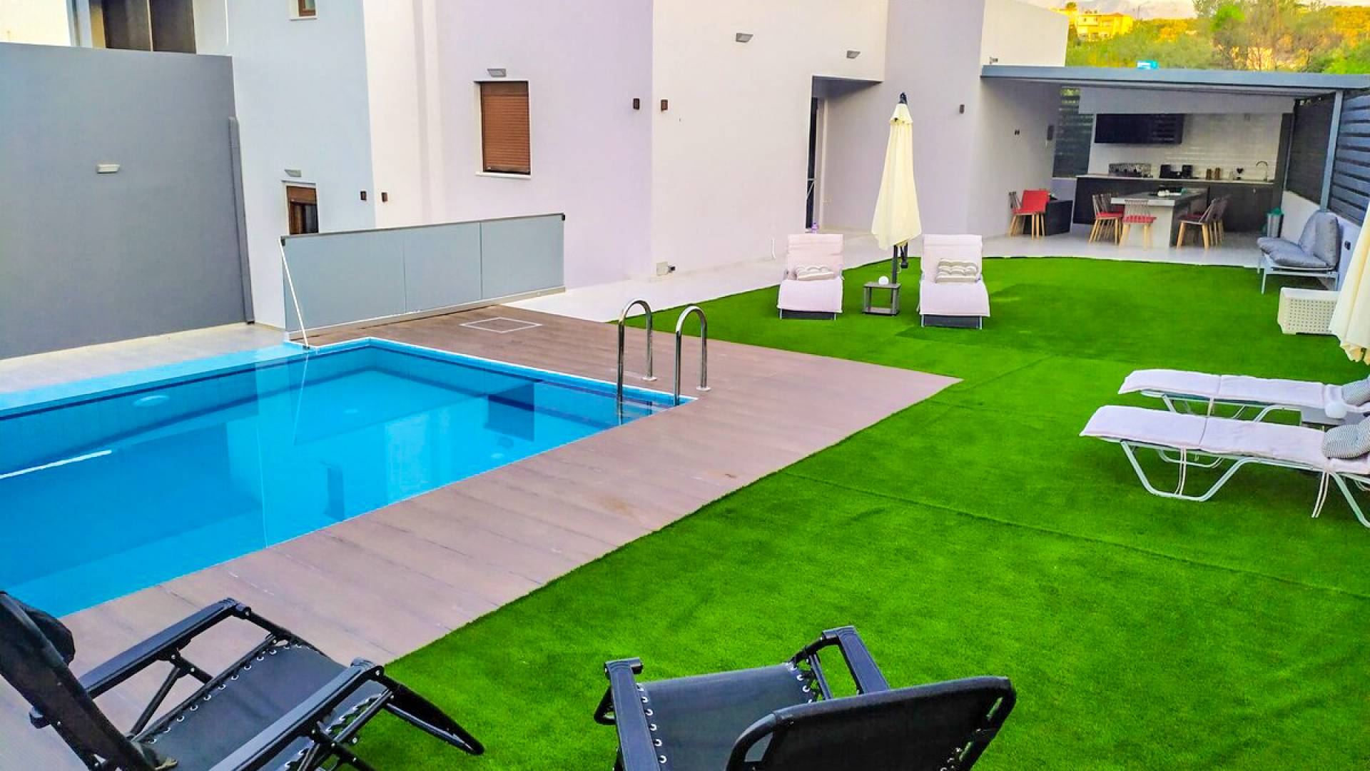 La cuisine extérieure avec le BBQ et la pergola avec les meubles de patio et la table à manger offrent de grands avantages ! La grande piscine privée avec des chaises longues modernes vous permettra de vous détendre et de profiter du bronzage et d'une bouteille de vin le soir après une longue journée à la plage !
