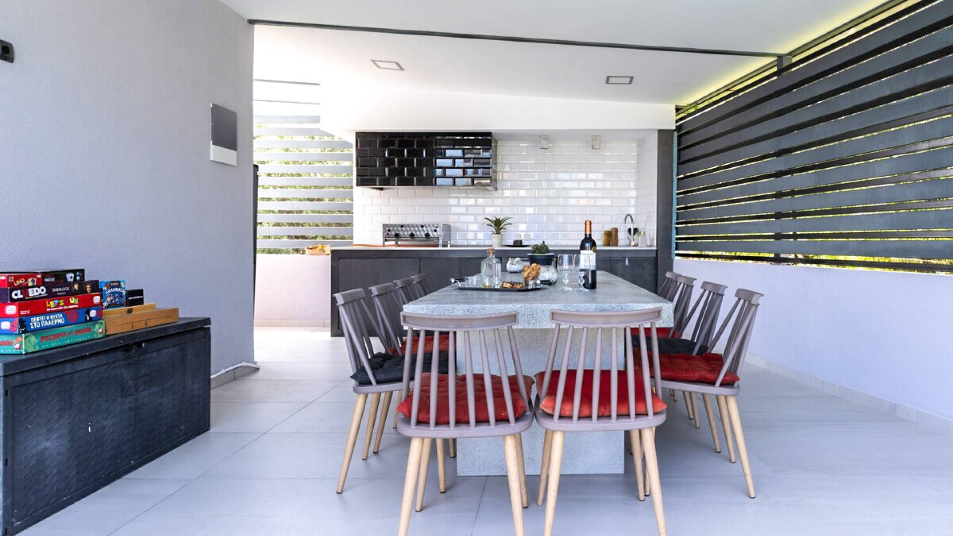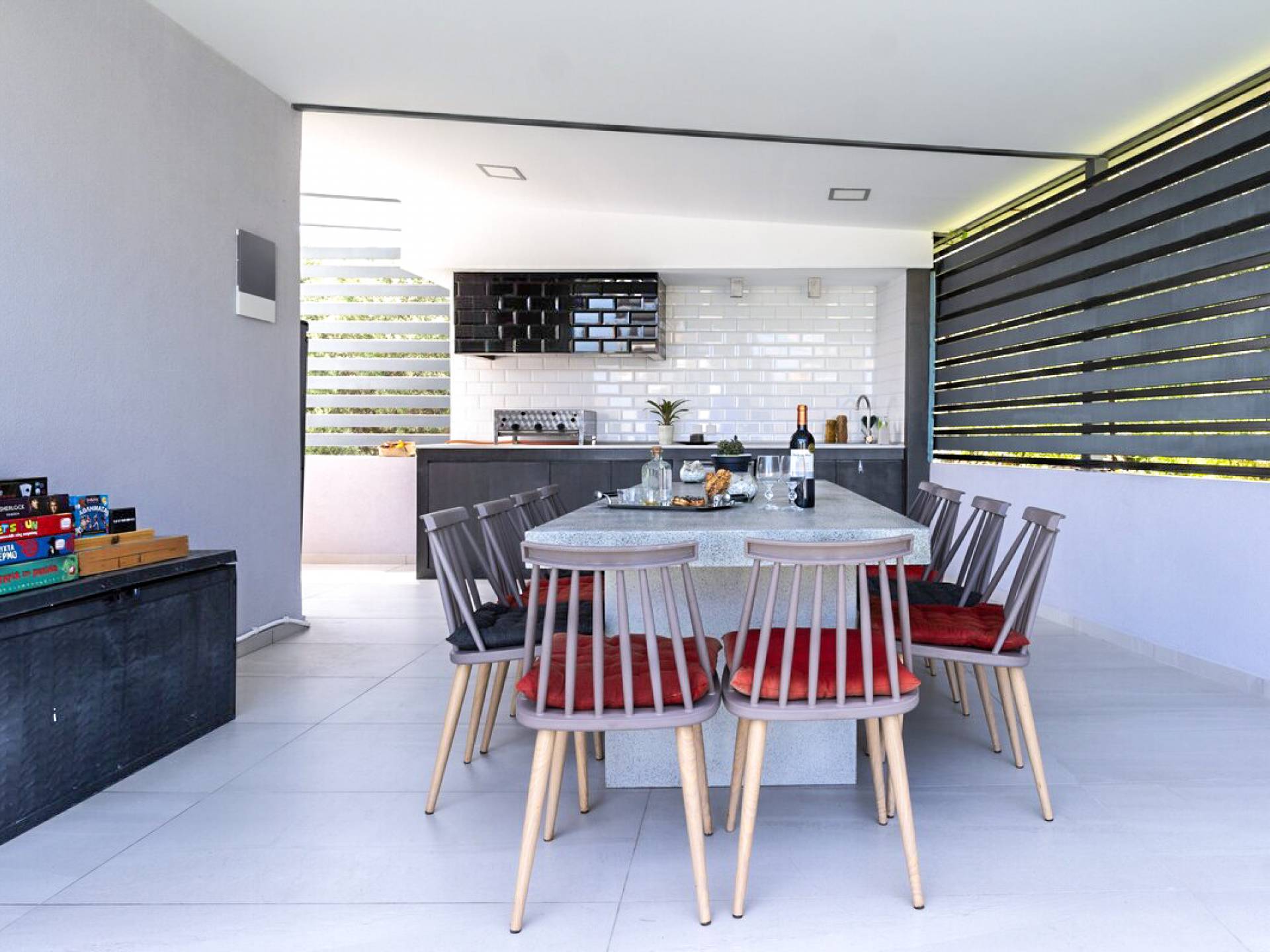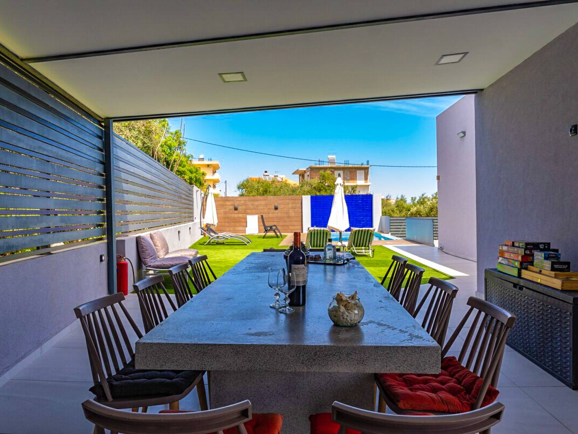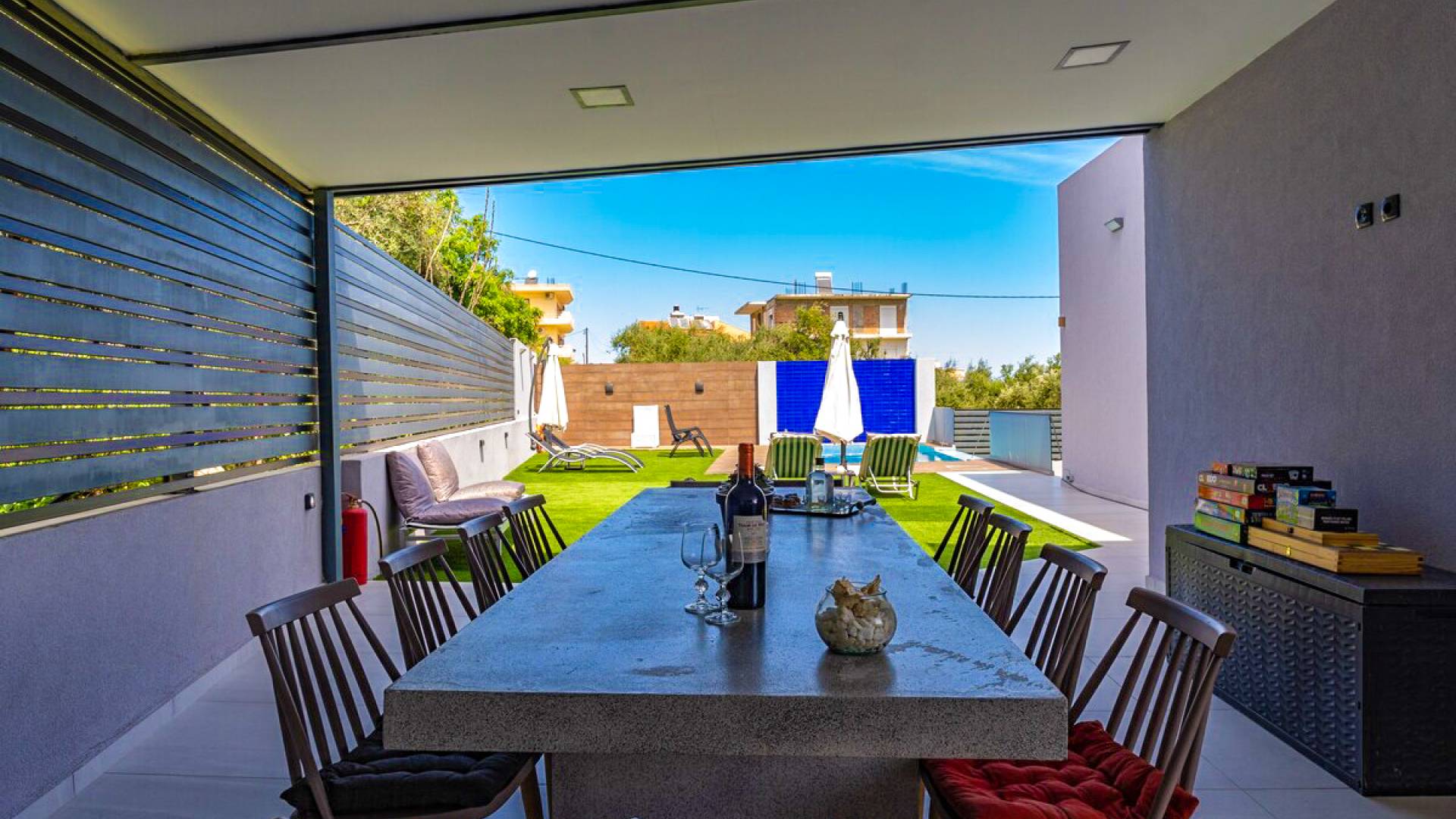 La cuisine extérieure avec le BBQ et la pergola avec les meubles de patio et la table à manger offrent de grands avantages ! La grande piscine privée avec des chaises longues modernes vous permettra de vous détendre et de profiter du bronzage et d'une bouteille de vin le soir après une longue journée à la plage !