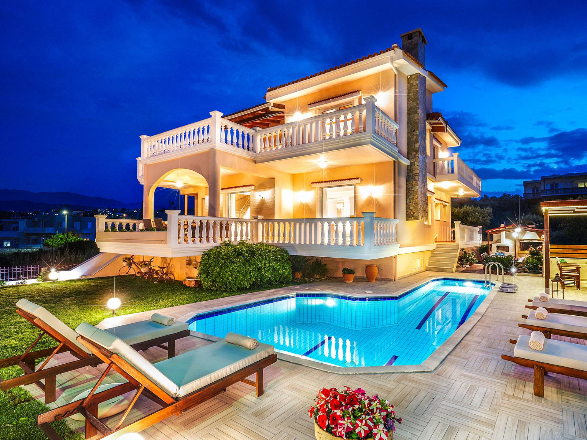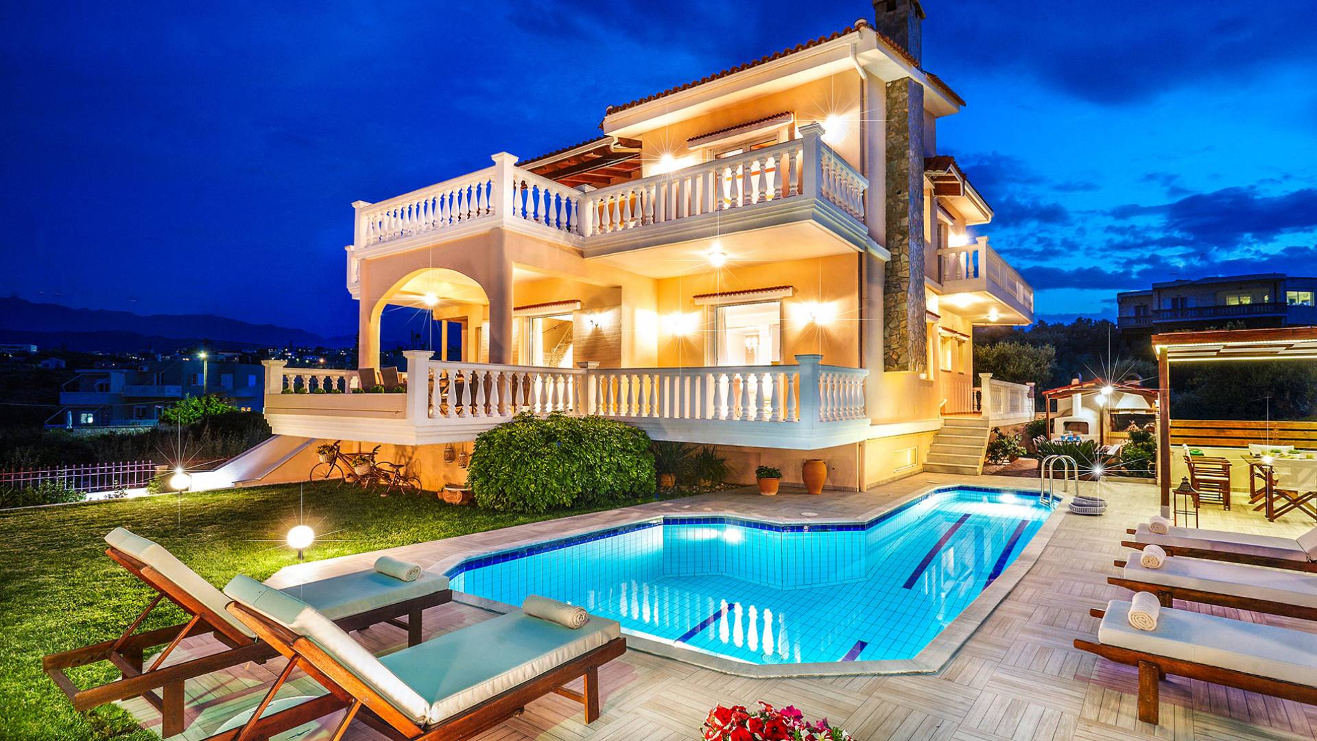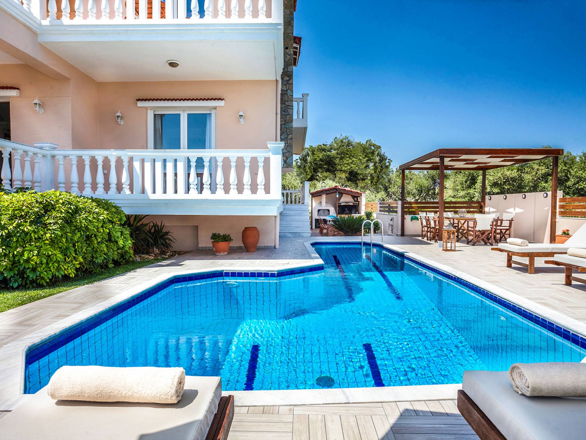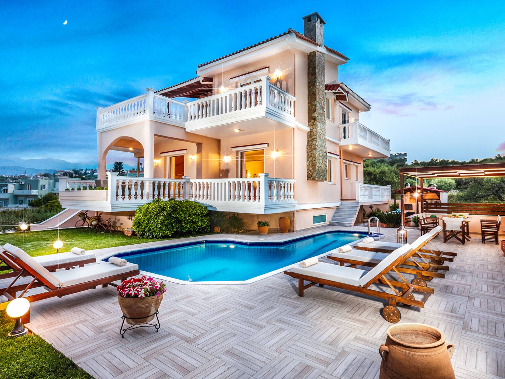Cette location spacieuse et luxueuse avec un environnement sophistiqué offre 4 chambres et 3 salles de bain, tous des espaces lumineux et aérés avec balcons privés. Profitez du soleil allongé sur votre transat confortable et rafraîchissez-vous dans la piscine SPA privée avec jet d'hydromassage, un espace barbecue spécialement conçu et un four à pizza extérieur au feu de bois, une cuisine entièrement équipée, une télévision par satellite et une connexion Wi-Fi haut débit, un beau jardin avec pelouse pour profiter de la récréation, grandes terrasses avec tables à manger avec vue sur la montagne et la mer... Vous êtes accueillis dans un endroit où vous pouvez tout avoir ! Imaginez une villa où le plus important c'est vous ! Un endroit de rêve à La Canée, en Grèce. Un endroit pour les amoureux de la vie. Découvrez un nouvel univers où tout peut arriver !