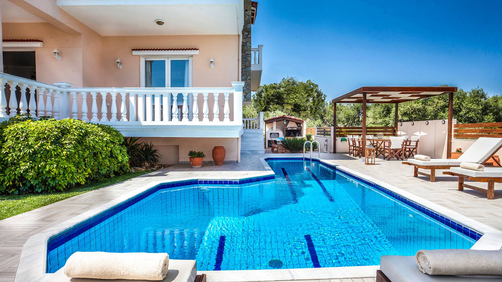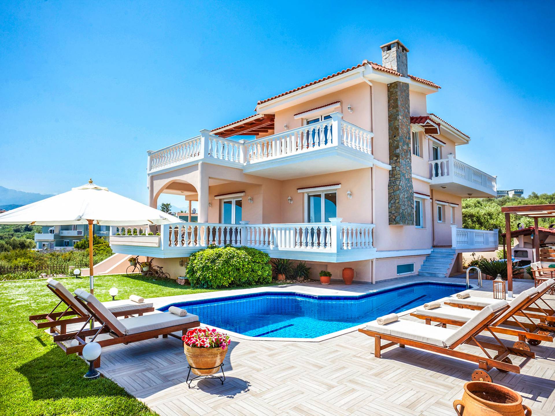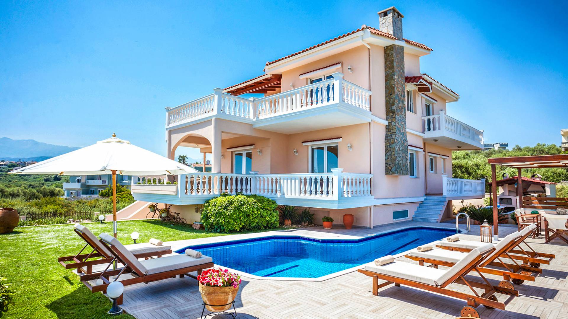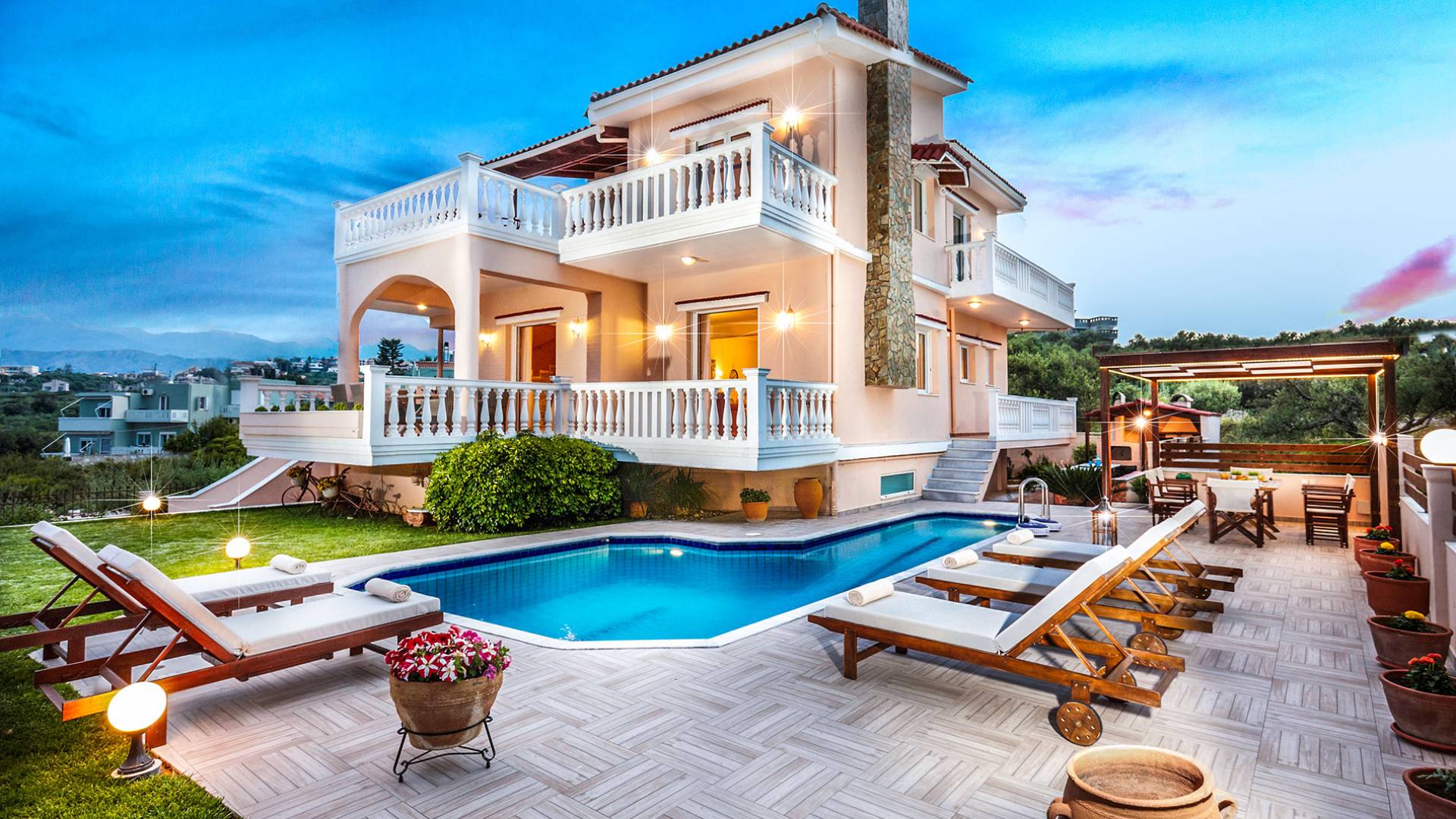 Cette location spacieuse et luxueuse avec un environnement sophistiqué offre 4 chambres et 3 salles de bain, tous des espaces lumineux et aérés avec balcons privés. Profitez du soleil allongé sur votre transat confortable et rafraîchissez-vous dans la piscine SPA privée avec jet d'hydromassage, un espace barbecue spécialement conçu et un four à pizza extérieur au feu de bois, une cuisine entièrement équipée, une télévision par satellite et une connexion Wi-Fi haut débit, un beau jardin avec pelouse pour profiter de la récréation, grandes terrasses avec tables à manger avec vue sur la montagne et la mer... Vous êtes accueillis dans un endroit où vous pouvez tout avoir ! Imaginez une villa où le plus important c'est vous ! Un endroit de rêve à La Canée, en Grèce. Un endroit pour les amoureux de la vie. Découvrez un nouvel univers où tout peut arriver !