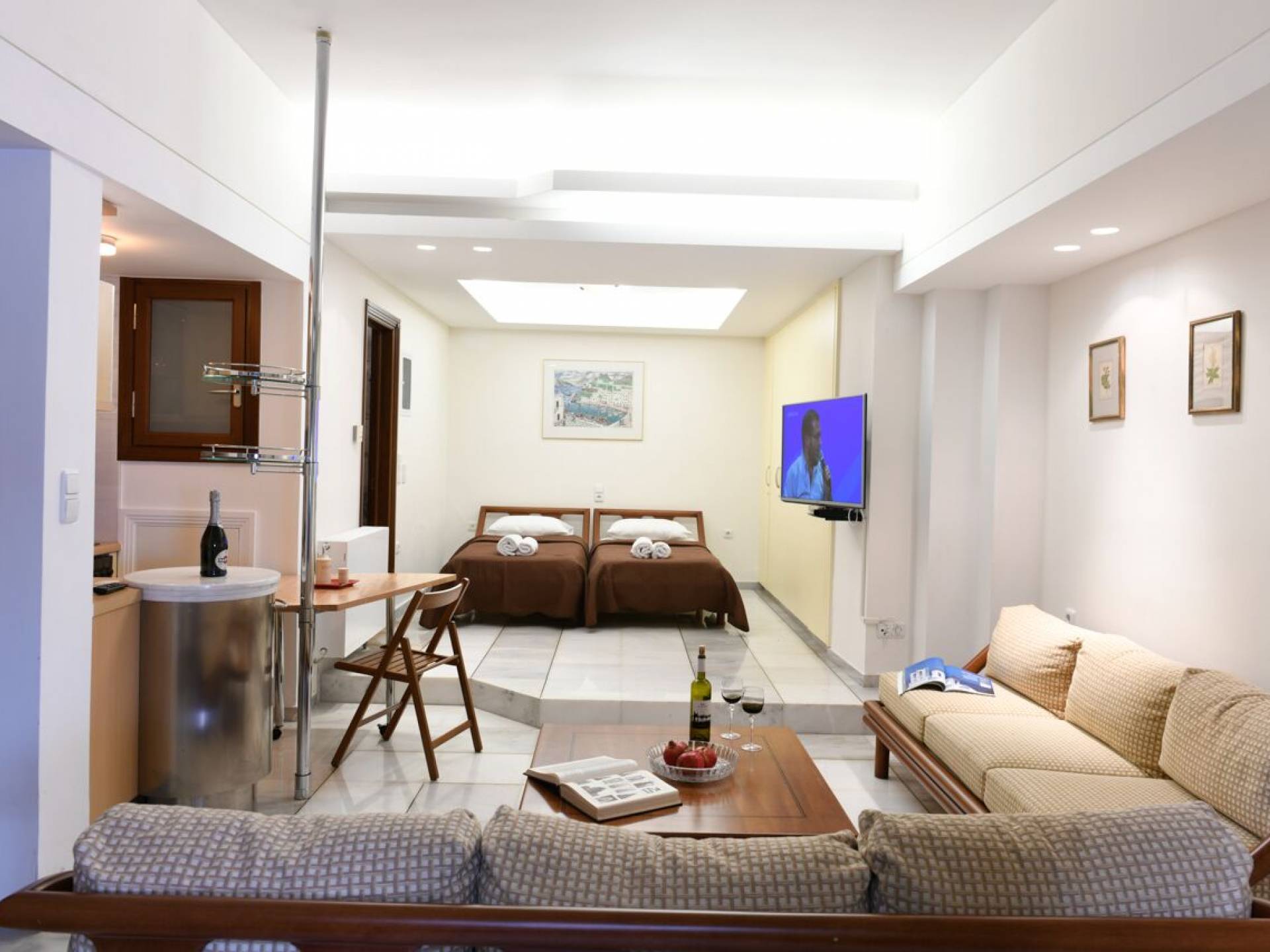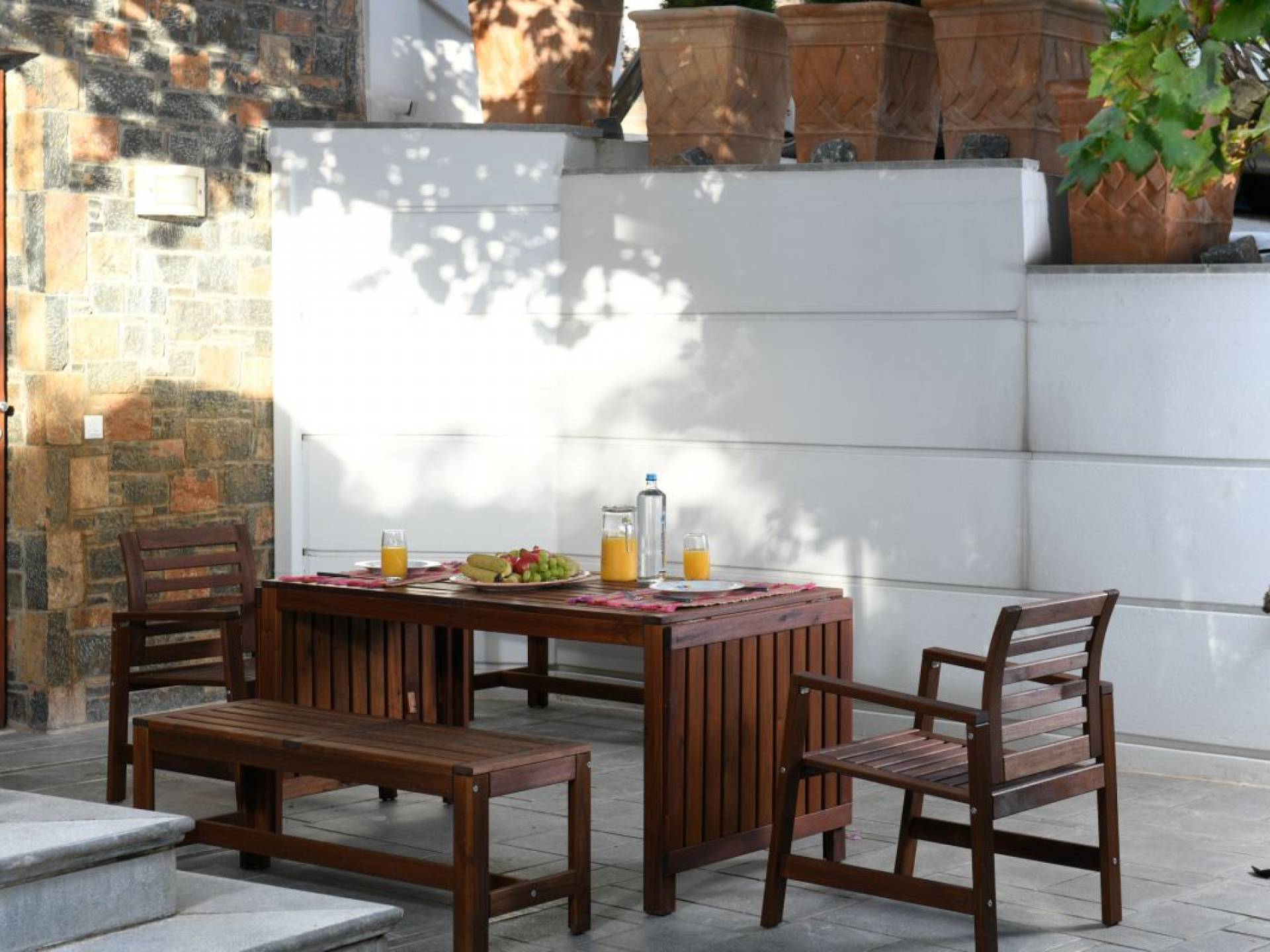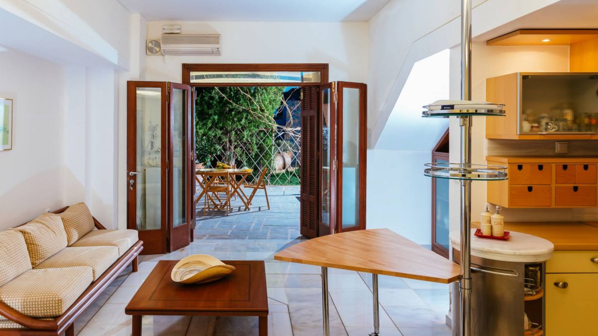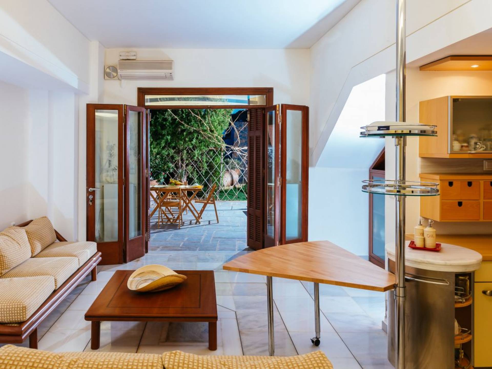 La villa dispose d'un studio/appartement indépendant d'une seule pièce, qui comprend une salle de bain avec douche, une cuisine entièrement équipée et un salon avec une véranda. Cet appartement peut accueillir jusqu'à 2 personnes. Devant la maison principale s'étend la piscine (avec vue directe sur la plage d'Almyros et la ville d'Agios Nikolaos) avec douche, salon extérieur et chaises longues. Le chemin de pierre de la villa part de la piscine et mène à la rivière et à la plage. Autour de la villa, il y a un magnifique jardin en harmonie avec l'environnement naturel avec de belles fleurs et arbres. De plus, il y a un espace disponible pour deux places de parking