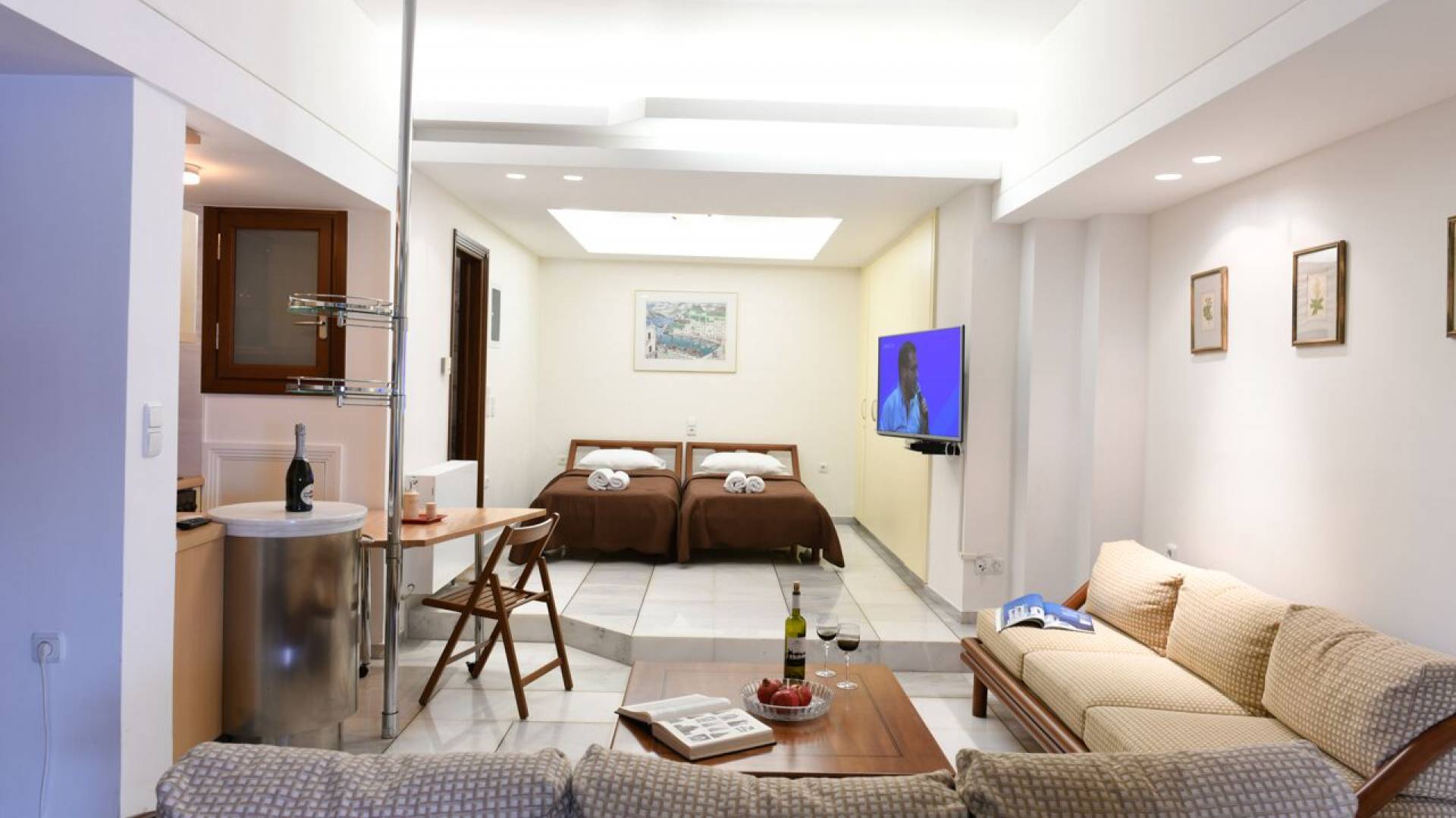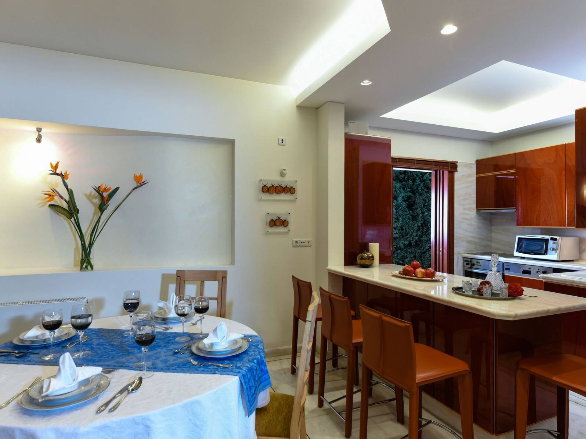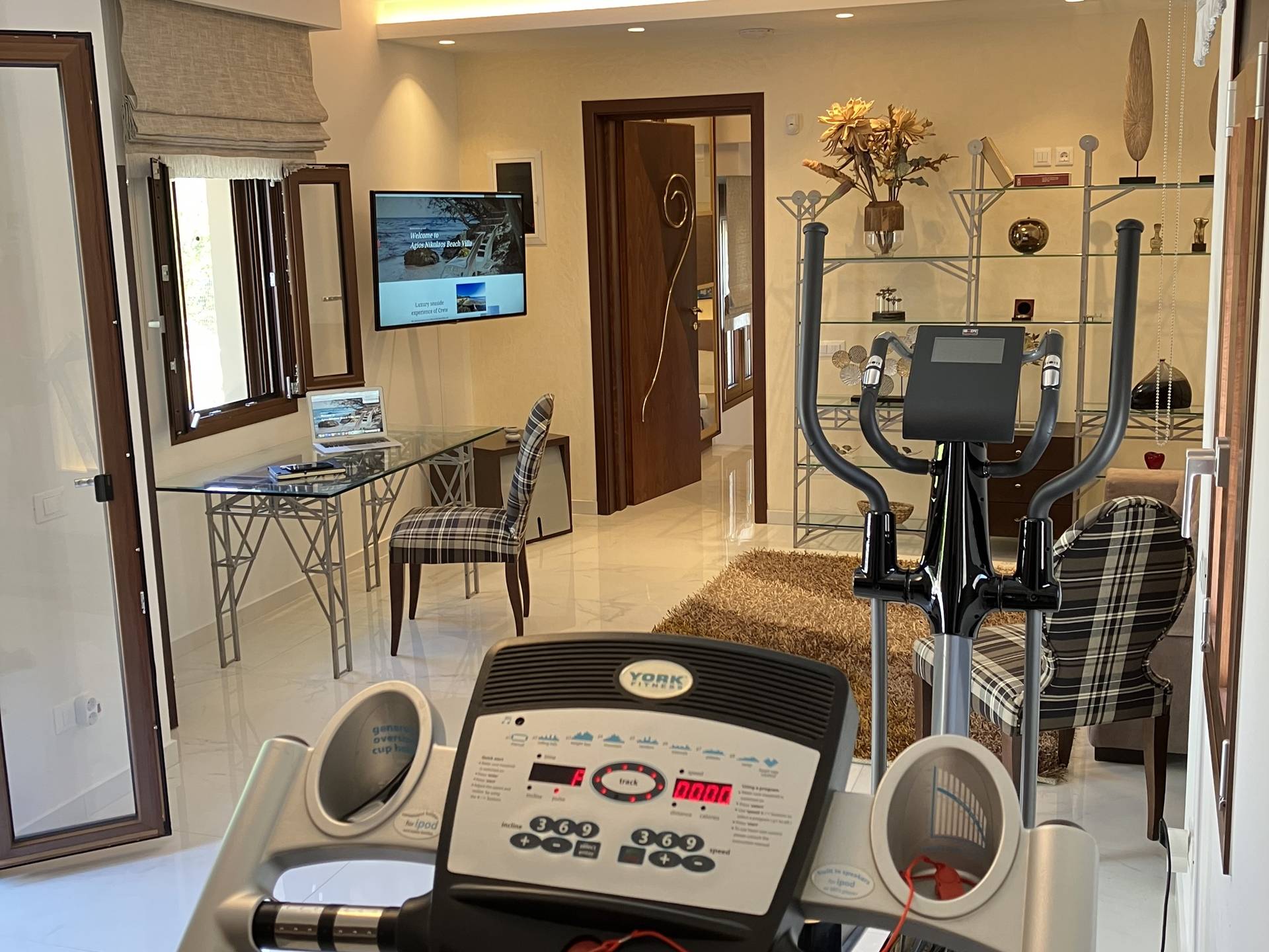 En montant au dernier étage de la villa, il y a deux chambres et une salle de bain avec douche. La chambre à coucher a un lit simple et une véranda avec vue sur la montagne, tandis que l'autre chambre a un lit double avec une véranda et une vue sur la piscine, la plage d'Almyros et la ville d'Agios Nikolaos. Toutes les chambres ont une télévision, la climatisation et des armoires. Le salon avec salle à manger dispose également de la télévision et de la climatisation et la cuisine est entièrement équipée. Dans le débarras, il y a une machine à laver.