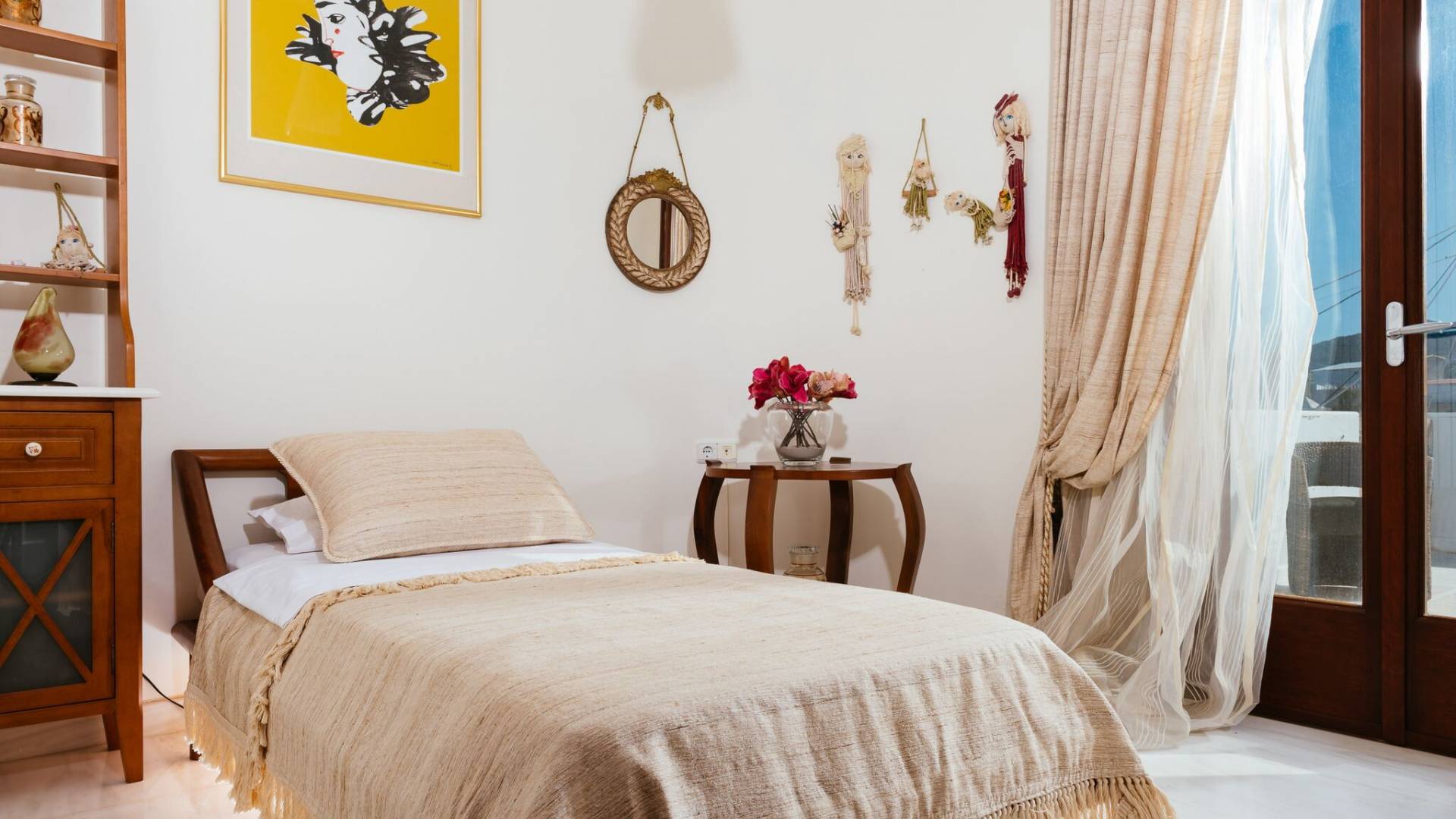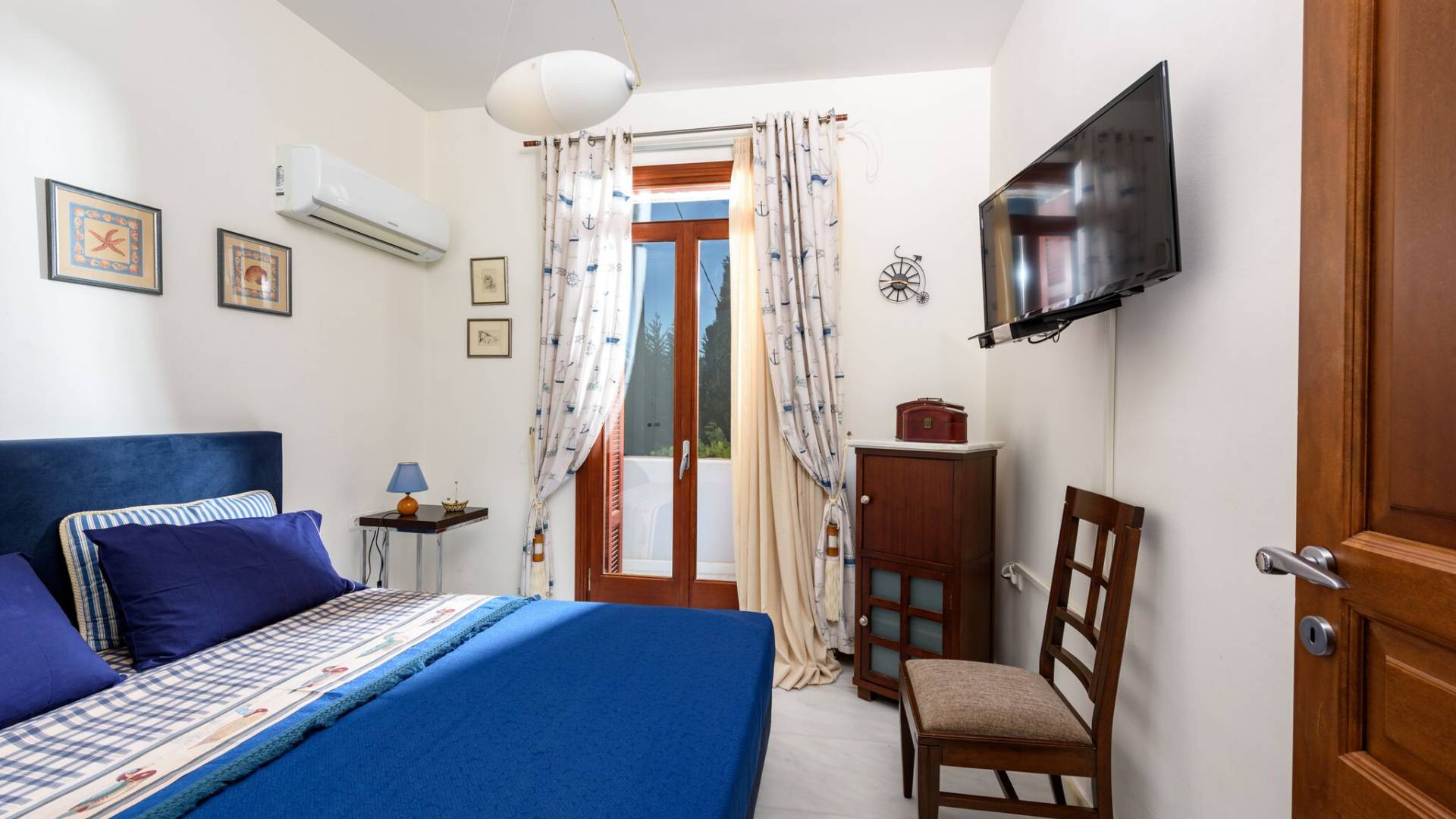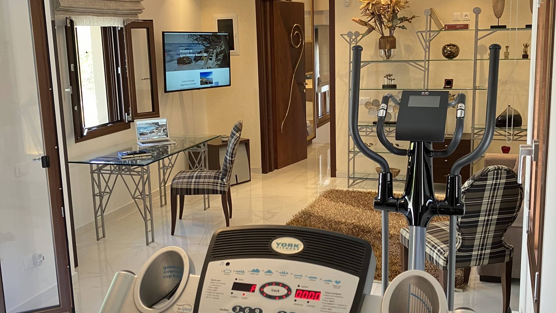 En montant au dernier étage de la villa, il y a deux chambres et une salle de bain avec douche. La chambre à coucher a un lit simple et une véranda avec vue sur la montagne, tandis que l'autre chambre a un lit double avec une véranda et une vue sur la piscine, la plage d'Almyros et la ville d'Agios Nikolaos. Toutes les chambres ont une télévision, la climatisation et des armoires. Le salon avec salle à manger dispose également de la télévision et de la climatisation et la cuisine est entièrement équipée. Dans le débarras, il y a une machine à laver.