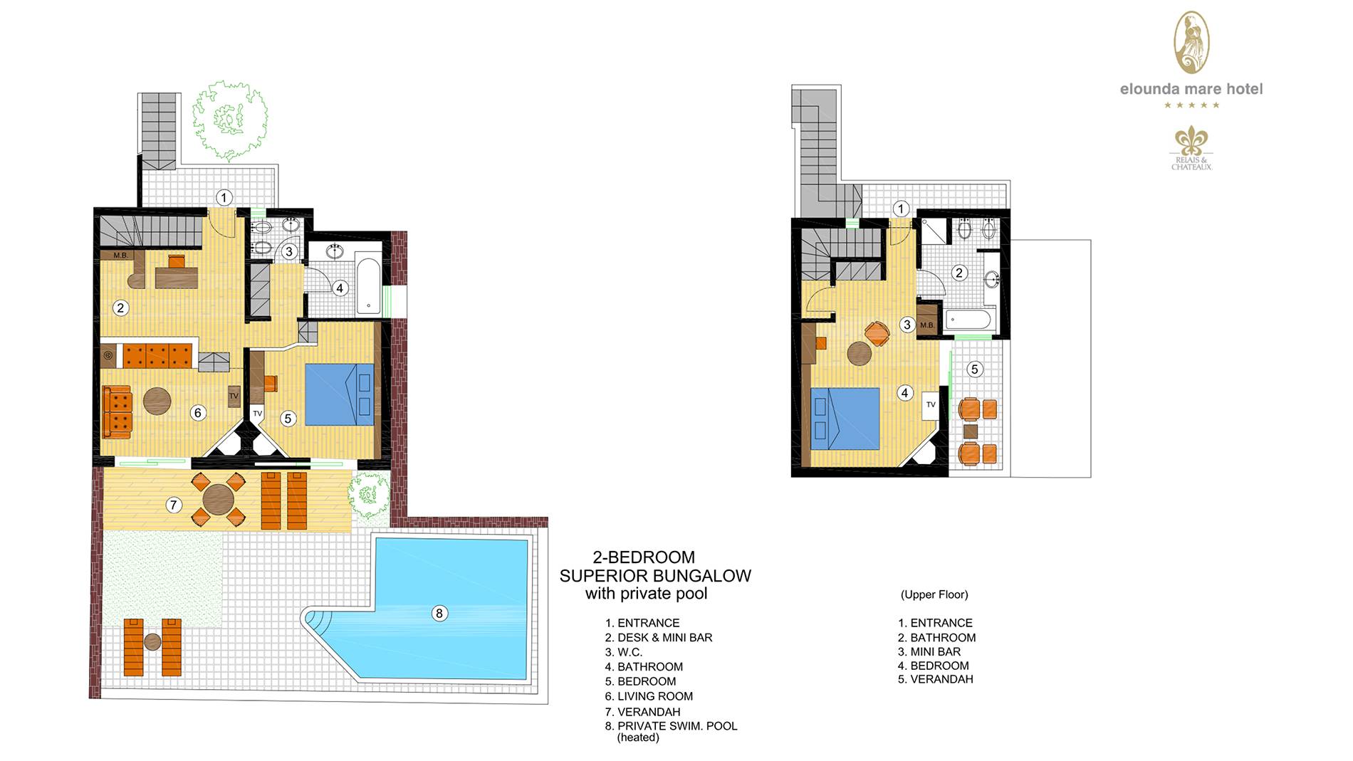 Le bungalow supérieur 2BR de l'hôtel Elounda Mare en Crète se compose de 2 chambres - lits doubles/jumeaux - 90 m² / 968 pieds carrés - Salon séparé. Deux étages pour certaines – Vue mer – Piscine privée – Terrasse avec parasol et transats. 2 salles de bains en marbre avec baignoire et douche Airbath - 2 toilettes - sèche-serviettes - peignoir - chaussons - sèche-cheveux - miroirs de maquillage/rasage oreillers hypoallergéniques et en plumes. Une connexion Internet avec Data Port – 2 téléviseurs LCD à écran plat avec chaînes internationales et musicales – Lecteurs DVD/CD – Téléphone avec ligne directe. Un minibar – Coffre-fort – Climatisation à réglage individuel. 1 Lit supplémentaire possible – Soumis à supplément tarifaire – 5 Personnes maximum