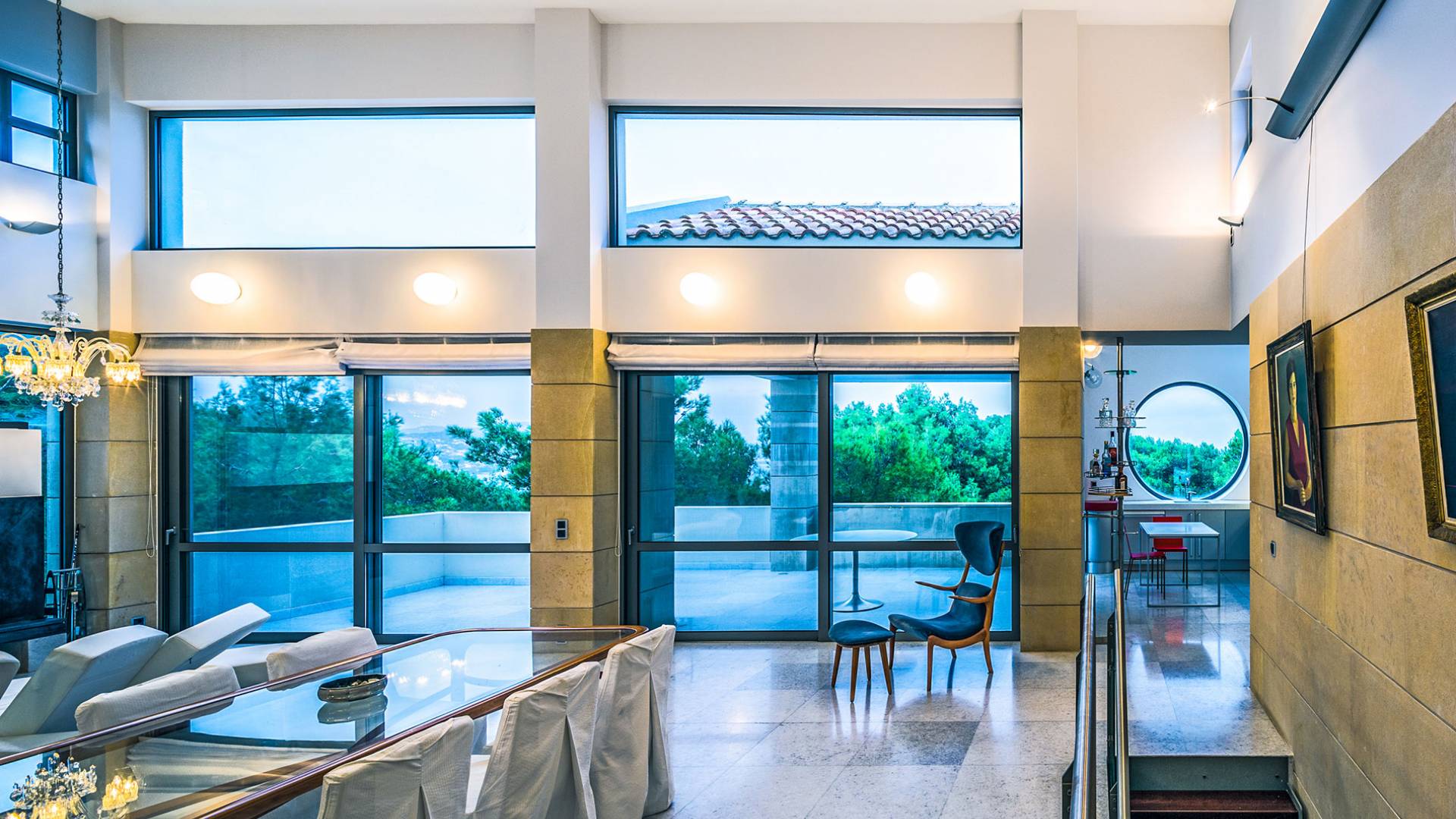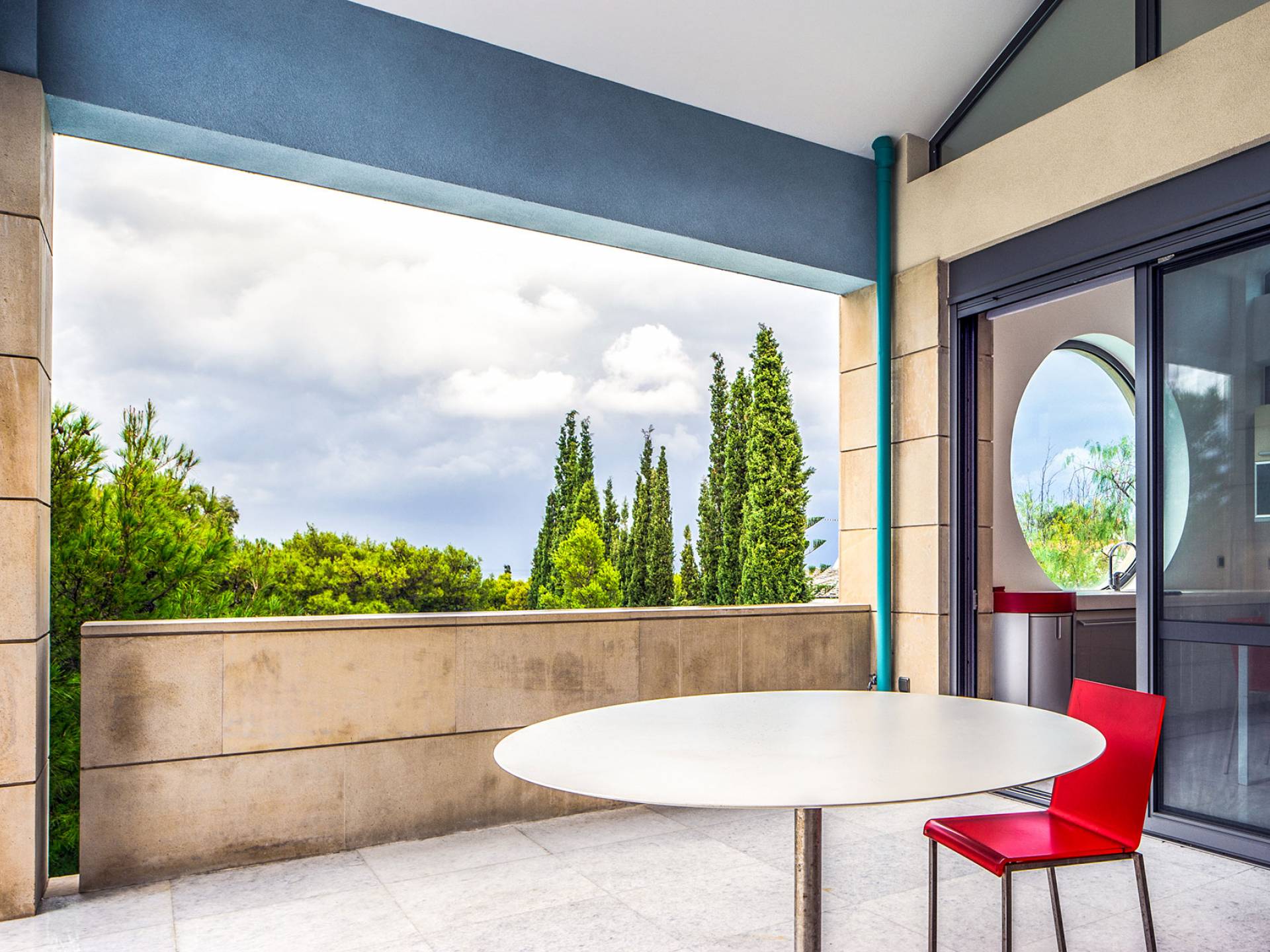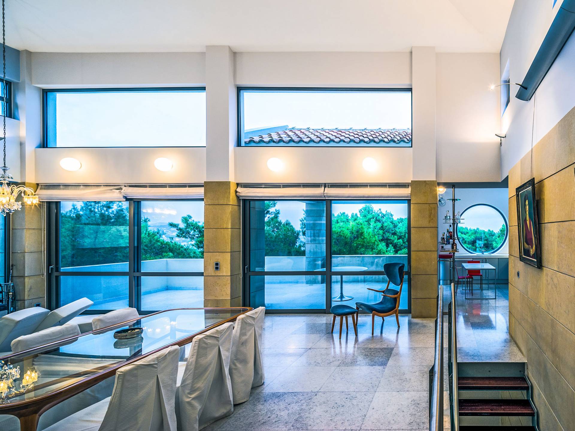L'entrée principale de Minimal Blue Villa Athens au premier étage vous emmène dans un magnifique salon, qui offre une superbe vue sur la piscine et la mer avec une cheminée, deux canapés et un fauteuil dispersés autour d'une table à manger en verre. Découvrez la Master Suite avec une vue spectaculaire sur la pinède et une salle de bain en marbre blanc avec douche. Il y a aussi une fabuleuse cuisine entièrement équipée avec des appareils Gaggenau intégrés (réfrigérateur, four, plaques vitrocéramiques, lave-vaisselle) offrant la plus belle vue sur la piscine, pour se livrer à une somptueuse gastronomie grecque - un espace intime à côté de la terrasse du premier étage surplombant la mer. Au coucher du soleil, dégustez des plats appétissants, accompagnés d'une sélection d'excellents vins !