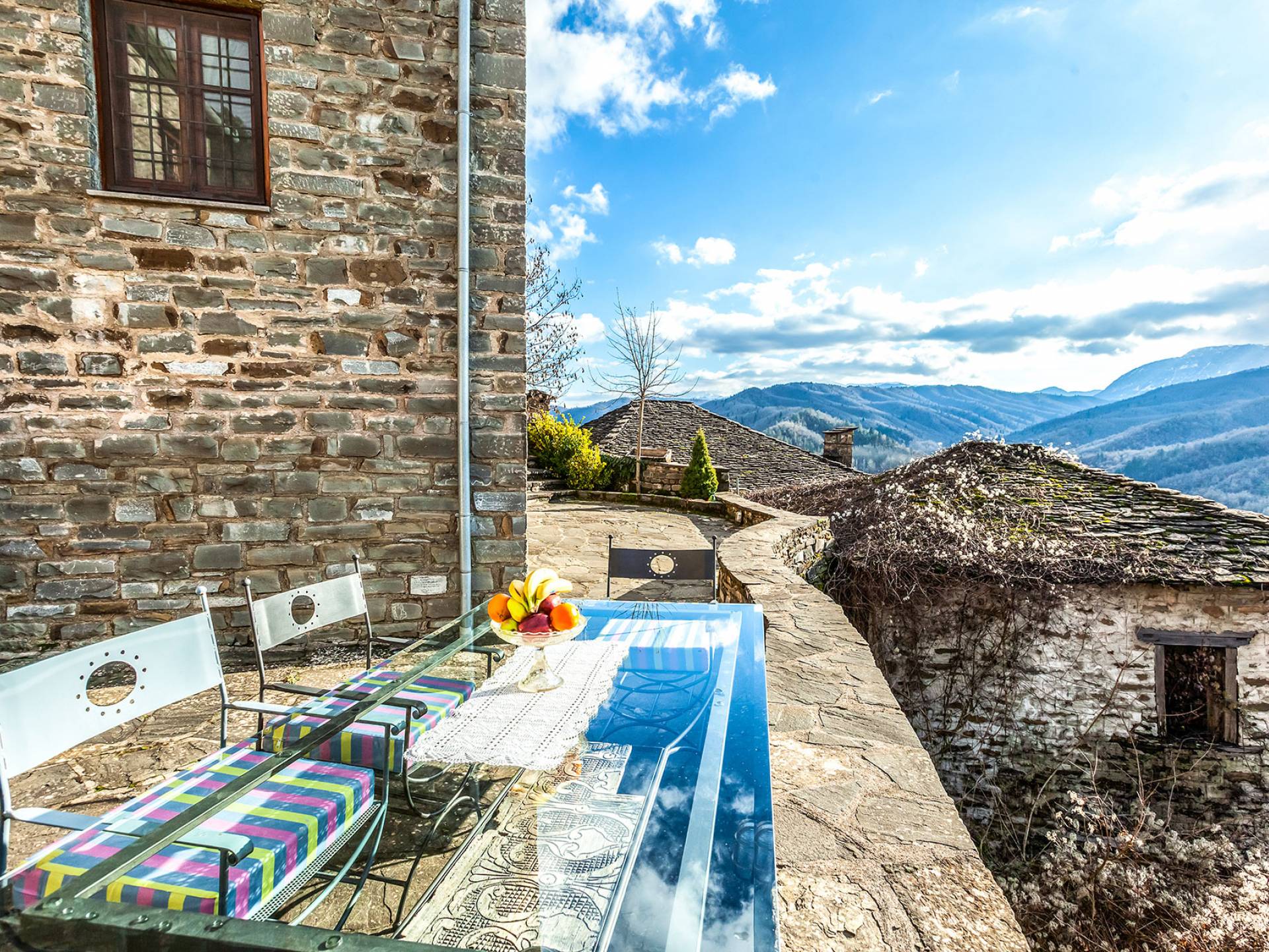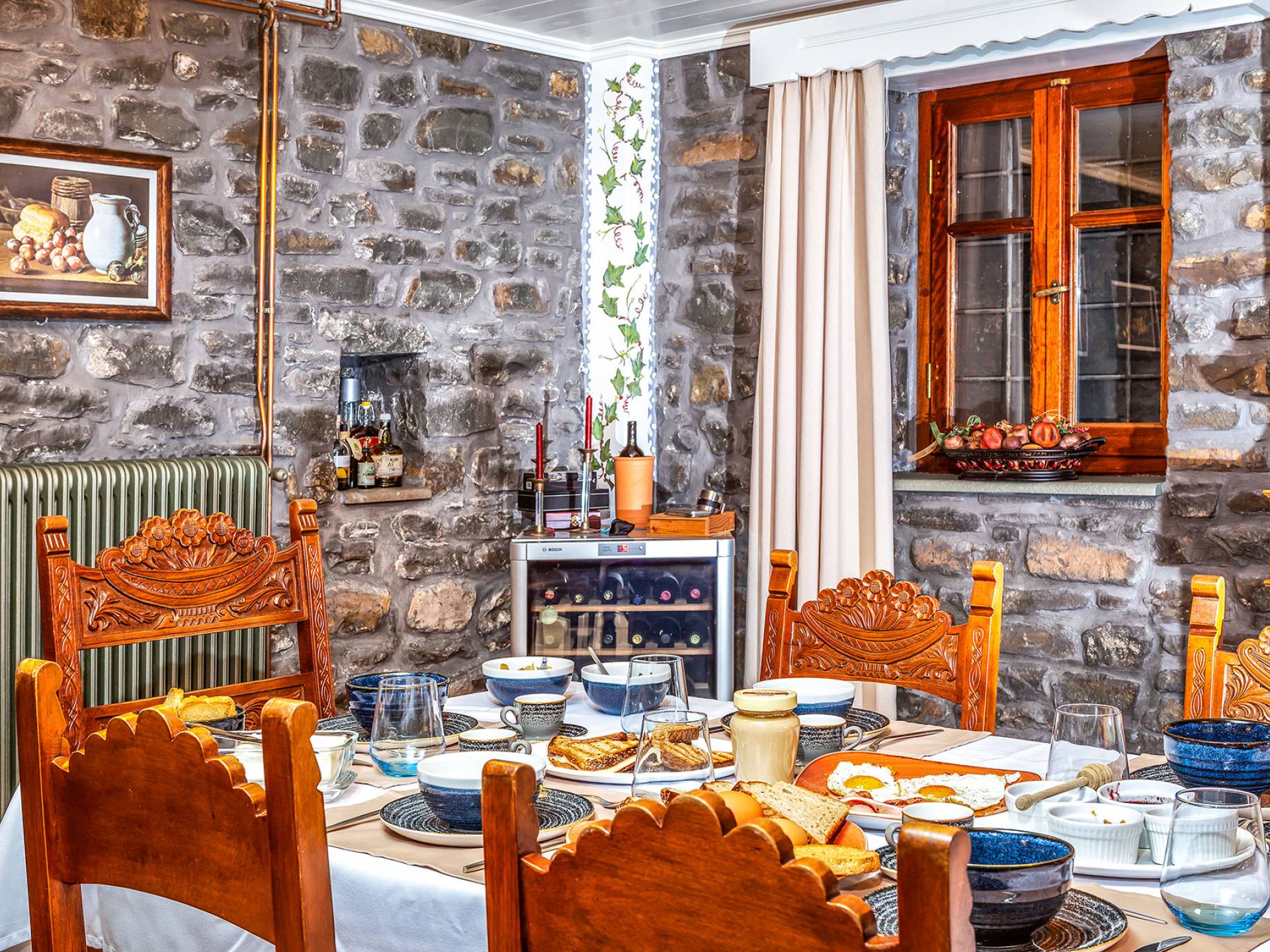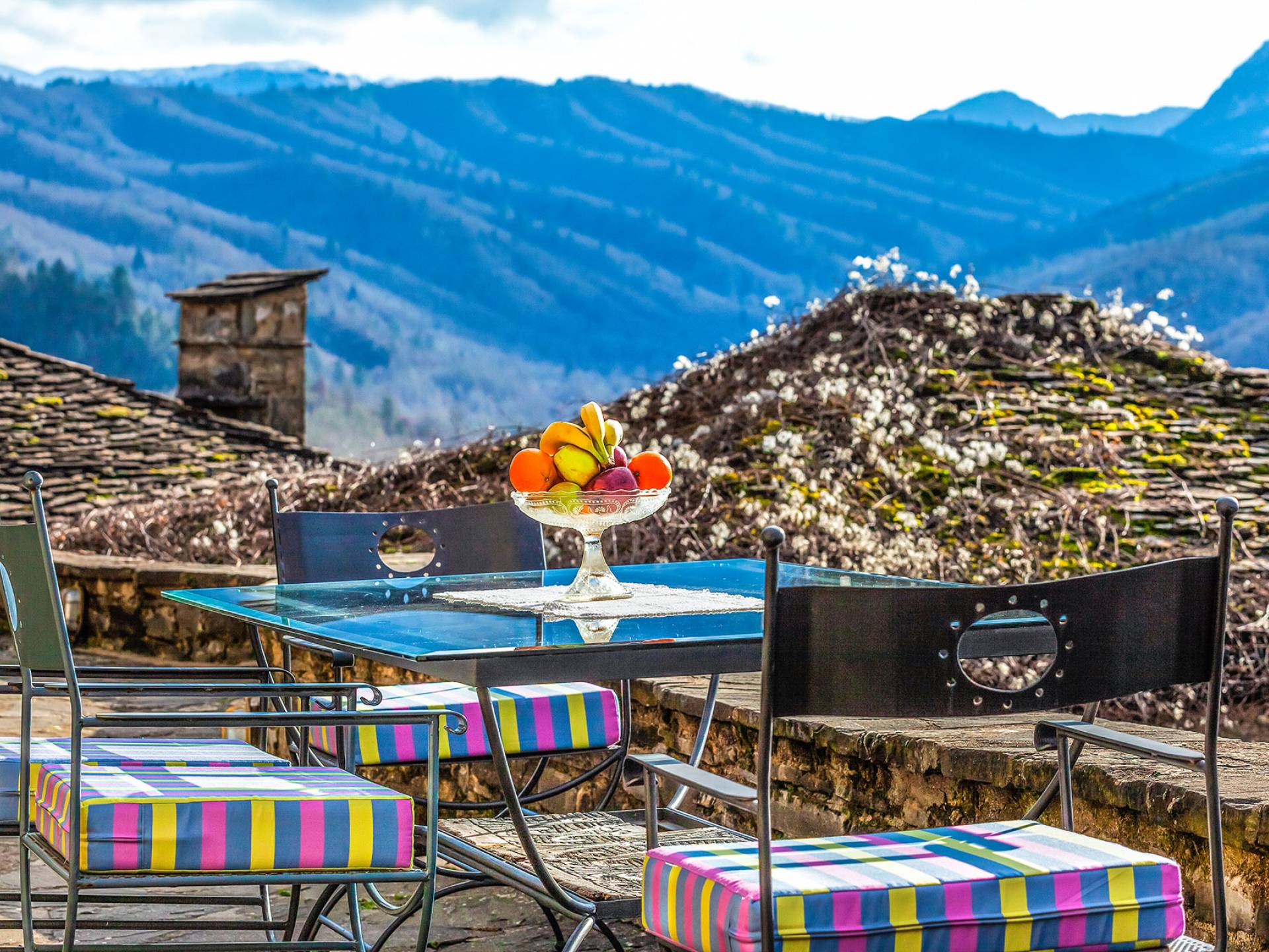 Dans la cour de l'immeuble, vous trouverez une salle à manger pour 8 personnes, en fer massif et verre, située au point avec la plus belle vue dans toutes les directions, vers les montagnes, le village et la rivière . Dans le jardin, il y a un équipement de barbecue (grillades) pour ceux qui ne résisteront pas au défi d'organiser une soirée barbecue avec les délicieuses viandes de montagne de la région, accompagnées de vieux tsipouro ou de vins célèbres de la cave de l'hôtel. L'air pur, la gastronomie, les boissons et la bonne compagnie sont la recette grecque ultime du bien-être !