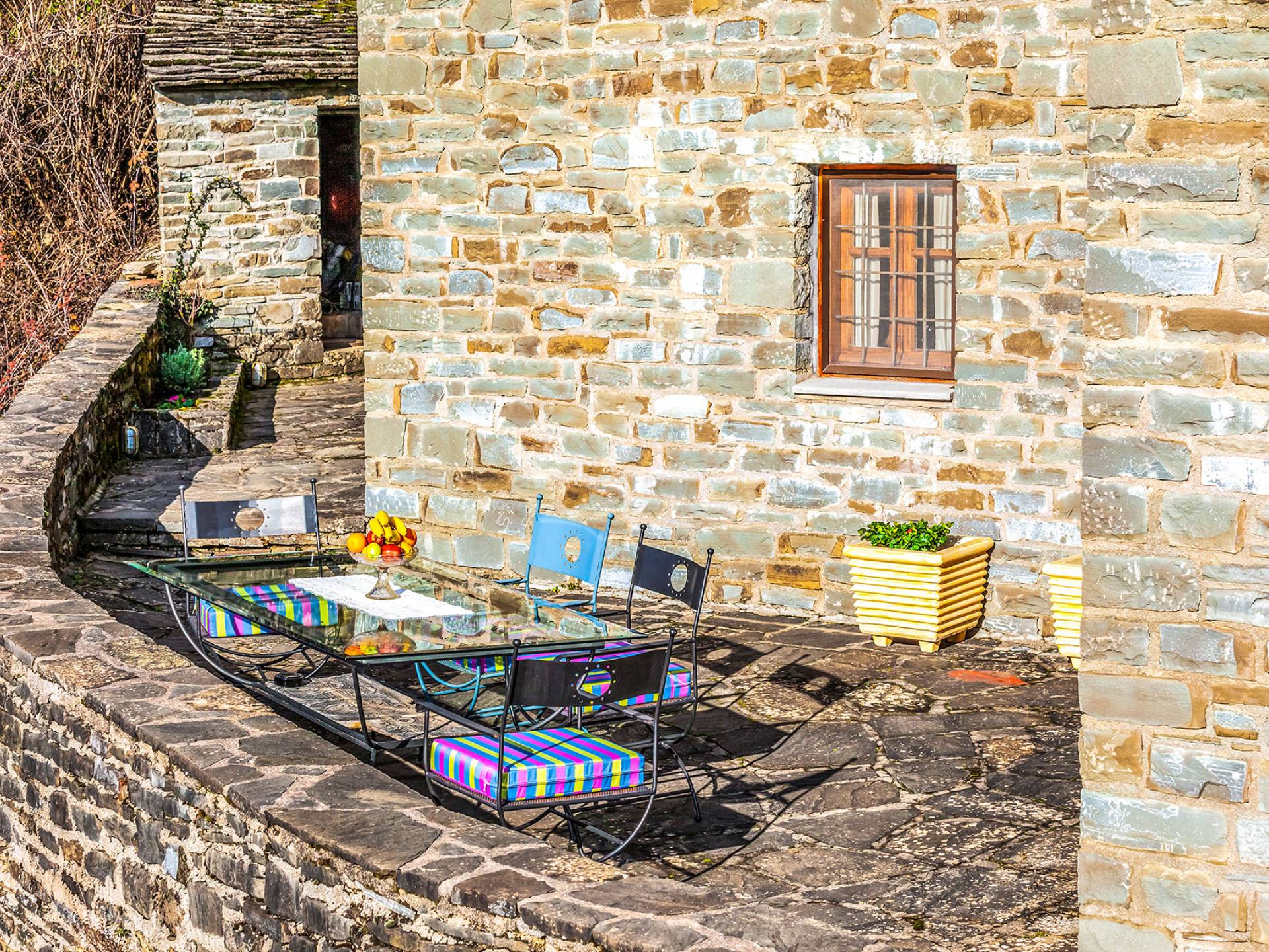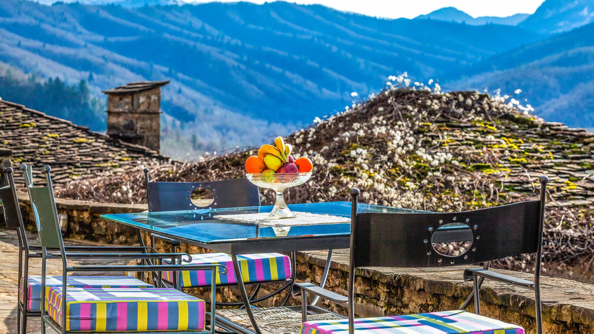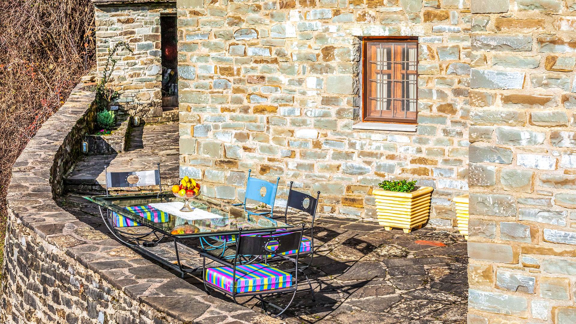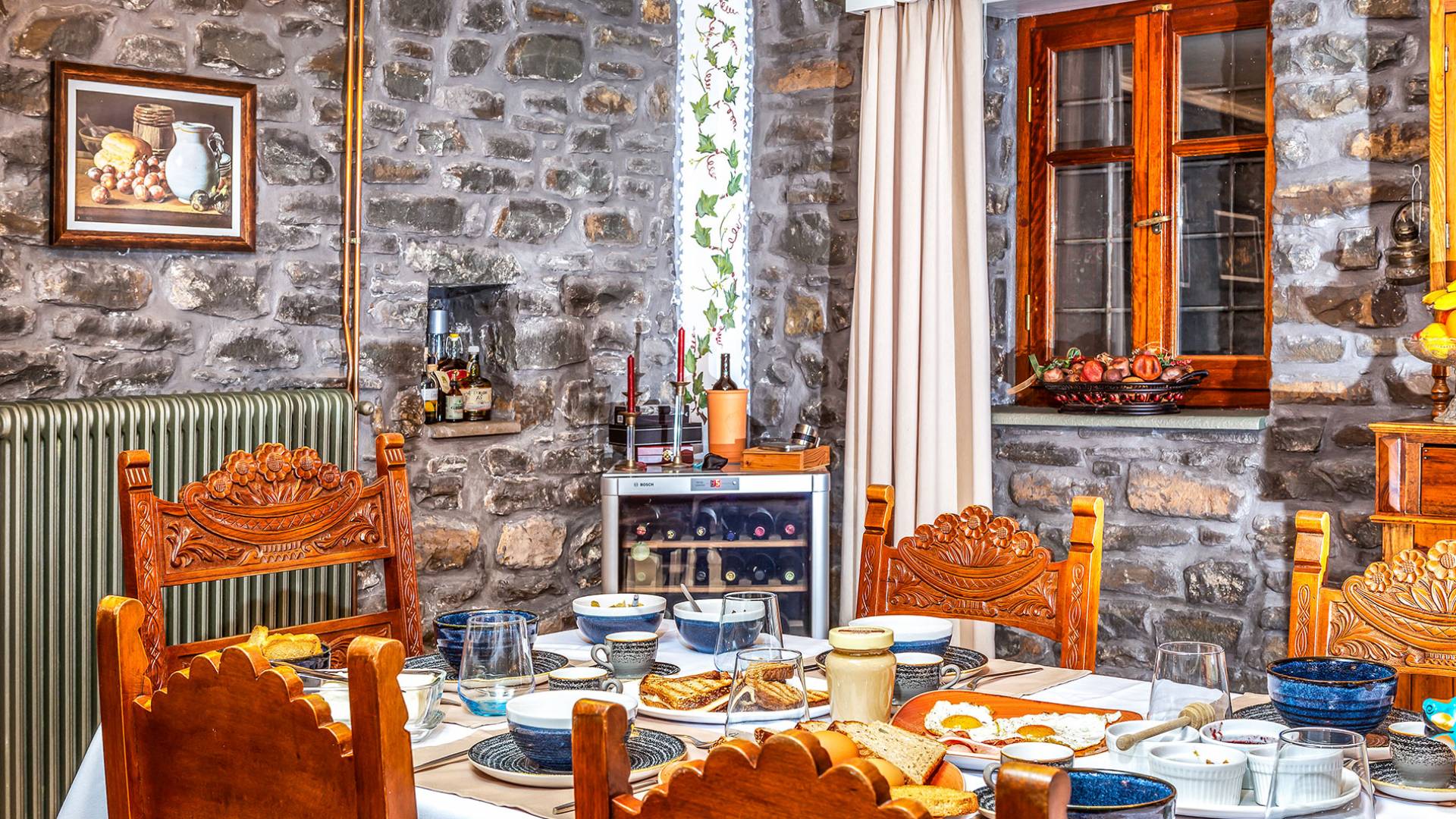 Dans la cour de l'immeuble, vous trouverez une salle à manger pour 8 personnes, en fer massif et verre, située au point avec la plus belle vue dans toutes les directions, vers les montagnes, le village et la rivière . Dans le jardin, il y a un équipement de barbecue (grillades) pour ceux qui ne résisteront pas au défi d'organiser une soirée barbecue avec les délicieuses viandes de montagne de la région, accompagnées de vieux tsipouro ou de vins célèbres de la cave de l'hôtel. L'air pur, la gastronomie, les boissons et la bonne compagnie sont la recette grecque ultime du bien-être !