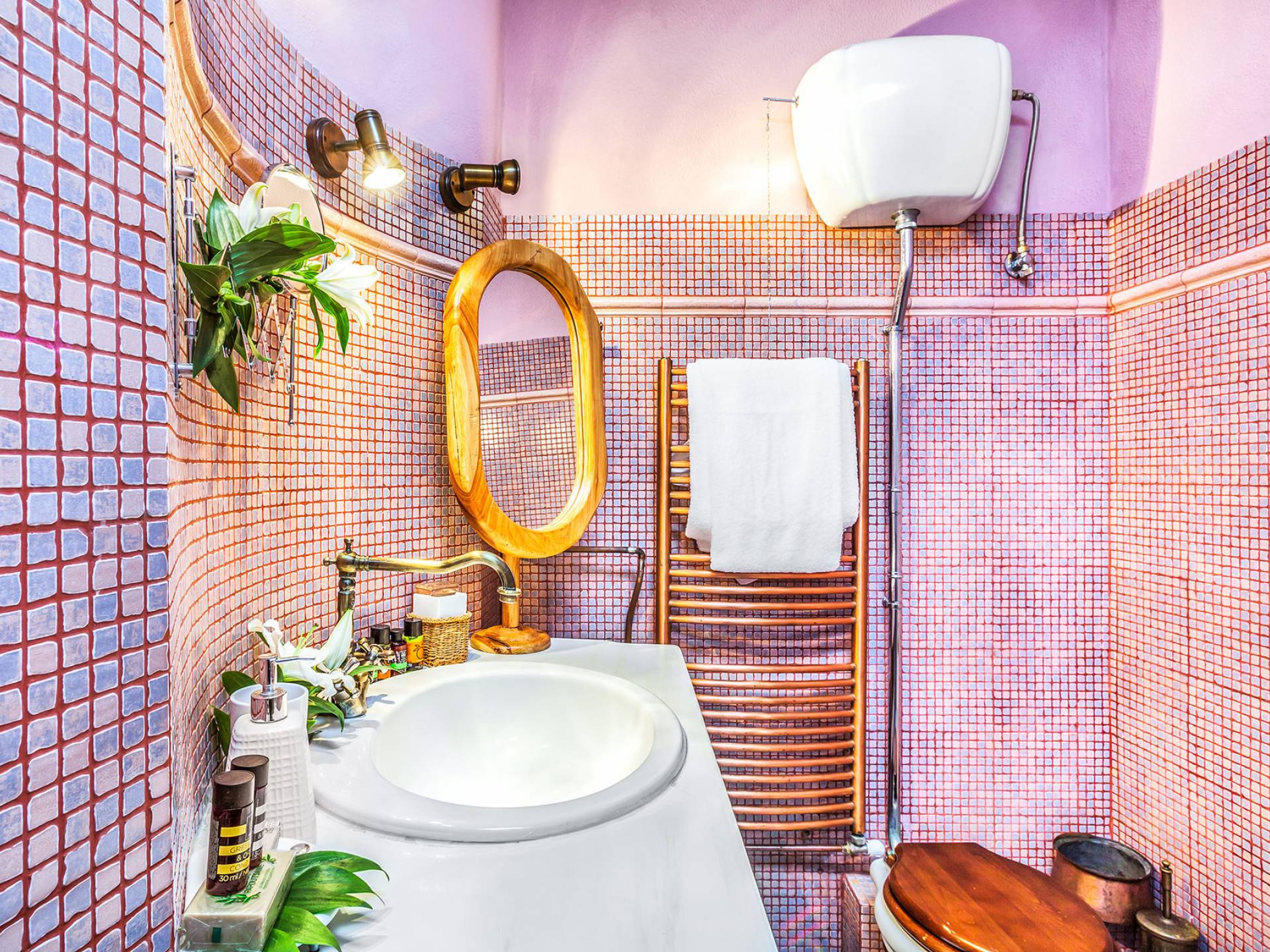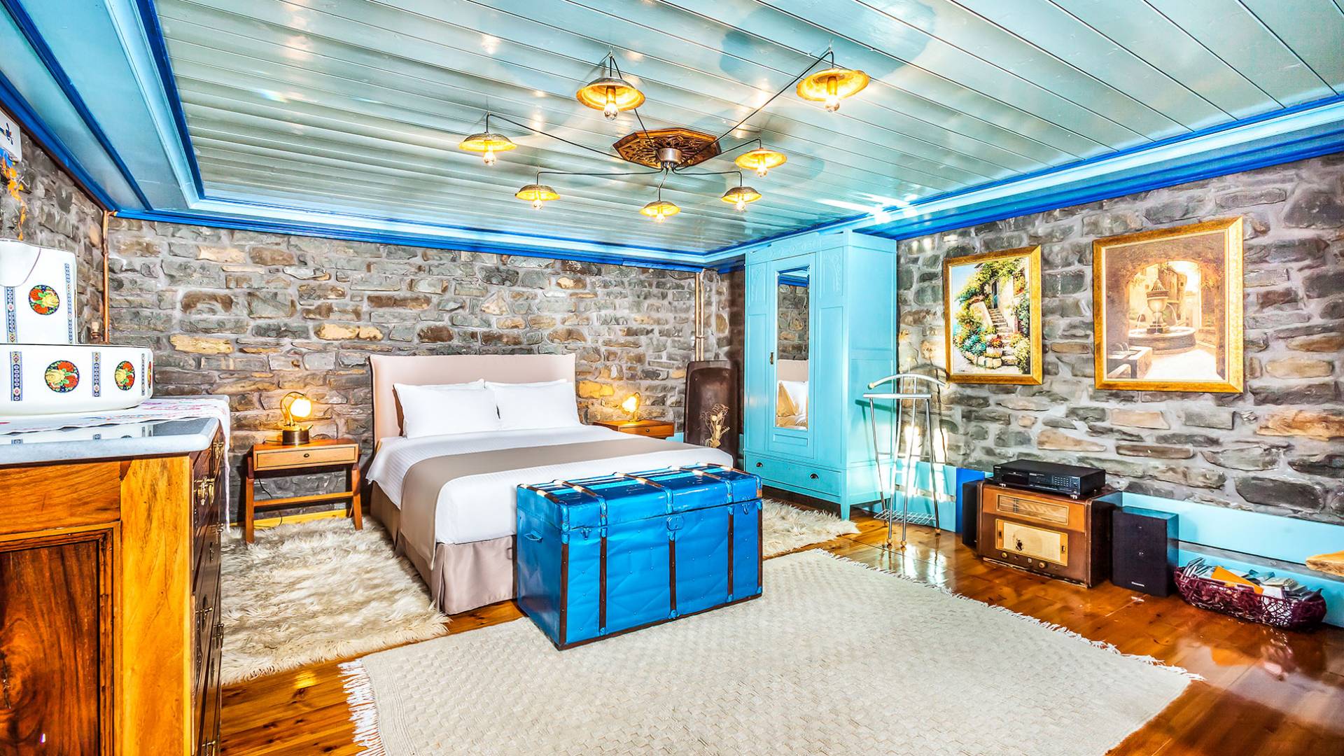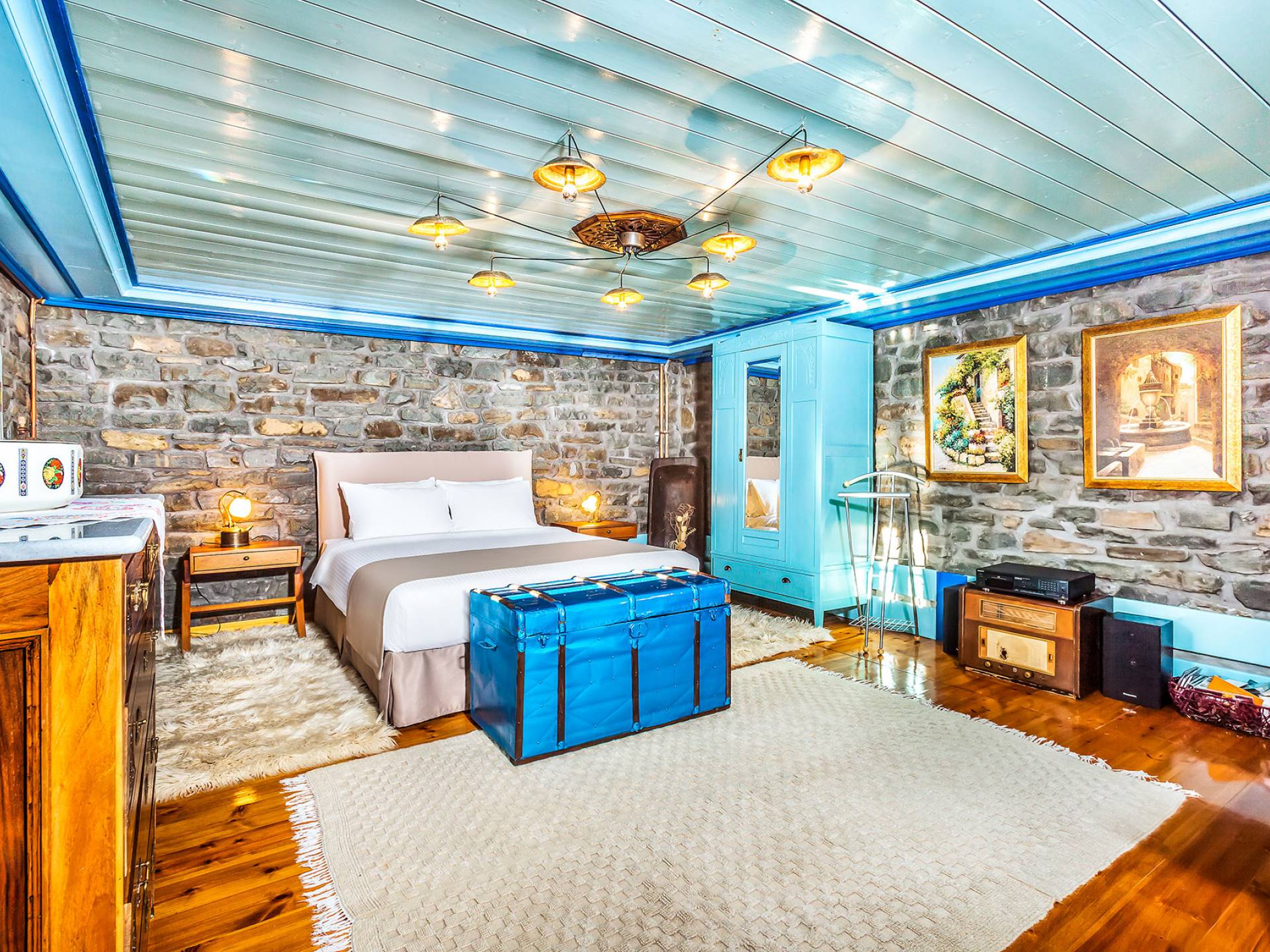 Au rez-de-chaussée de la maison, vous trouverez une grande et belle chambre avec un lit king-size, un luxueux matelas SPRINGS surélevé et des oreillers moelleux, tous testés hygiéniquement et spécialement traités pour éviter d'être affectés par les acariens. Des couleurs douces, dominées par le bleu cobalt, une décoration d'un goût exceptionnel, un éclairage romantique, des flocages à chaud sur les parquets en chêne, le chauffage central et de grandes baies vitrées donnent une touche nostalgique à l'espace. Une imposante malle imposante, une armoire vintage avec un miroir, et un décor multicolore du début du XXe siècle vous transporteront dans des temps plus anciens, où confort et noblesse étaient généreusement offerts aux chambres d'hôtes. Nid de lune de miel idéal et couples amoureux éternels. Au rez-de-chaussée, on prévoit un beau WC fonctionnel et un mini spa pour deux personnes.