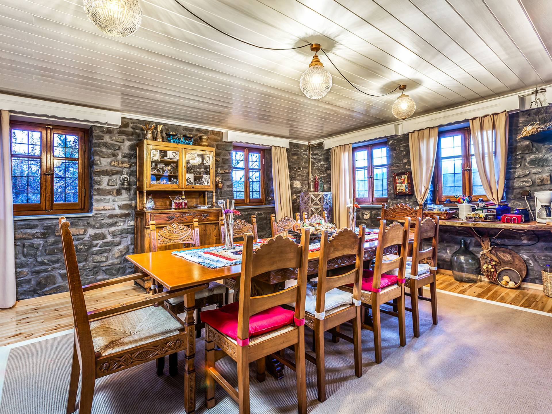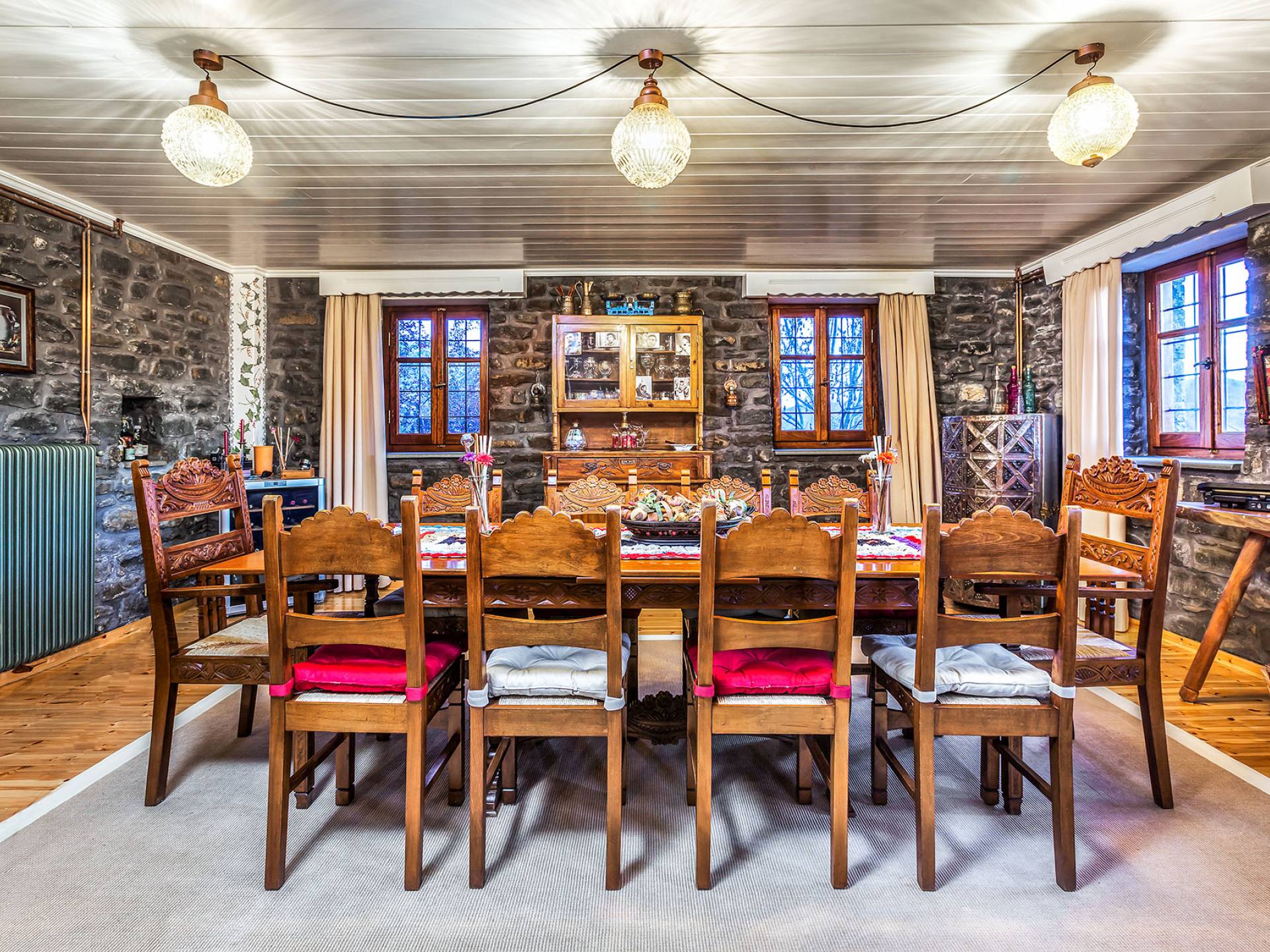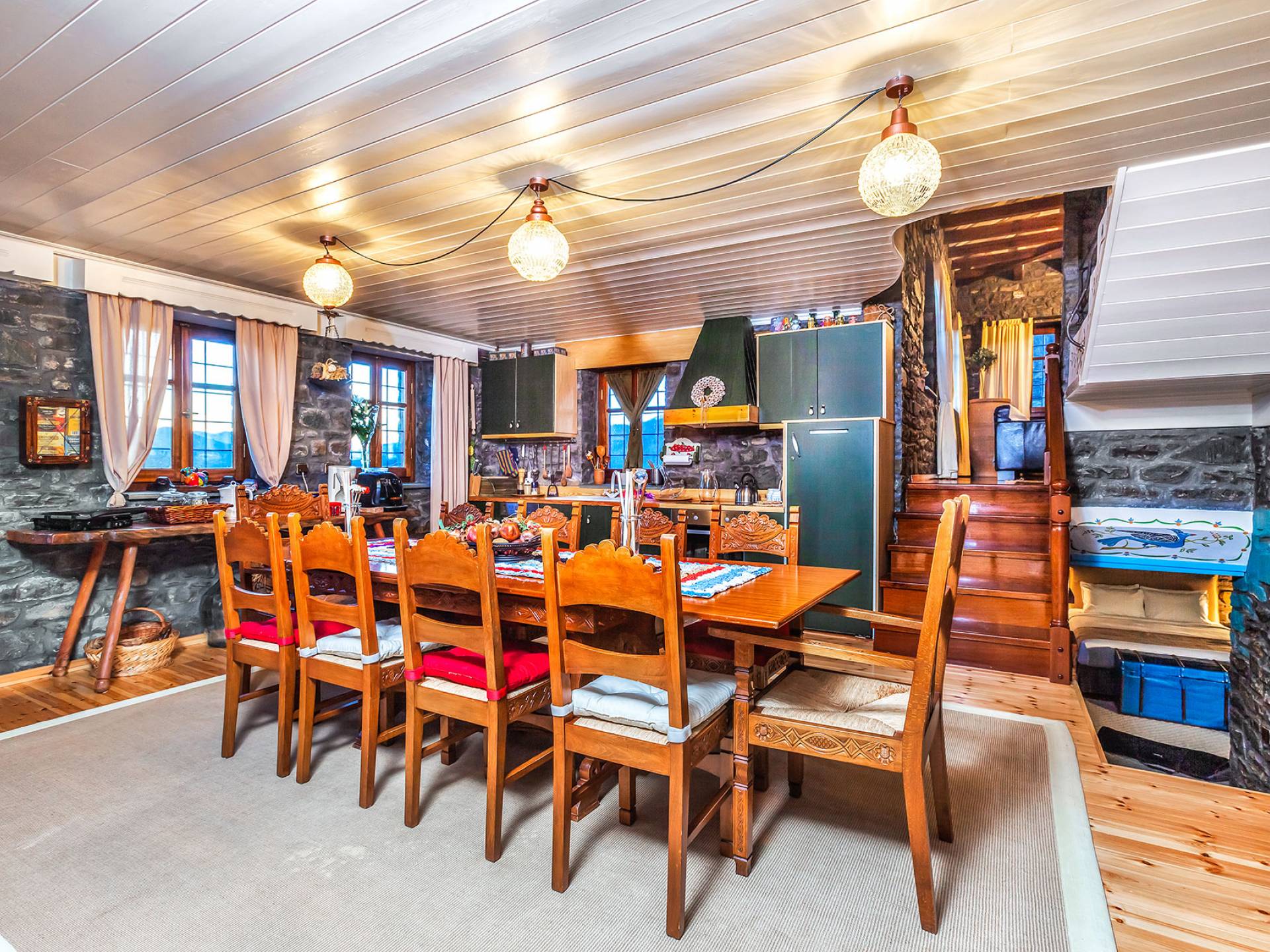 Cuisine et salle à manger spacieuses et très lumineuses. Comptoir et évier spacieux, une variété d'armoires pour ranger les ustensiles de cuisine et de service, ustensiles de cuisine complets, appareils électriques modernes tels qu'un grand réfrigérateur/congélateur, plaques de cuisson en céramique et fours, hotte aspirante, cafetière, grille-pain, grille-pain, bouilloire, vin glacière et lave-vaisselle. Les renfoncements des murs, traditionnels "fenêtres", accueillent une collection spéciale de boissons, remplaçant le mobilier classique - bar. Salle à manger pour dix personnes avec des chaises sculptées de manière exquise et un décor rustique de bon goût. Dans le coin cuisine, vous pouvez préparer un copieux petit-déjeuner à partir d'une variété de produits biologiques.
