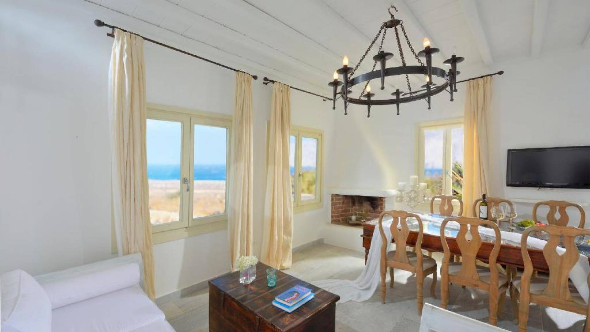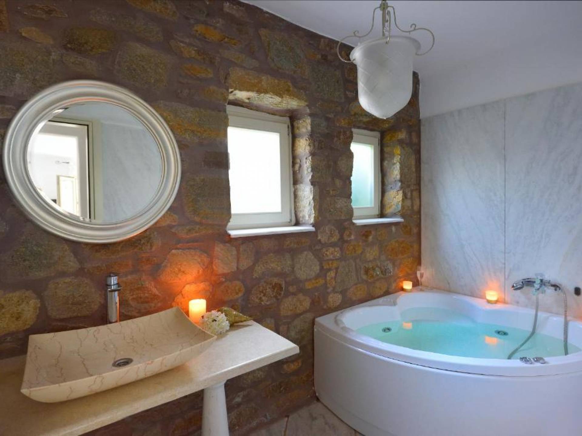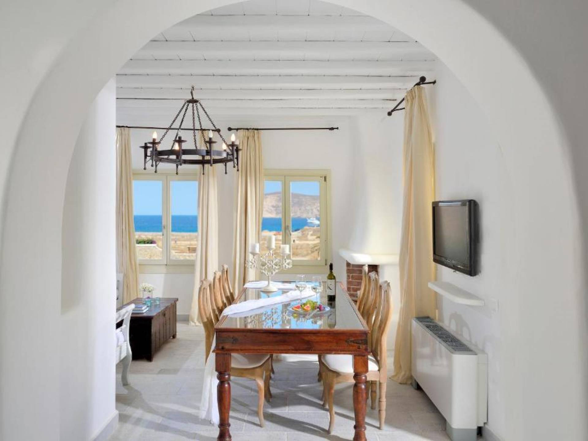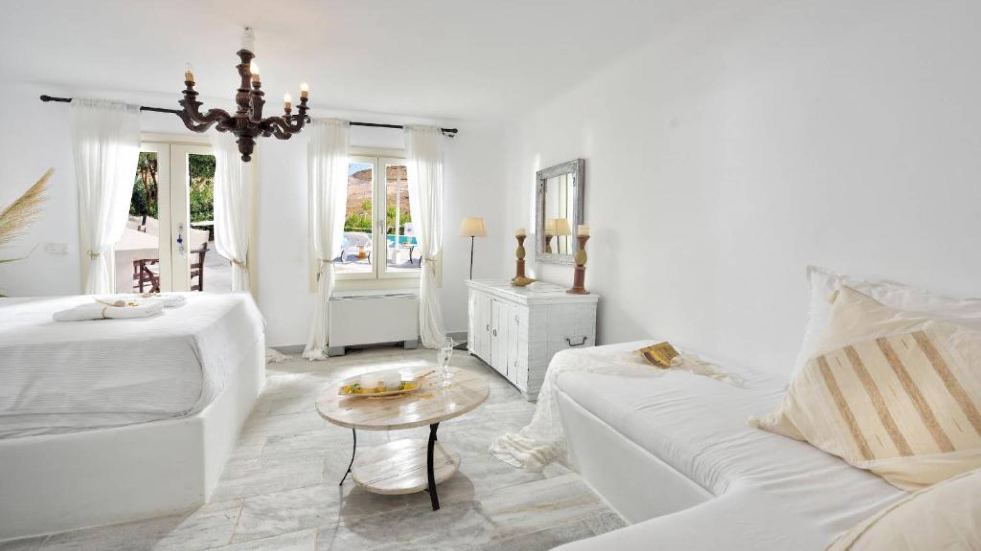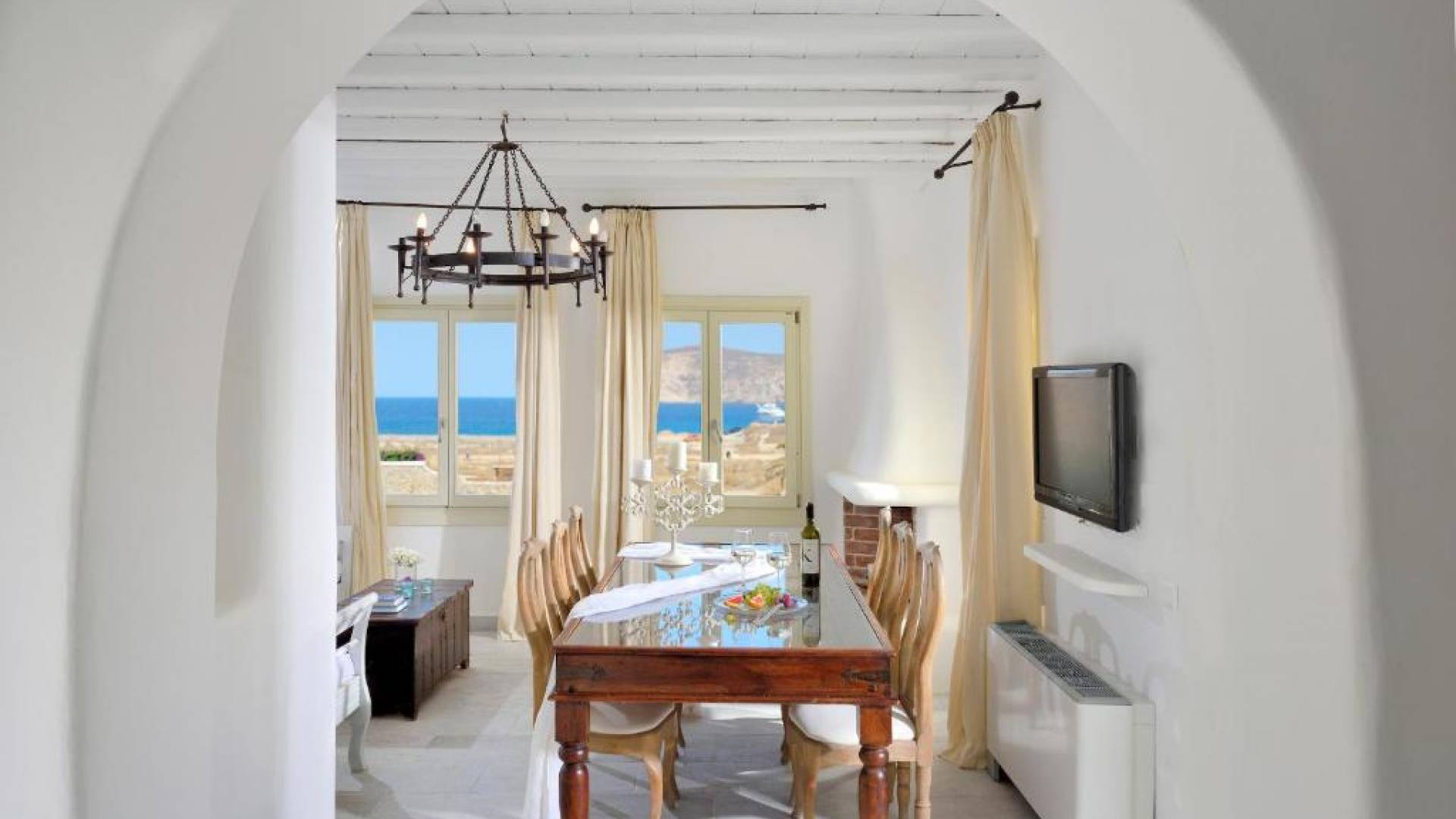 La Villa Atalia Mykonos est une superbe propriété offrant une vue panoramique imprenable sur la mer dans un cadre élégant et élégant. La villa se compose de deux sections, la maison principale et la suite d'invités. En entrant, vous vous retrouvez dans un grand salon décloisonné composé d'une salle à manger pour 8 personnes, d'un salon avec cheminée et d'une cuisine entièrement équipée. Le salon bénéficie d'un accès à une magnifique véranda en parquet offrant un coin repas extérieur ou un lieu de détente pour déguster des boissons fraîches et des apéritifs avec vue sur la plage. Située au même étage, une chambre spacieuse s'ouvre sur un joli balcon offrant une vue romantique sur la mer. Un escalier intérieur mène à une deuxième chambre au rez-de-chaussée avec accès à une luxueuse terrasse en marbre. Attenante, la suite d'invités avec entrée indépendante comprend une chambre triple avec dressing et une impressionnante salle de bain en marbre attenante avec baignoire hydro-massage.