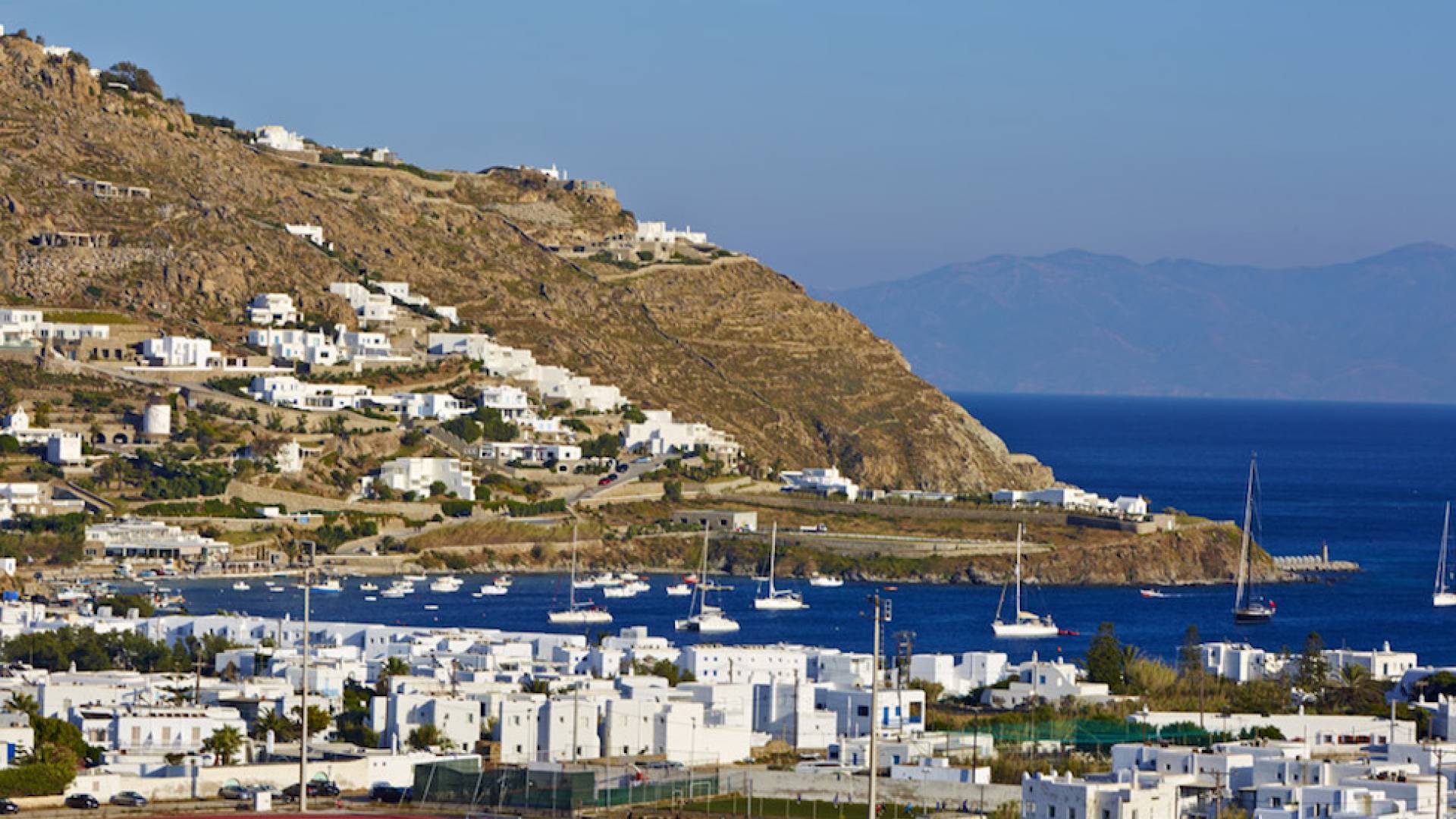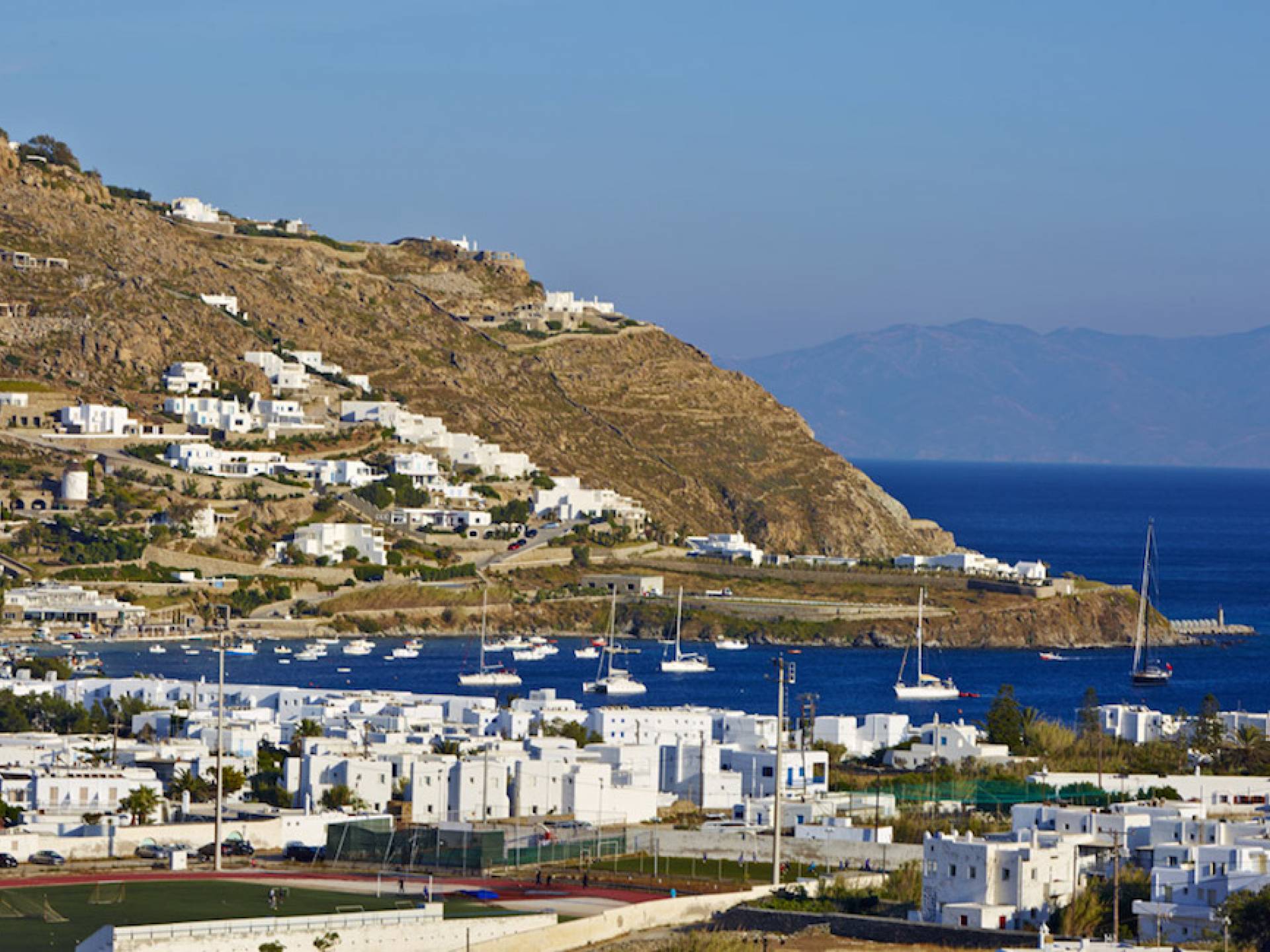 La plage d'Ornos Mykonos est située à 2,5 km près de Chora Mykonos et cela en fait la plage la plus proche de la capitale, avec du sable fin et des chaises longues / parasols à louer; c'est une très belle plage mais, malheureusement, elle est souvent surpeuplée en raison de sa proximité avec la ville. Une école de plongée, ainsi que des écoles de ski de mer et de planche à voile, se trouvent sur la plage pour les amateurs de sports nautiques…La plage d'Ornos Mykonos est située à 2,5 km près de Chora Mykonos et cela en fait la plage la plus proche de la capitale, avec du sable fin et des chaises longues / parasols à louer; c'est une très belle plage mais, malheureusement, elle est souvent surpeuplée en raison de sa proximité avec la ville. Une école de plongée, ainsi que des écoles de ski de mer et de planche à voile, se trouvent sur la plage pour les amateurs de sports nautiques…
