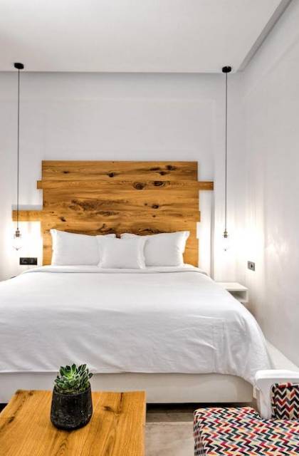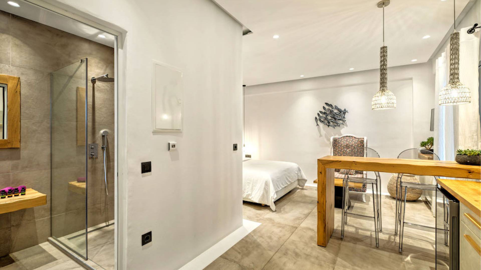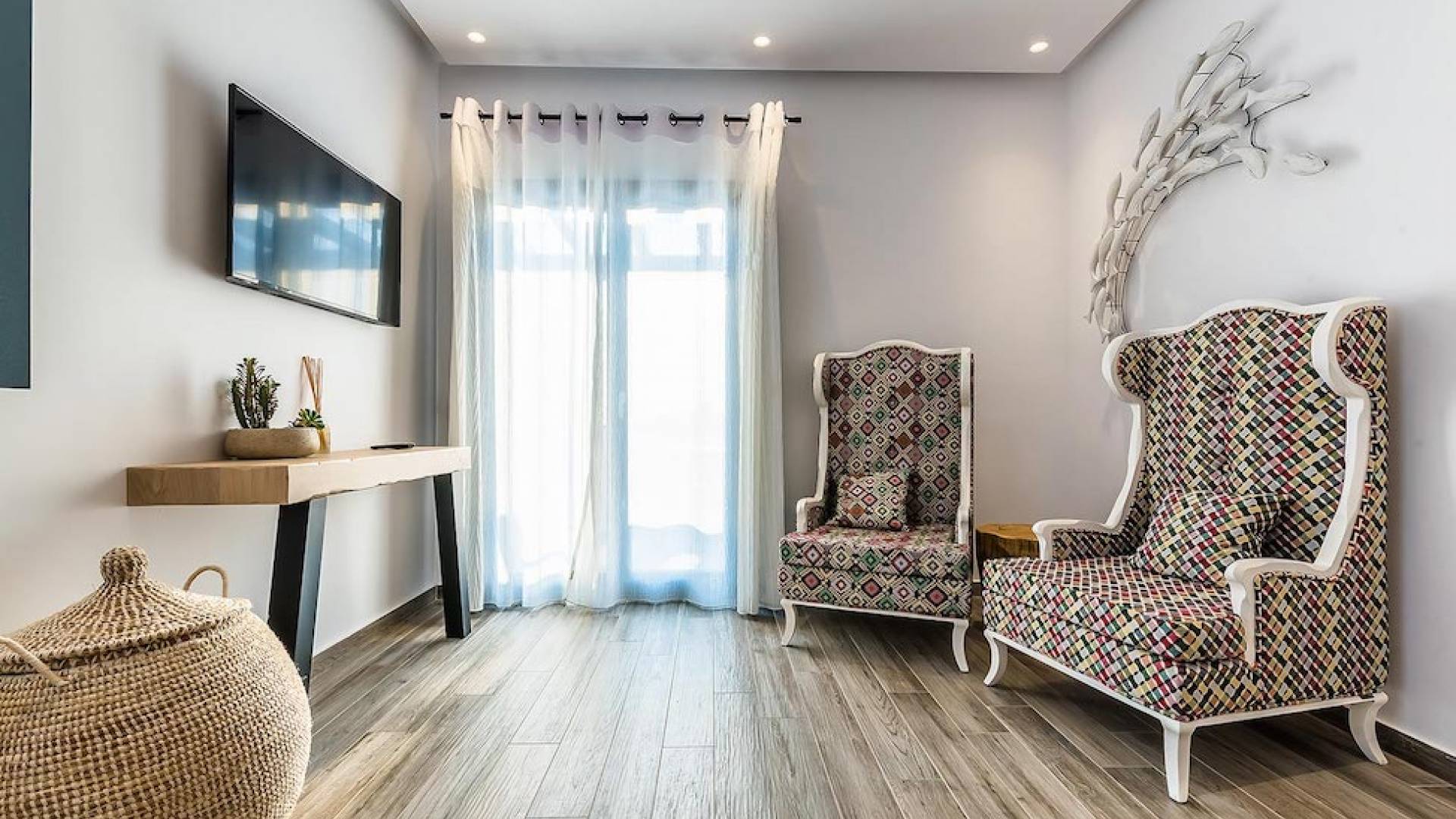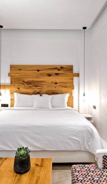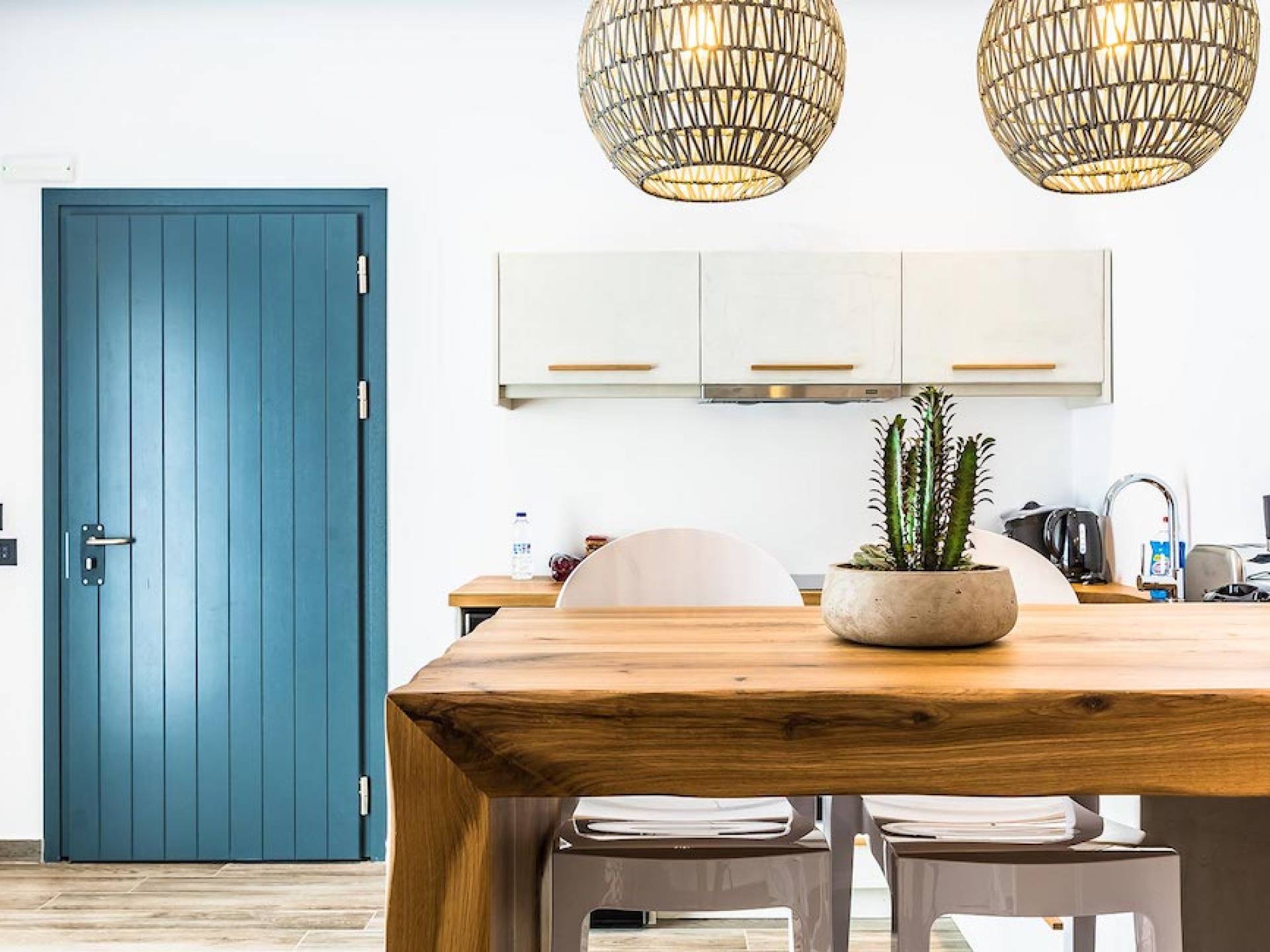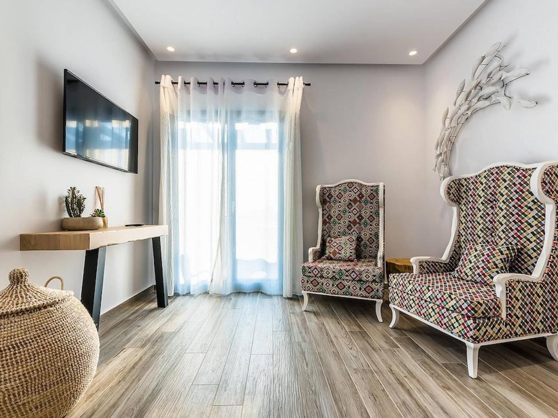 Présentant un plan décloisonné et joliment décoré dans des tons ocre et des touches contemporaines, la suite offre aux clients la détente et le confort dont ils ont besoin. La Suite Junior Portes est conçue en harmonie avec l'architecture traditionnelle des Cyclades, avec des meubles modernes et des détails en bois dégageant une sensation de luxe élégant. Il s'agit d'une option d'hébergement idéale et spacieuse pour deux personnes, dotée d'un lit double et d'un salon avec une cuisine entièrement équipée. De plus, la suite dispose d'une salle de bain avec douche à porte vitrée moderne et d'un balcon privé, pour des heures de détente sans fin sous le soleil égéen.