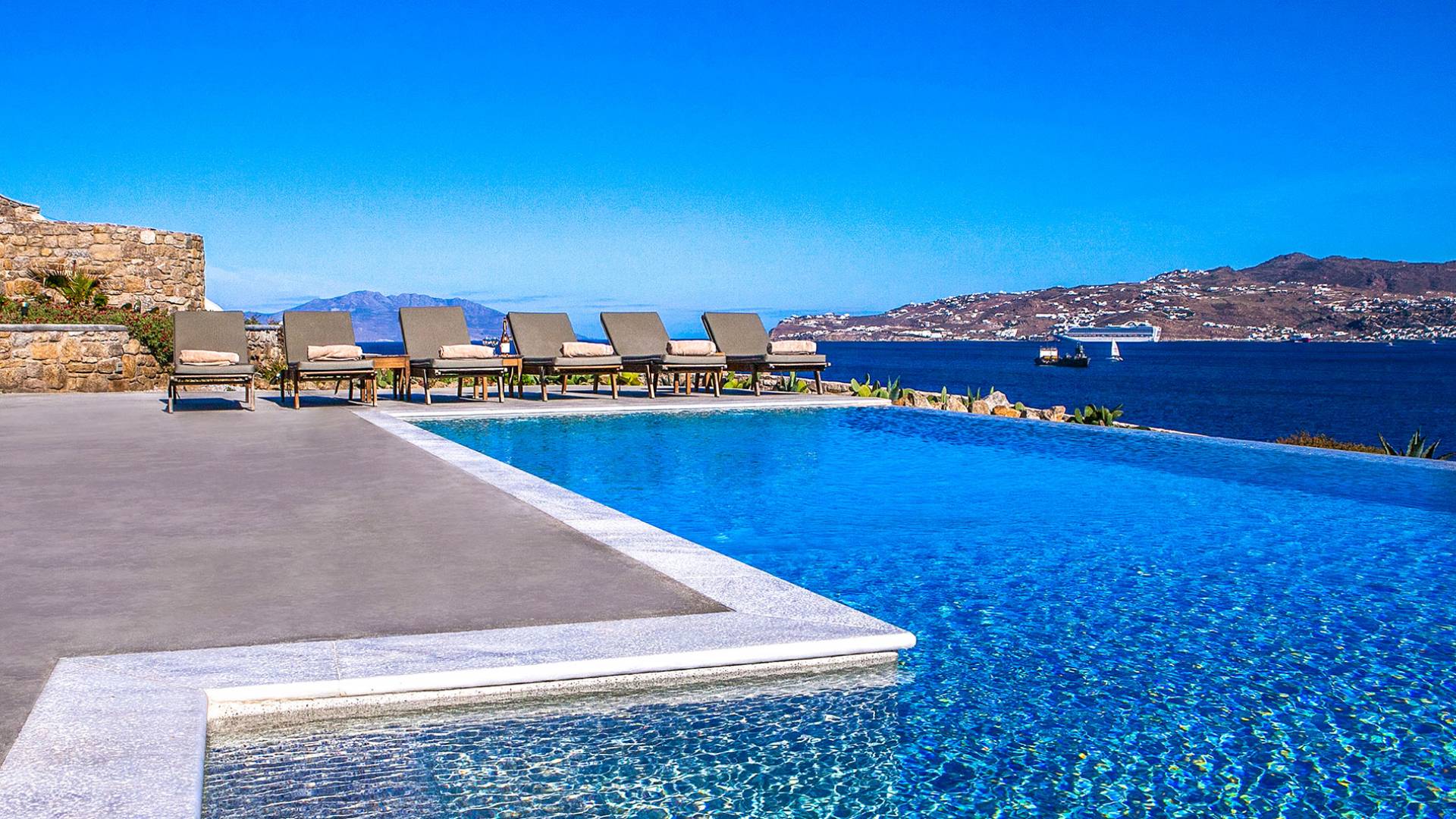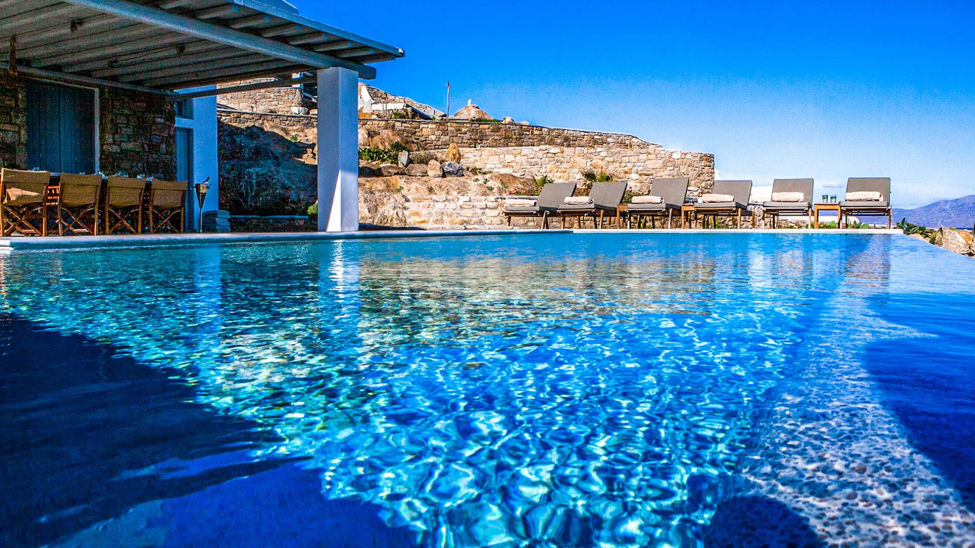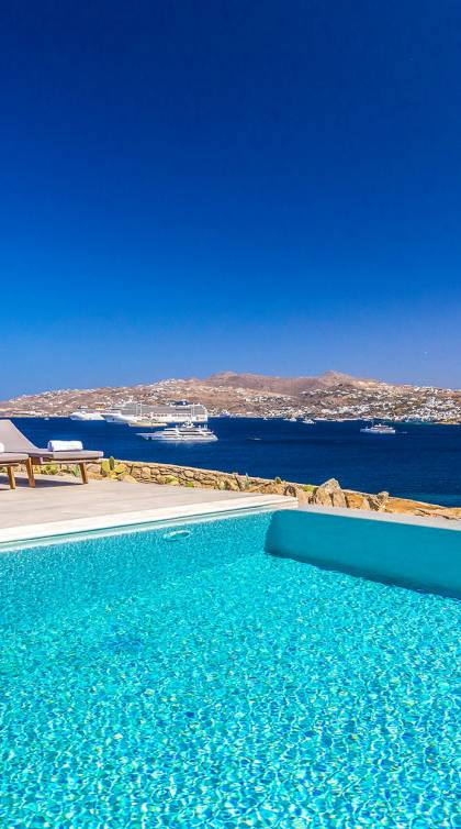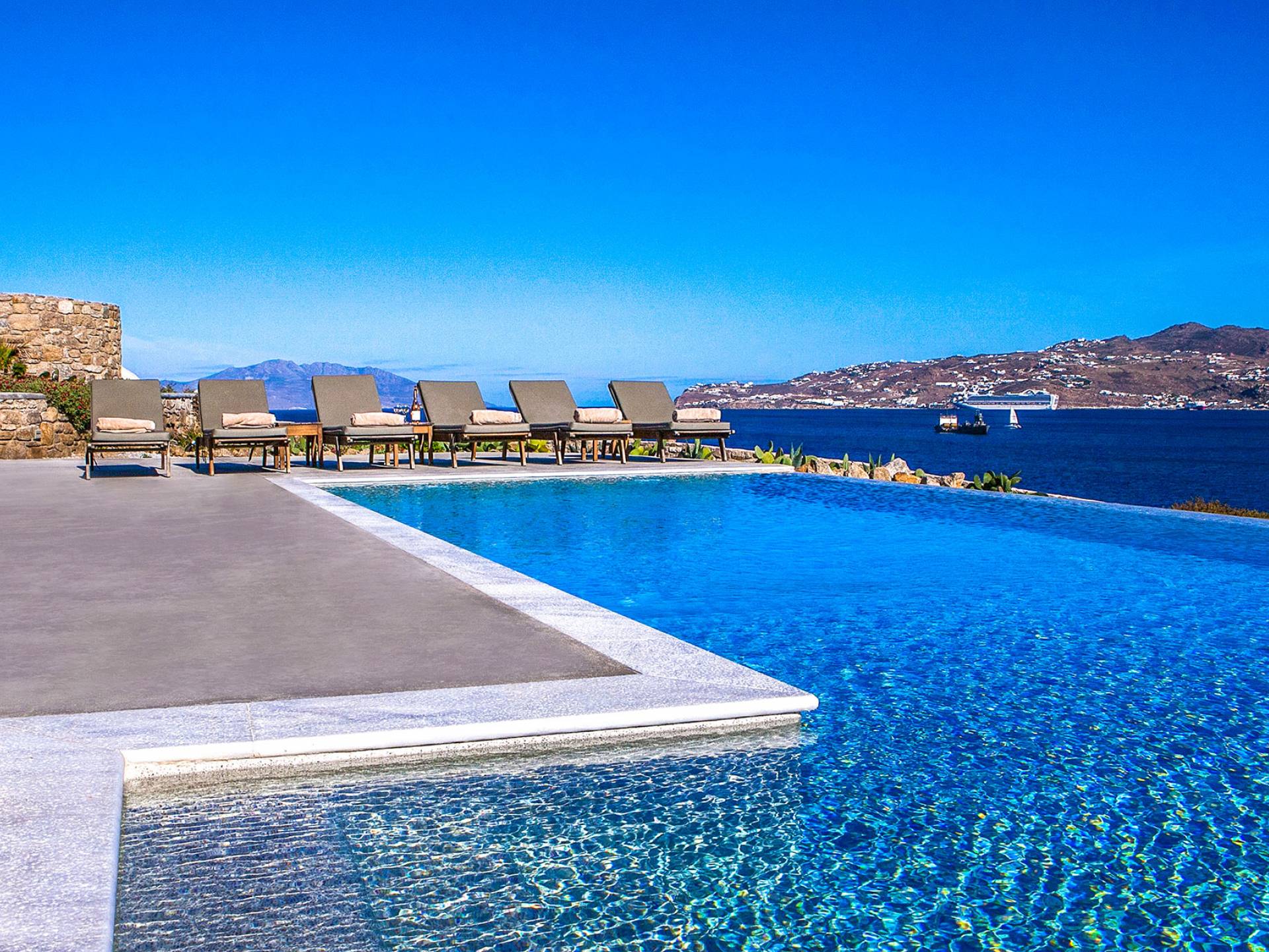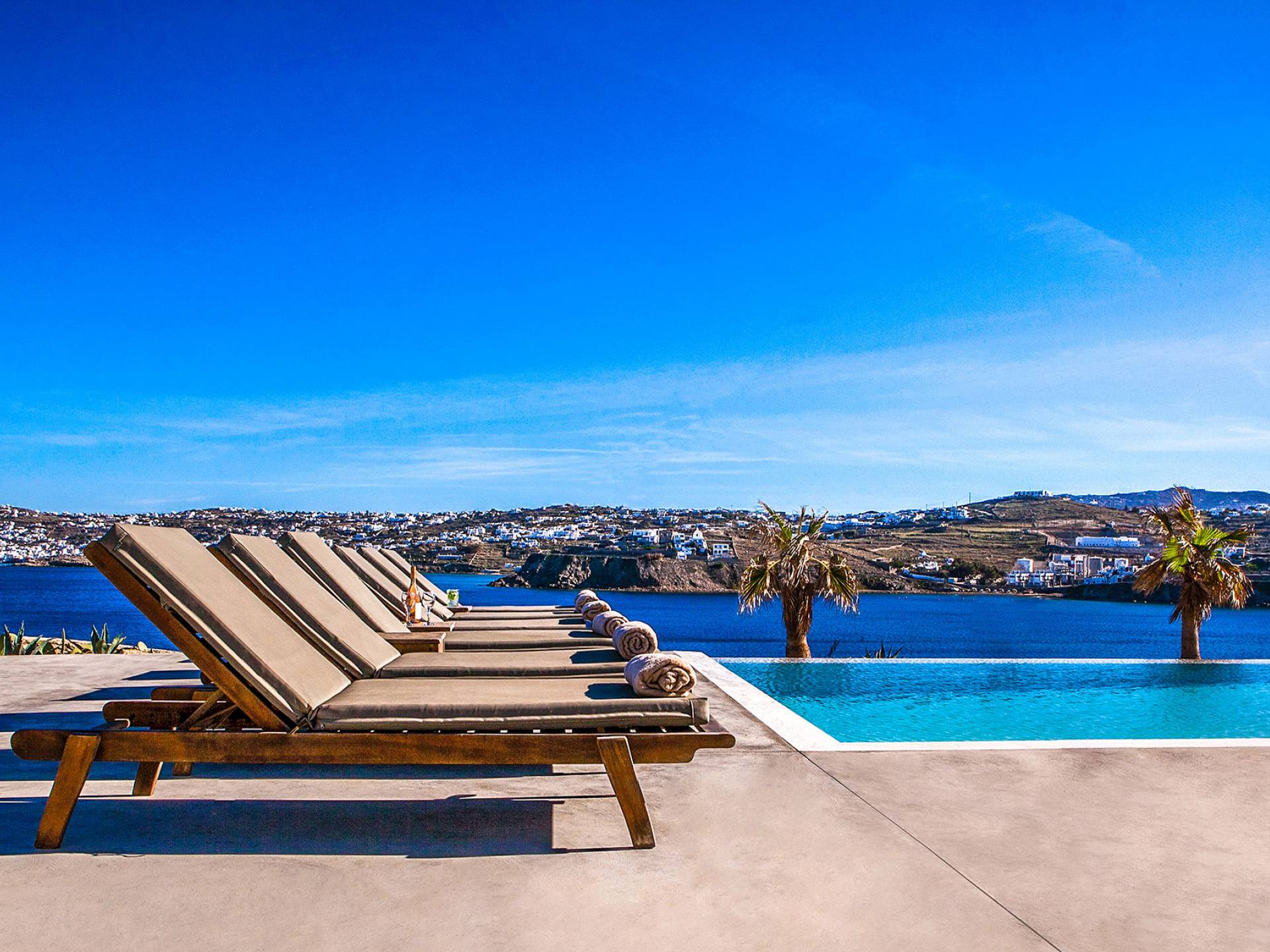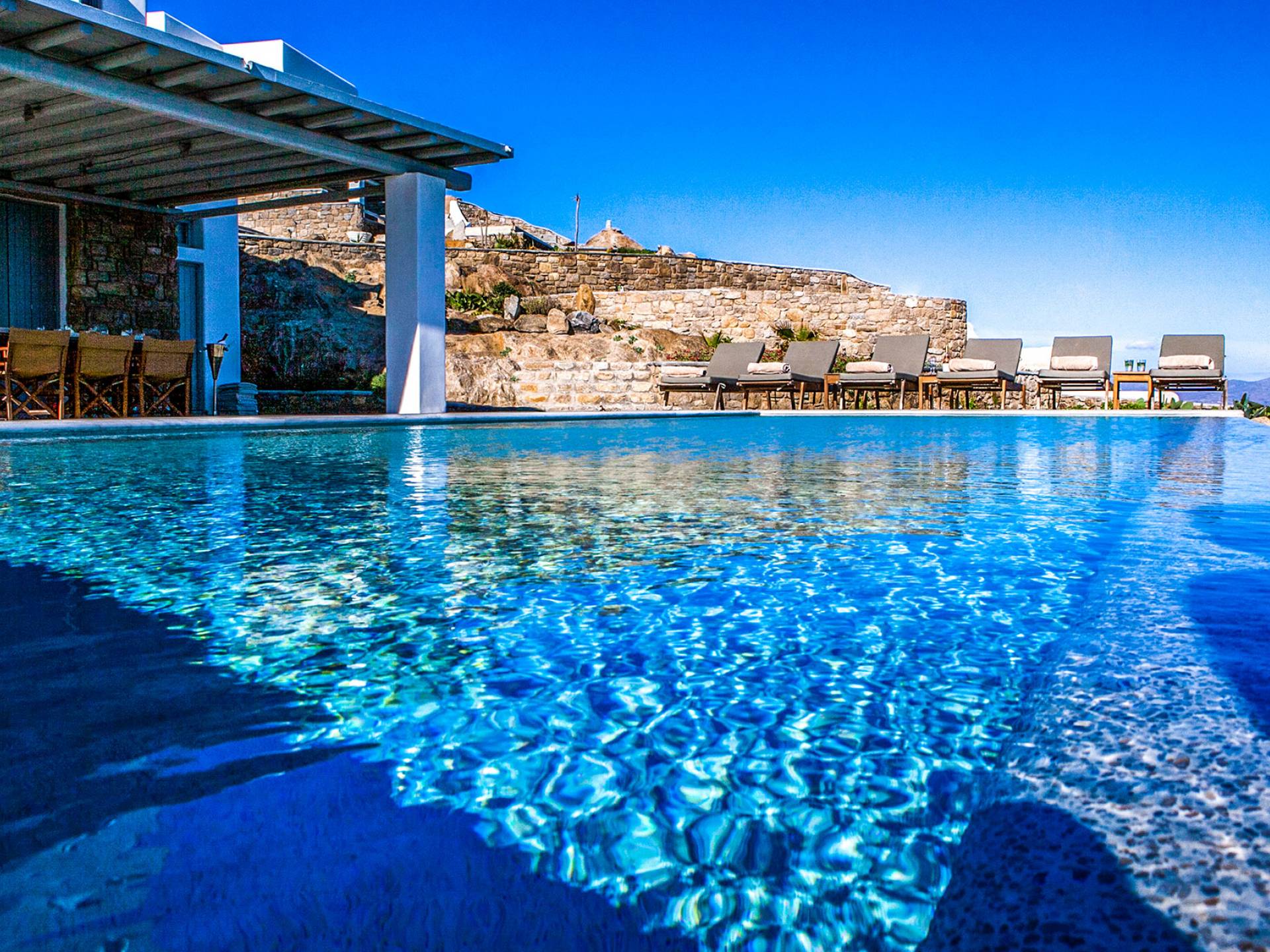 Chaque villa dispose d'une grande et élégante piscine à débordement de 30 m², construite avec des galets africains de haute qualité. Ces derniers sont entourés d'une spacieuse terrasse ensoleillée qui comprend un grand salon extérieur et ombragé par une pergola équipé de canapés confortables avec des coussins, des transats, des chaises longues et une grande table à manger qui prédispose les clients à savourer un délicieux repas ou un cocktail tout en regardant le majestueux lever de soleil. , écoutant les sons de la mer et surplombant la Petite Venise de Mykonos.