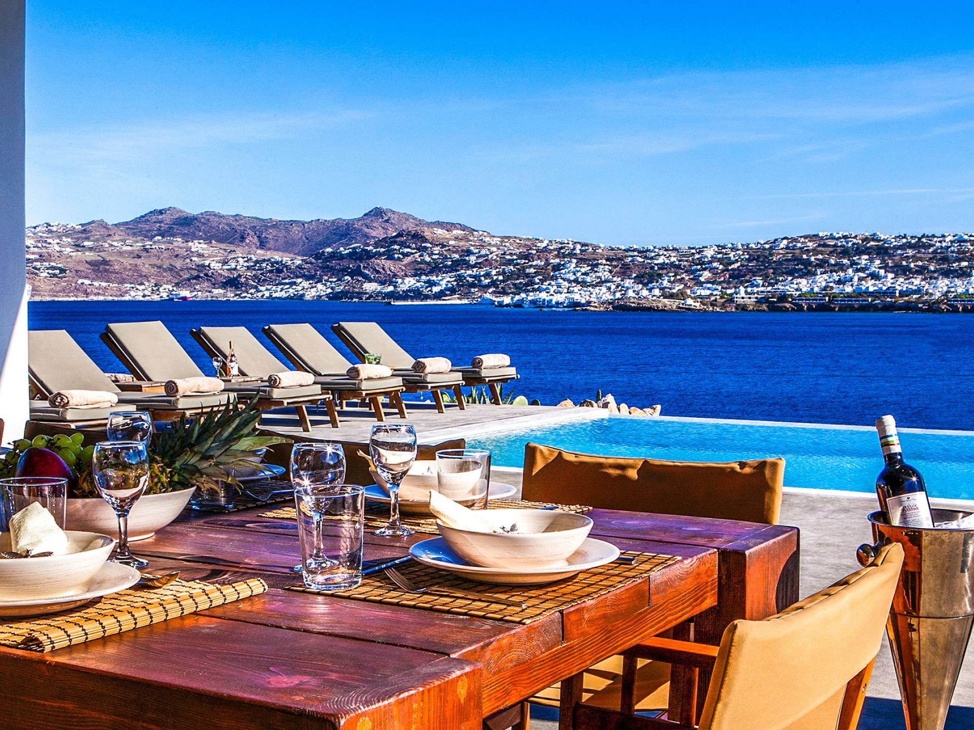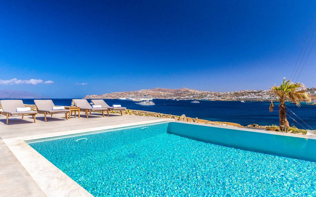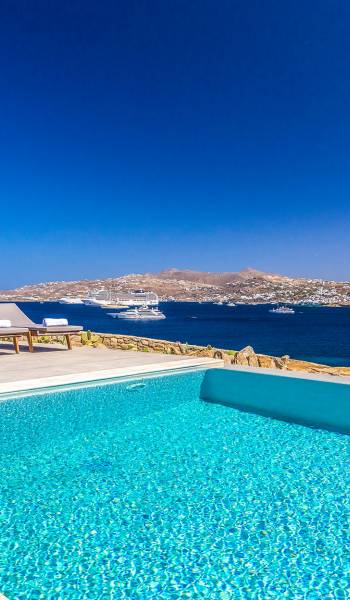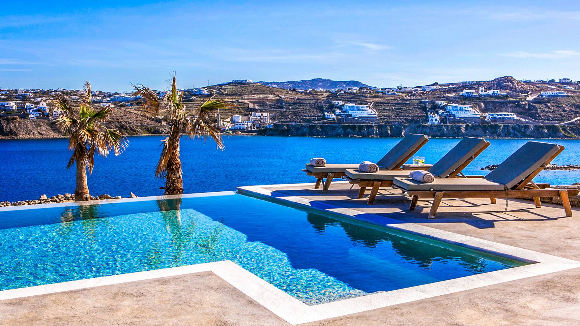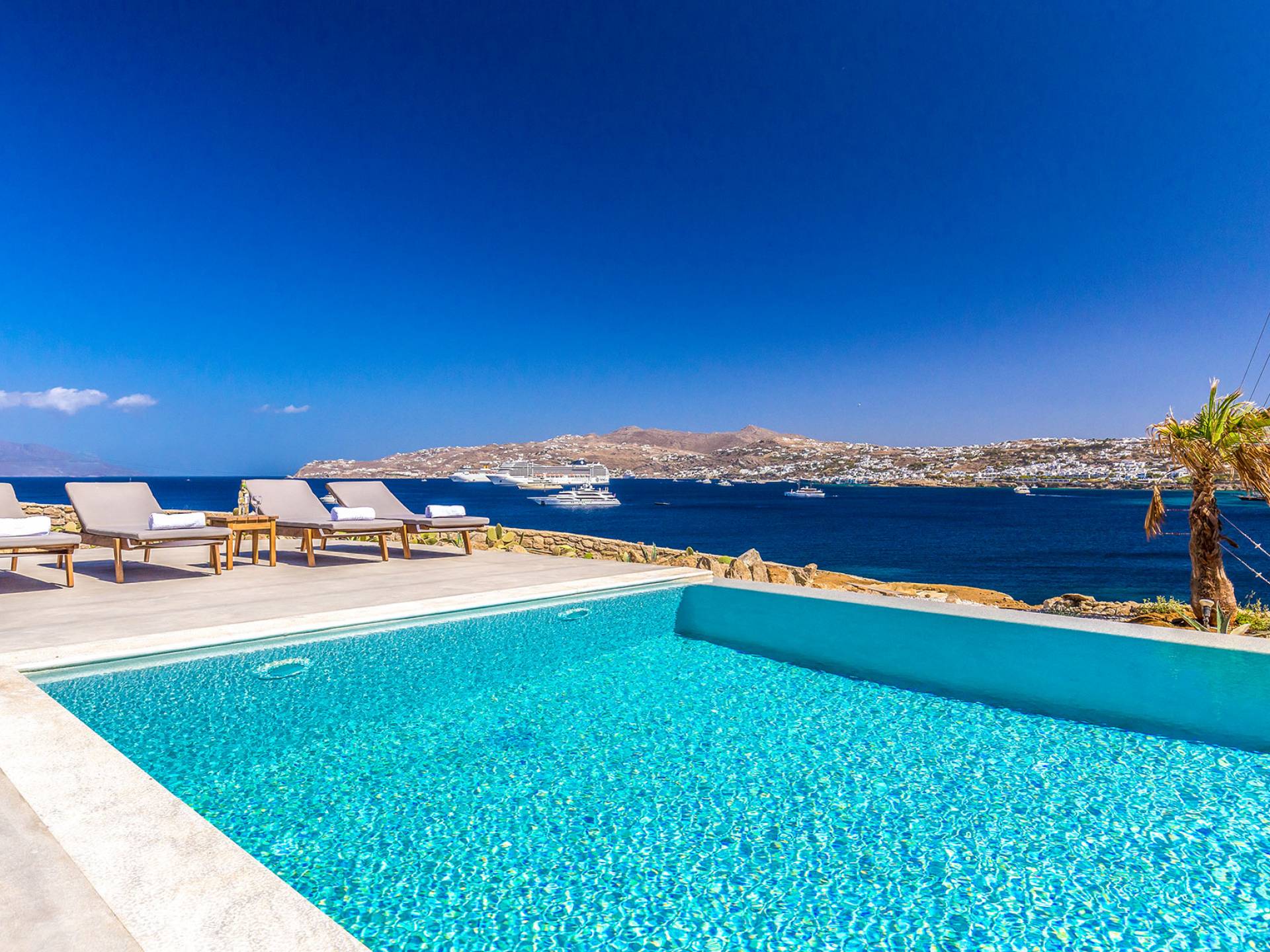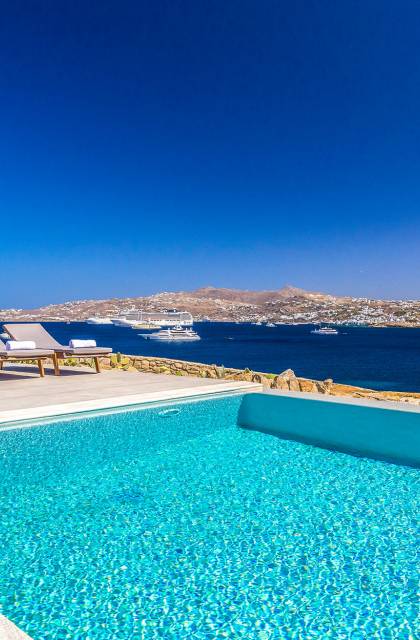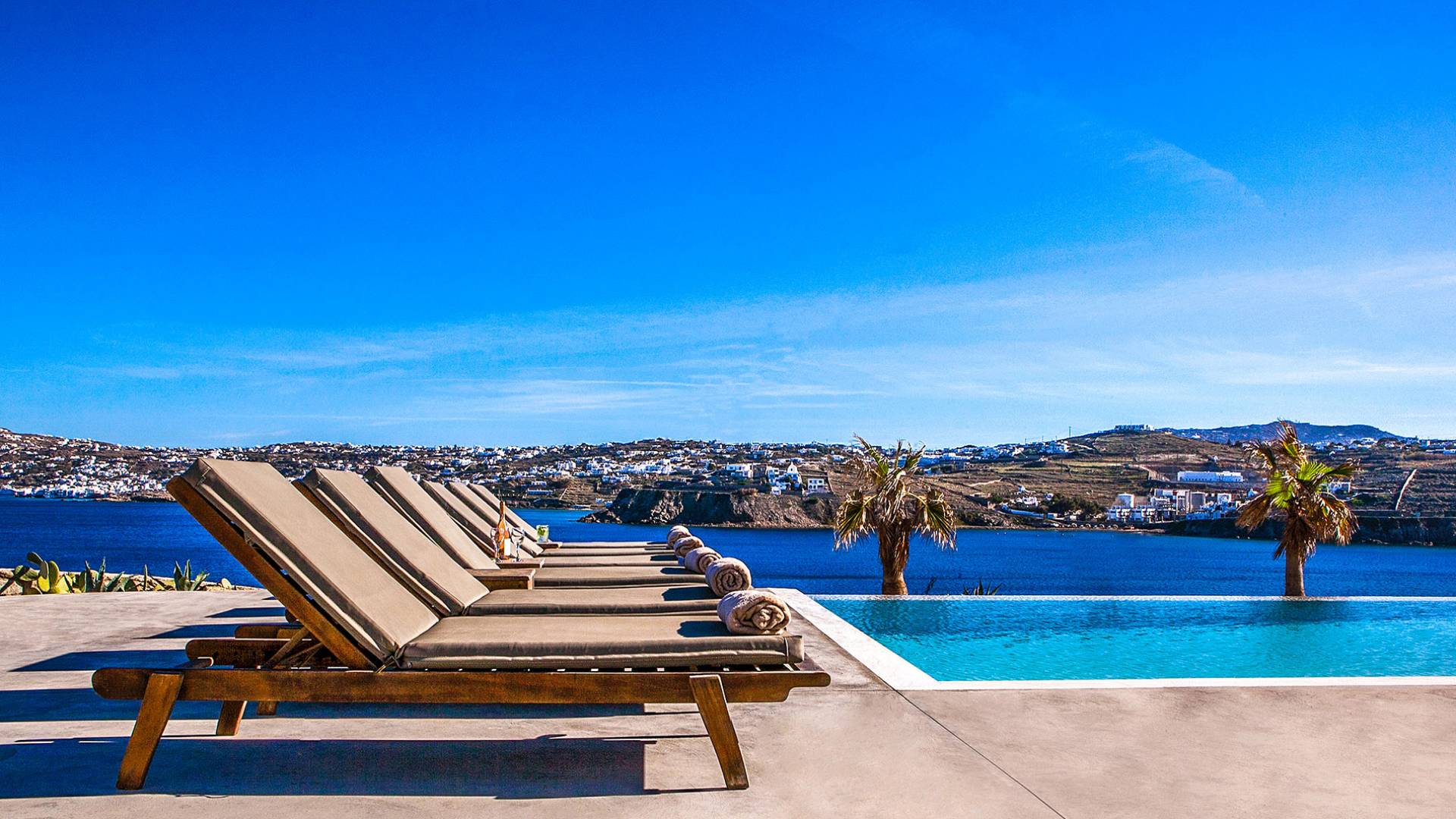 Chaque villa dispose d'une grande et élégante piscine à débordement de 30 m², construite avec des galets africains de haute qualité. Ces derniers sont entourés d'une spacieuse terrasse ensoleillée qui comprend un grand salon extérieur et ombragé par une pergola équipé de canapés confortables avec des coussins, des transats, des chaises longues et une grande table à manger qui prédispose les clients à savourer un délicieux repas ou un cocktail tout en regardant le majestueux lever de soleil. , écoutant les sons de la mer et surplombant la Petite Venise de Mykonos.
