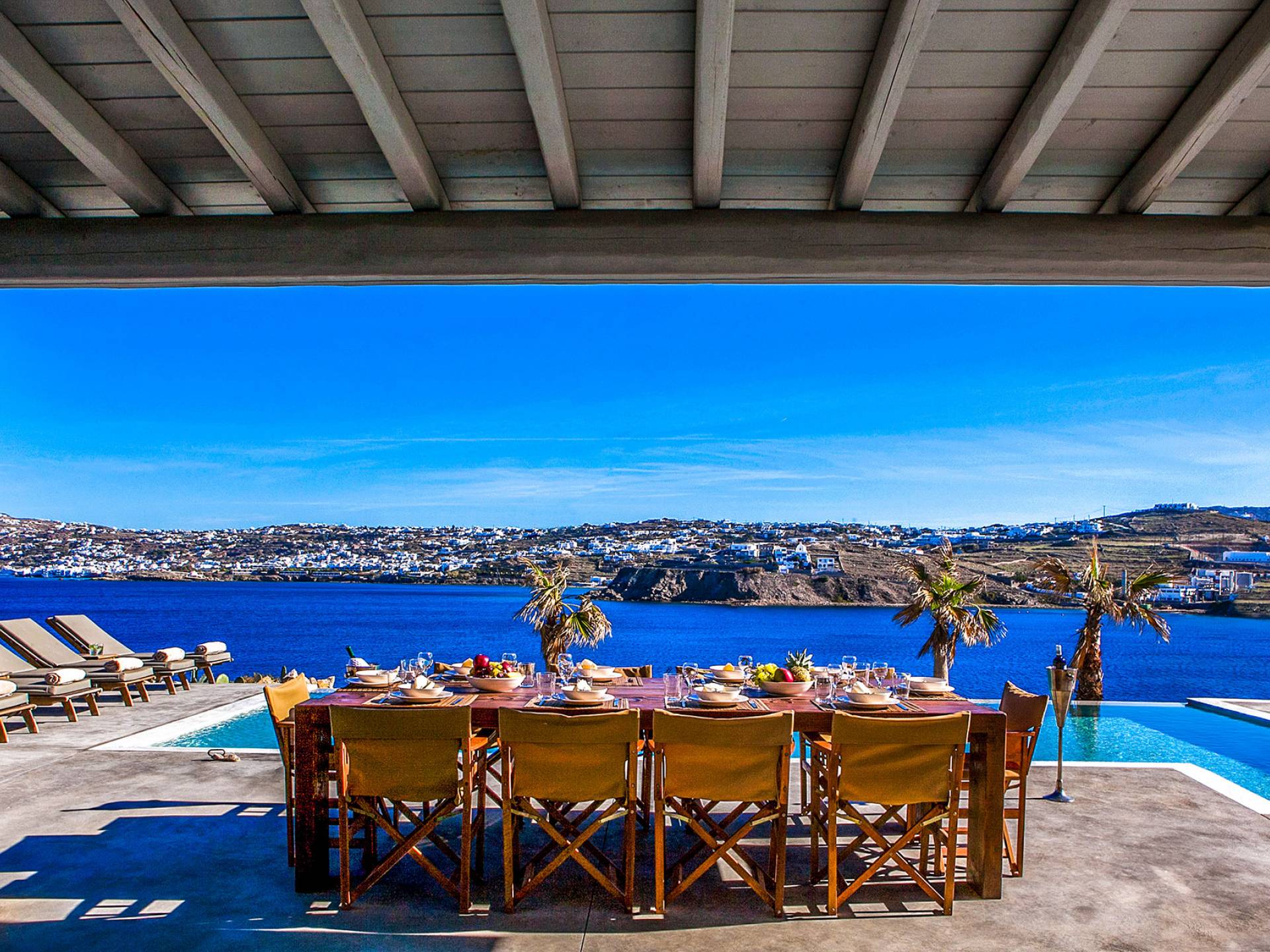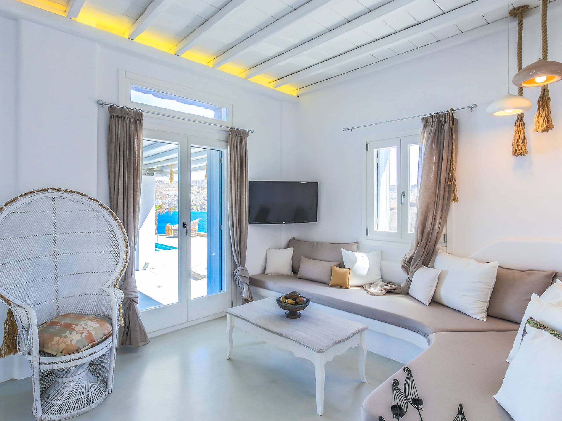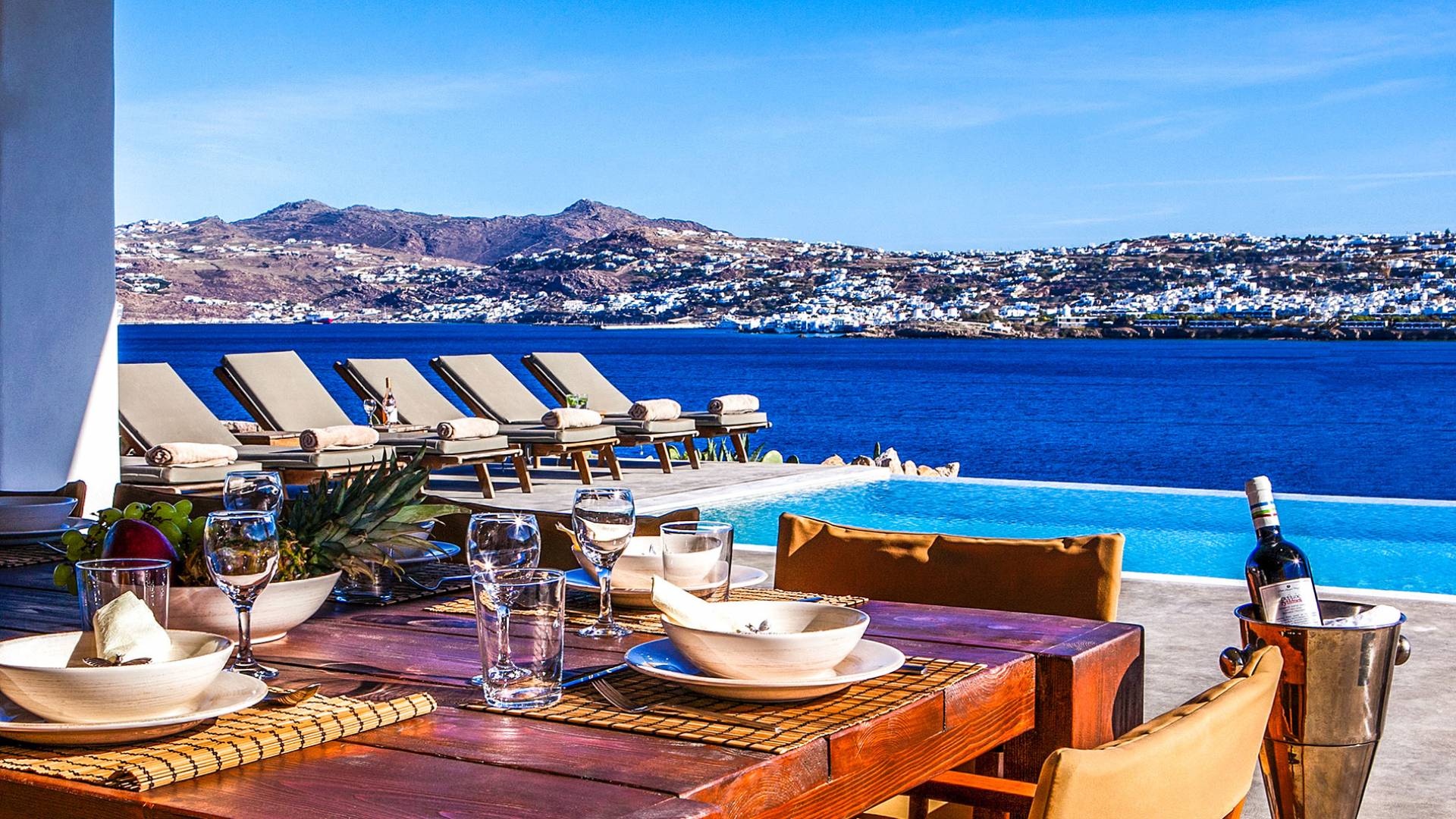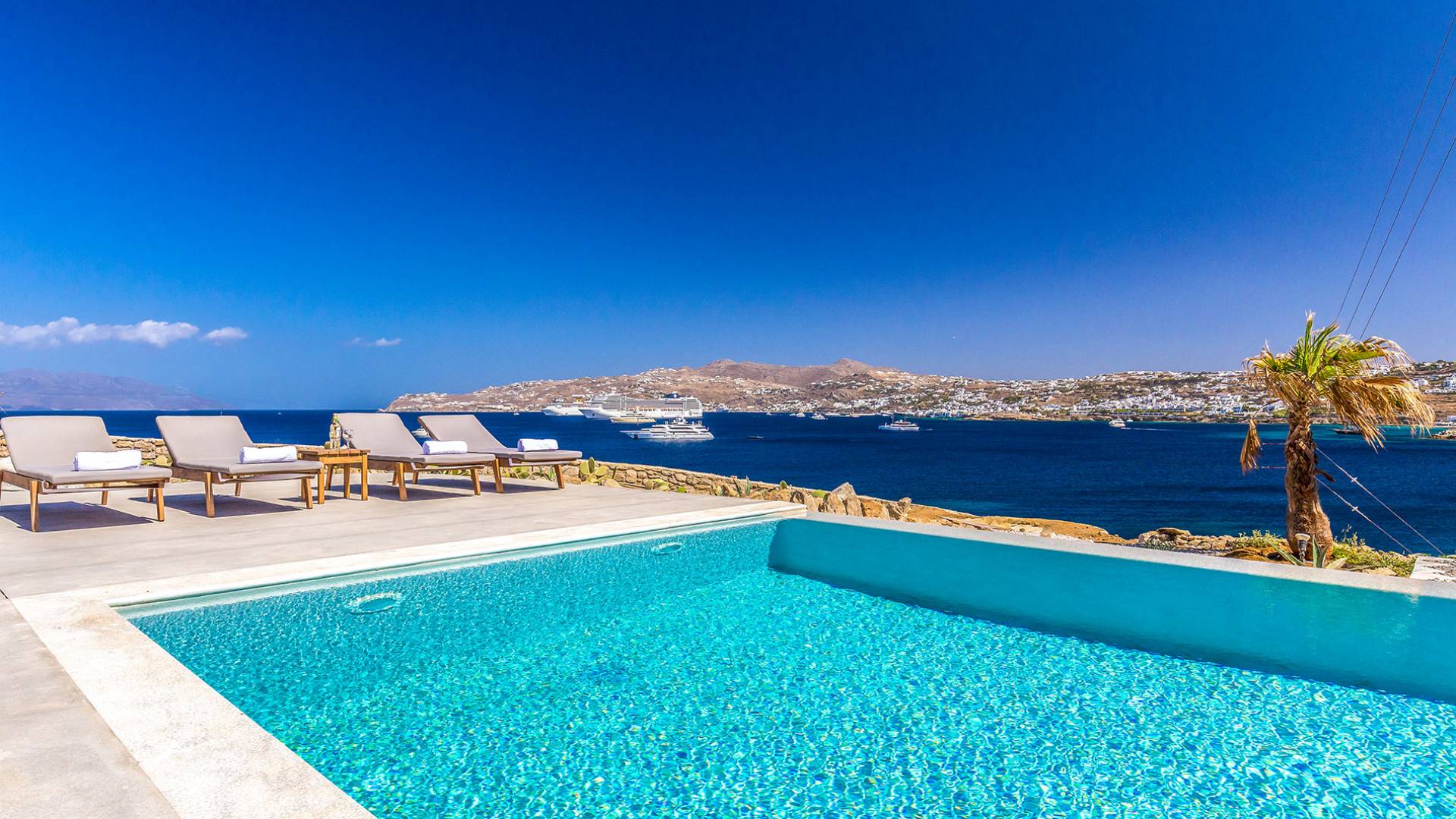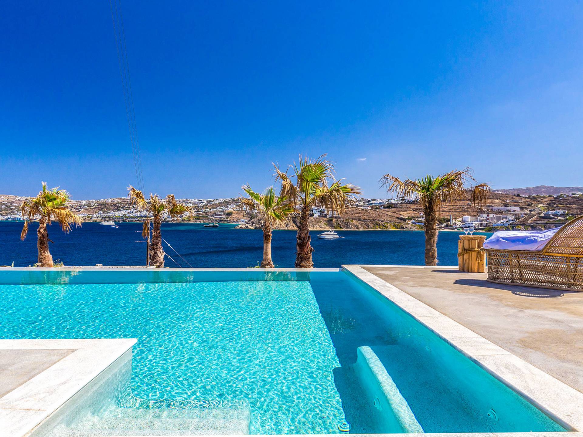 Chaque villa dispose d'une grande et élégante piscine à débordement de 30 m², construite avec des galets africains de haute qualité. Ces derniers sont entourés d'une spacieuse terrasse ensoleillée qui comprend un grand salon extérieur et ombragé par une pergola équipé de canapés confortables avec des coussins, des transats, des chaises longues et une grande table à manger qui prédispose les clients à savourer un délicieux repas ou un cocktail tout en regardant le majestueux lever de soleil. , écoutant les sons de la mer et surplombant la Petite Venise de Mykonos.