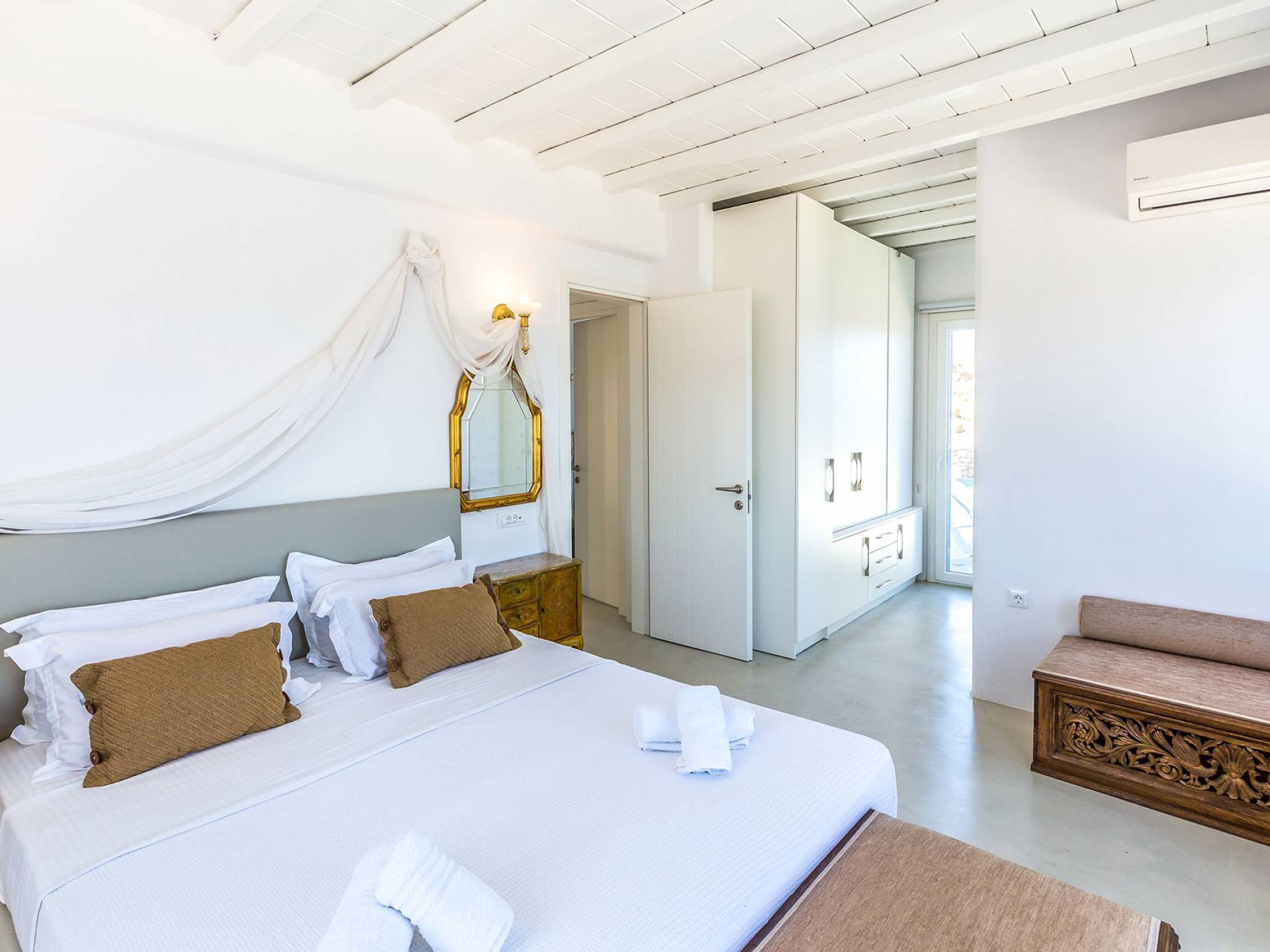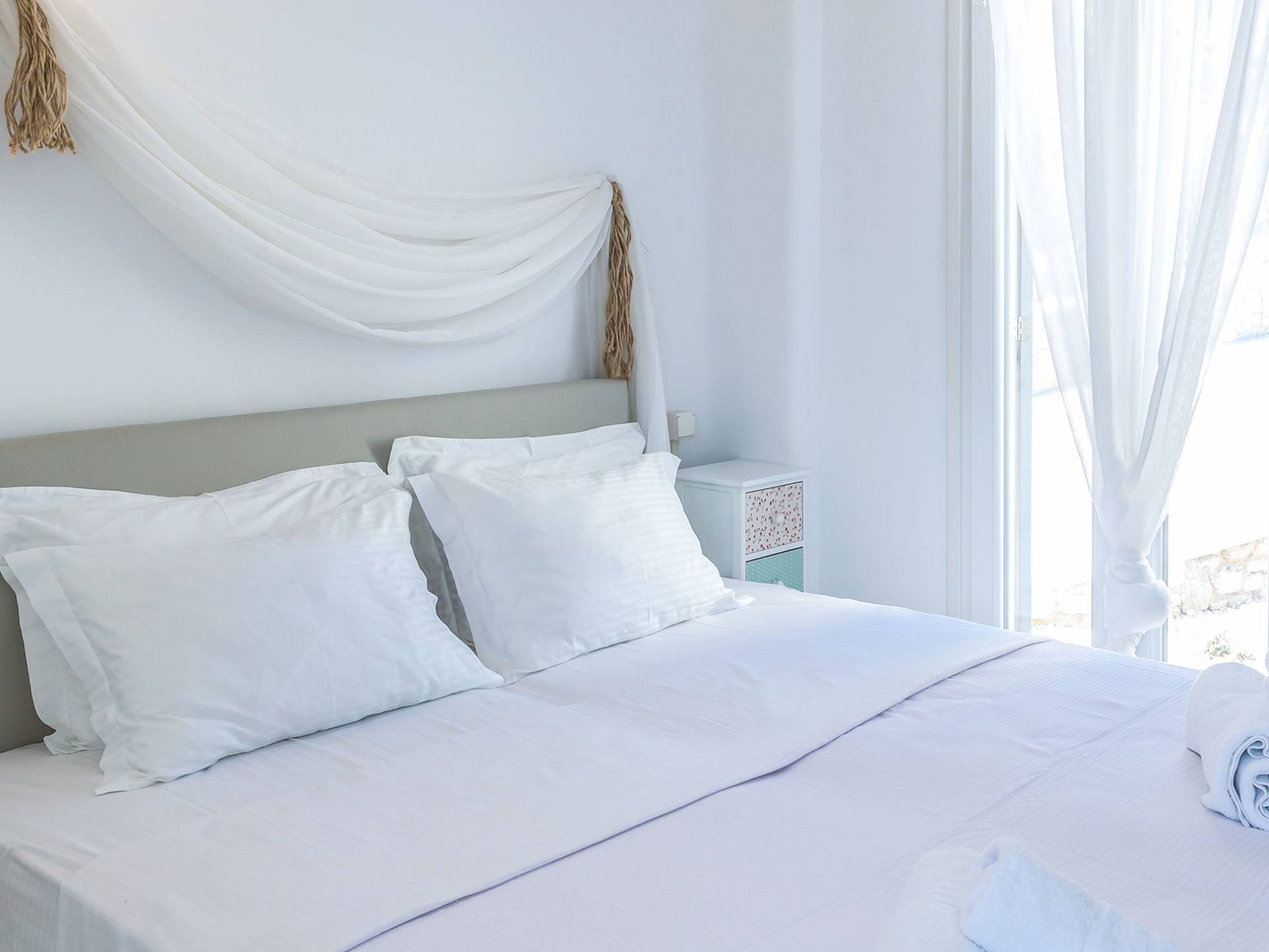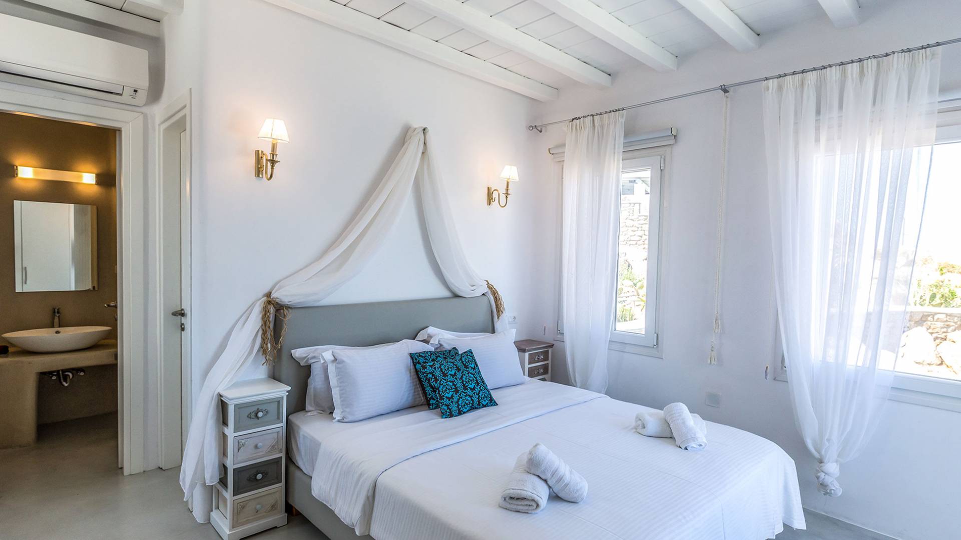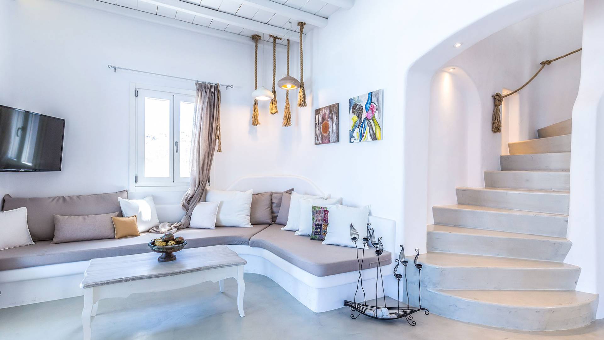 Chaque Villa est divisée en deux niveaux. Une propriété de 160 mètres carrés sur deux niveaux, tout en blanc, perchée sur une colline avec une vue panoramique à couper le souffle sur la mer Égée, offrant un grand espace de vie décloisonné à l'intérieur et à l'extérieur et offrant intimité et isolement dans un endroit très idyllique. Le rez-de-chaussée se compose d'un salon élégant et lumineux et d'une charmante salle à manger spacieuse, toutes deux ayant un accès direct à la piscine à débordement, une cuisine entièrement équipée, une spacieuse chambre king-size avec une salle de bain entièrement équipée et une grande véranda au espace piscine qui offre une vue magnifique sur la mer et la ville. Le niveau supérieur se compose d'une chambre principale king-size avec une salle de bains privative entièrement équipée, de deux (2) chambres queen-size et d'une autre salle de bains entièrement équipée, qui offrent toutes une vue magnifique sur la mer et la ville.
