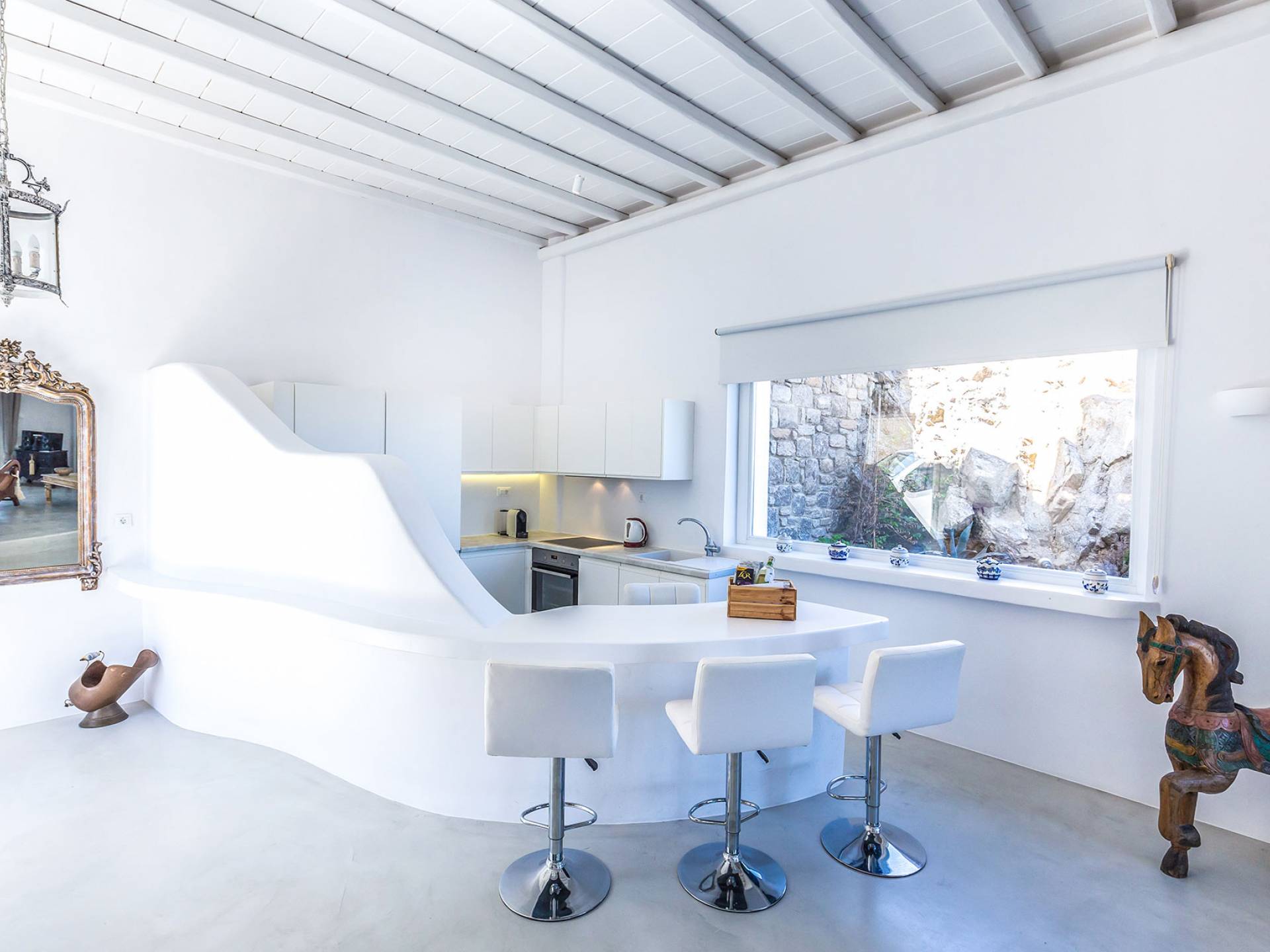 Les impressionnantes villas Carpe Diem sont situées sur une colline privilégiée surplombant la mer et la partie pittoresque de la "Petite Venise" de la ville de Mykonos. Un refuge à flanc de colline dans une zone isolée presque rurale bien que proche de la ville, où vous pourrez vous détendre après une longue journée sur les magnifiques plages de l'île ou une longue nuit dans la vie nocturne animée. Taillée sur une colline, à 50 m de la côte, dans un cadre extraordinaire encadré par une belle campagne, elle se fond de manière unique dans la topographie rocheuse de son coteau, cadre privilégié et préservé.