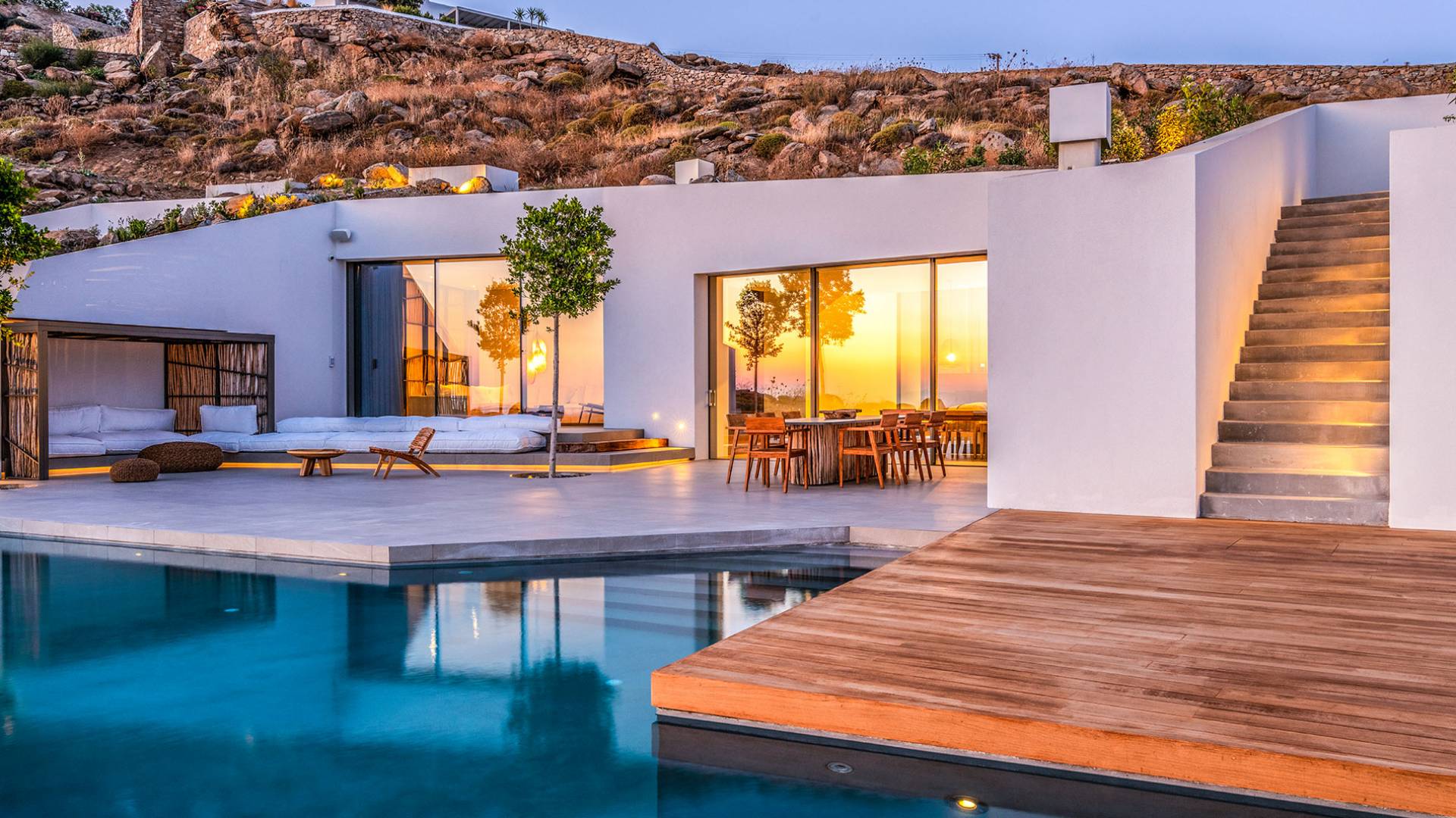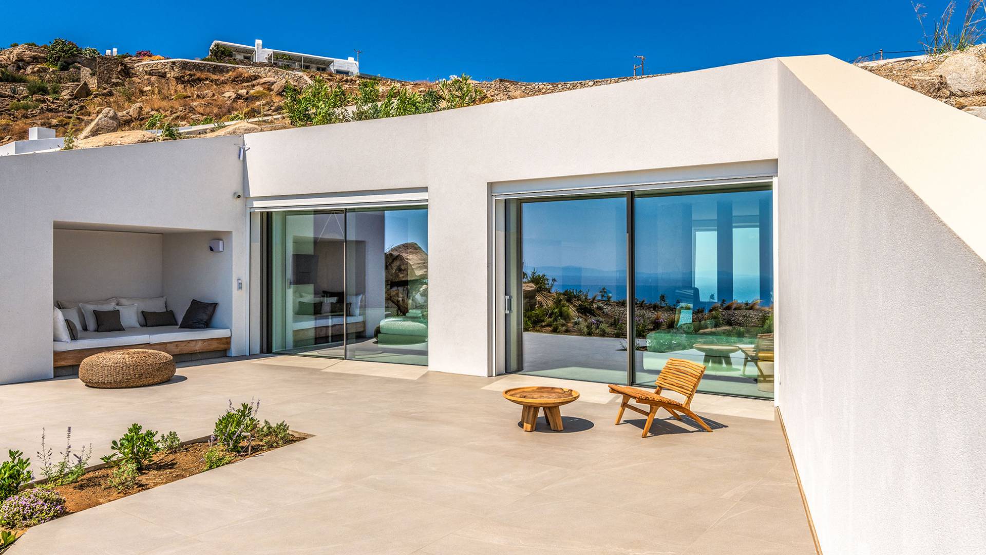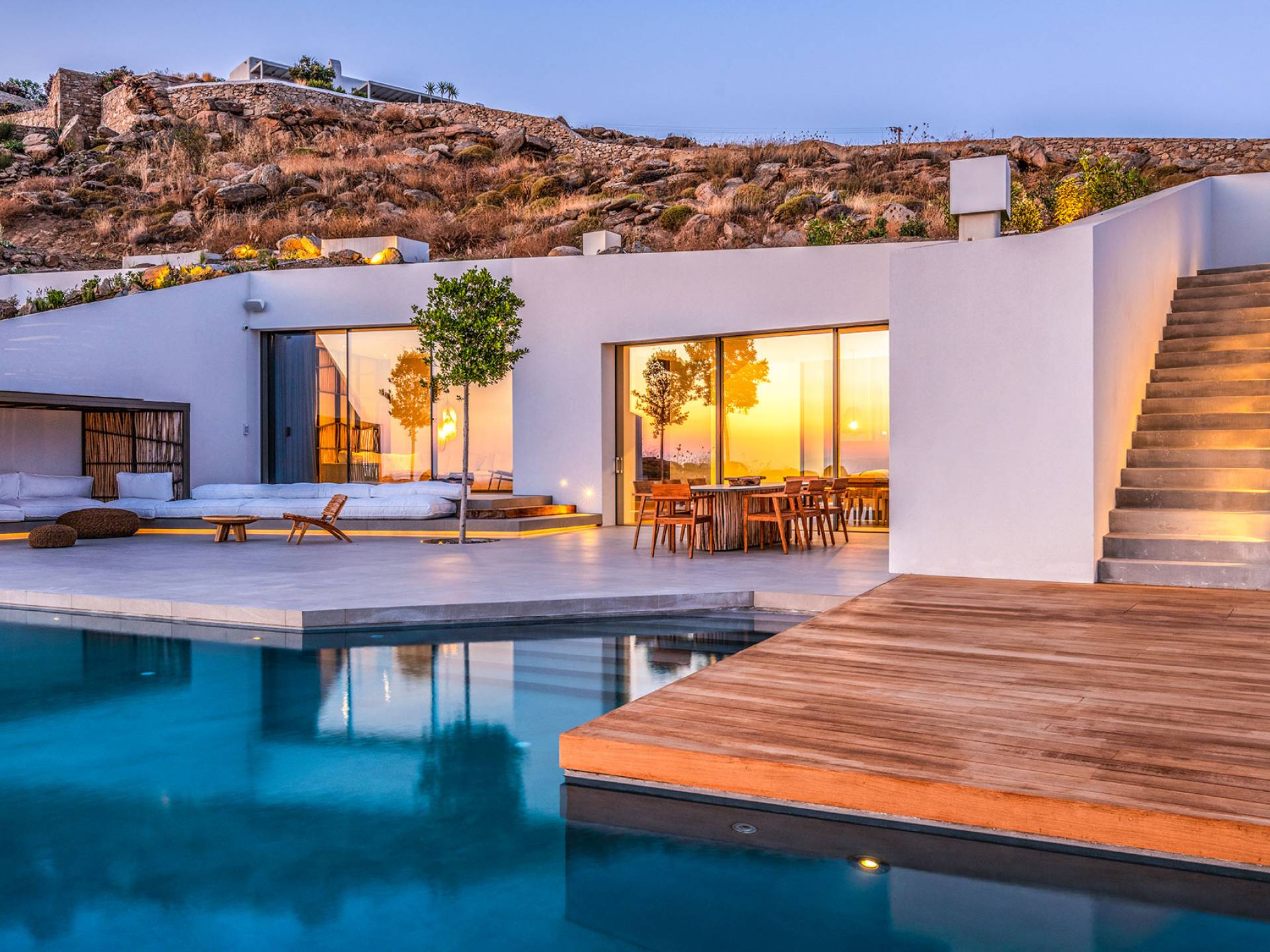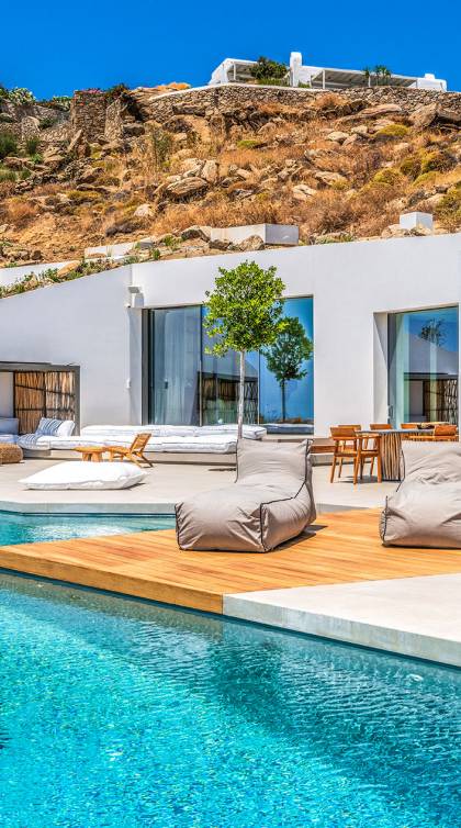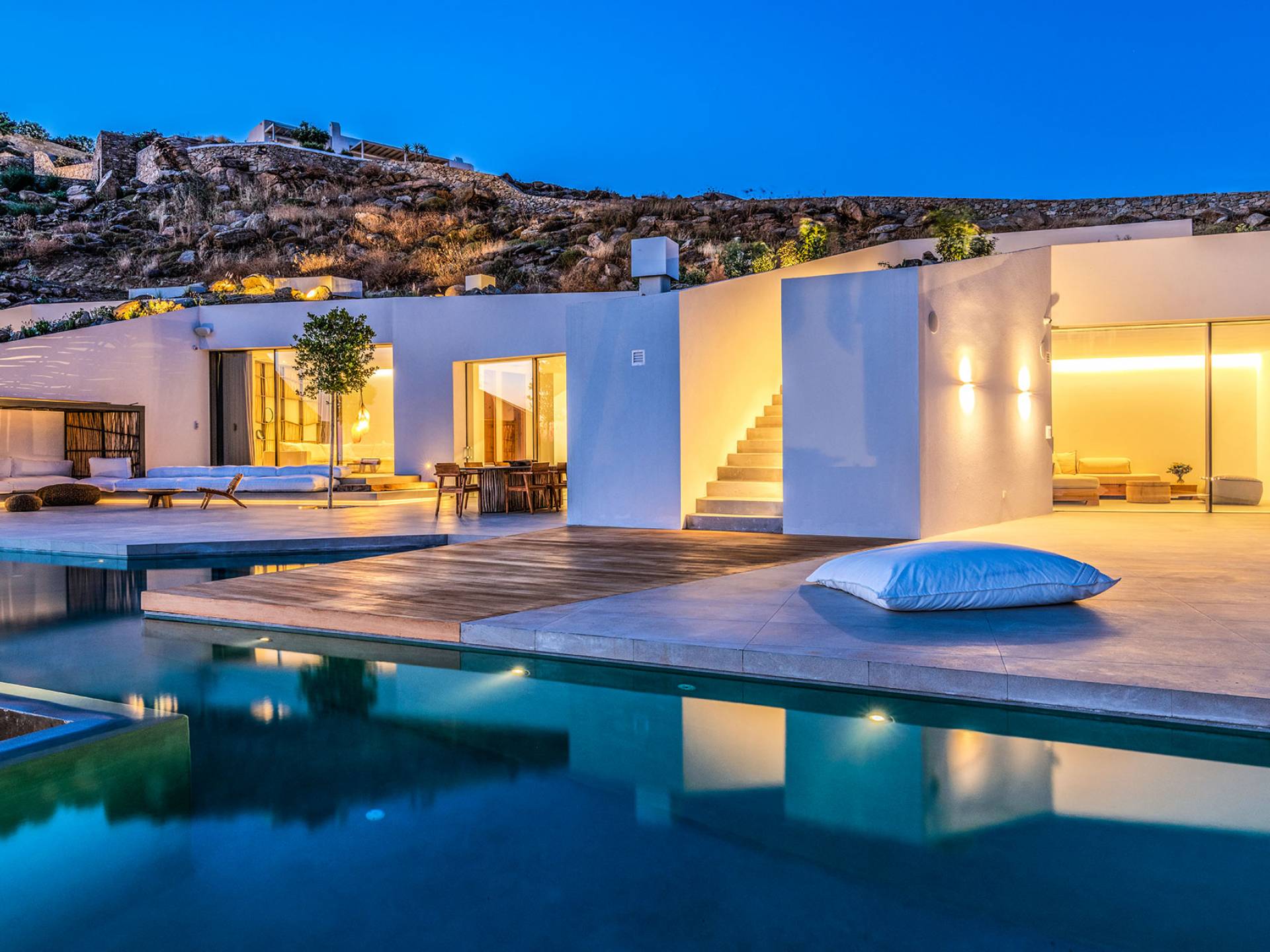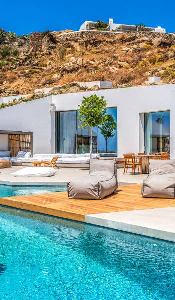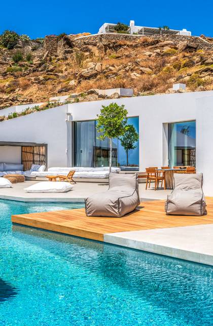 The Cove Villa Mykonos est une location de villa de luxe avec 6 chambres et une piscine privée. C'est une villa extraordinaire au concept architectural souterrain unique et à la décoration de style minimaliste avec des éléments en bois, dont la construction a été achevée en 2019. Elle peut accueillir confortablement jusqu'à 12 personnes et est située à proximité du centre de Mykonos (Chora) mais sur un terrain exceptionnellement privé et calme. emplacement à Tourlos, surplombant la baie d'Agios Stefanos. En raison de son design distinctif, chaque pièce de la propriété fait face à l'ouest de la mer Égée et bénéficie d'une vue imprenable sur le coucher de soleil sur la mer.