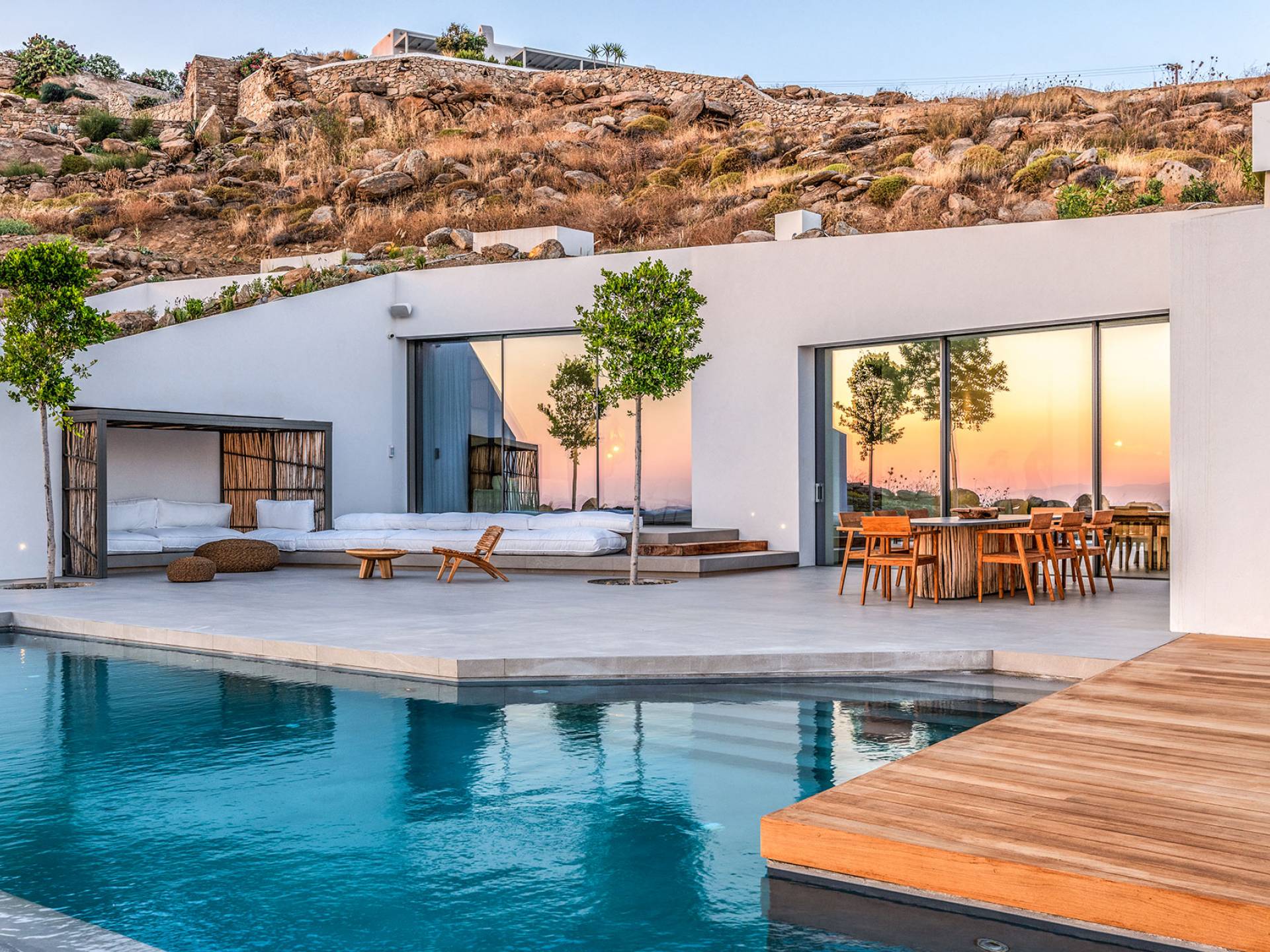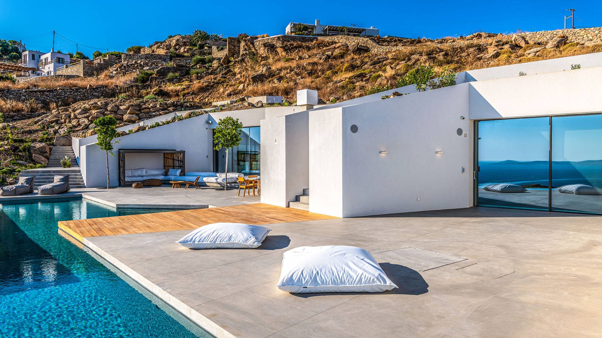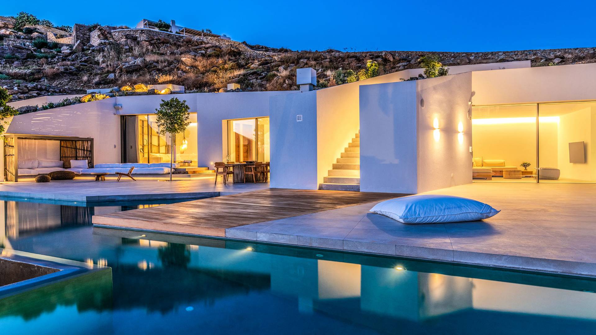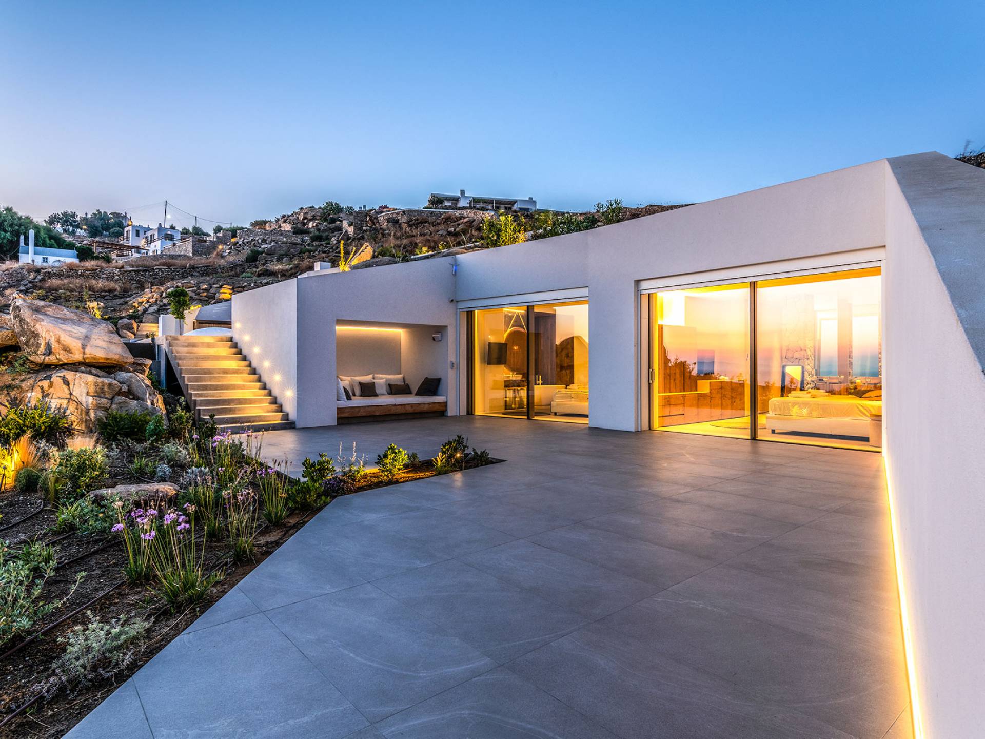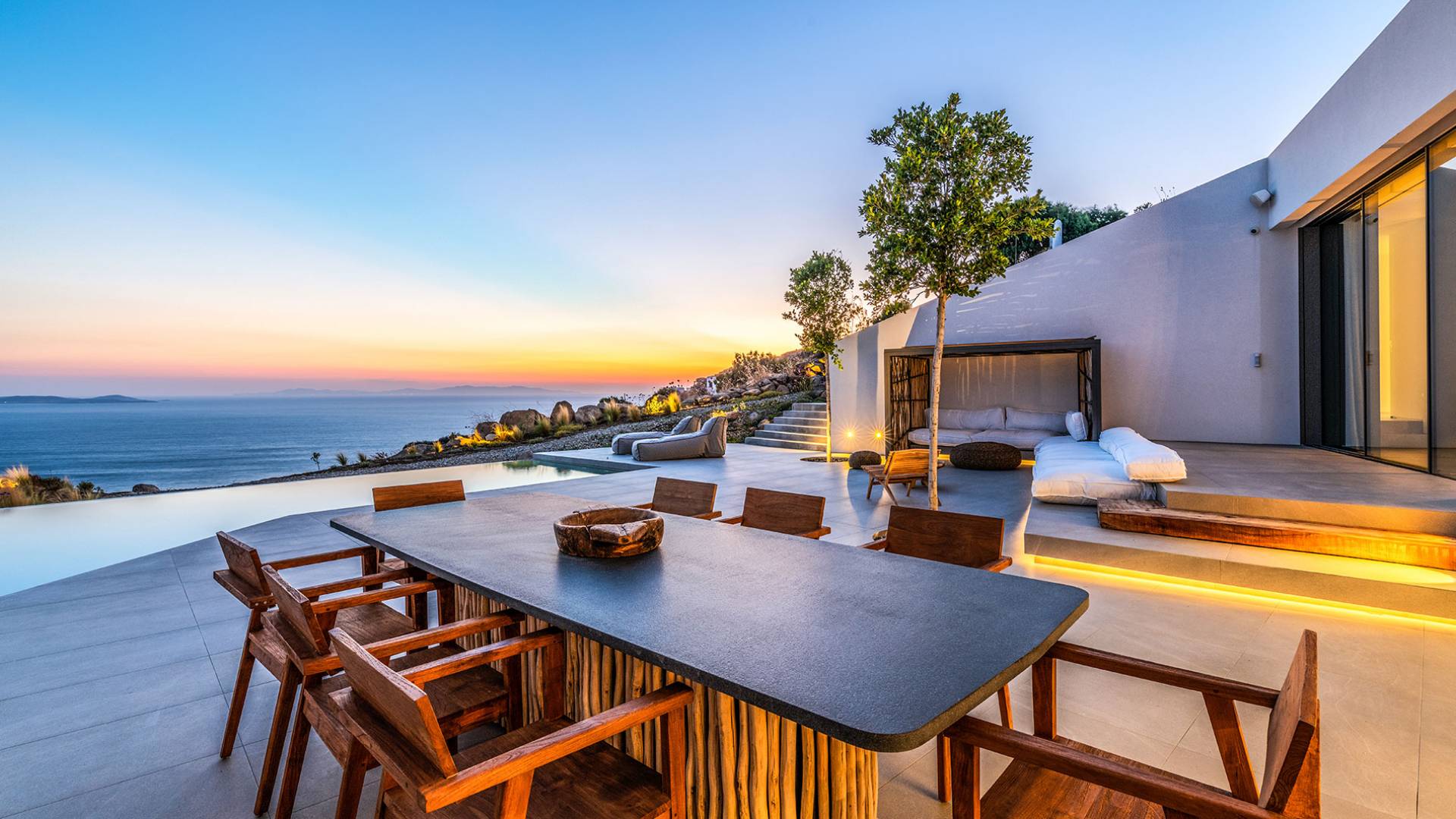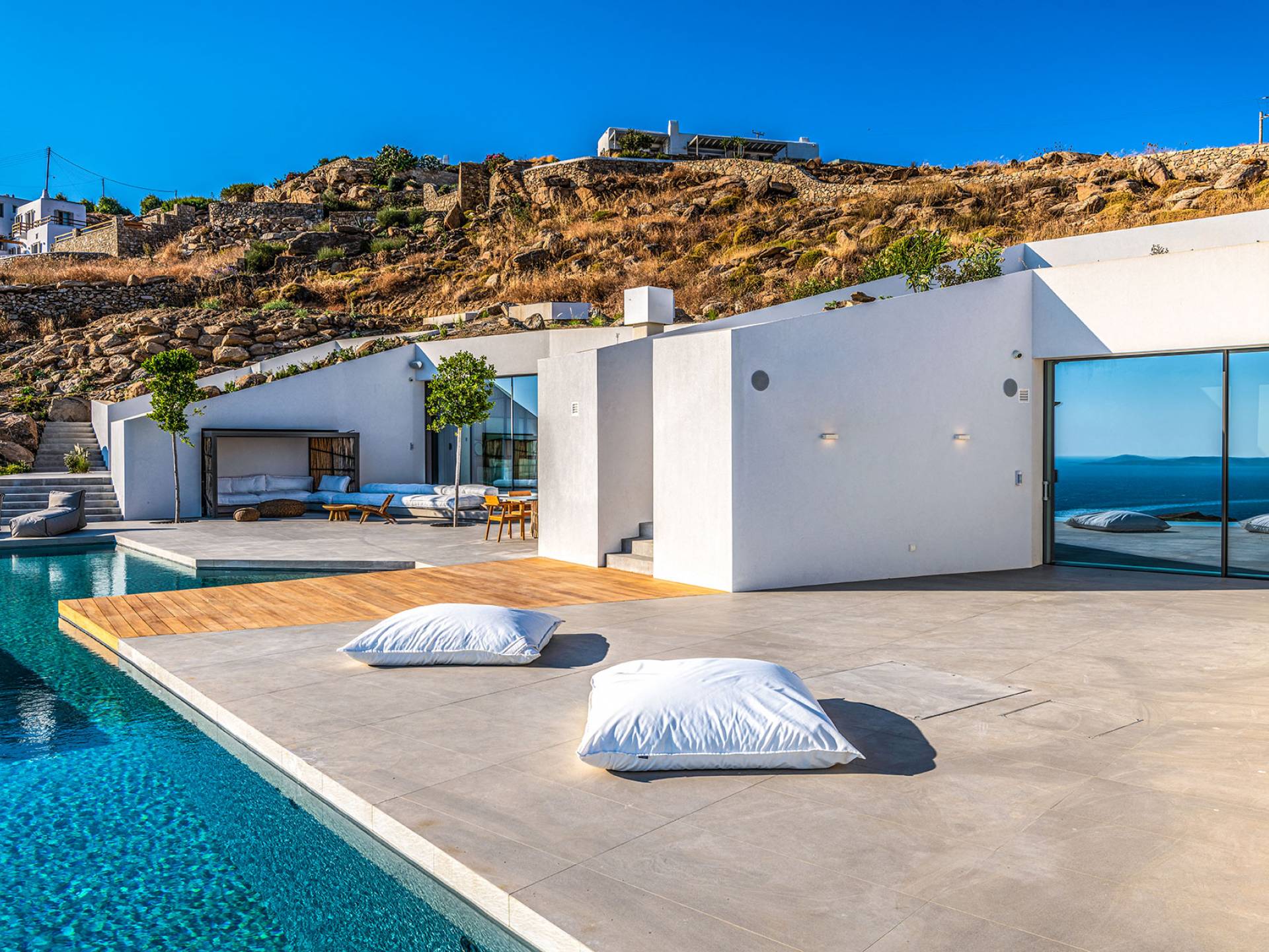The Cove Villa Mykonos est une location de villa de luxe avec 6 chambres et une piscine privée. C'est une villa extraordinaire au concept architectural souterrain unique et à la décoration de style minimaliste avec des éléments en bois, dont la construction a été achevée en 2019. Elle peut accueillir confortablement jusqu'à 12 personnes et est située à proximité du centre de Mykonos (Chora) mais sur un terrain exceptionnellement privé et calme. emplacement à Tourlos, surplombant la baie d'Agios Stefanos. En raison de son design distinctif, chaque pièce de la propriété fait face à l'ouest de la mer Égée et bénéficie d'une vue imprenable sur le coucher de soleil sur la mer.
