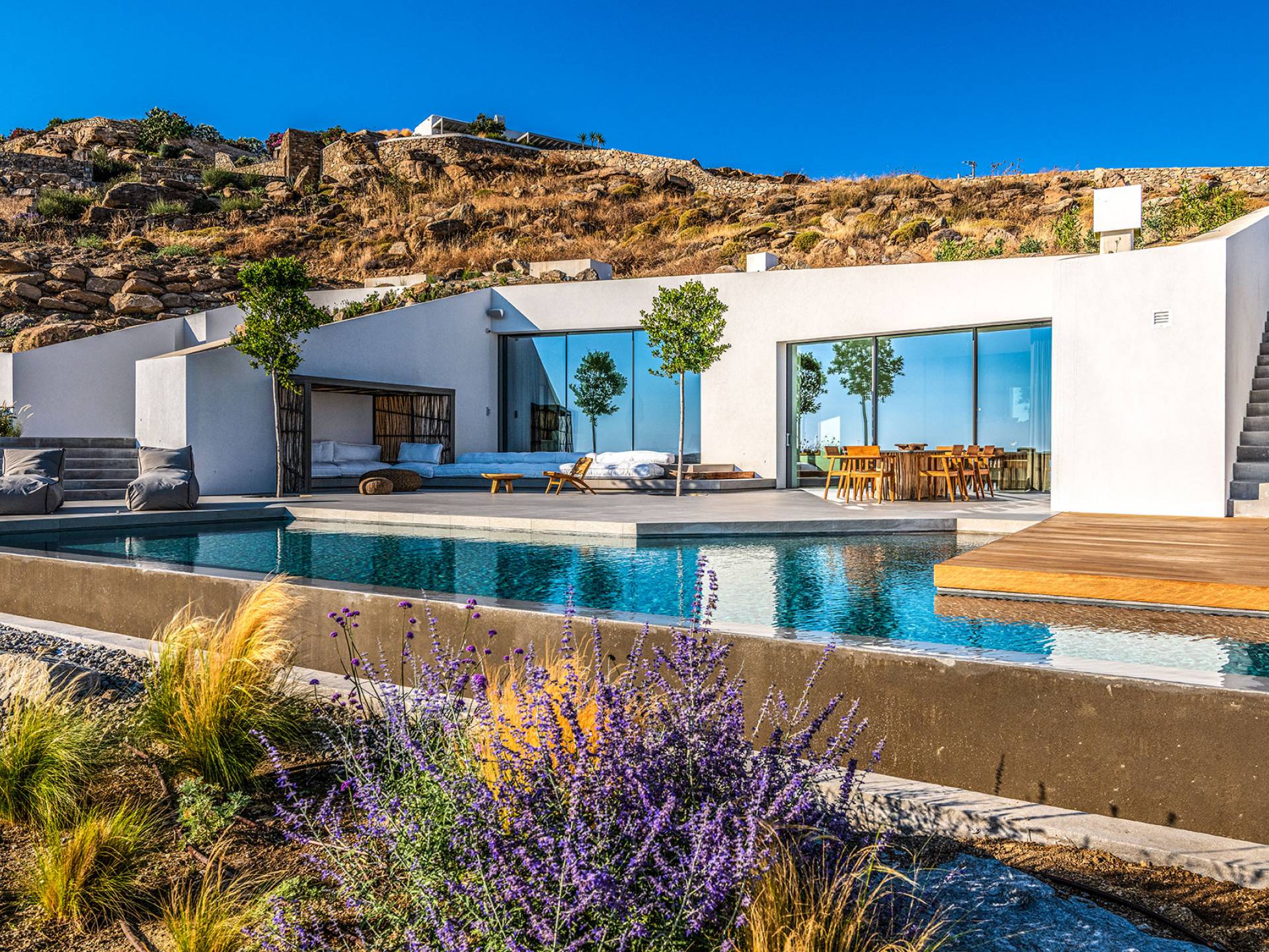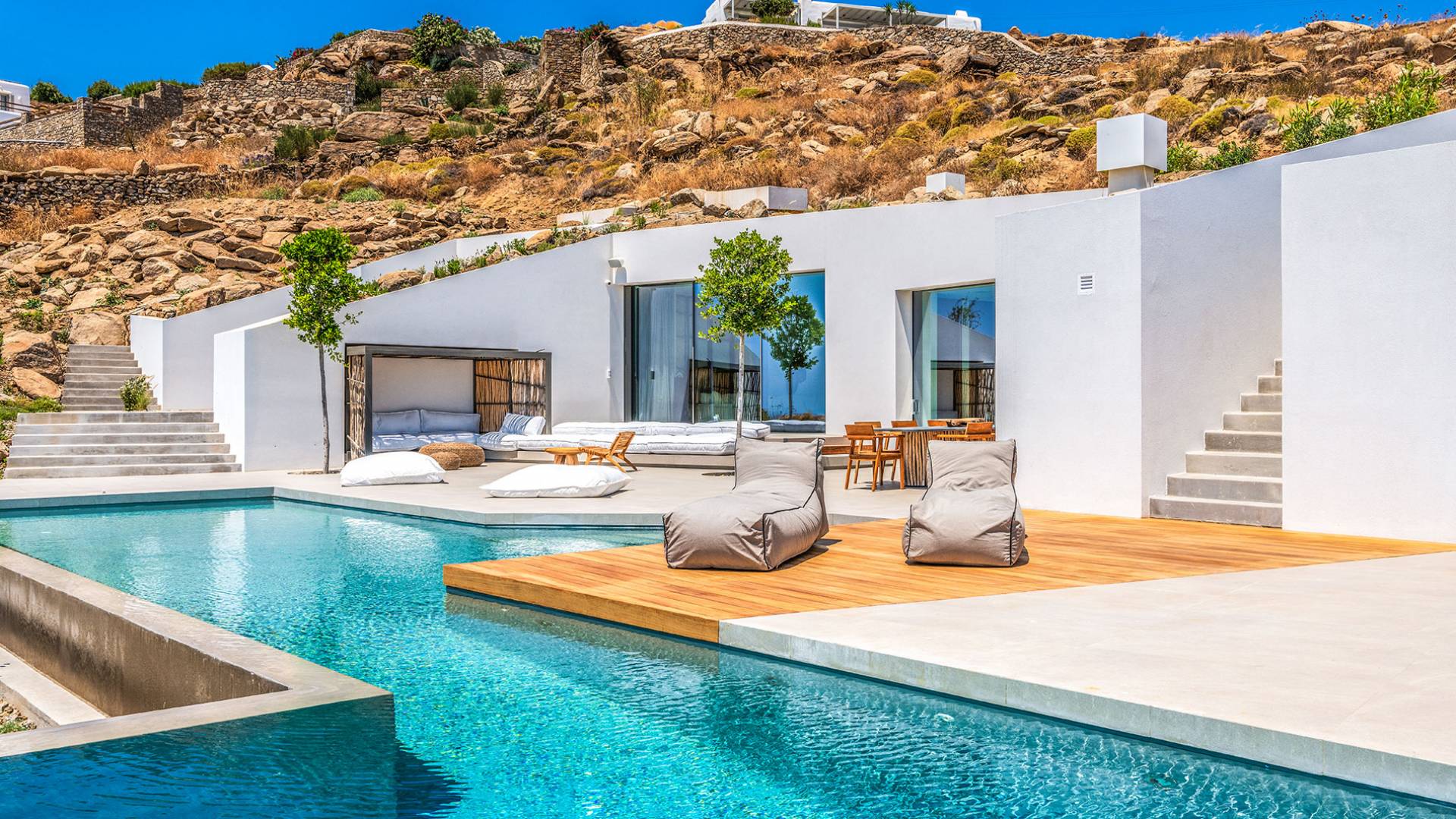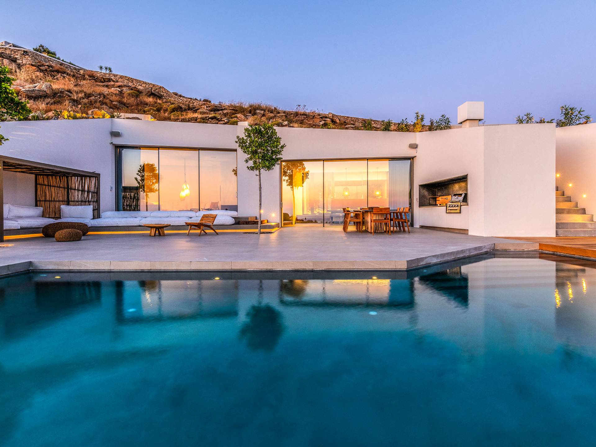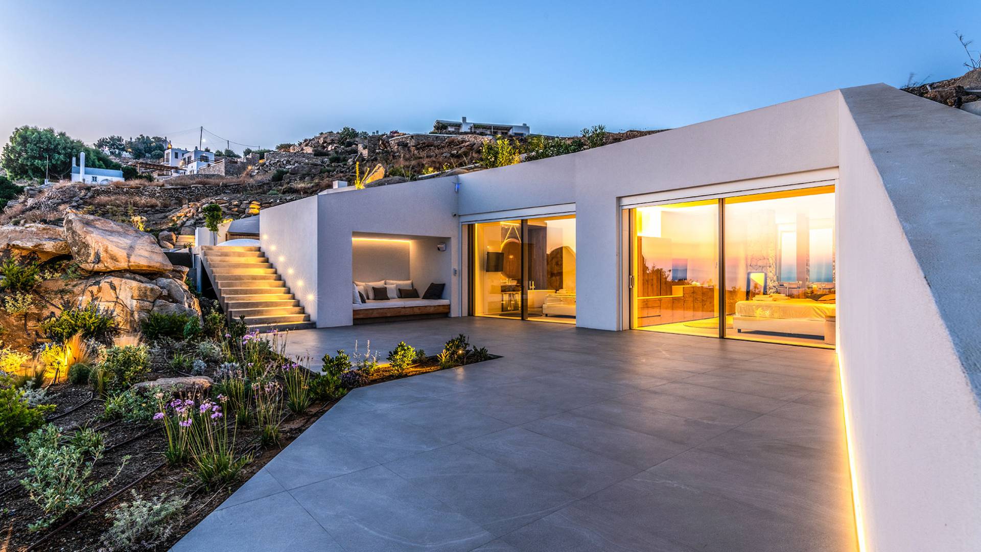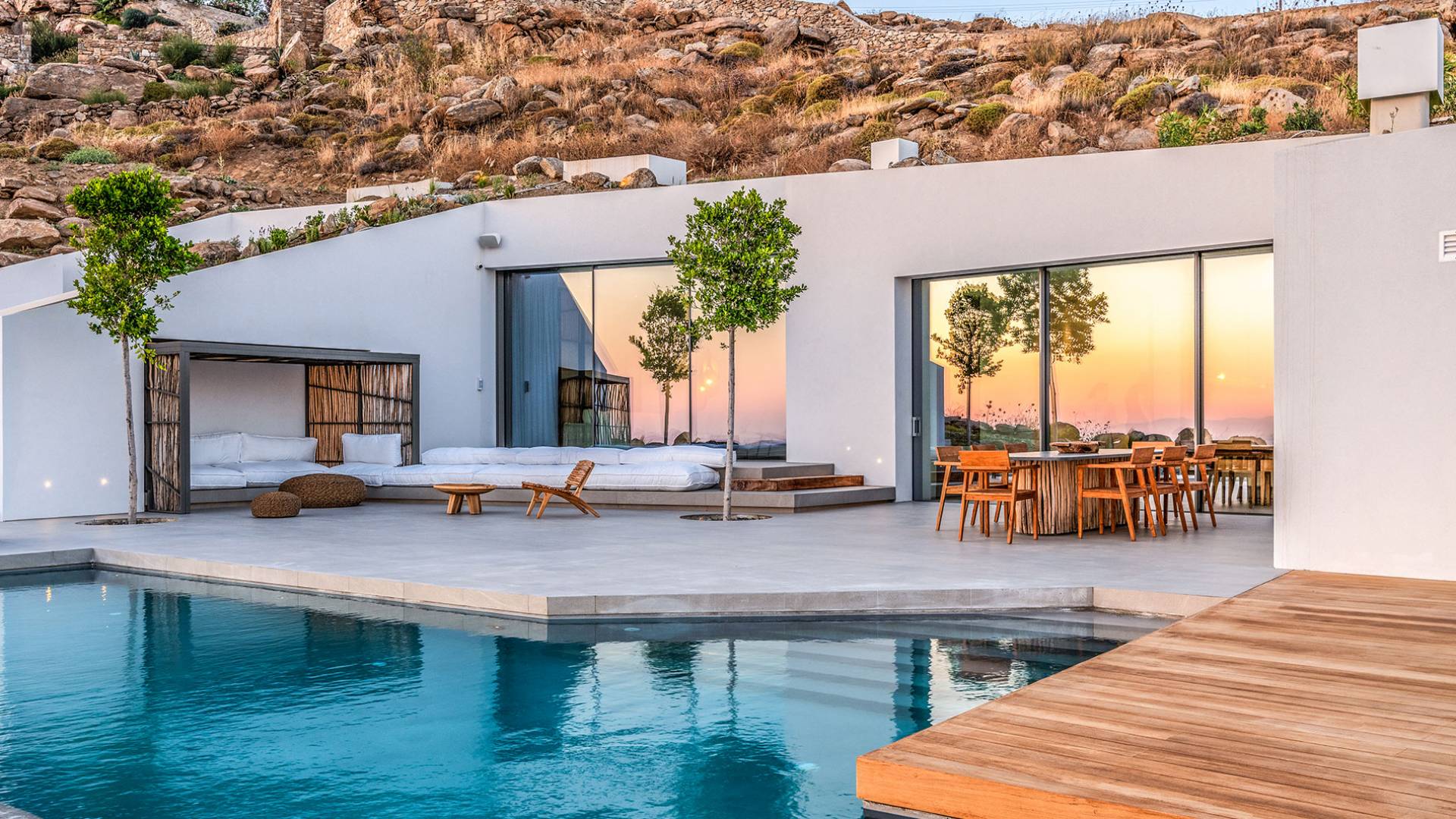 The Cove Villa Mykonos est une location de villa de luxe avec 6 chambres et une piscine privée. C'est une villa extraordinaire au concept architectural souterrain unique et à la décoration de style minimaliste avec des éléments en bois, dont la construction a été achevée en 2019. Elle peut accueillir confortablement jusqu'à 12 personnes et est située à proximité du centre de Mykonos (Chora) mais sur un terrain exceptionnellement privé et calme. emplacement à Tourlos, surplombant la baie d'Agios Stefanos. En raison de son design distinctif, chaque pièce de la propriété fait face à l'ouest de la mer Égée et bénéficie d'une vue imprenable sur le coucher de soleil sur la mer.