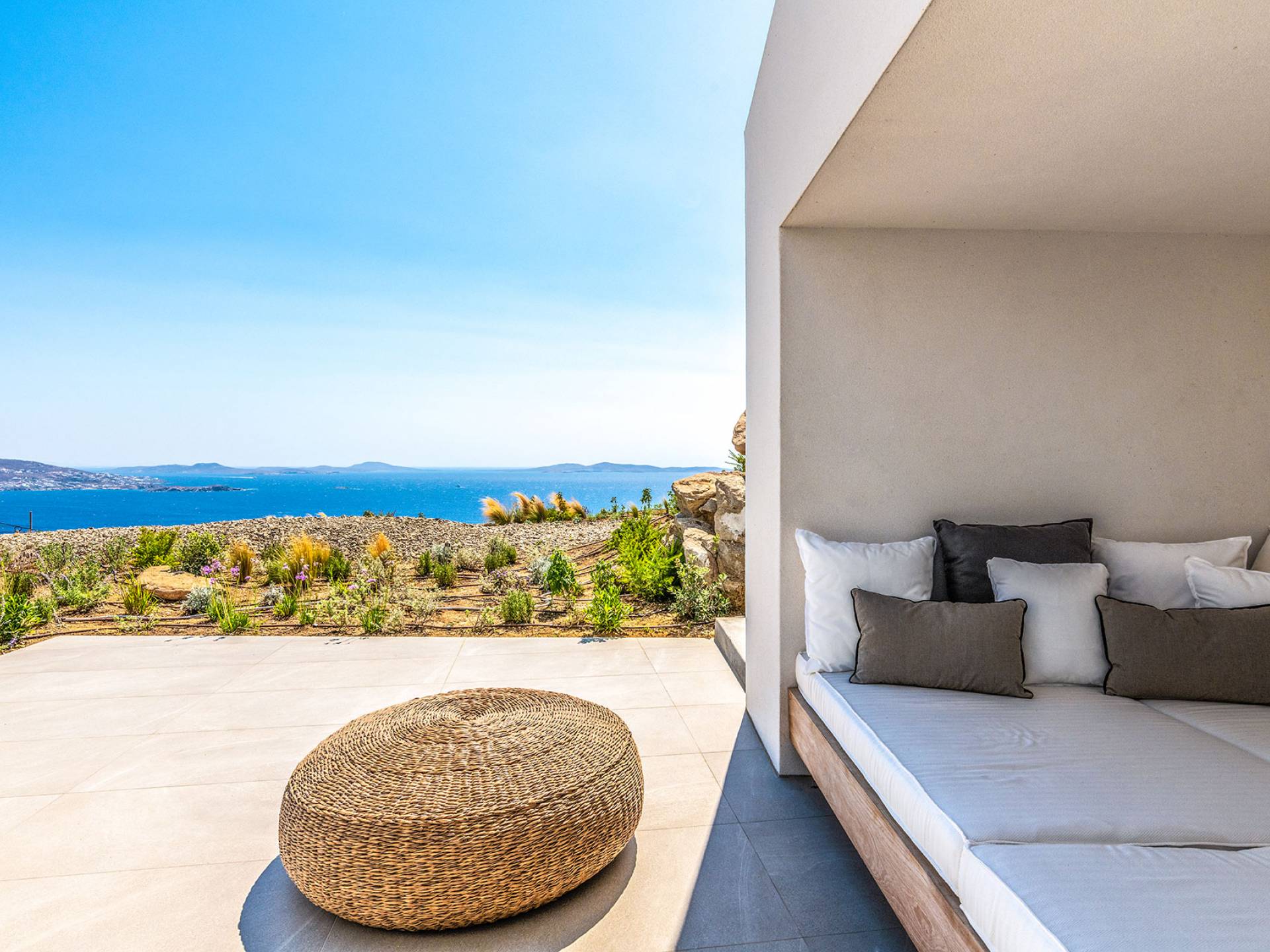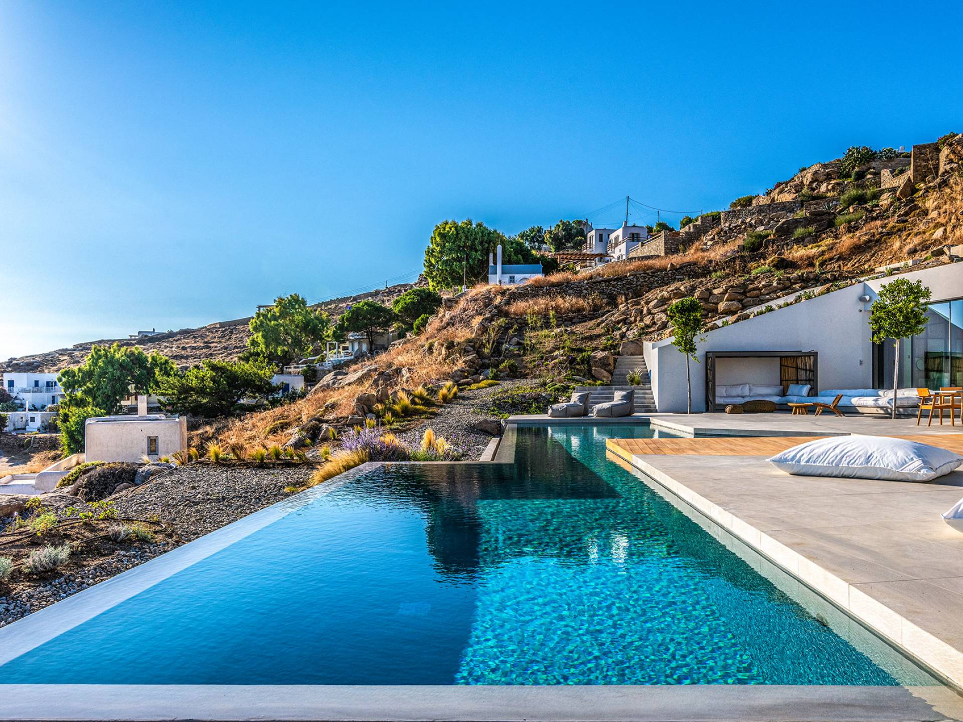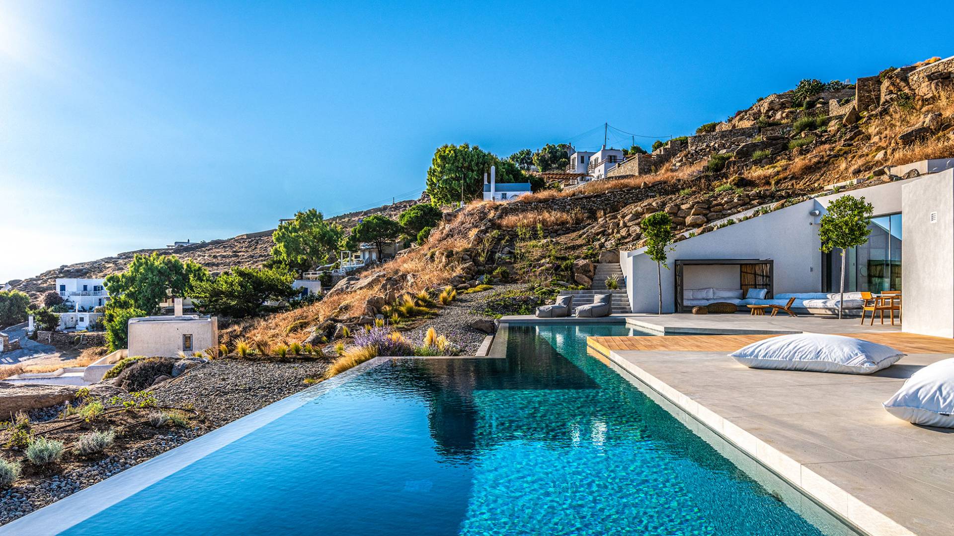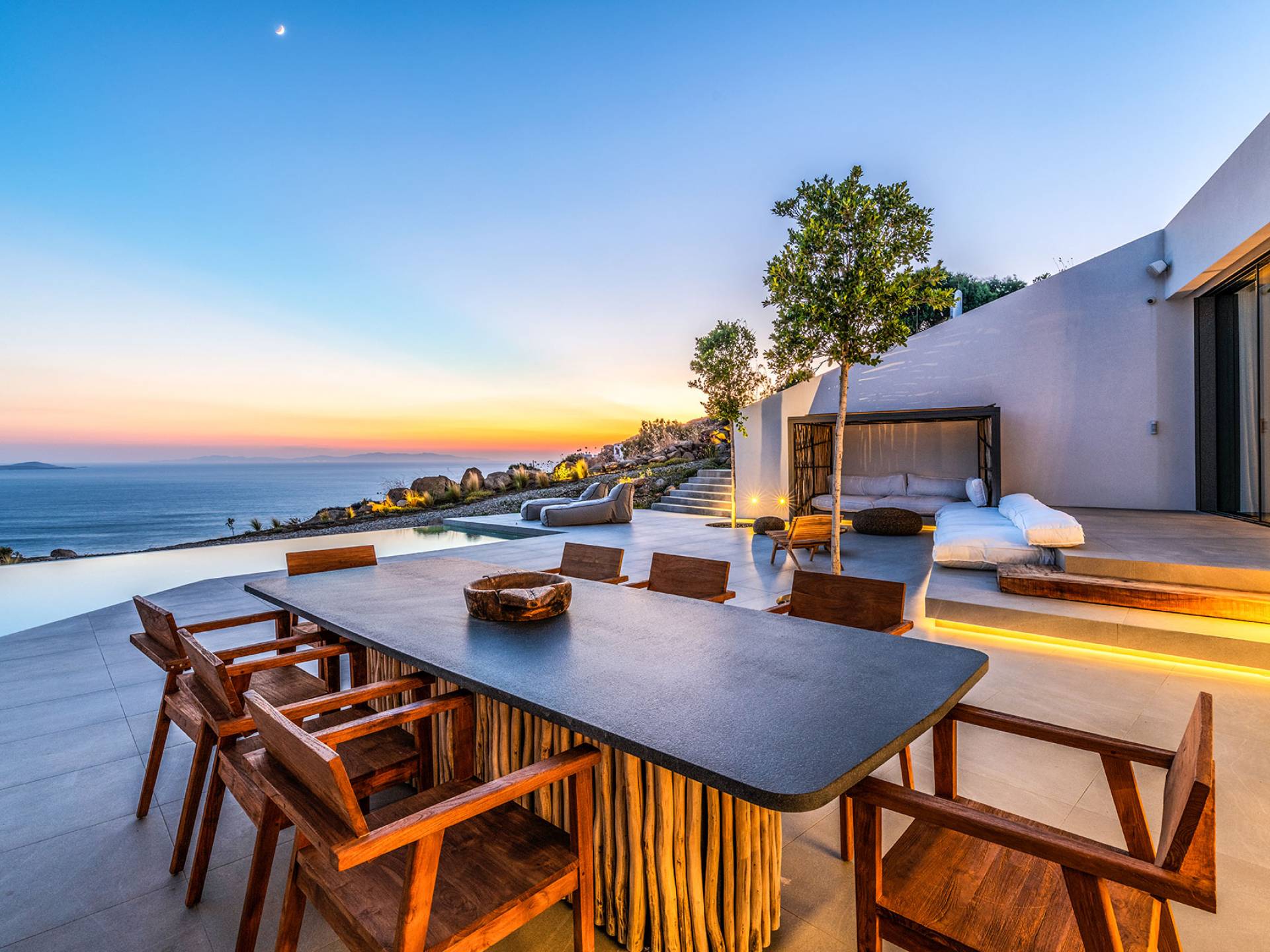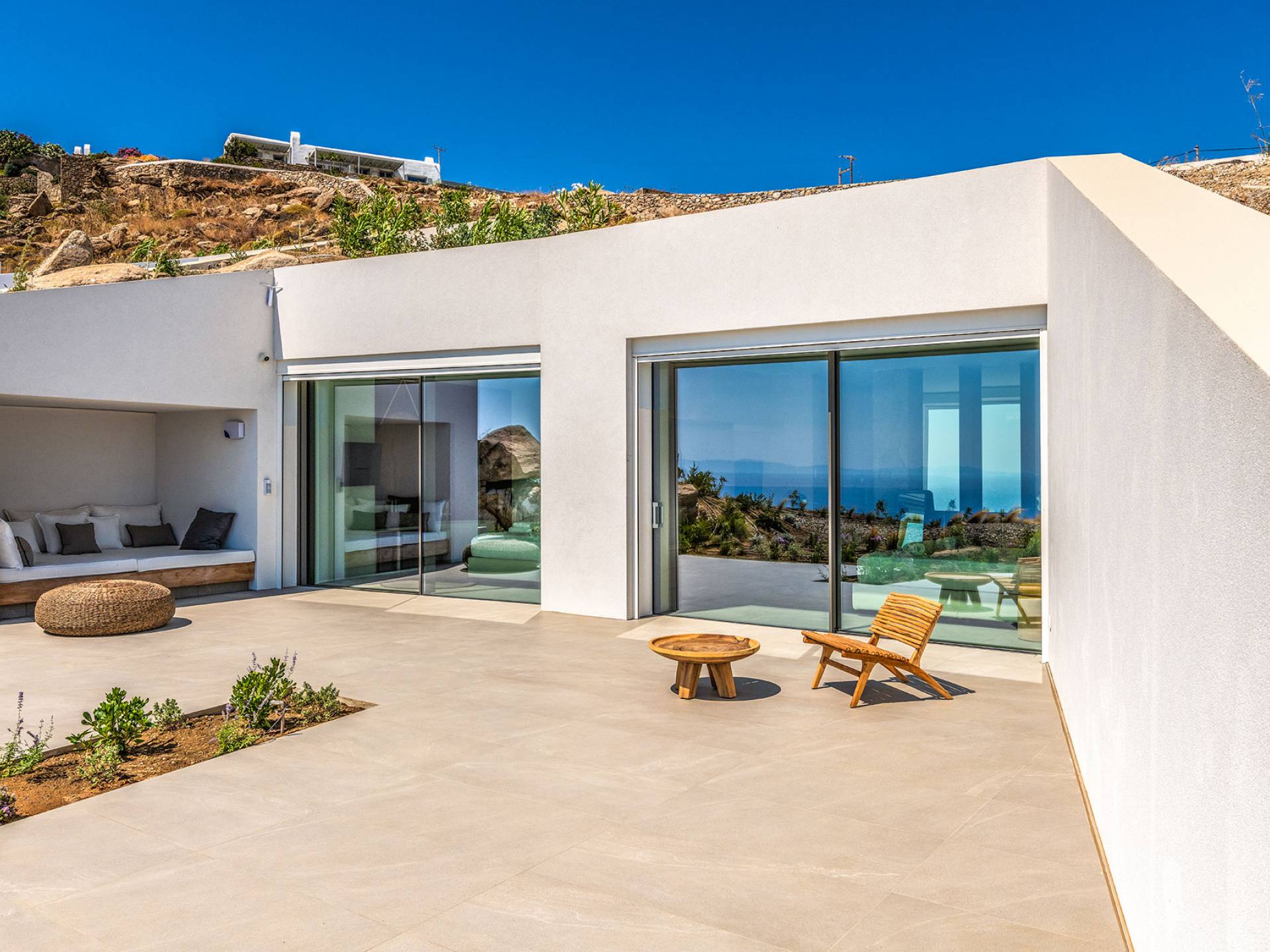 The Cove Villa Mykonos est une location de villa de luxe avec 6 chambres et une piscine privée. C'est une villa extraordinaire au concept architectural souterrain unique et à la décoration de style minimaliste avec des éléments en bois, dont la construction a été achevée en 2019. Elle peut accueillir confortablement jusqu'à 12 personnes et est située à proximité du centre de Mykonos (Chora) mais sur un terrain exceptionnellement privé et calme. emplacement à Tourlos, surplombant la baie d'Agios Stefanos. En raison de son design distinctif, chaque pièce de la propriété fait face à l'ouest de la mer Égée et bénéficie d'une vue imprenable sur le coucher de soleil sur la mer.