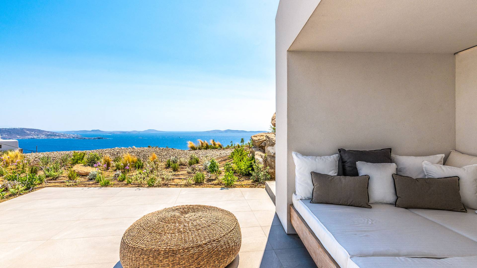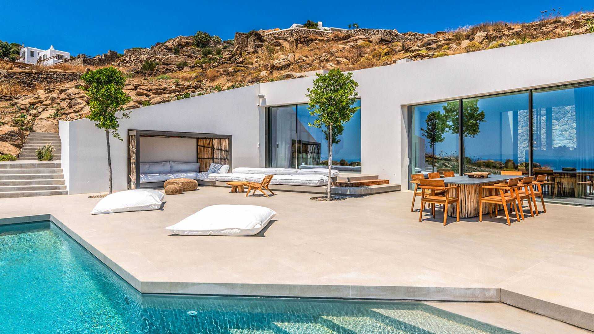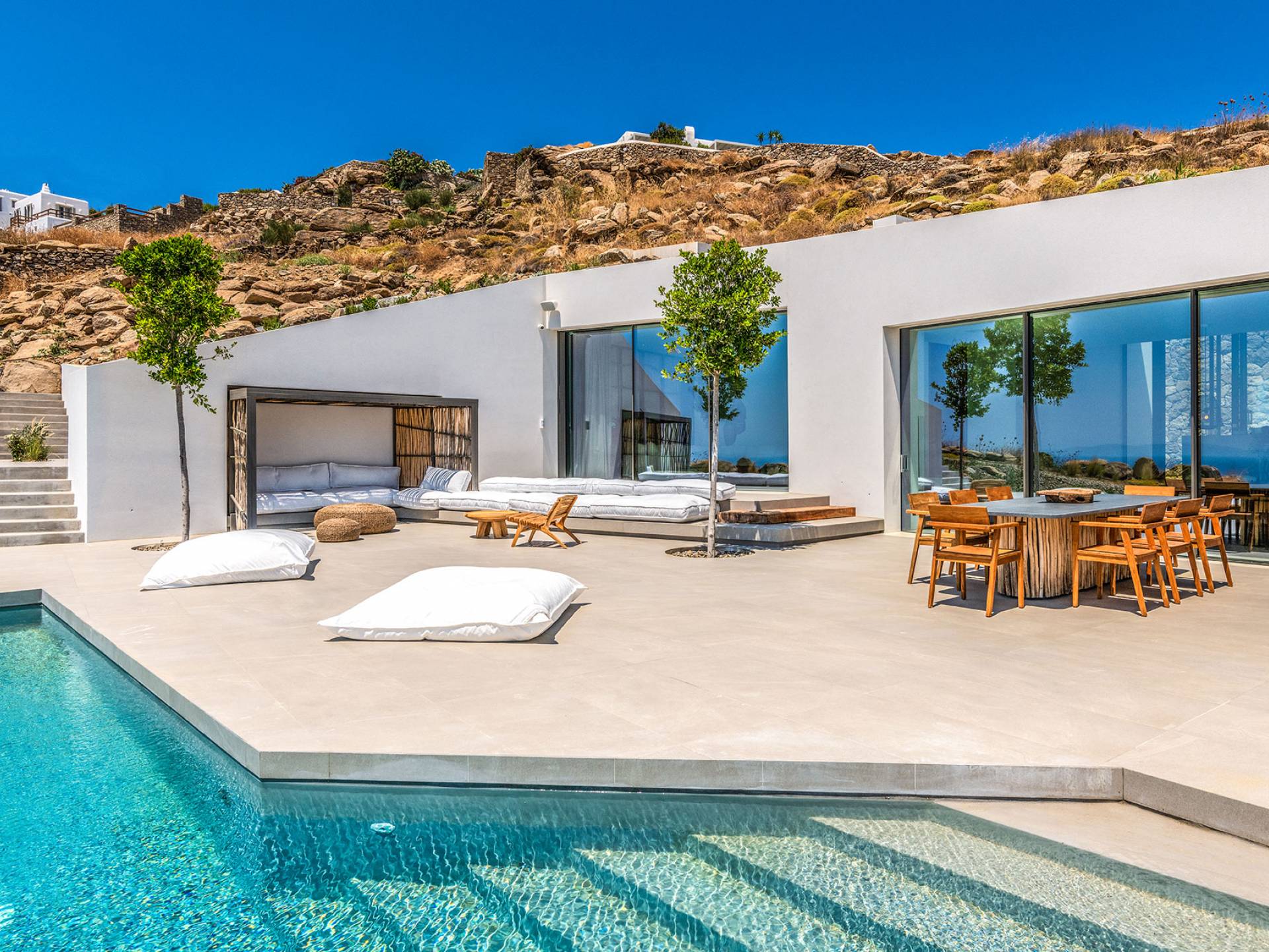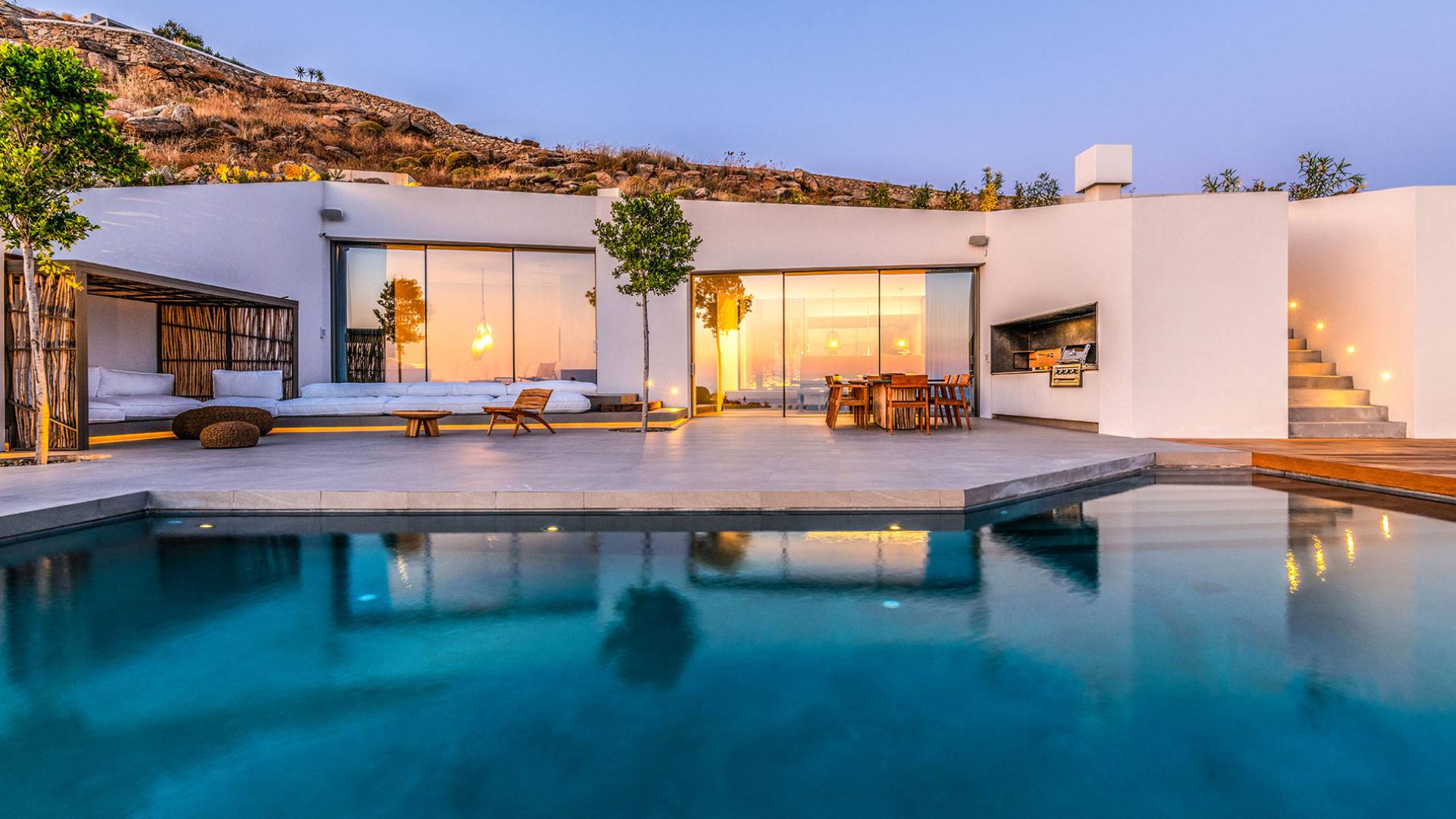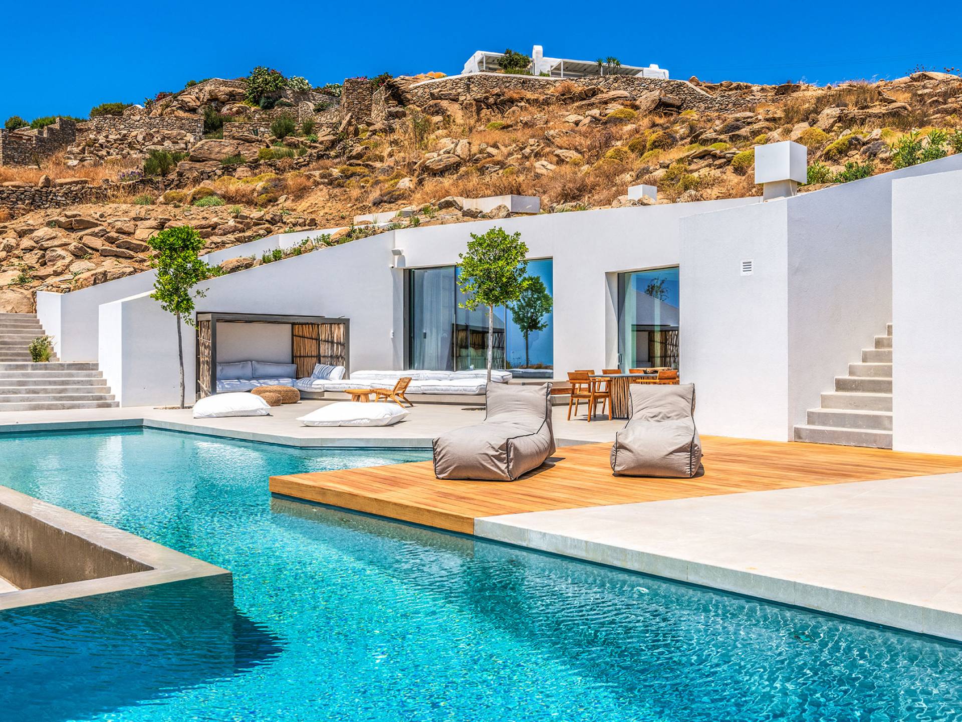 The Cove Villa Mykonos est une location de villa de luxe avec 6 chambres et une piscine privée. C'est une villa extraordinaire au concept architectural souterrain unique et à la décoration de style minimaliste avec des éléments en bois, dont la construction a été achevée en 2019. Elle peut accueillir confortablement jusqu'à 12 personnes et est située à proximité du centre de Mykonos (Chora) mais sur un terrain exceptionnellement privé et calme. emplacement à Tourlos, surplombant la baie d'Agios Stefanos. En raison de son design distinctif, chaque pièce de la propriété fait face à l'ouest de la mer Égée et bénéficie d'une vue imprenable sur le coucher de soleil sur la mer.