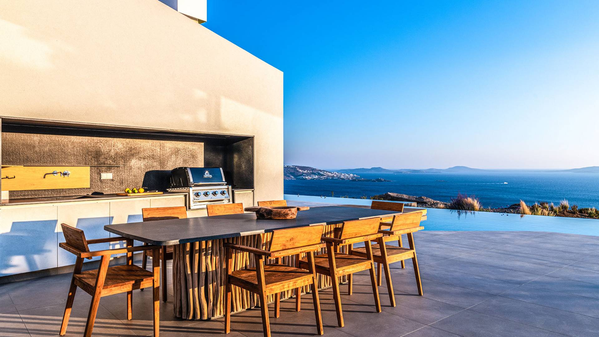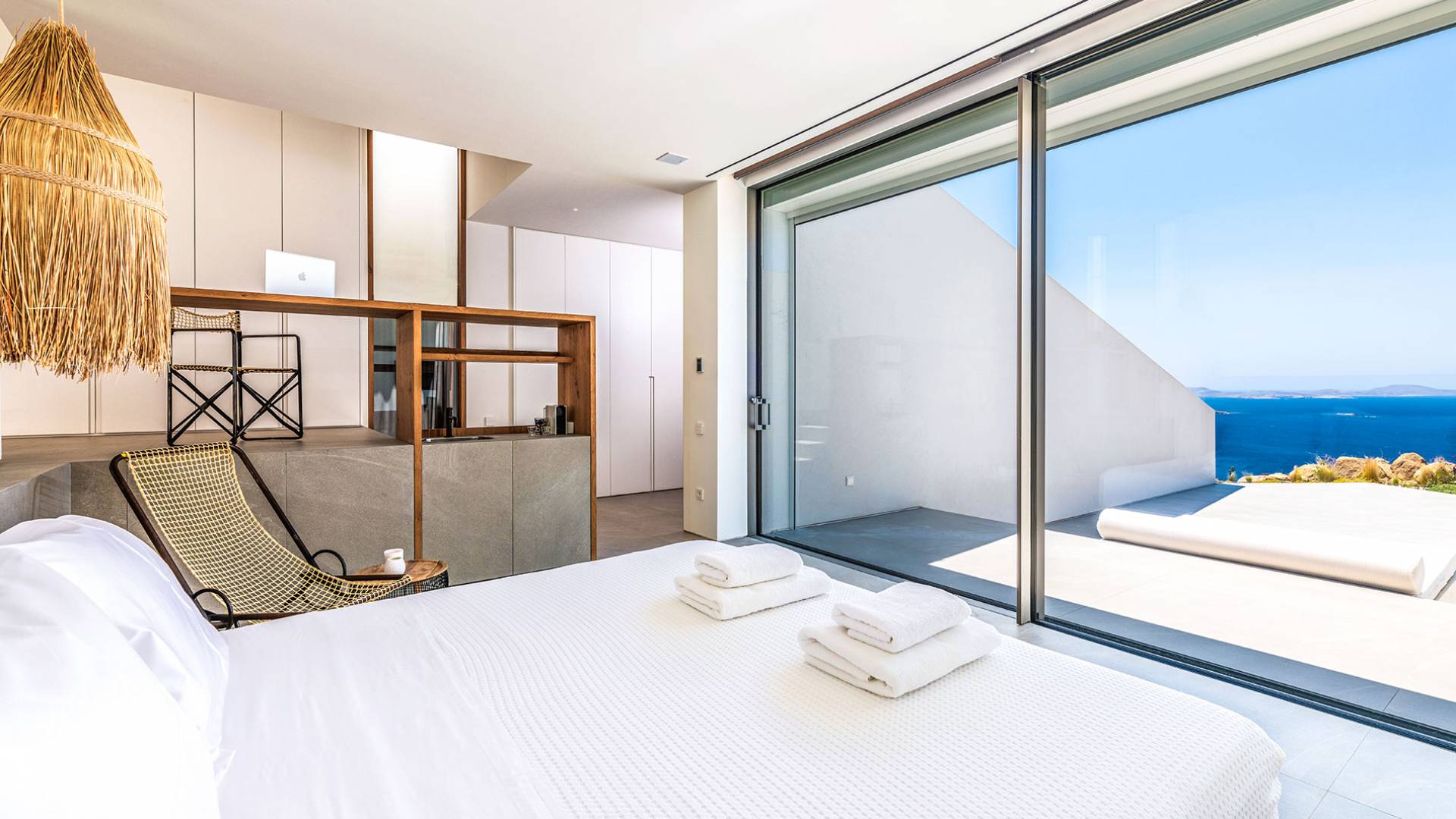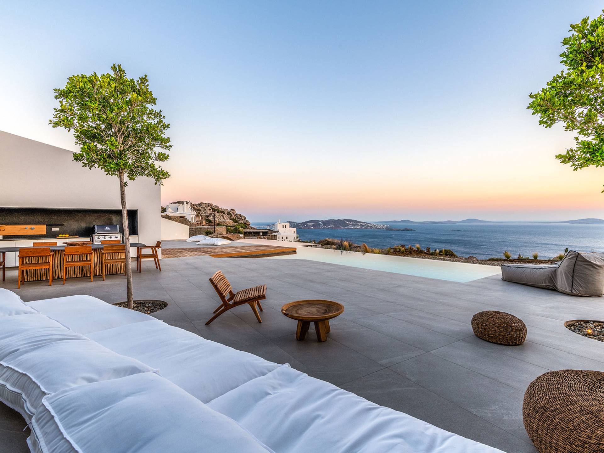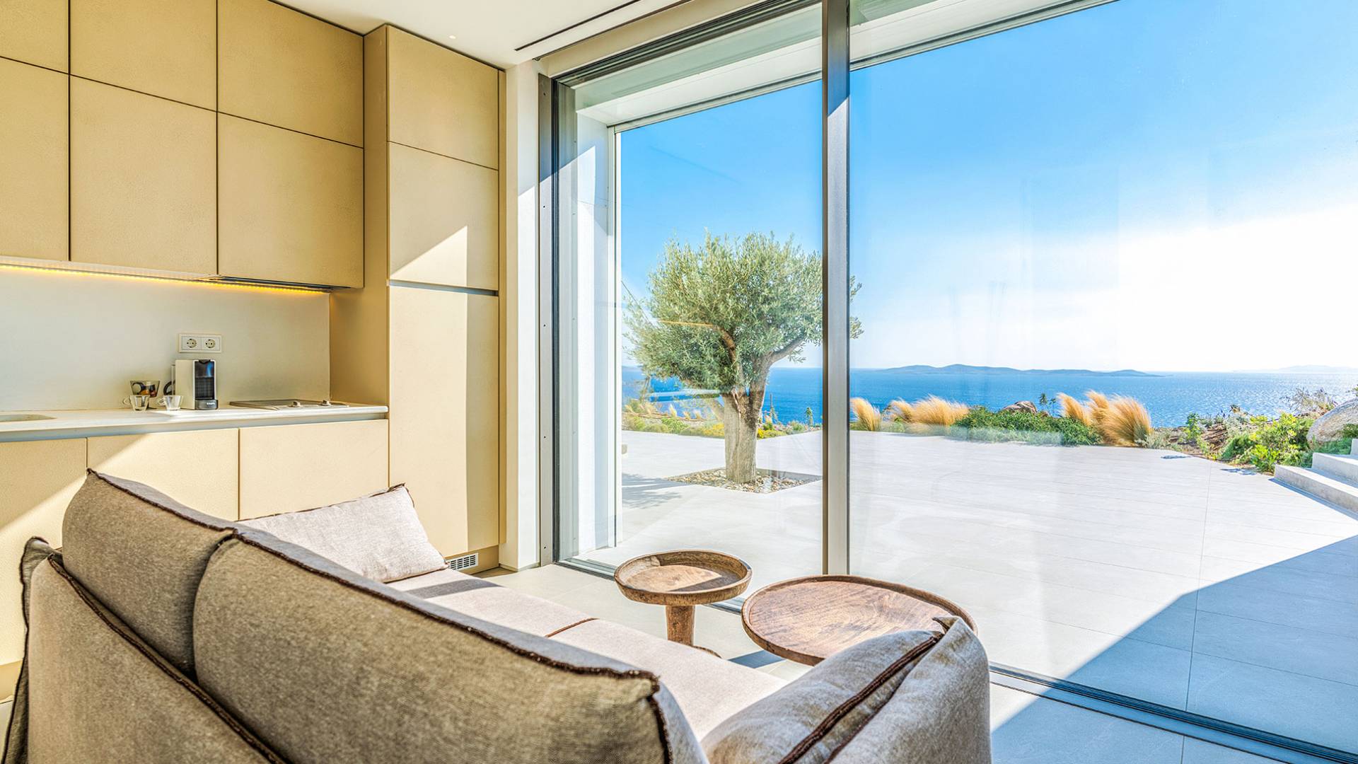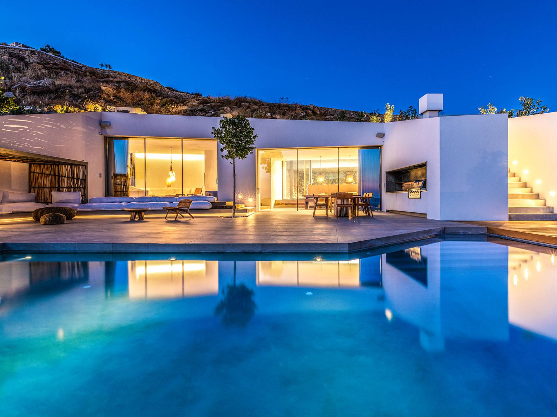 The Cove Villa Mykonos est une location de villa de luxe avec 6 chambres et une piscine privée. C'est une villa extraordinaire au concept architectural souterrain unique et à la décoration de style minimaliste avec des éléments en bois, dont la construction a été achevée en 2019. Elle peut accueillir confortablement jusqu'à 12 personnes et est située à proximité du centre de Mykonos (Chora) mais sur un terrain exceptionnellement privé et calme. emplacement à Tourlos, surplombant la baie d'Agios Stefanos. En raison de son design distinctif, chaque pièce de la propriété fait face à l'ouest de la mer Égée et bénéficie d'une vue imprenable sur le coucher de soleil sur la mer.
