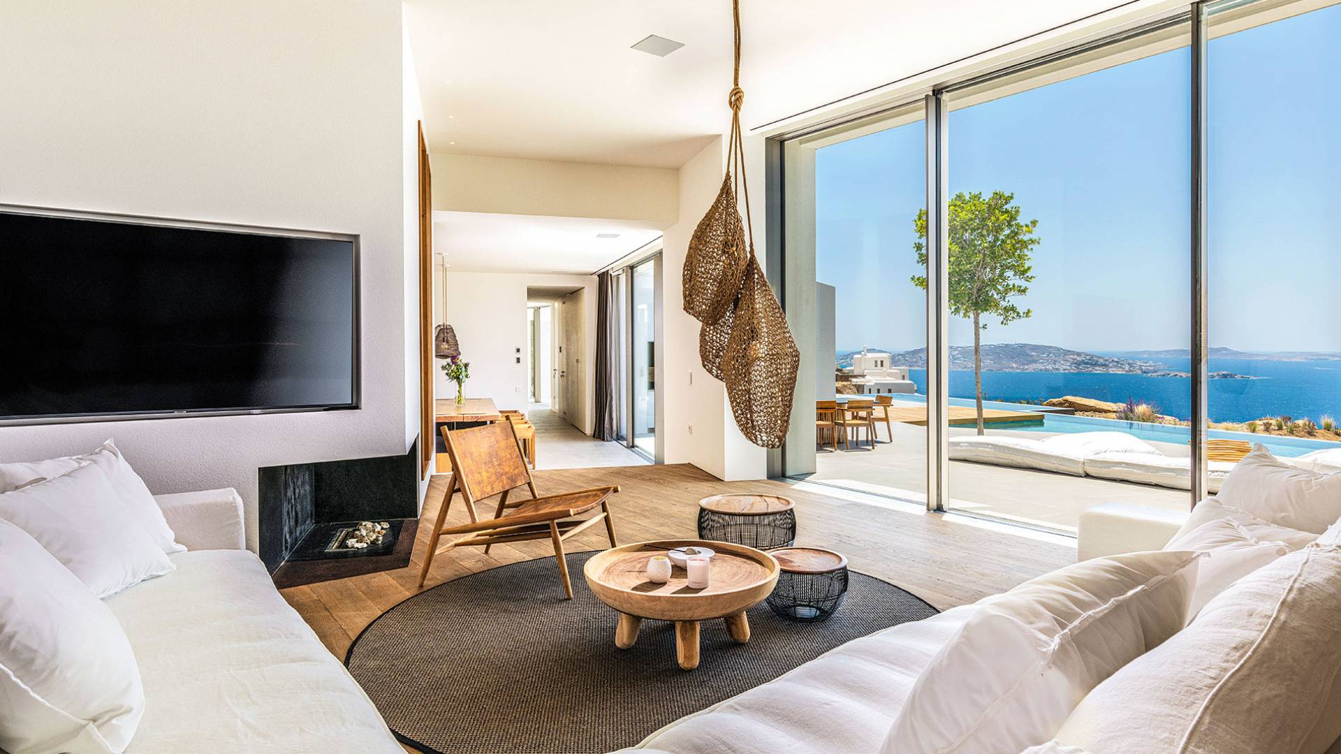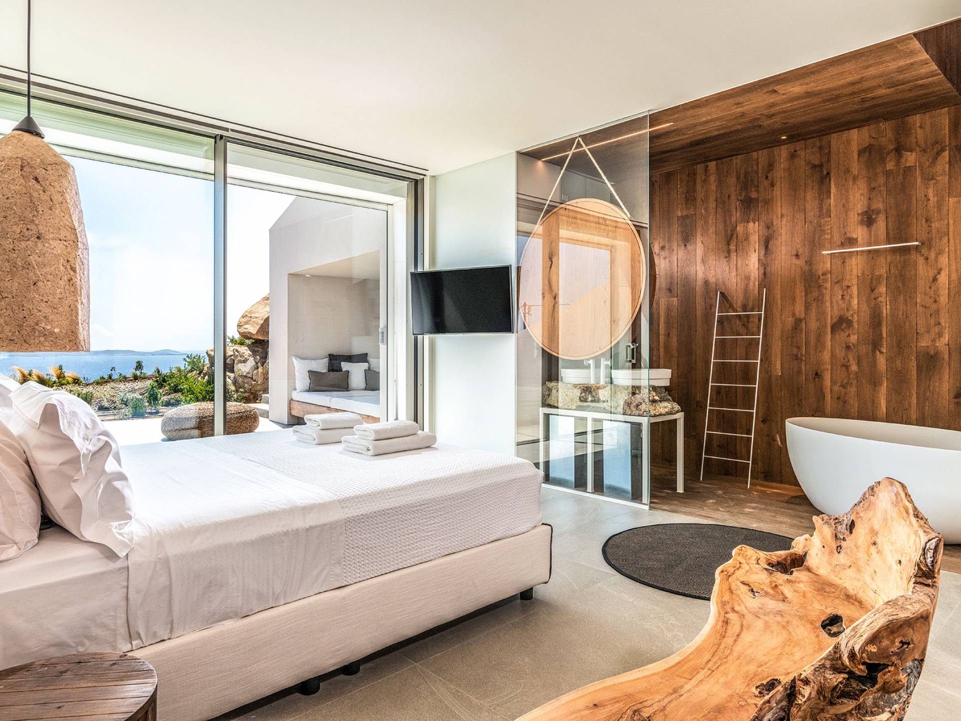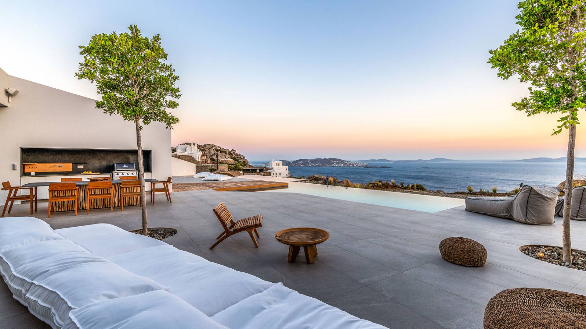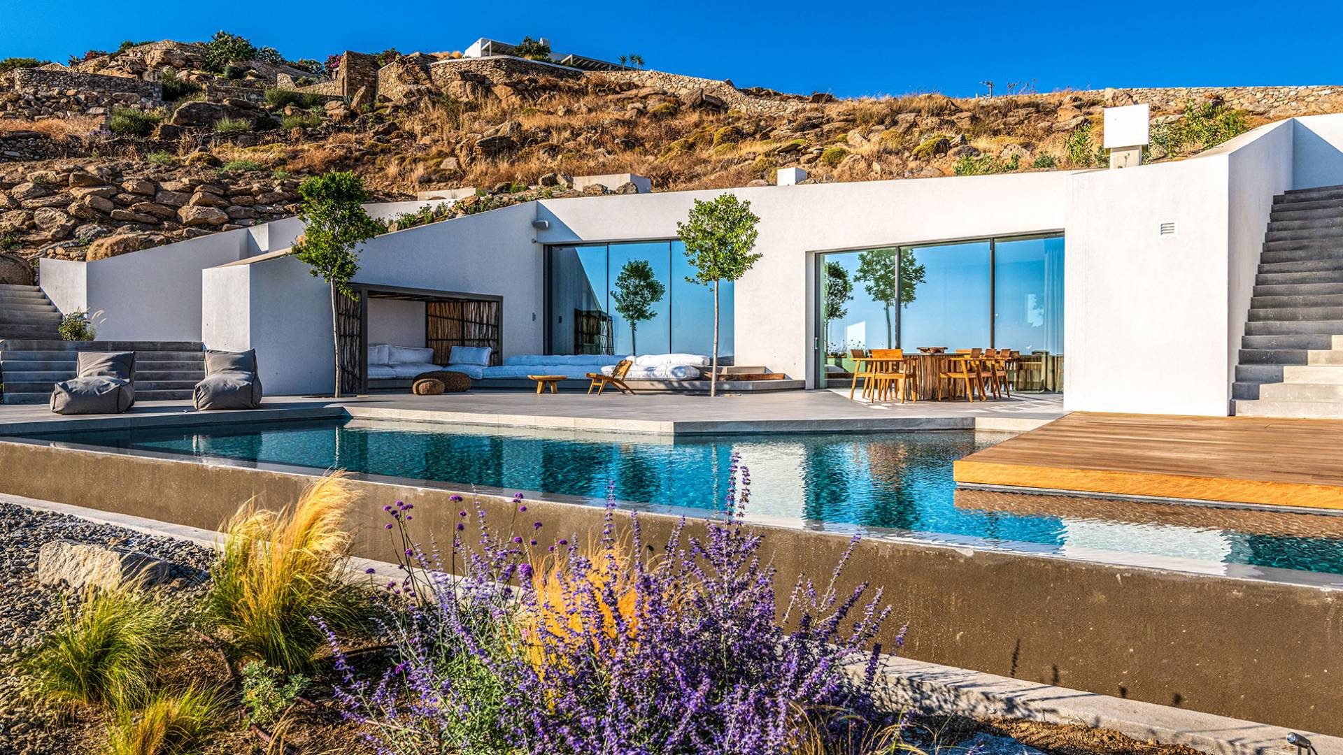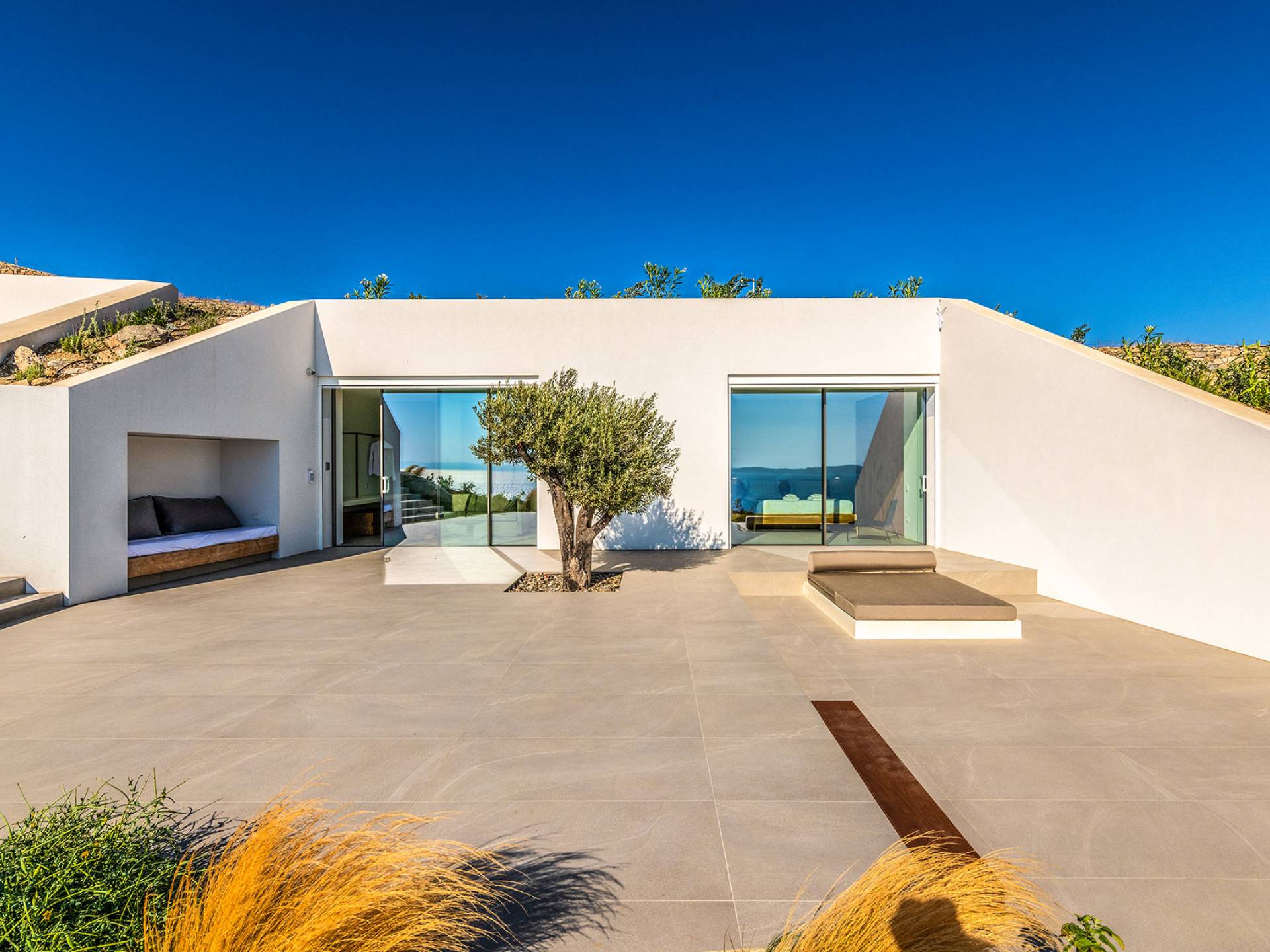 The Cove Villa Mykonos est une location de villa de luxe avec 6 chambres et une piscine privée. C'est une villa extraordinaire au concept architectural souterrain unique et à la décoration de style minimaliste avec des éléments en bois, dont la construction a été achevée en 2019. Elle peut accueillir confortablement jusqu'à 12 personnes et est située à proximité du centre de Mykonos (Chora) mais sur un terrain exceptionnellement privé et calme. emplacement à Tourlos, surplombant la baie d'Agios Stefanos. En raison de son design distinctif, chaque pièce de la propriété fait face à l'ouest de la mer Égée et bénéficie d'une vue imprenable sur le coucher de soleil sur la mer.