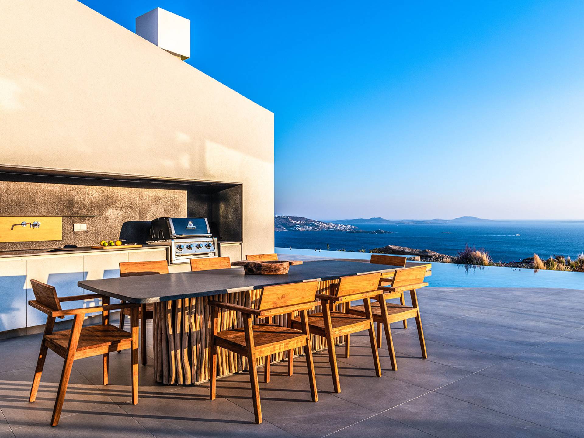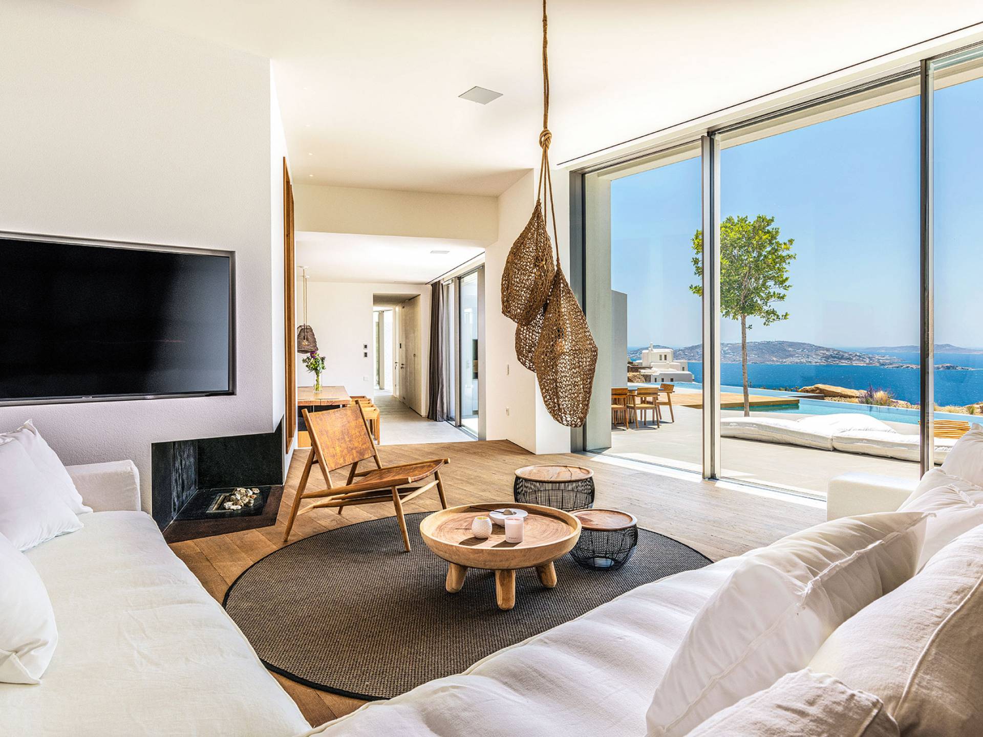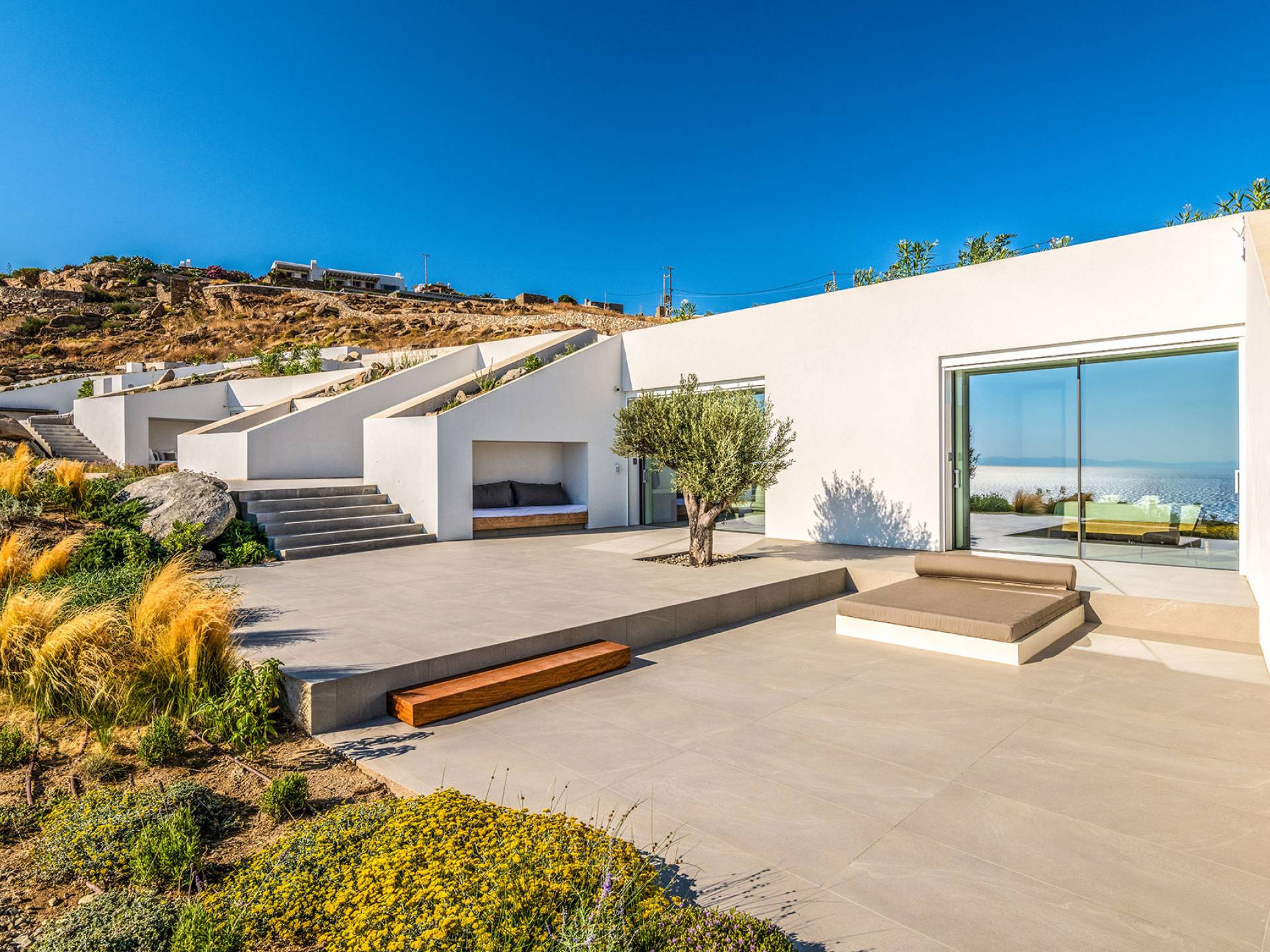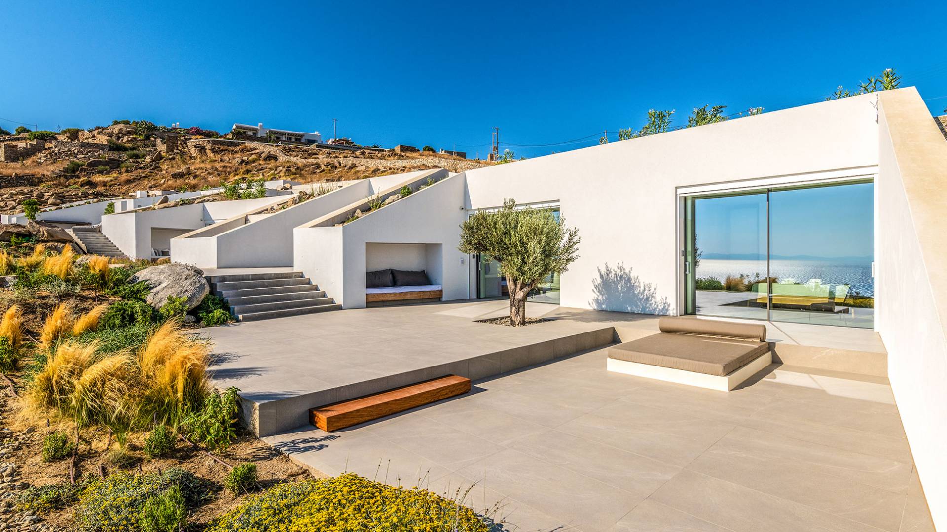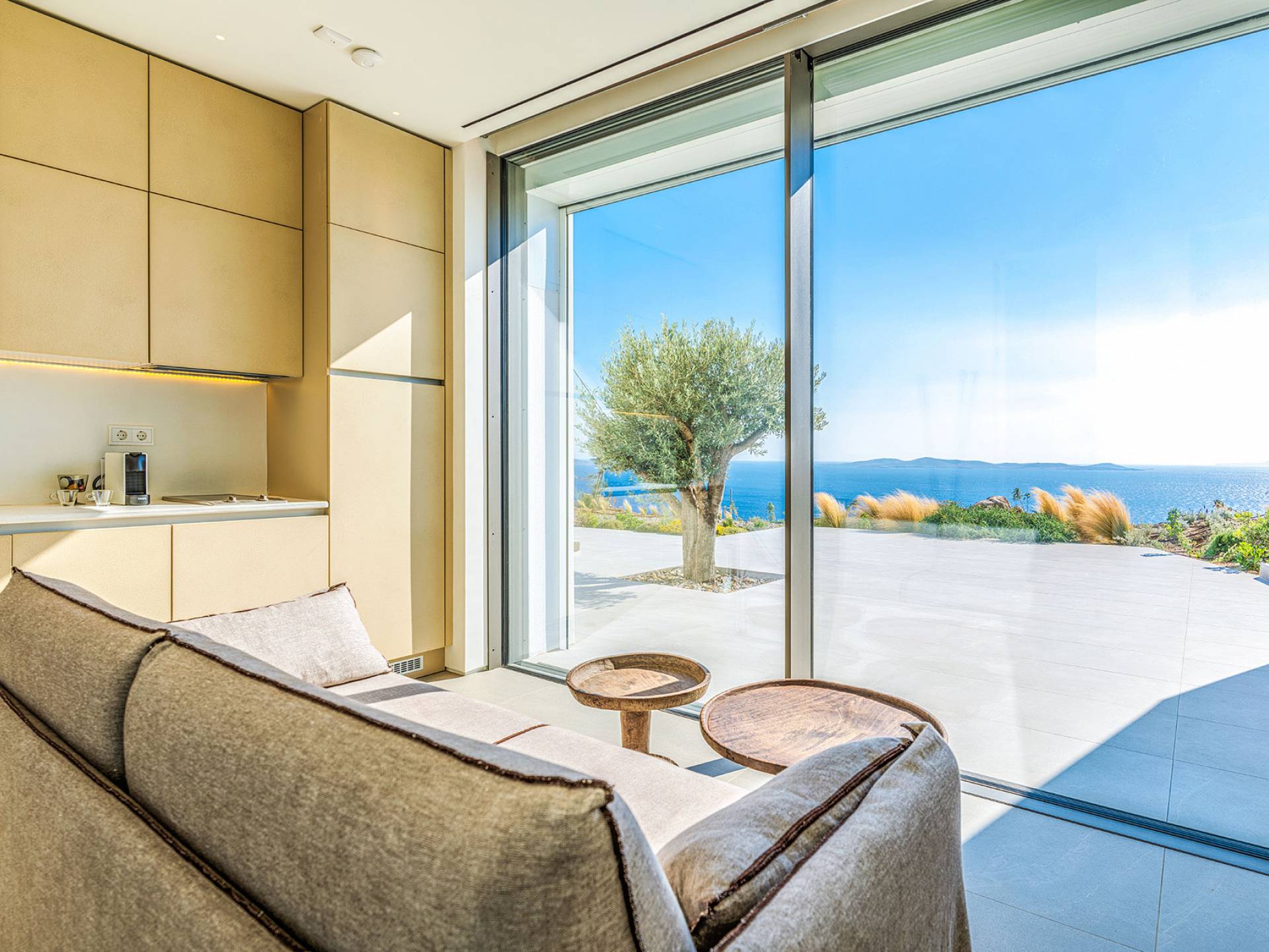 The Cove Villa Mykonos est une location de villa de luxe avec 6 chambres et une piscine privée. C'est une villa extraordinaire au concept architectural souterrain unique et à la décoration de style minimaliste avec des éléments en bois, dont la construction a été achevée en 2019. Elle peut accueillir confortablement jusqu'à 12 personnes et est située à proximité du centre de Mykonos (Chora) mais sur un terrain exceptionnellement privé et calme. emplacement à Tourlos, surplombant la baie d'Agios Stefanos. En raison de son design distinctif, chaque pièce de la propriété fait face à l'ouest de la mer Égée et bénéficie d'une vue imprenable sur le coucher de soleil sur la mer.