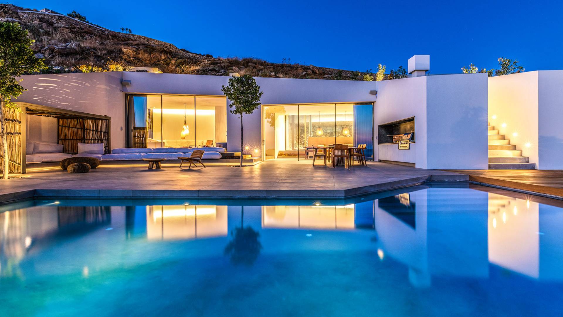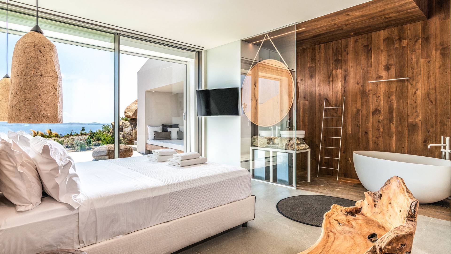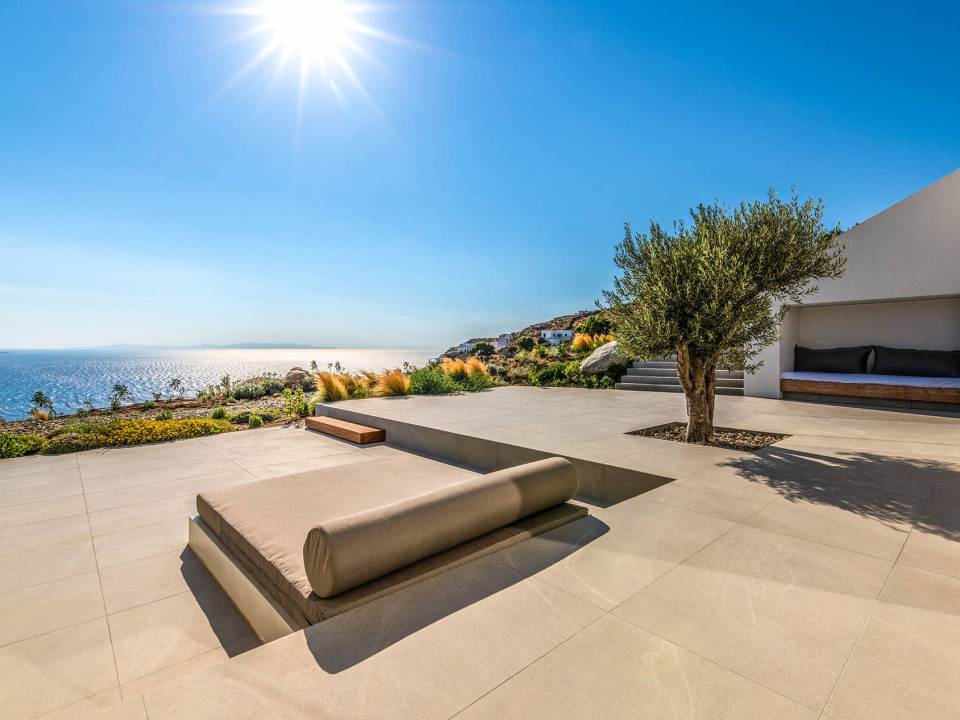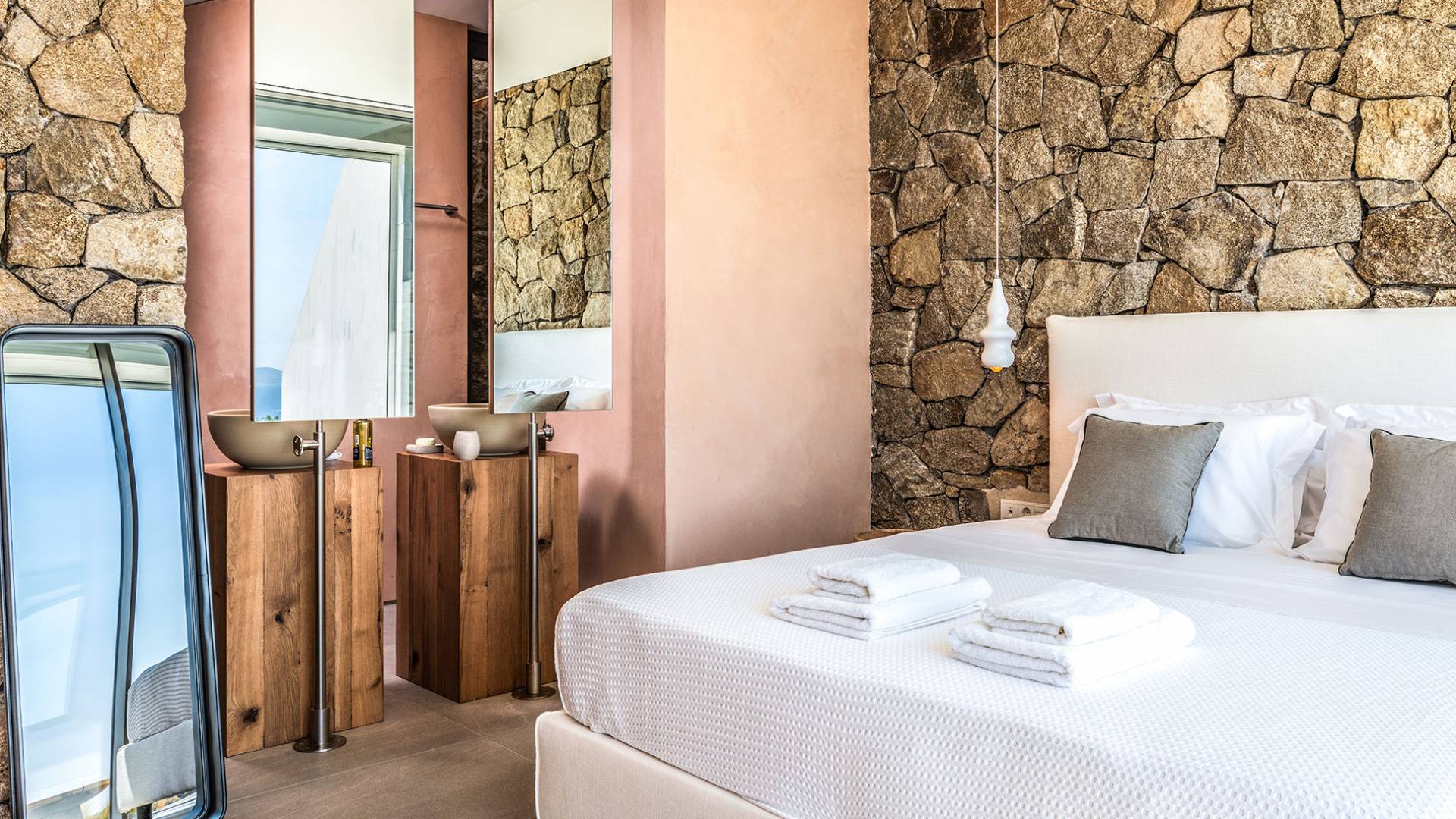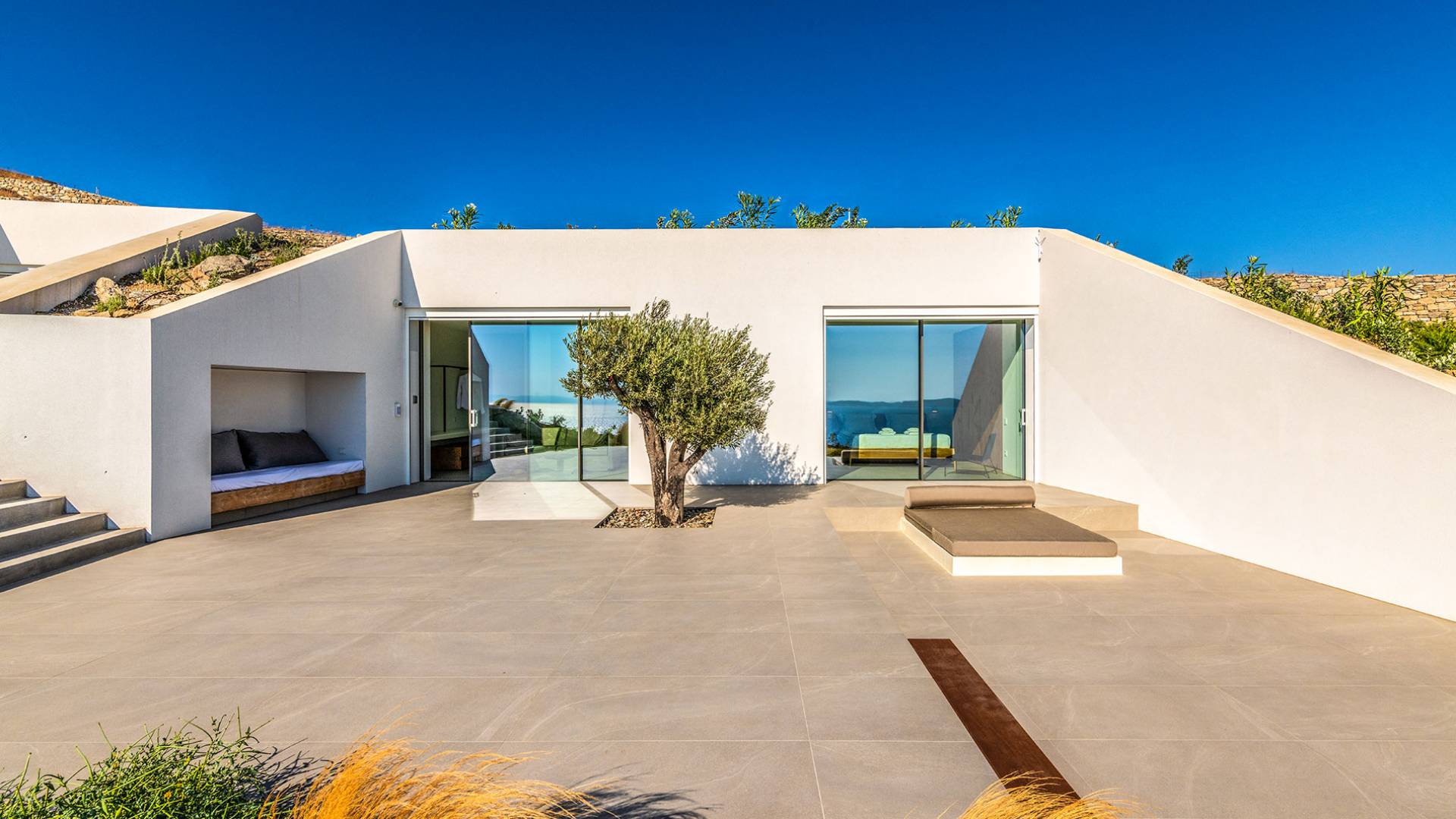 The Cove Villa Mykonos est une location de villa de luxe avec 6 chambres et une piscine privée. C'est une villa extraordinaire au concept architectural souterrain unique et à la décoration de style minimaliste avec des éléments en bois, dont la construction a été achevée en 2019. Elle peut accueillir confortablement jusqu'à 12 personnes et est située à proximité du centre de Mykonos (Chora) mais sur un terrain exceptionnellement privé et calme. emplacement à Tourlos, surplombant la baie d'Agios Stefanos. En raison de son design distinctif, chaque pièce de la propriété fait face à l'ouest de la mer Égée et bénéficie d'une vue imprenable sur le coucher de soleil sur la mer.