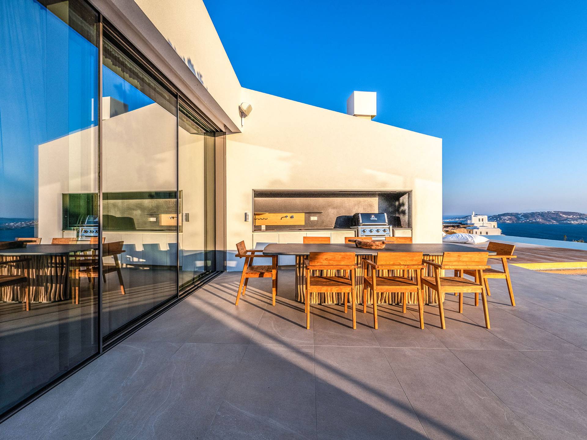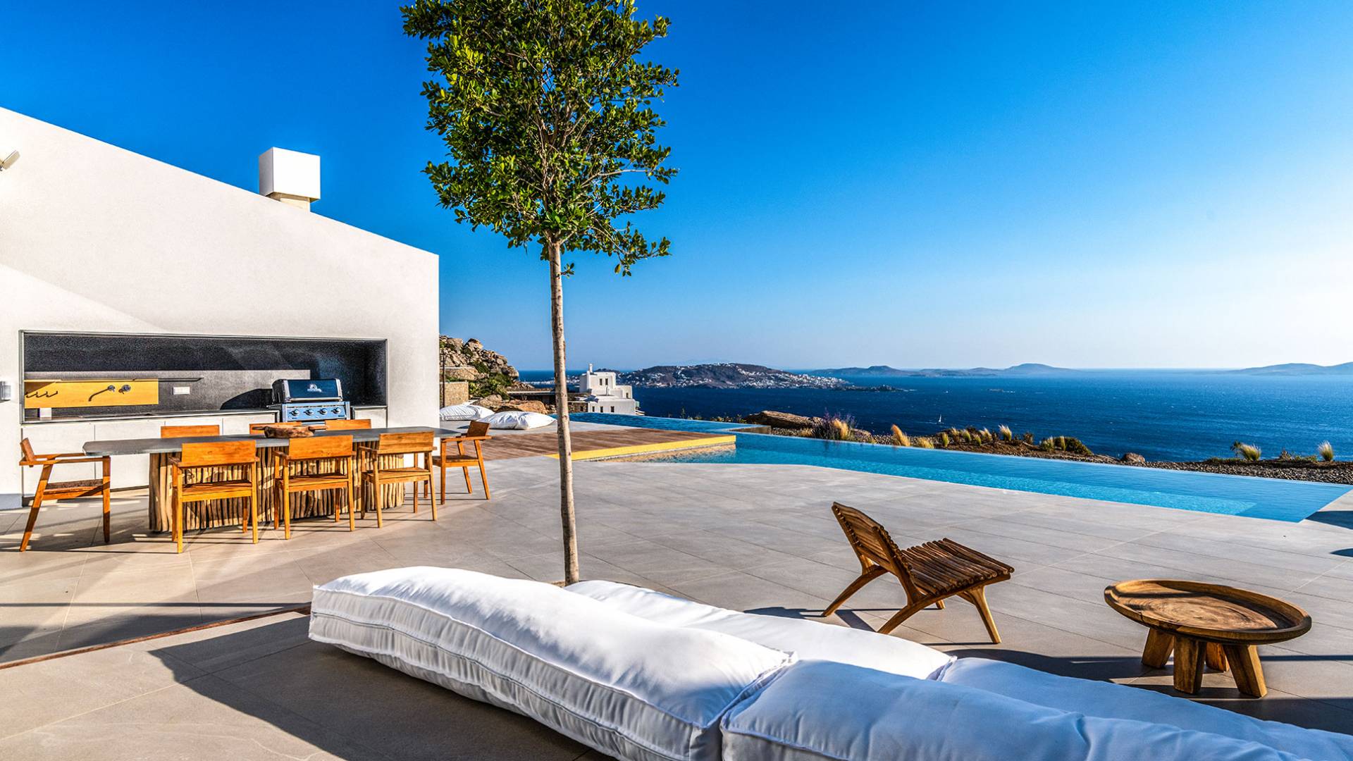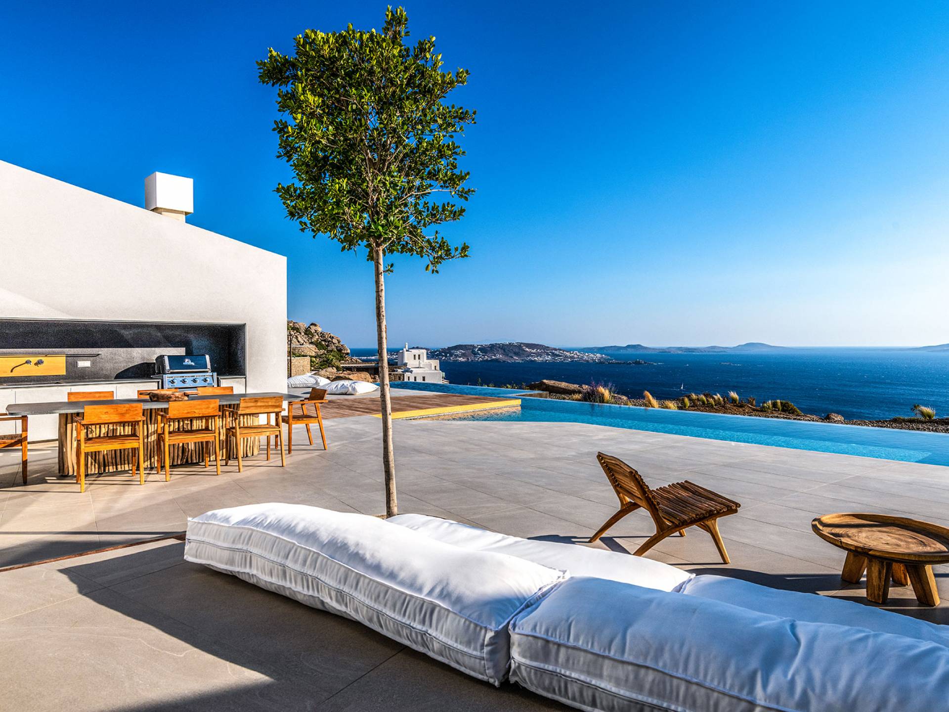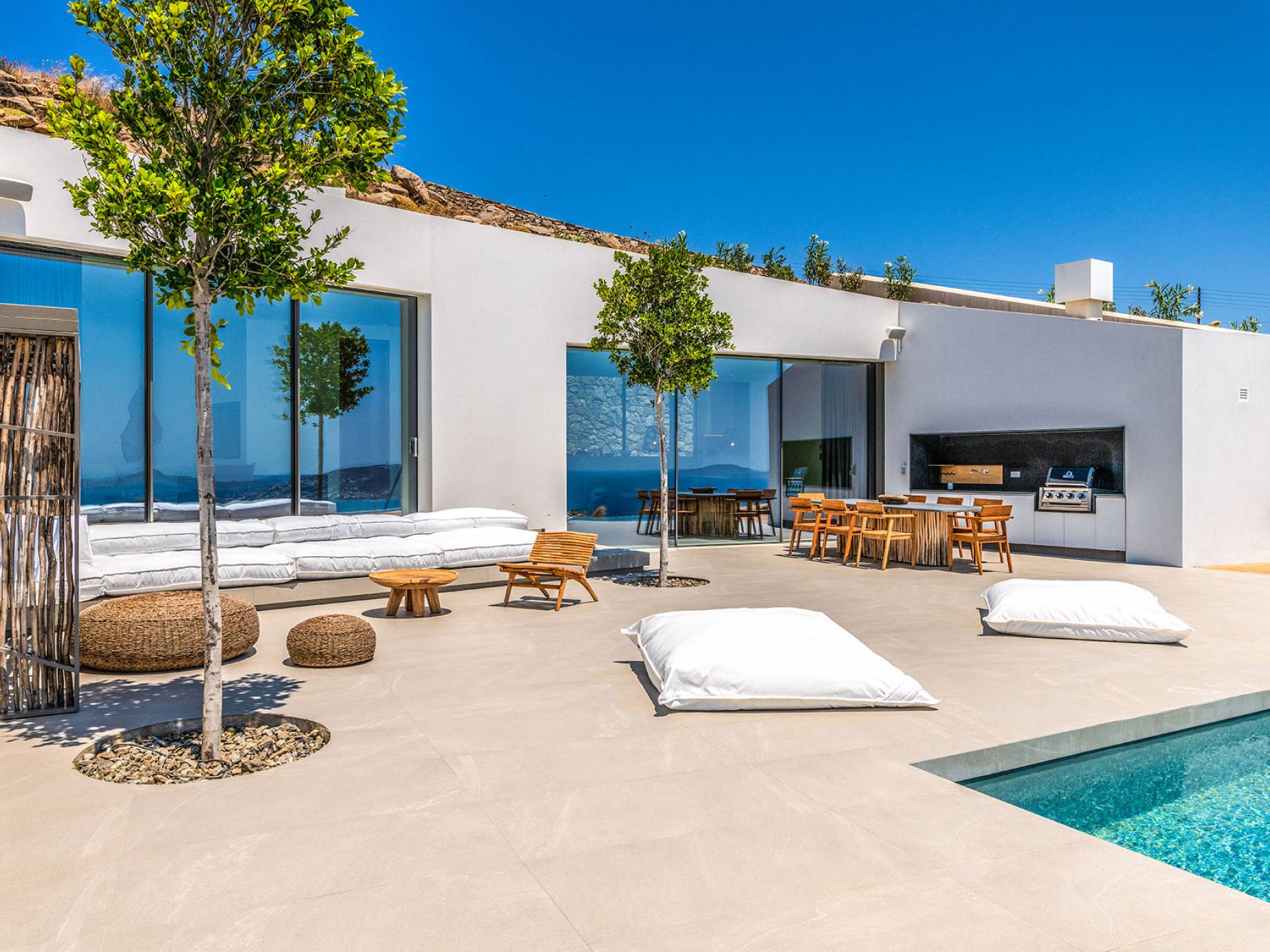 La Cove Villa Mykonos se compose de la villa principale et de la maison d'hôtes et dispose de 5 chambres plus 1 chambre d'appoint et de 8 salles de bains. La terrasse extérieure spacieuse (d'un total d'environ 500 m2) dispose de 20x4 m. piscine privée à débordement qui surplombe la mer Égée, la salle à manger et le barbecue, le home cinéma extérieur et les multiples coins salon et salon tout autour de la propriété où les clients peuvent se détendre ensemble ou indépendamment.