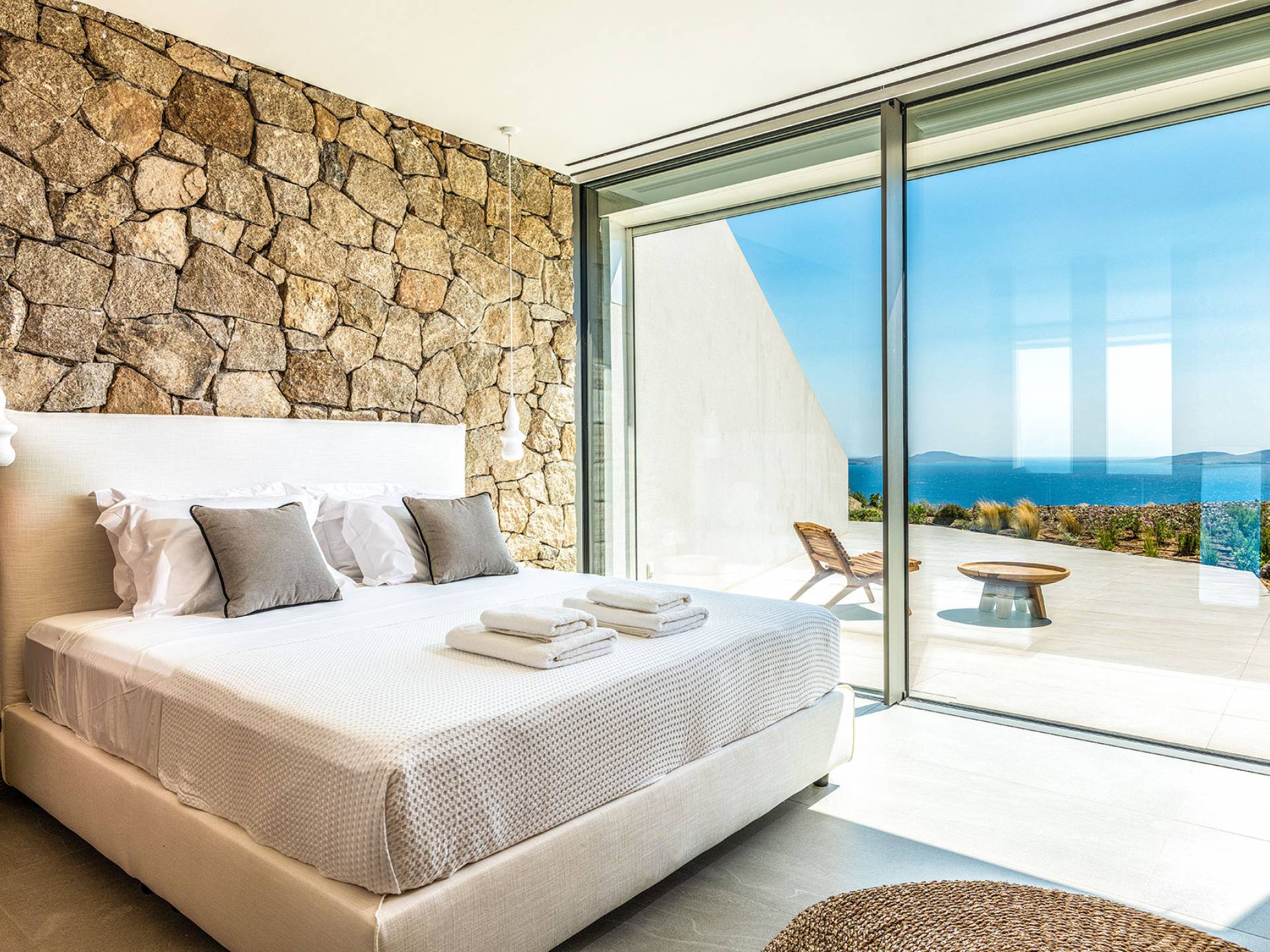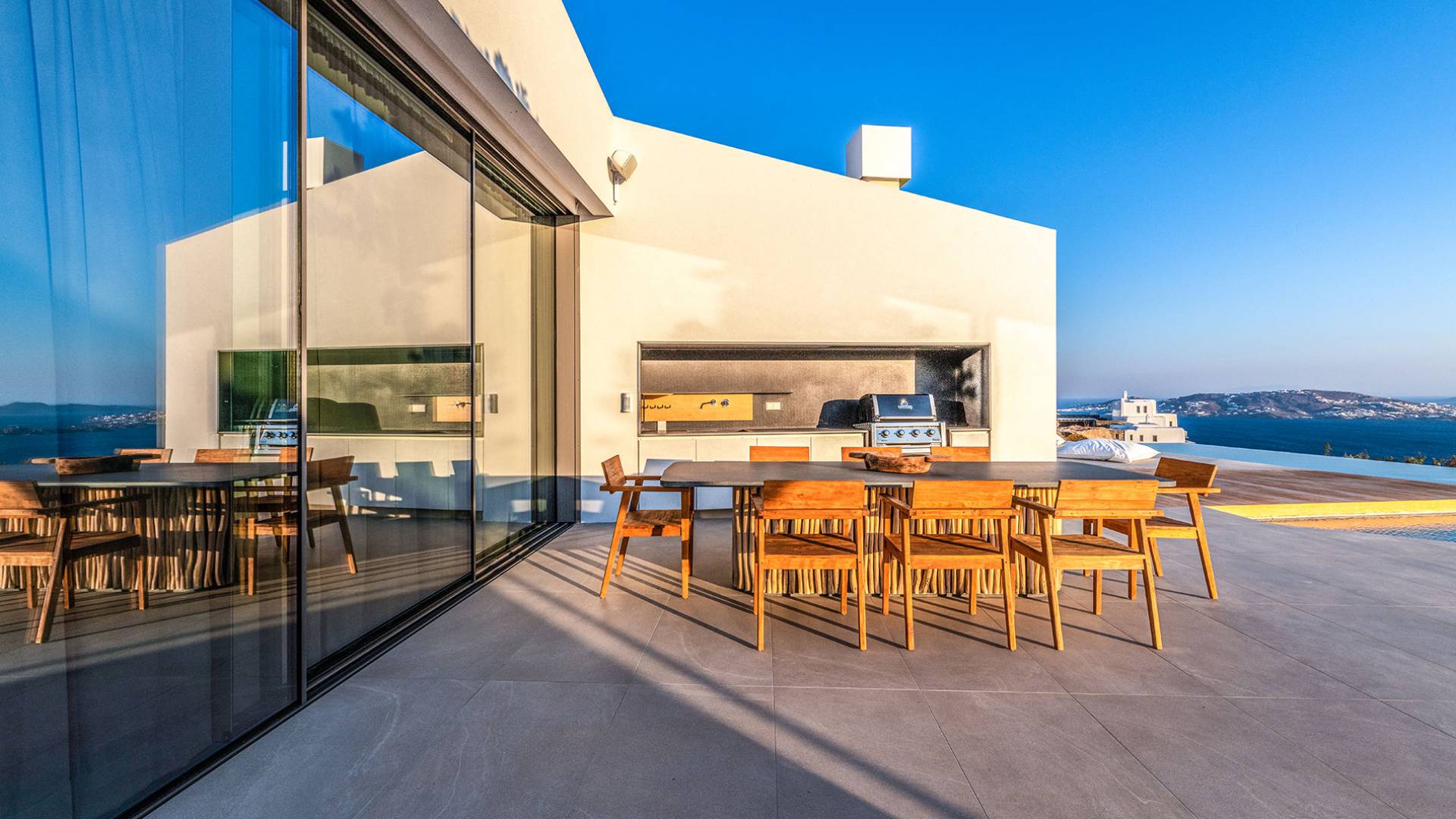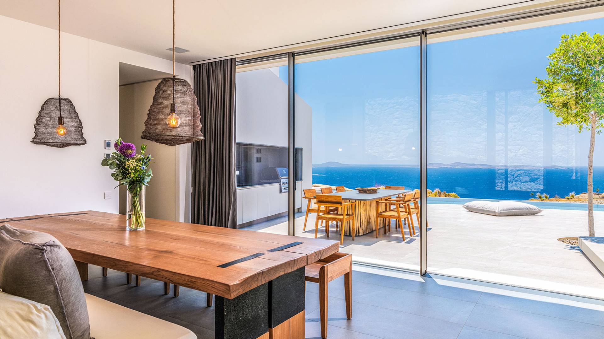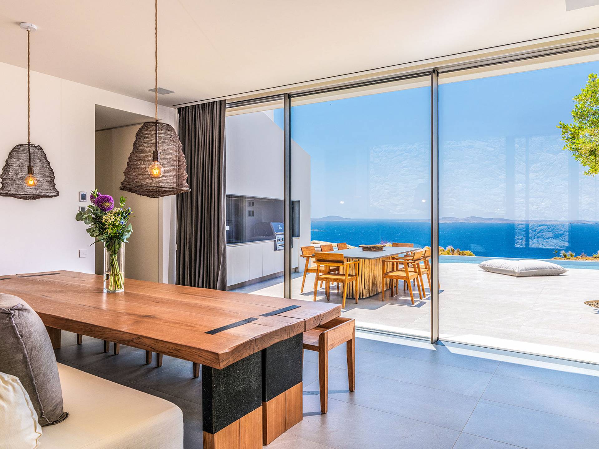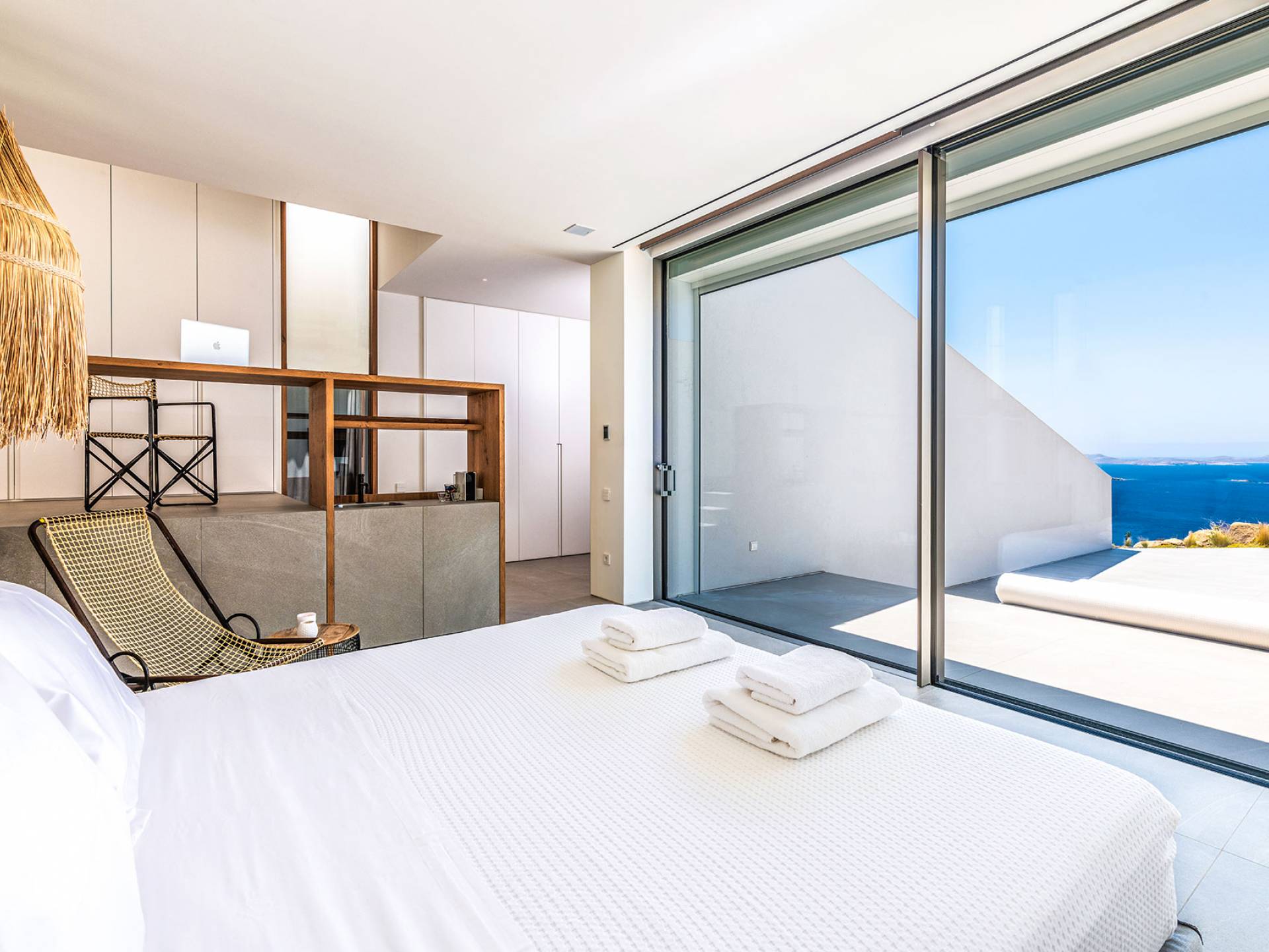 La Cove Villa Mykonos se compose de la villa principale et de la maison d'hôtes et dispose de 5 chambres plus 1 chambre d'appoint et de 8 salles de bains. La terrasse extérieure spacieuse (d'un total d'environ 500 m2) dispose de 20x4 m. piscine privée à débordement qui surplombe la mer Égée, la salle à manger et le barbecue, le home cinéma extérieur et les multiples coins salon et salon tout autour de la propriété où les clients peuvent se détendre ensemble ou indépendamment.