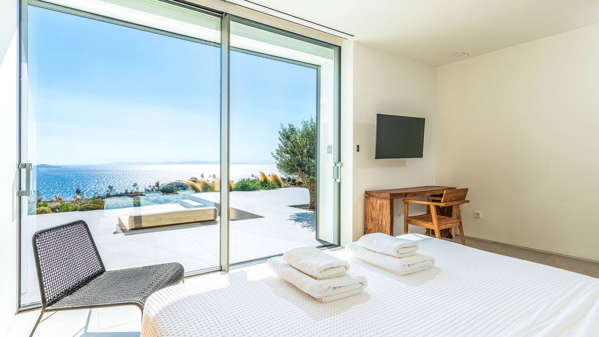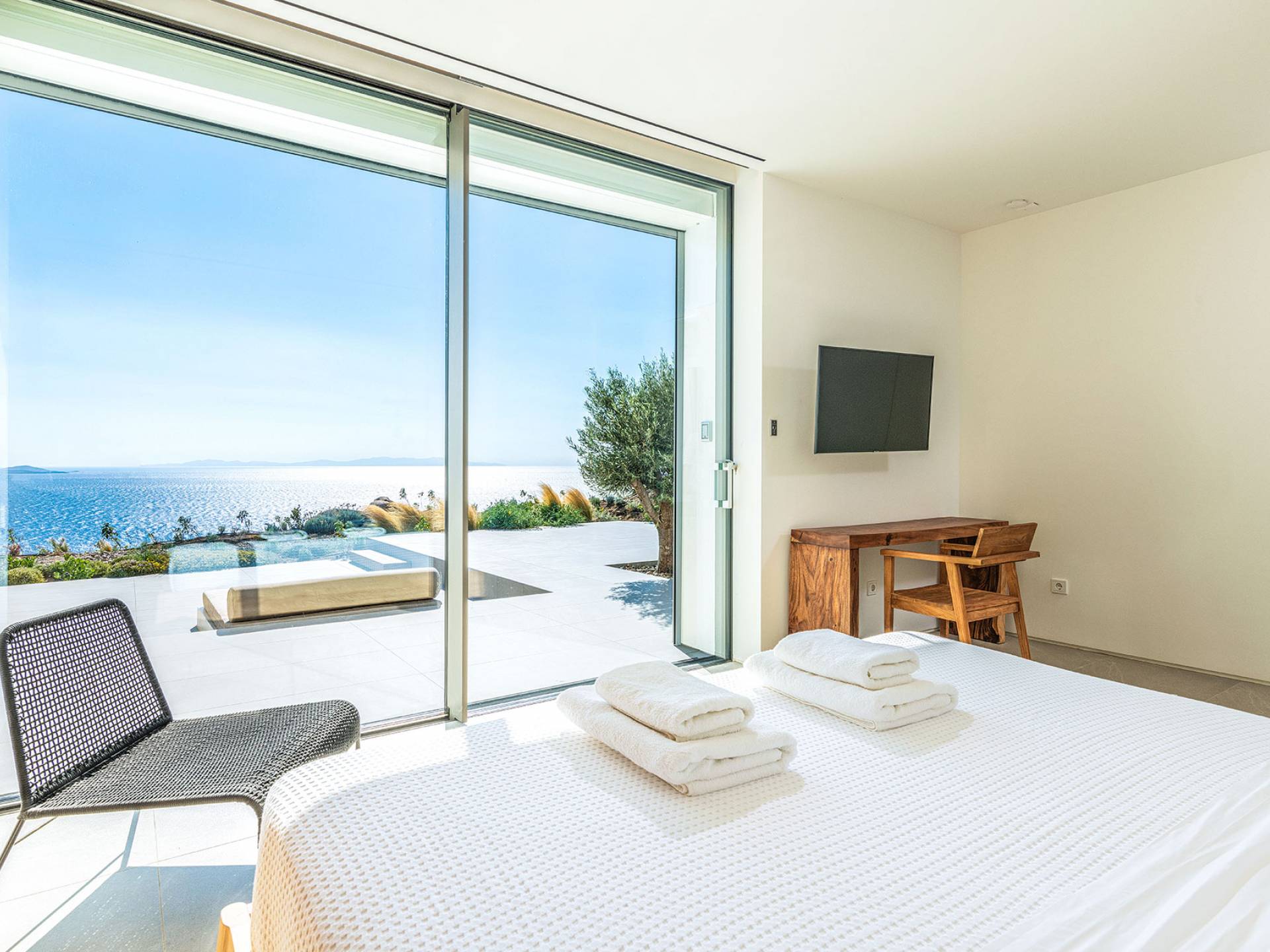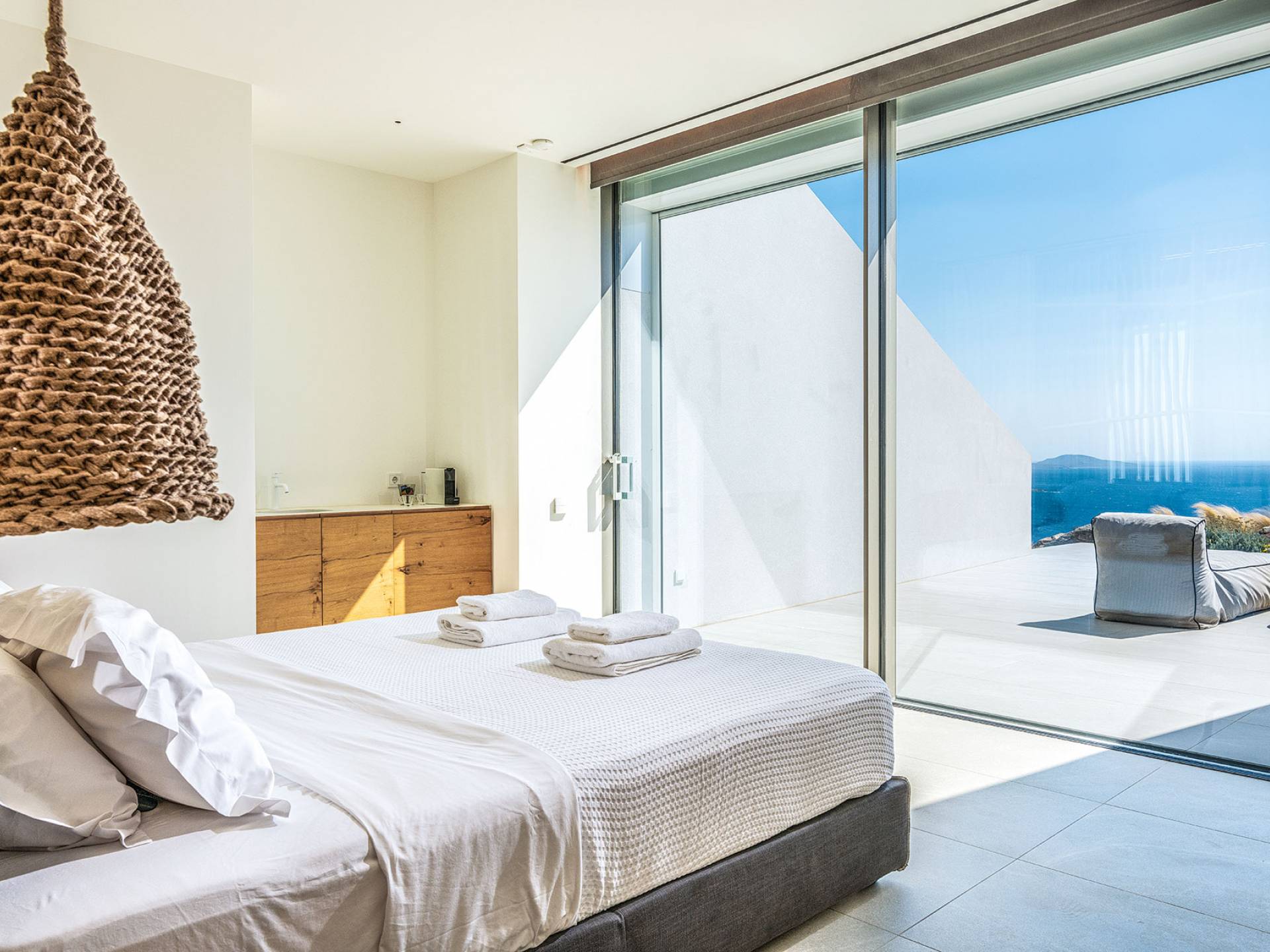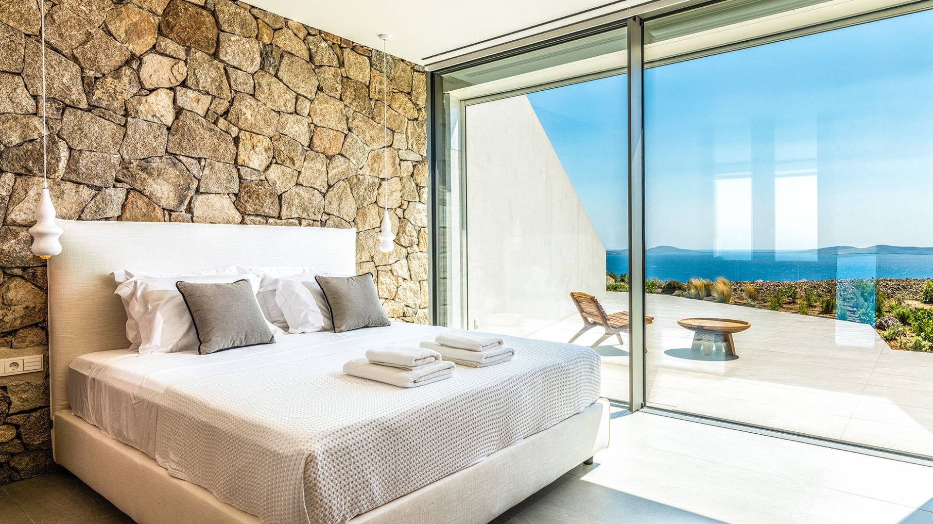 La Cove Villa Mykonos se compose de la villa principale et de la maison d'hôtes et dispose de 5 chambres plus 1 chambre d'appoint et de 8 salles de bains. La terrasse extérieure spacieuse (d'un total d'environ 500 m2) dispose de 20x4 m. piscine privée à débordement qui surplombe la mer Égée, la salle à manger et le barbecue, le home cinéma extérieur et les multiples coins salon et salon tout autour de la propriété où les clients peuvent se détendre ensemble ou indépendamment.