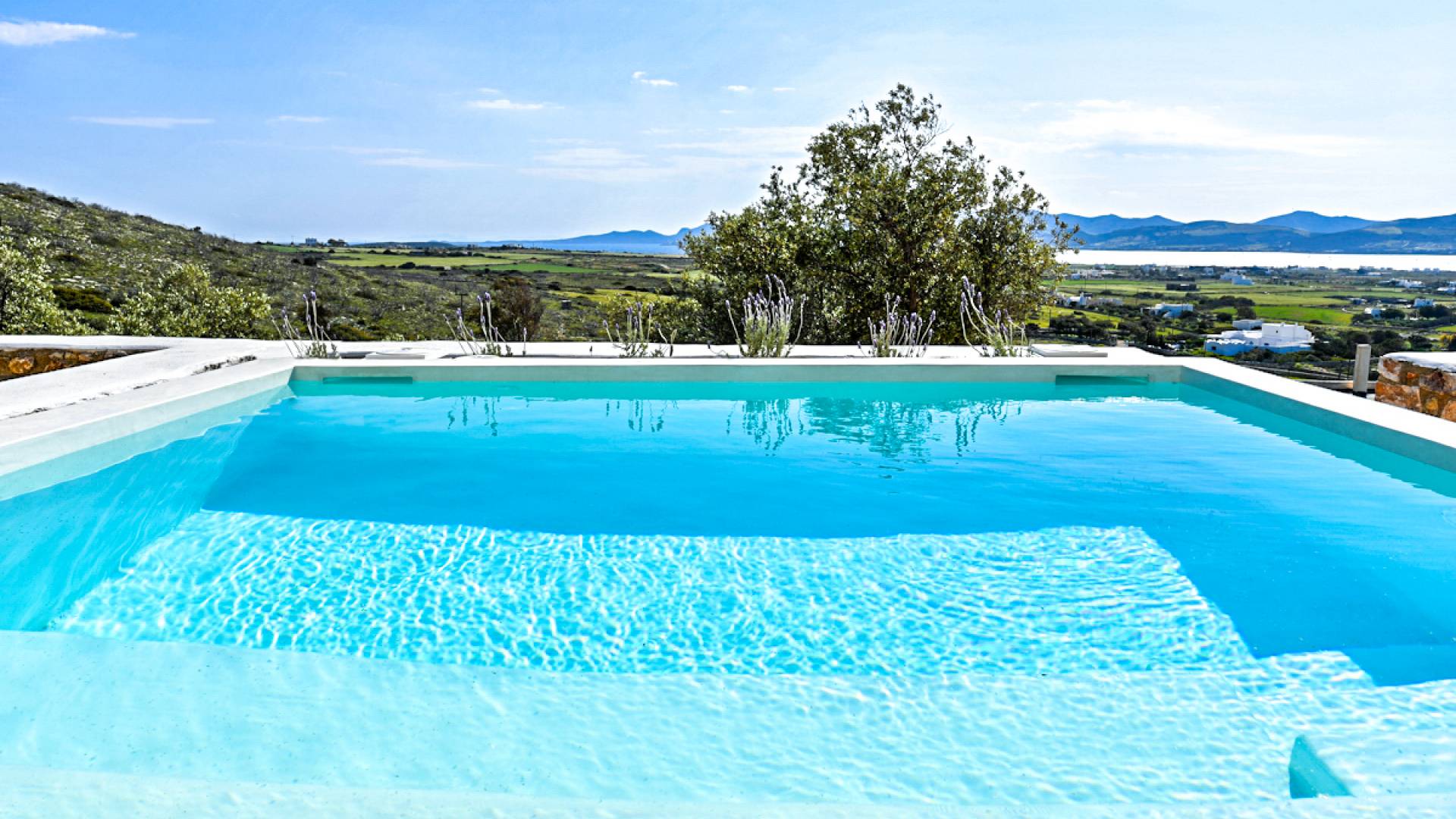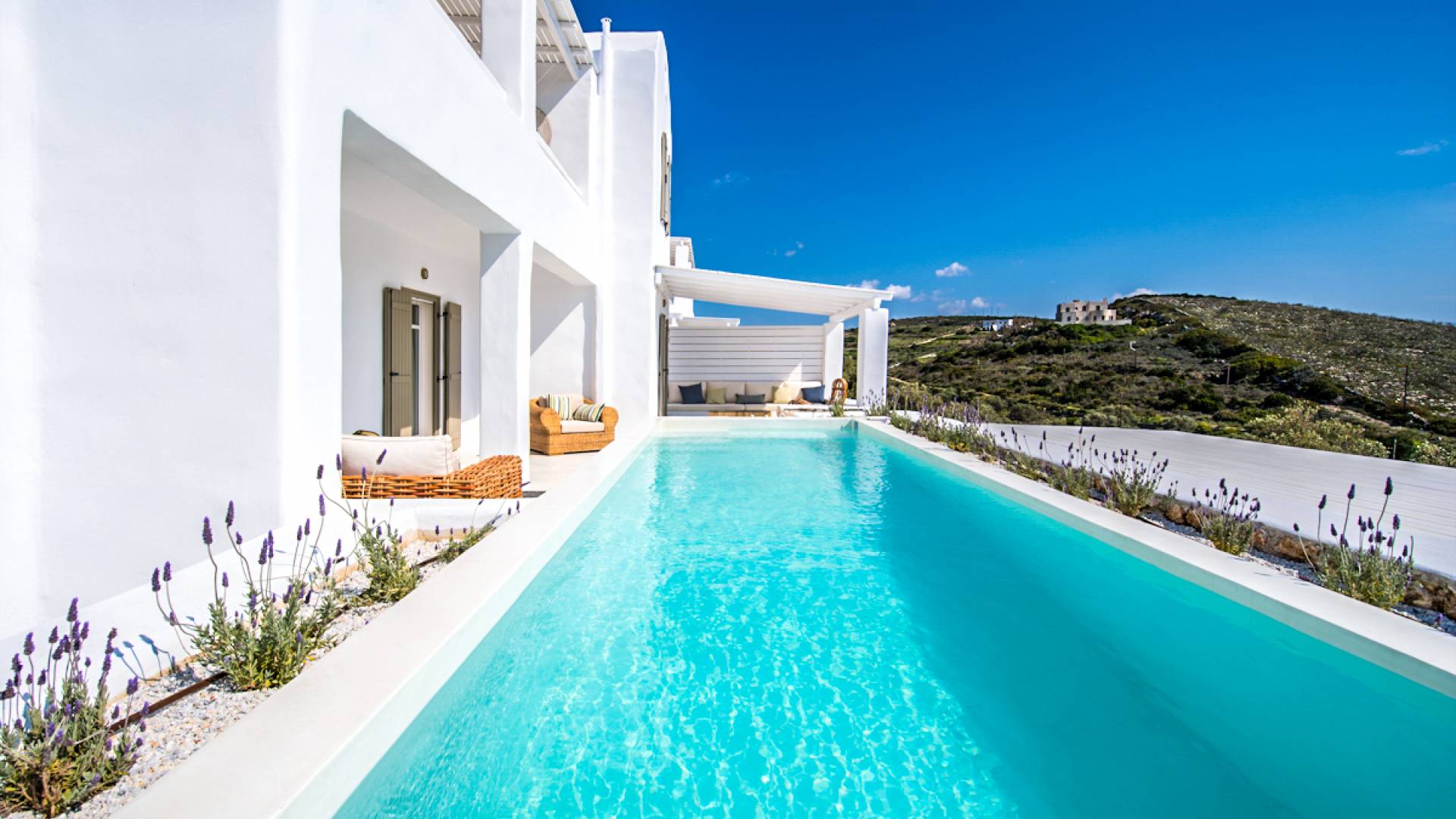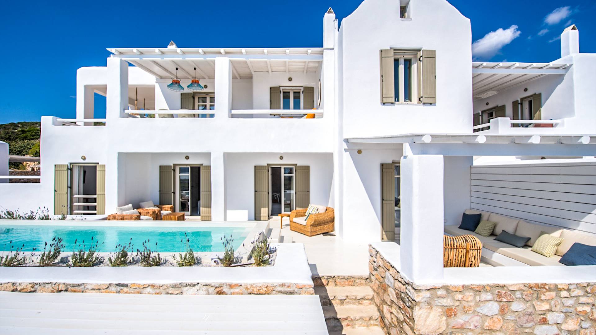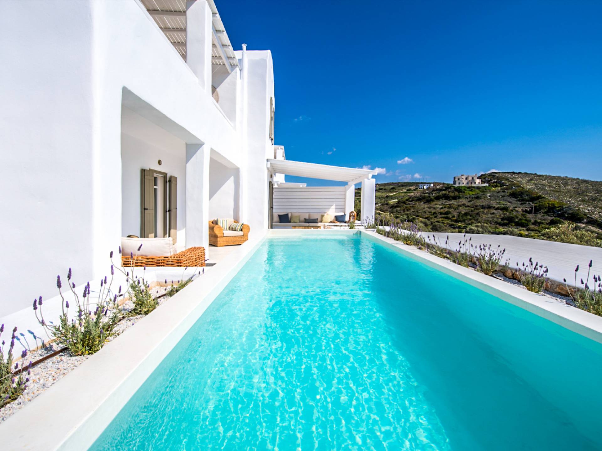 Les espaces extérieurs de Kallirhoe sont le véritable centre de ce paradis. La véranda supérieure entoure la villa du nord au sud et à l'ouest et dispose d'un transat intégré donnant sur Antiparos, d'une salle à manger pour 12 personnes, d'un coin salon pouvant accueillir jusqu'à 12 personnes et d'impressionnantes chaises hamac. La piscine de 14 m² et 1,3 mètre de profondeur est située au niveau des chambres, avec un jacuzzi et un coin salon séparé. Kallirhoe a deux niveaux supplémentaires, l'un conçu pour les rassemblements, composé d'une salle à manger pour 12 personnes et de transats, et d'un paradis privé, totalement à l'abri des regards avec un immense transat pouvant accueillir jusqu'à deux personnes. Kallirhoe dispose de 6 espaces extérieurs séparés et complètement indépendants, à l'abri du soleil et du vent à tout moment.