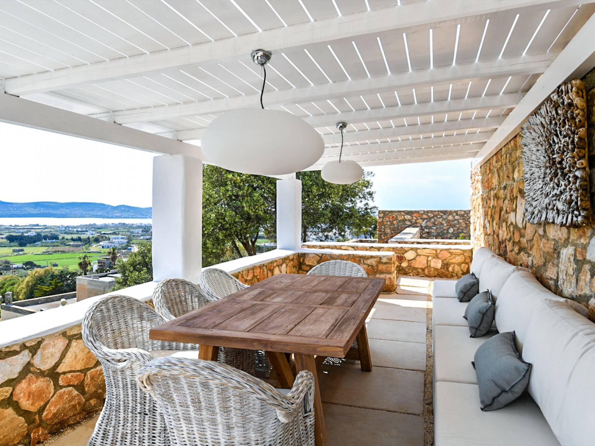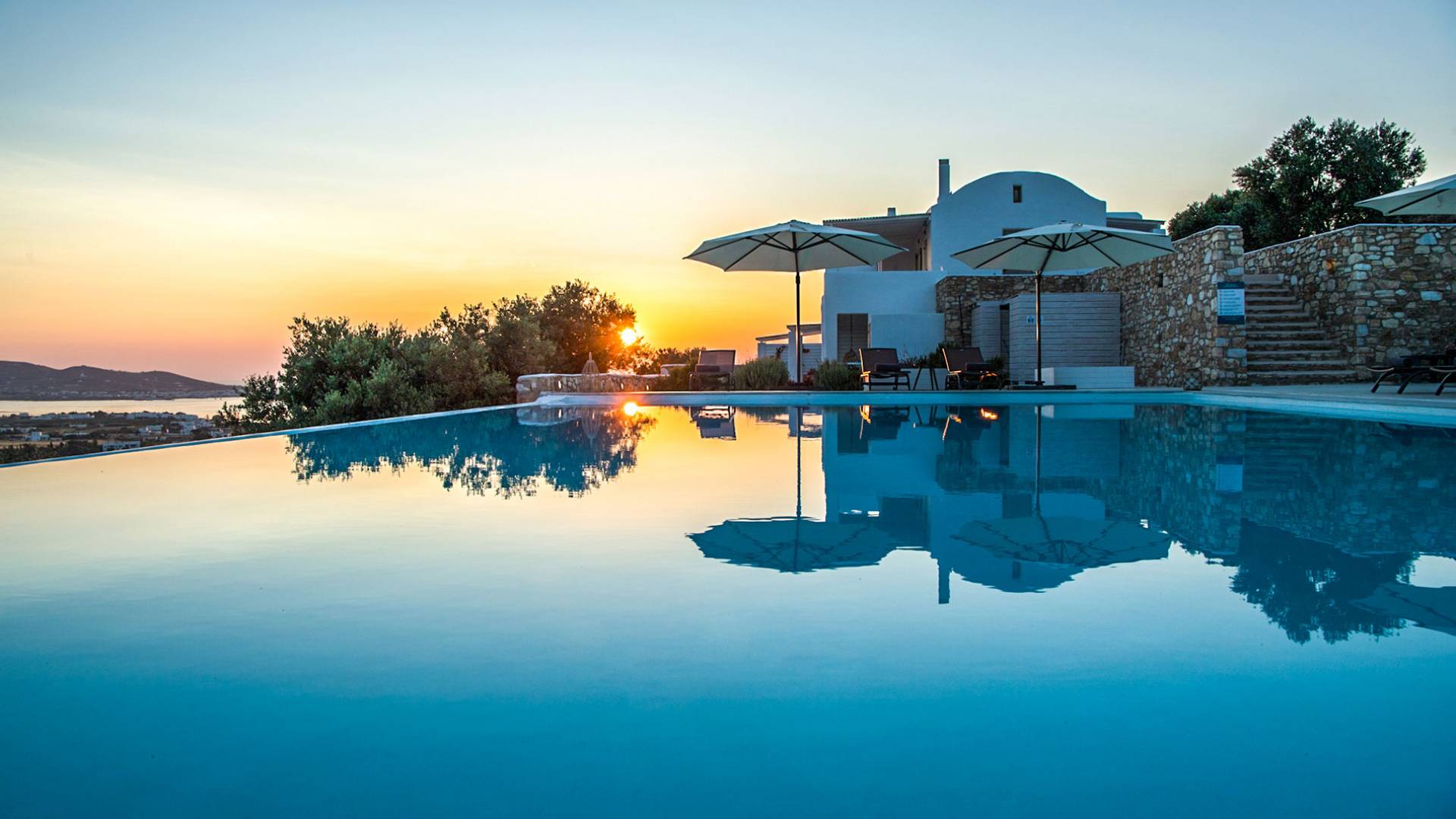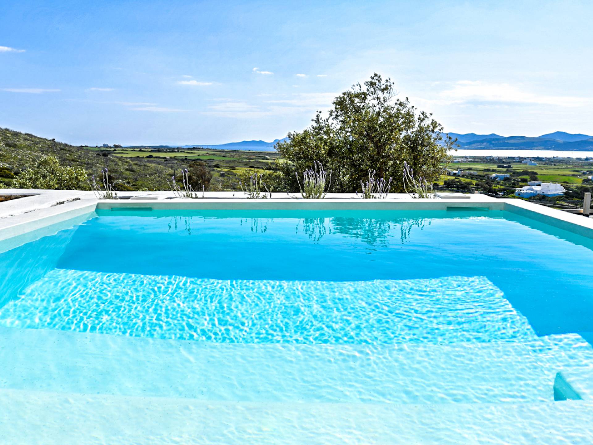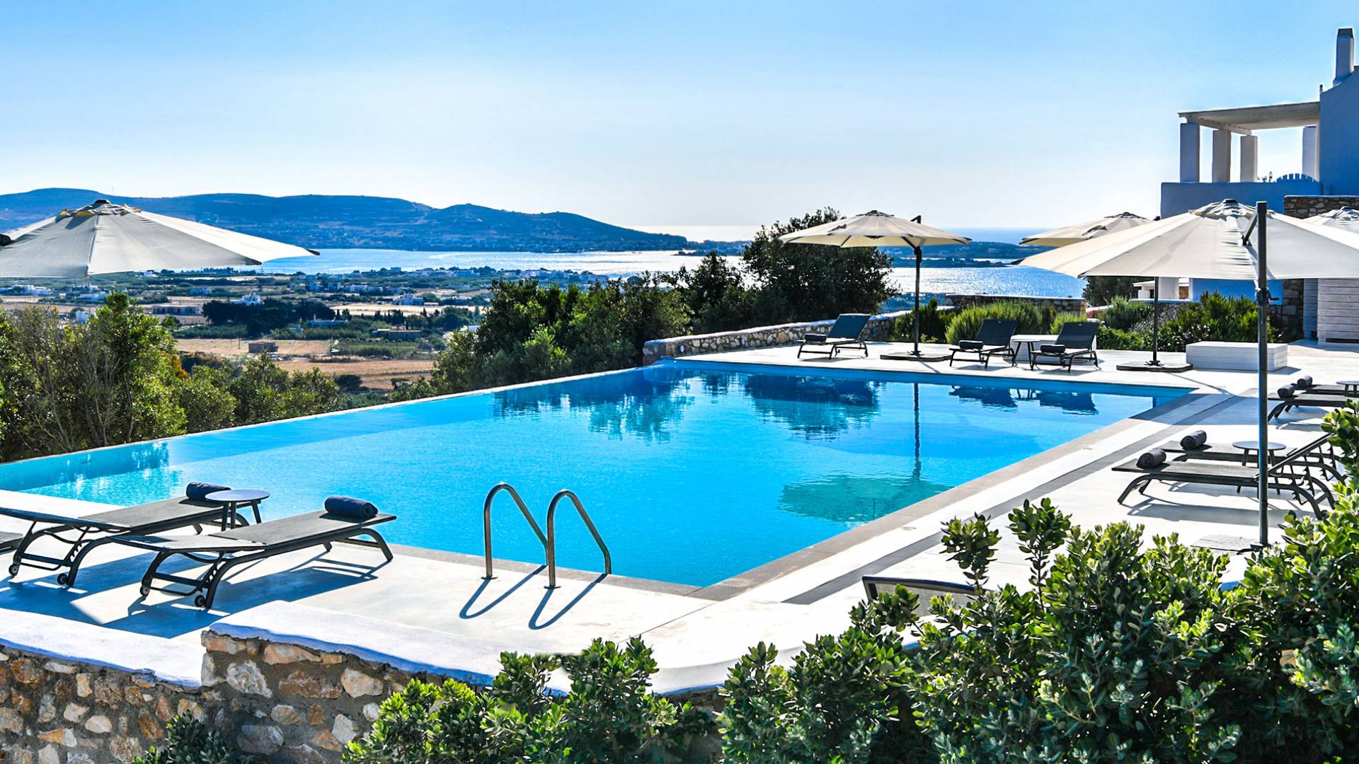 Les espaces extérieurs de Kallirhoe sont le véritable centre de ce paradis. La véranda supérieure entoure la villa du nord au sud et à l'ouest et dispose d'un transat intégré donnant sur Antiparos, d'une salle à manger pour 12 personnes, d'un coin salon pouvant accueillir jusqu'à 12 personnes et d'impressionnantes chaises hamac. La piscine de 14 m² et 1,3 mètre de profondeur est située au niveau des chambres, avec un jacuzzi et un coin salon séparé. Kallirhoe a deux niveaux supplémentaires, l'un conçu pour les rassemblements, composé d'une salle à manger pour 12 personnes et de transats, et d'un paradis privé, totalement à l'abri des regards avec un immense transat pouvant accueillir jusqu'à deux personnes. Kallirhoe dispose de 6 espaces extérieurs séparés et complètement indépendants, à l'abri du soleil et du vent à tout moment.