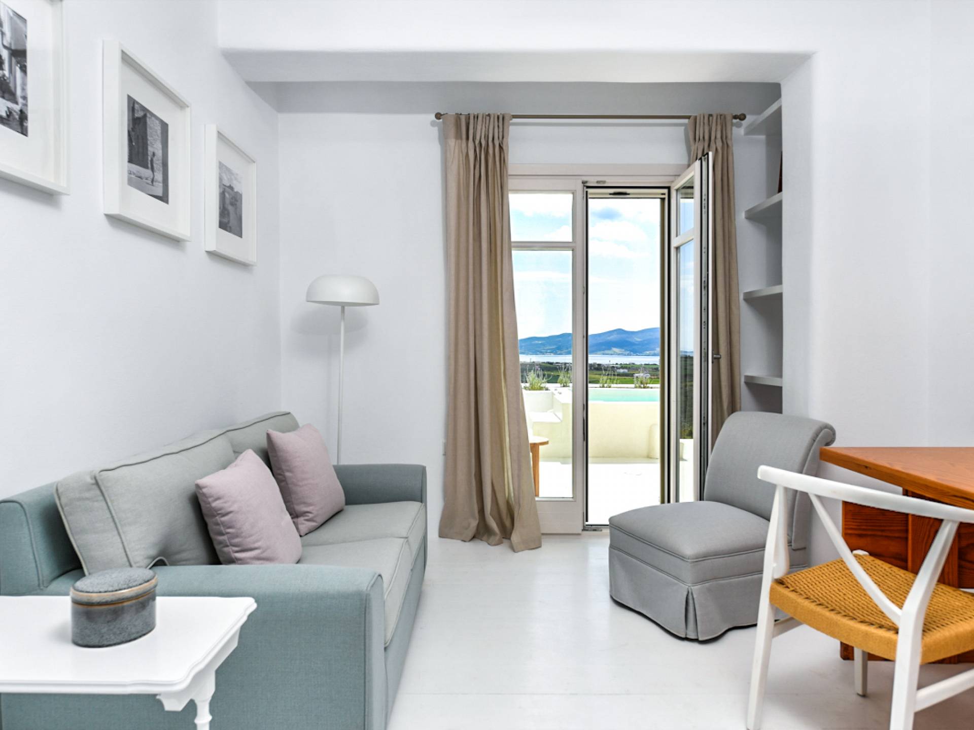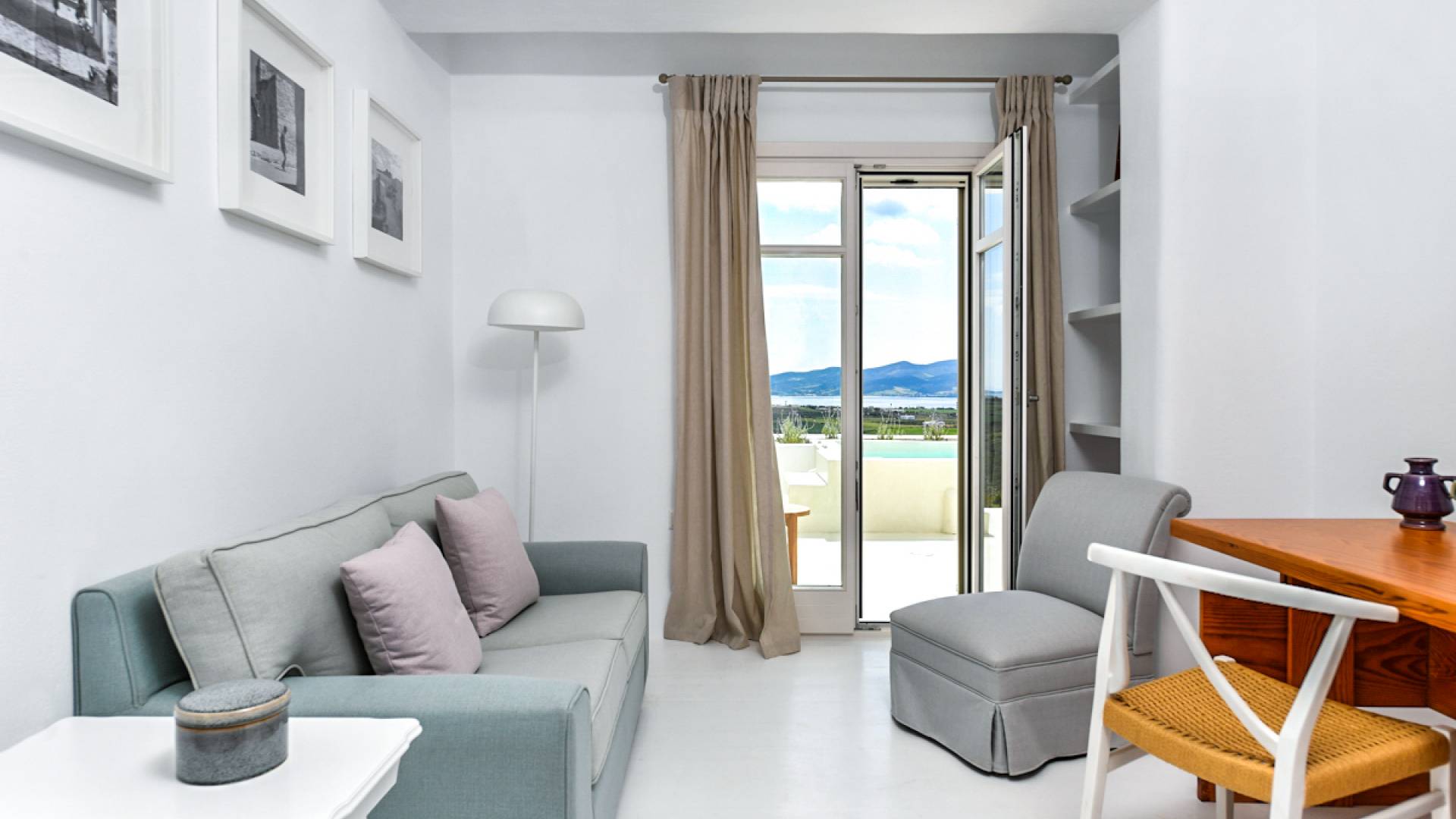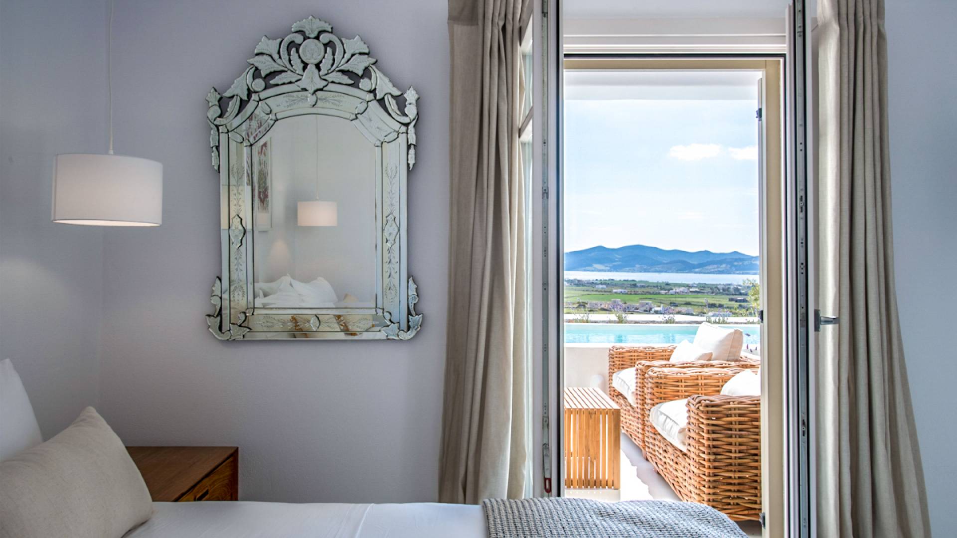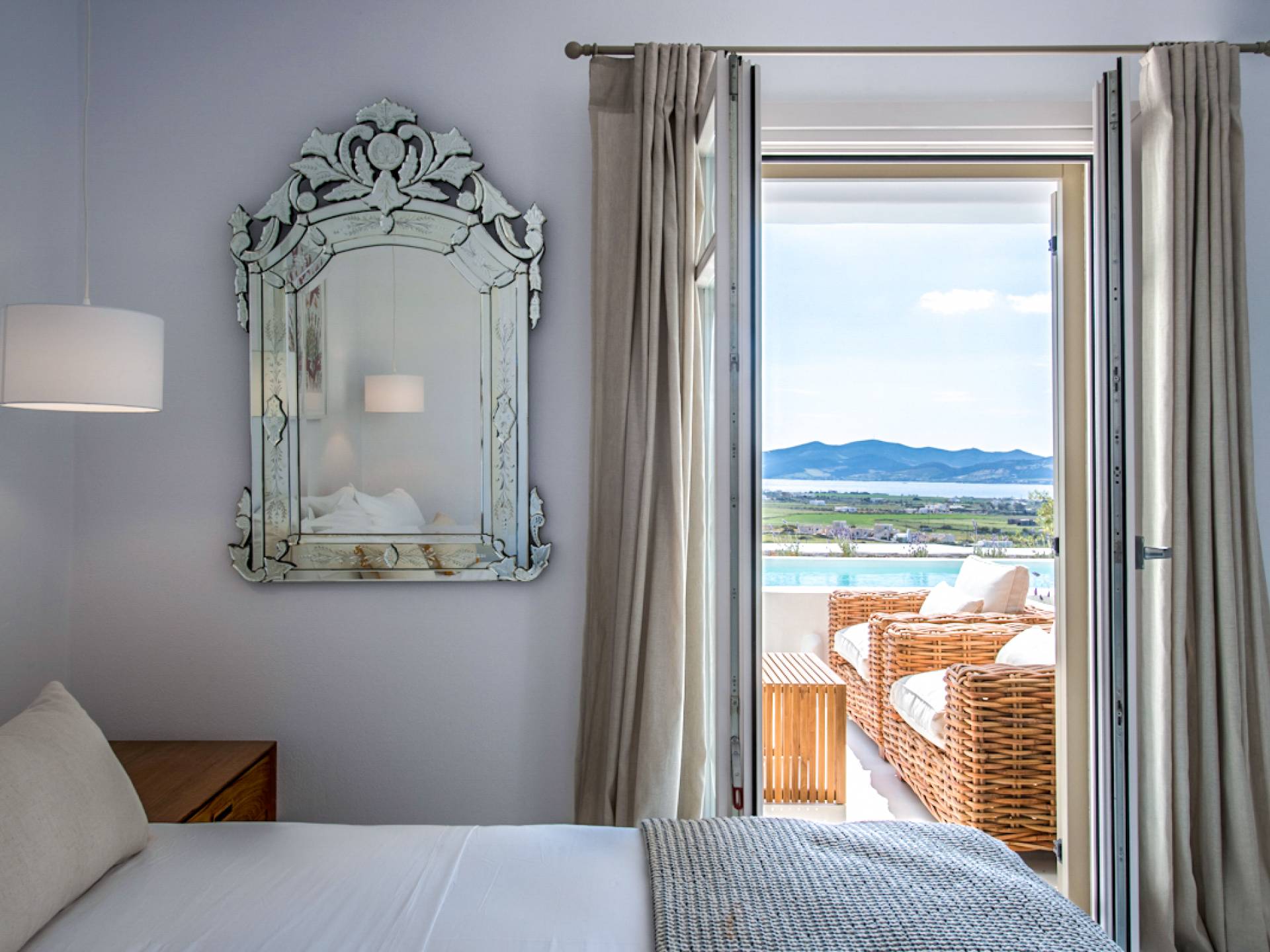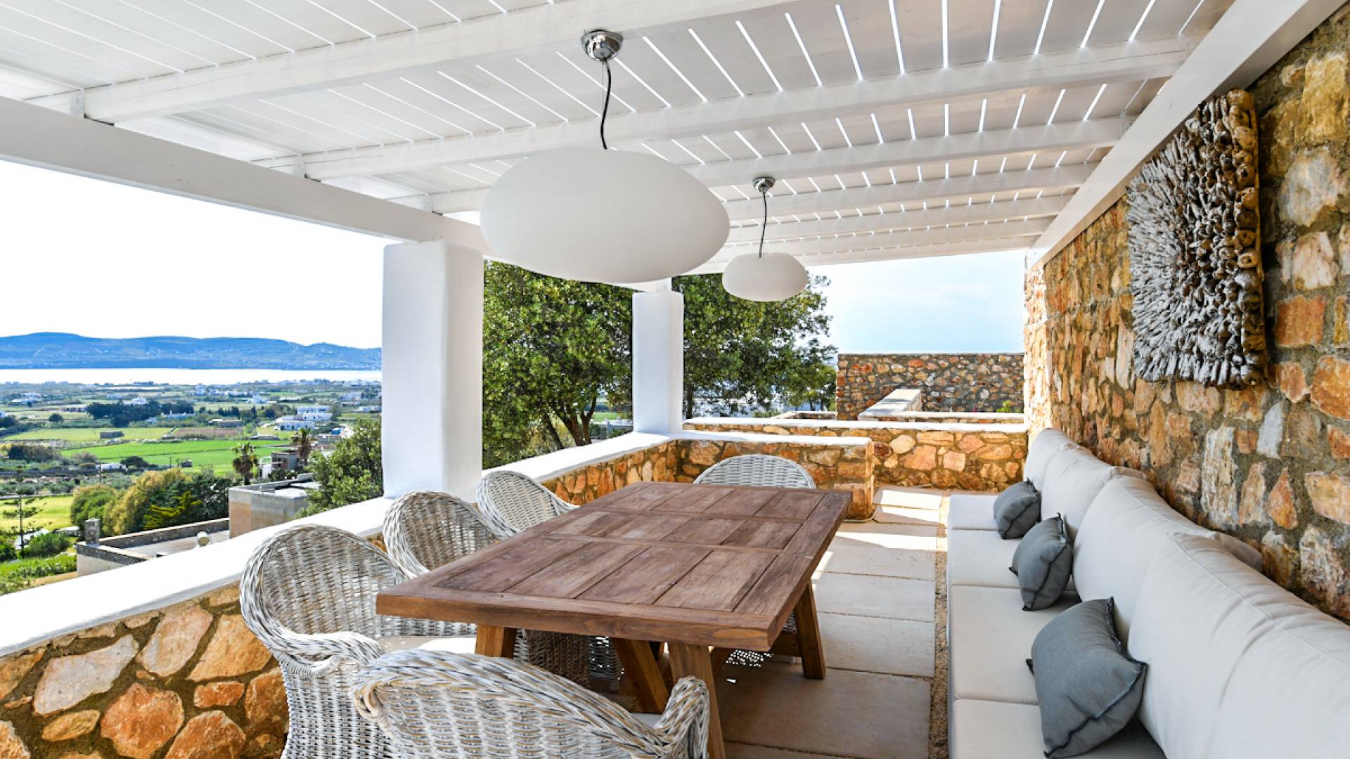 Les espaces extérieurs de Kallirhoe sont le véritable centre de ce paradis. La véranda supérieure entoure la villa du nord au sud et à l'ouest et dispose d'un transat intégré donnant sur Antiparos, d'une salle à manger pour 12 personnes, d'un coin salon pouvant accueillir jusqu'à 12 personnes et d'impressionnantes chaises hamac. La piscine de 14 m² et 1,3 mètre de profondeur est située au niveau des chambres, avec un jacuzzi et un coin salon séparé. Kallirhoe a deux niveaux supplémentaires, l'un conçu pour les rassemblements, composé d'une salle à manger pour 12 personnes et de transats, et d'un paradis privé, totalement à l'abri des regards avec un immense transat pouvant accueillir jusqu'à deux personnes. Kallirhoe dispose de 6 espaces extérieurs séparés et complètement indépendants, à l'abri du soleil et du vent à tout moment.