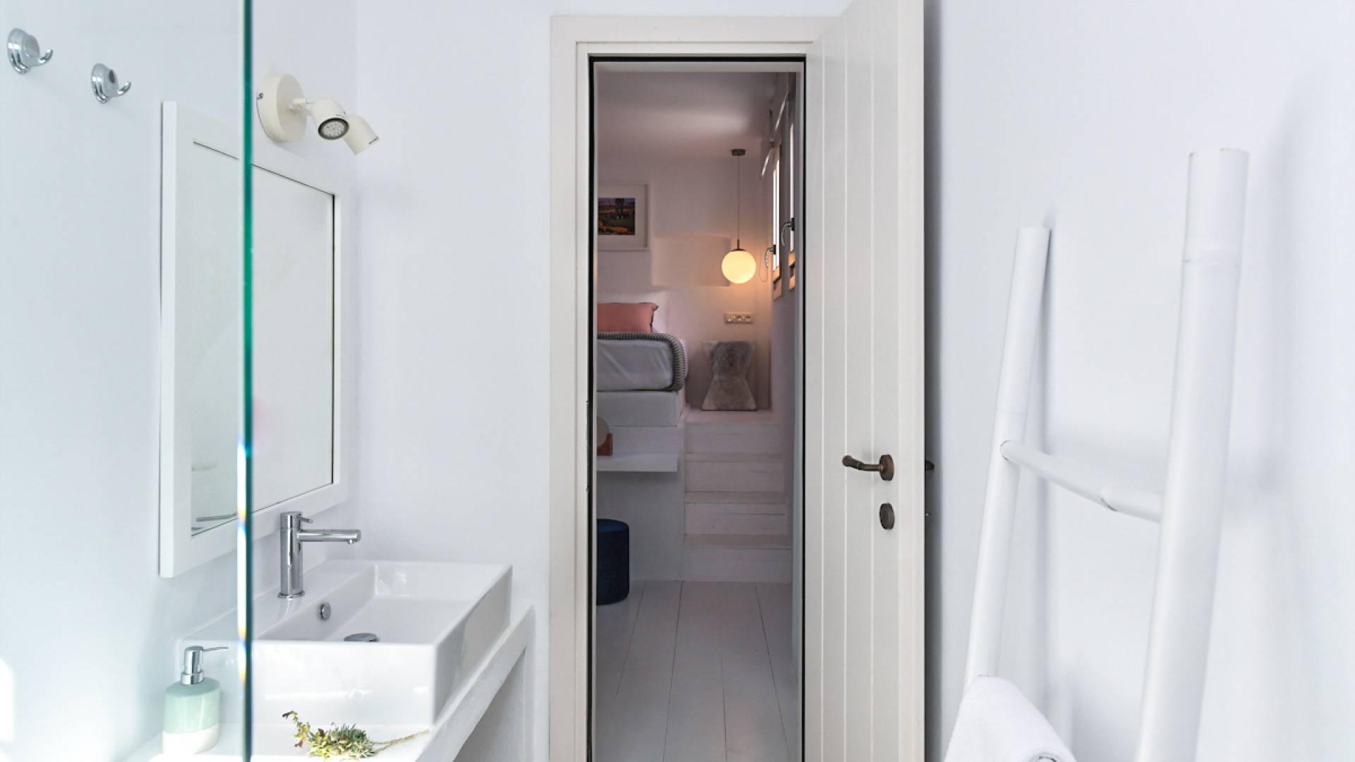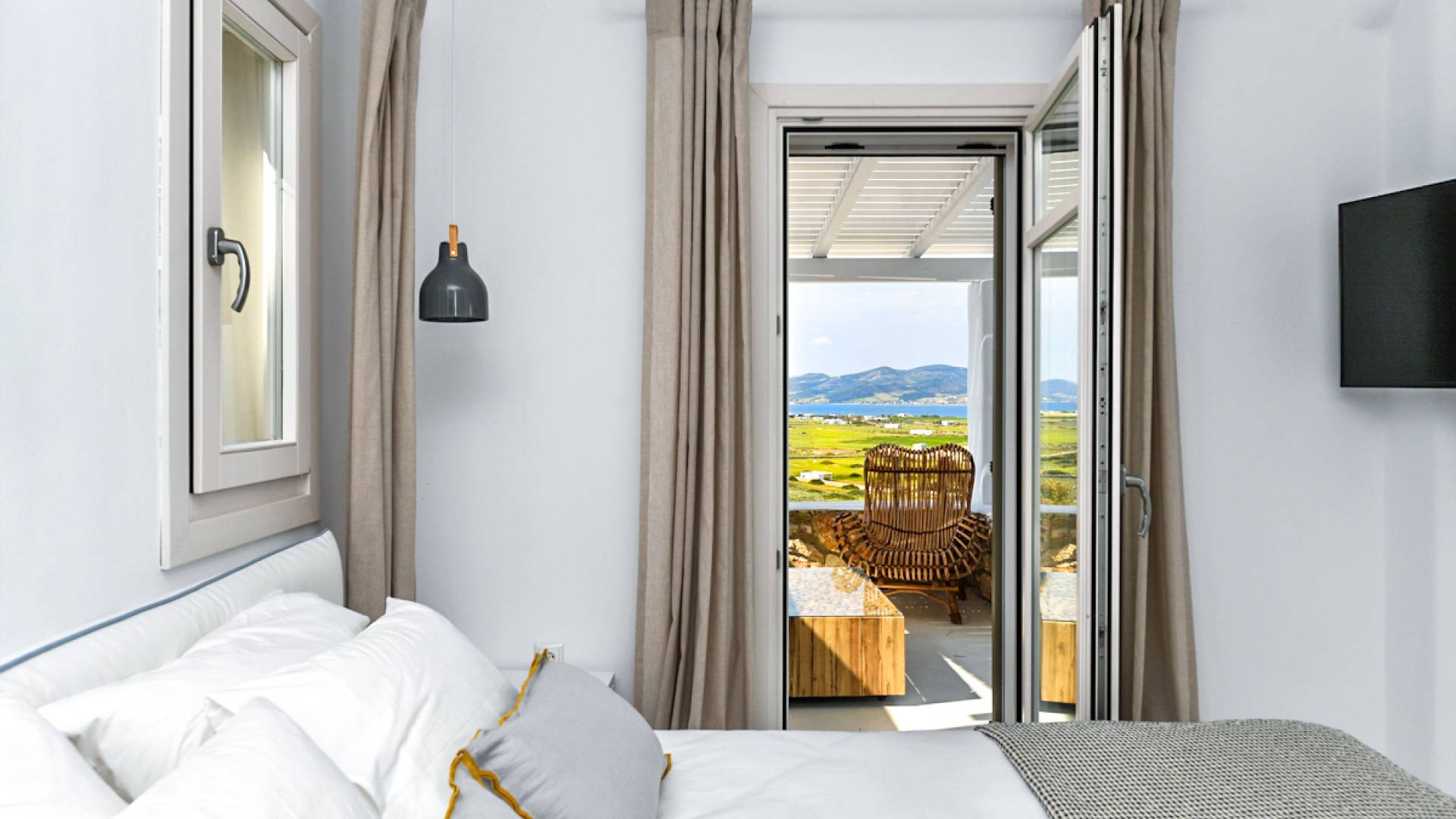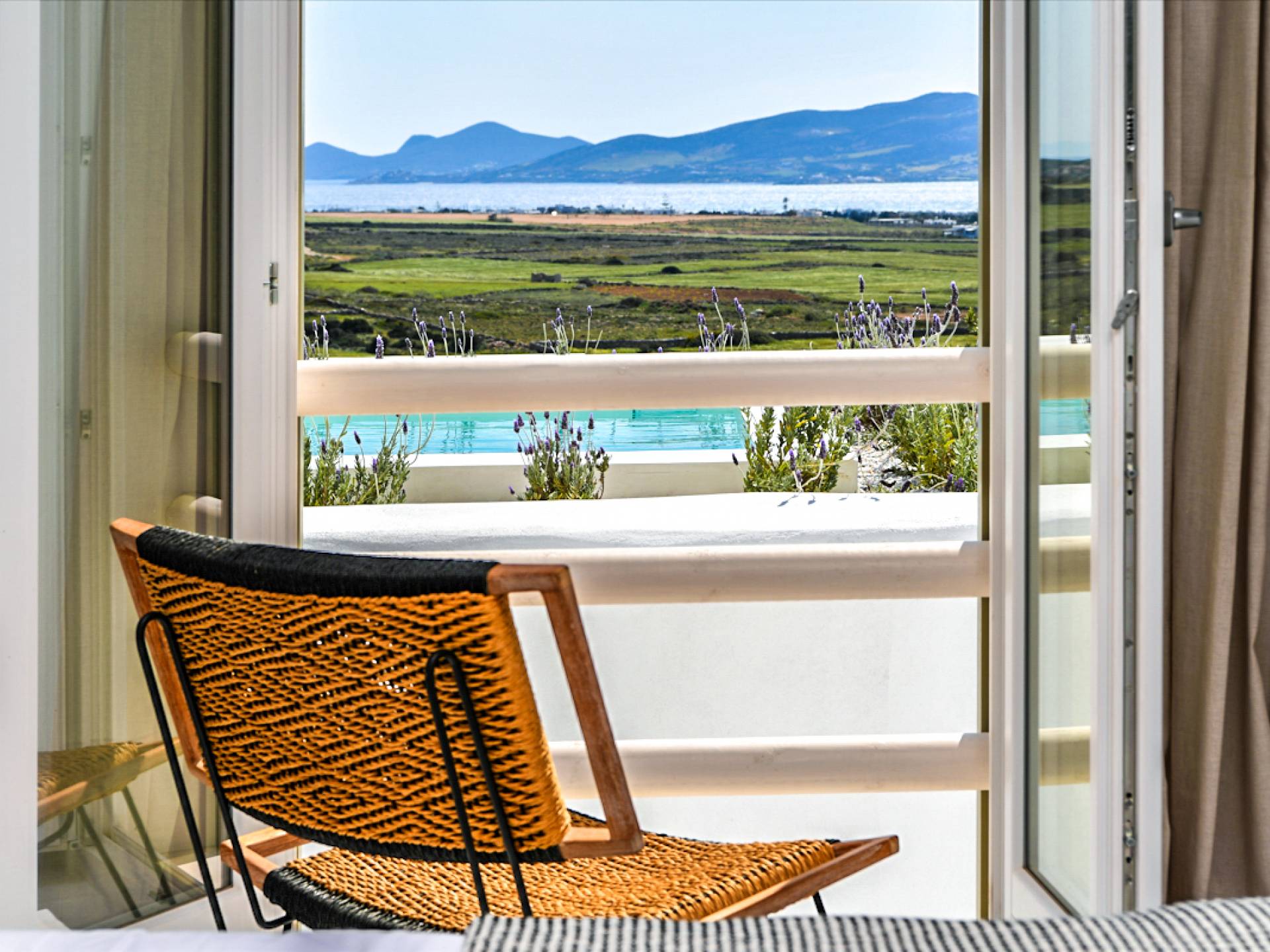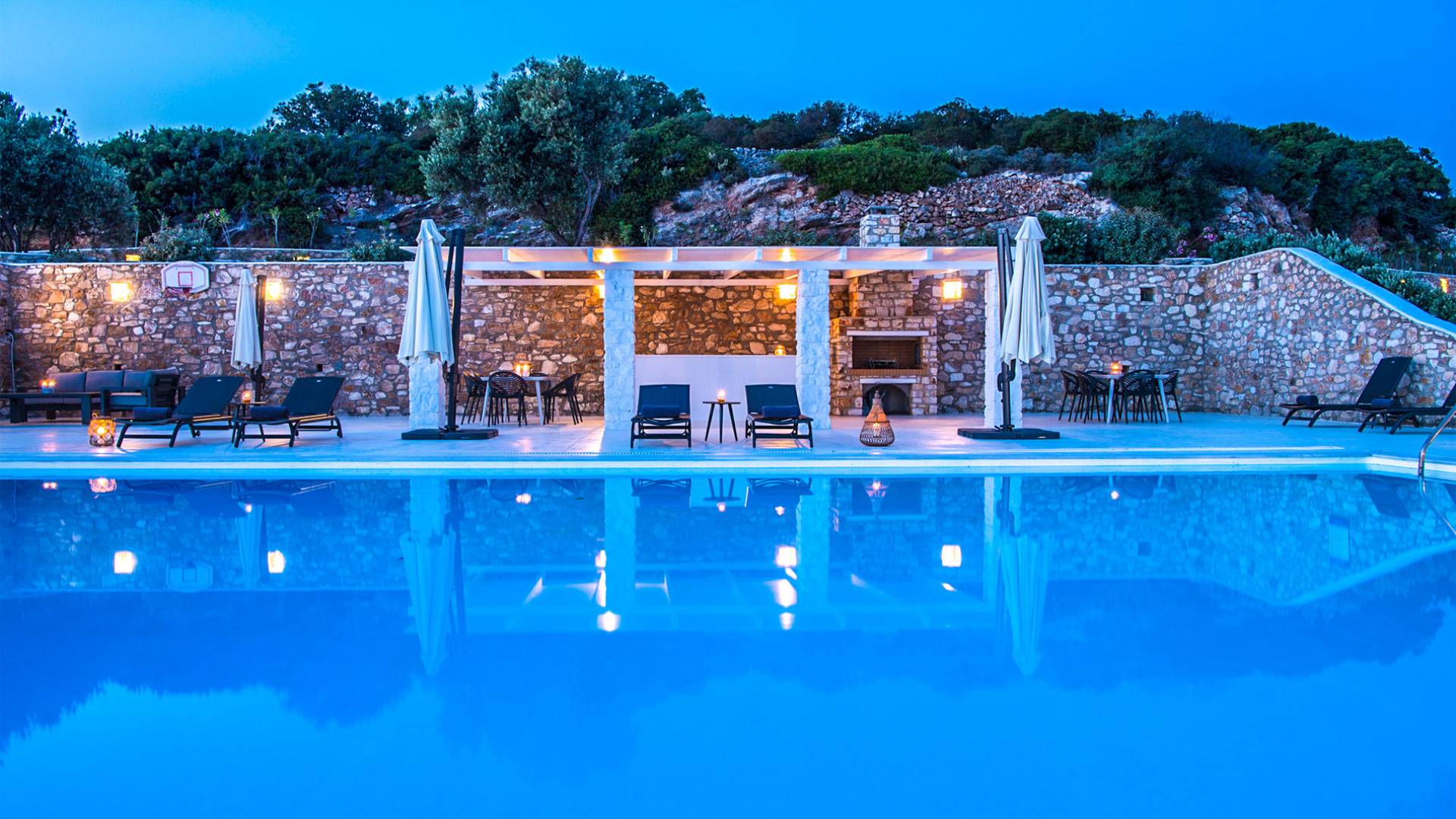 Les espaces extérieurs de Kallirhoe sont le véritable centre de ce paradis. La véranda supérieure entoure la villa du nord au sud et à l'ouest et dispose d'un transat intégré donnant sur Antiparos, d'une salle à manger pour 12 personnes, d'un coin salon pouvant accueillir jusqu'à 12 personnes et d'impressionnantes chaises hamac. La piscine de 14 m² et 1,3 mètre de profondeur est située au niveau des chambres, avec un jacuzzi et un coin salon séparé. Kallirhoe a deux niveaux supplémentaires, l'un conçu pour les rassemblements, composé d'une salle à manger pour 12 personnes et de transats, et d'un paradis privé, totalement à l'abri des regards avec un immense transat pouvant accueillir jusqu'à deux personnes. Kallirhoe dispose de 6 espaces extérieurs séparés et complètement indépendants, à l'abri du soleil et du vent à tout moment.