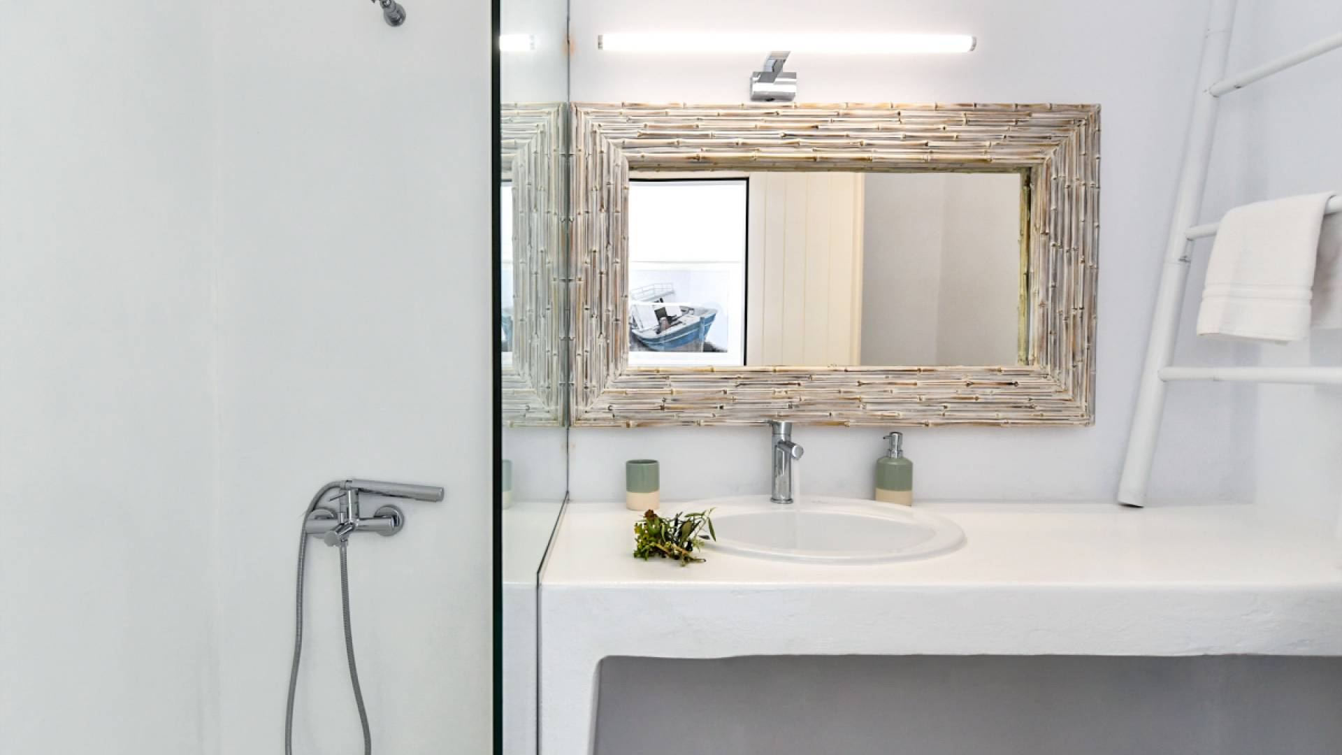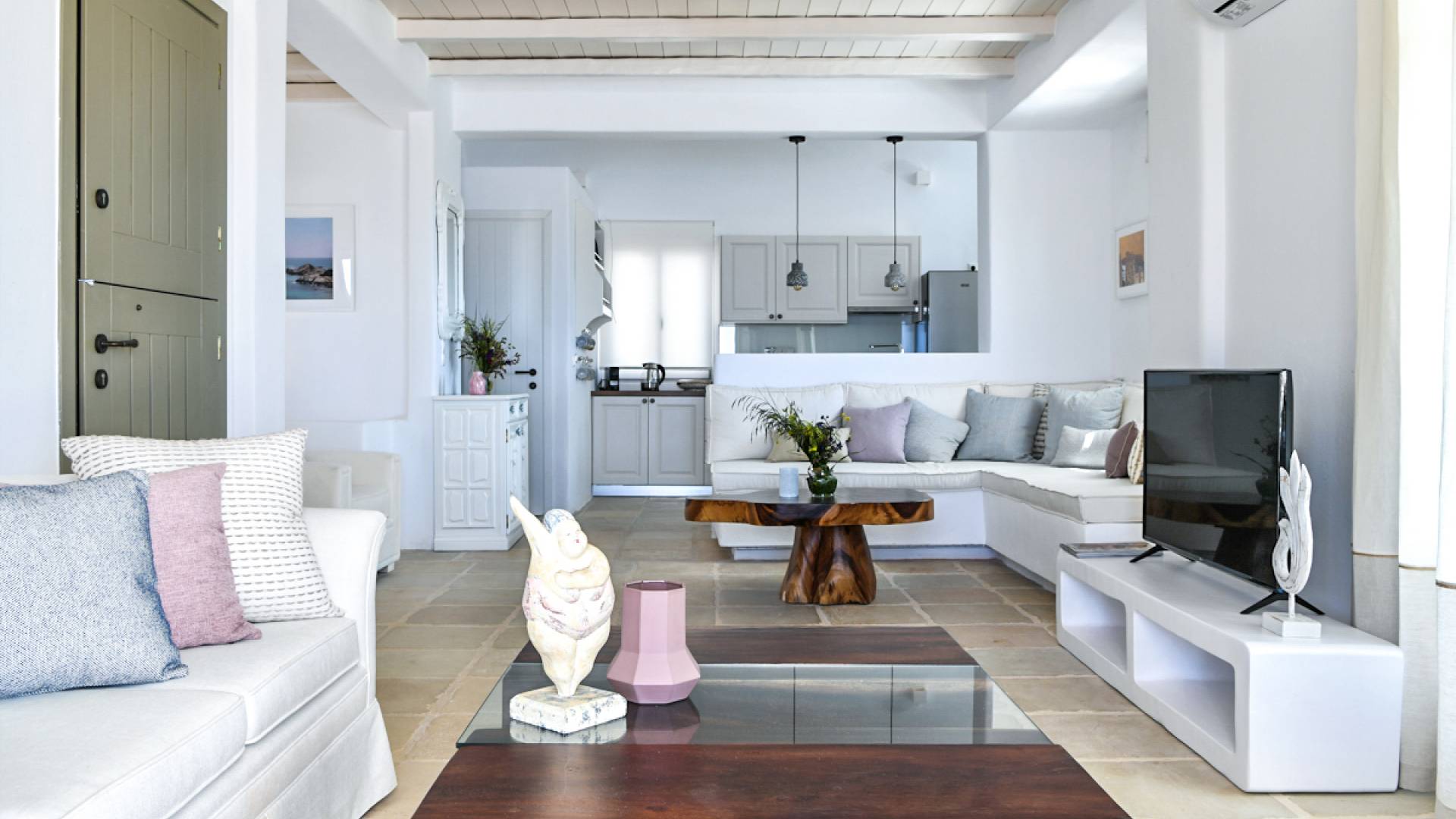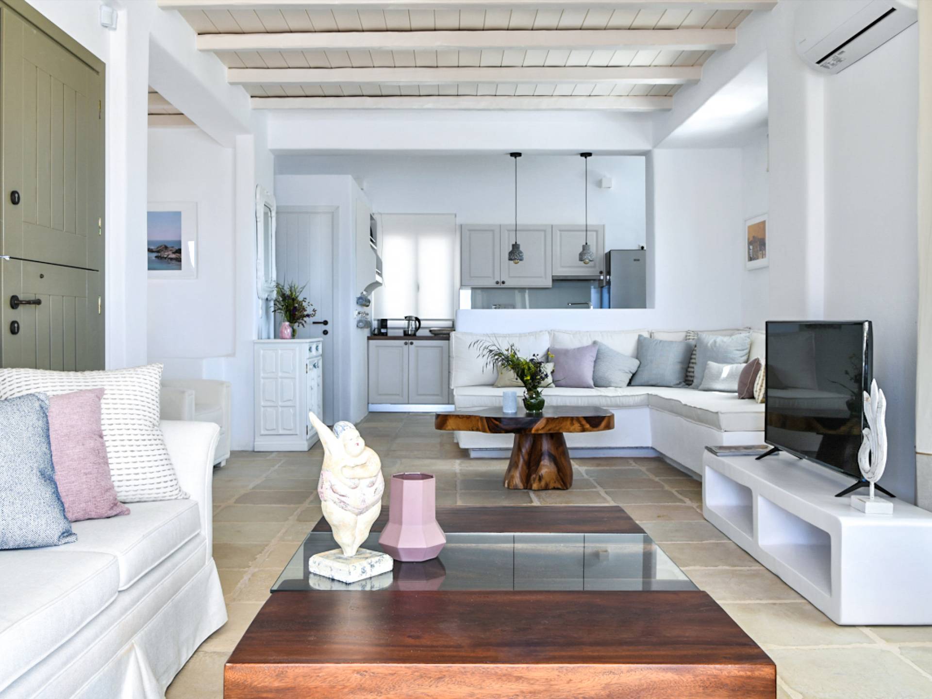 L'ensemble du complexe est construit selon l'architecture cycladique spécialement conçue pour protéger les zones externes et internes de la Meltemia égéenne occasionnelle (vents du nord).