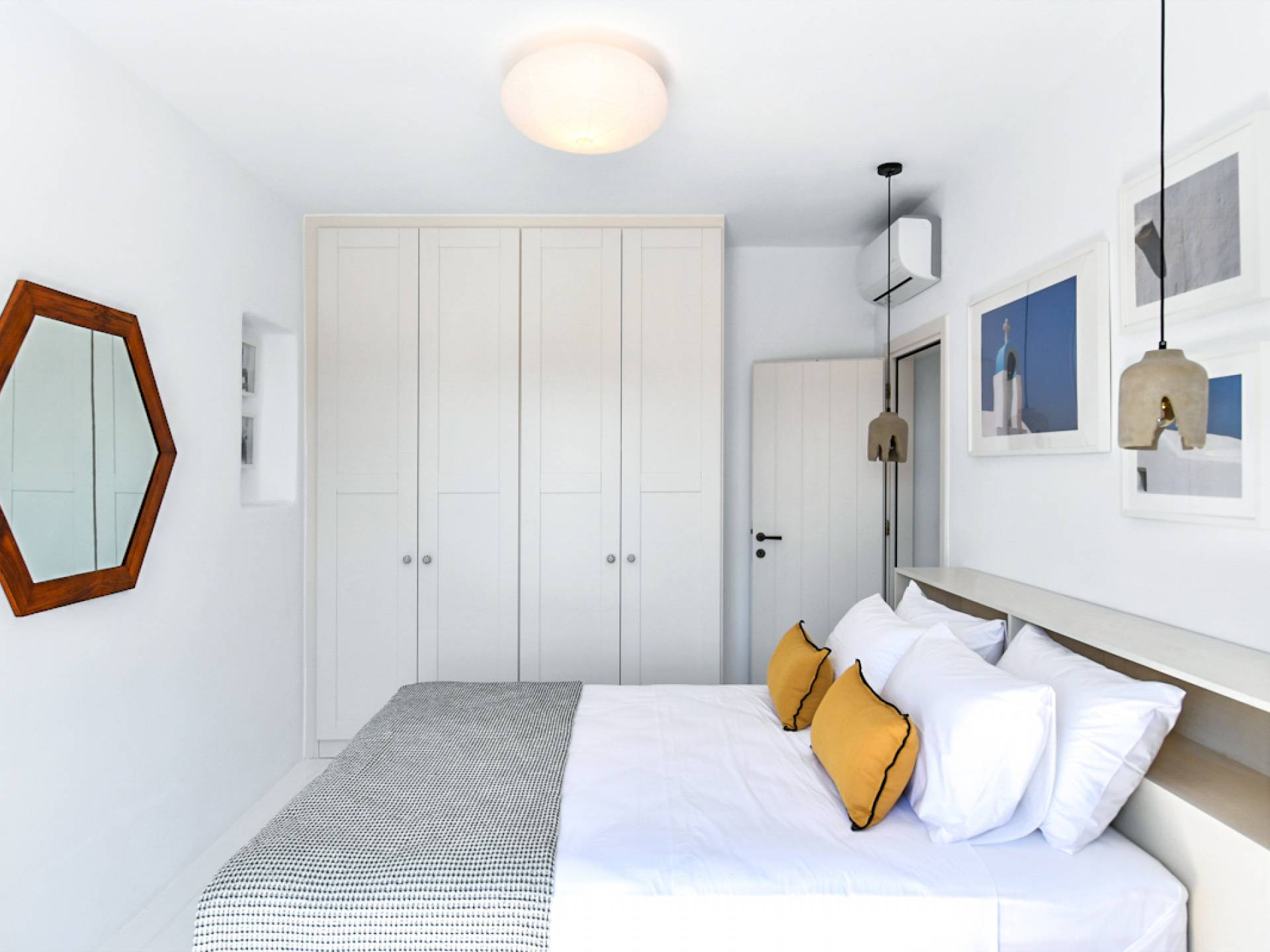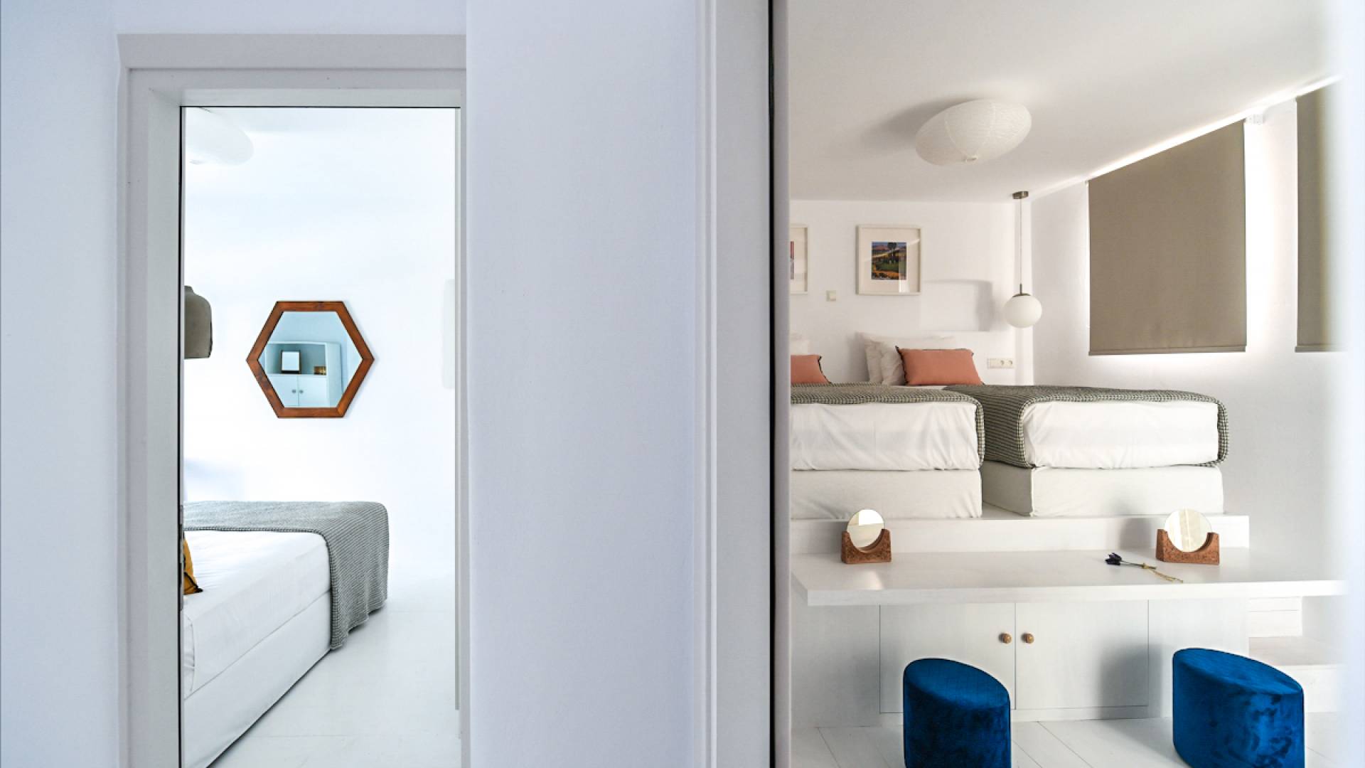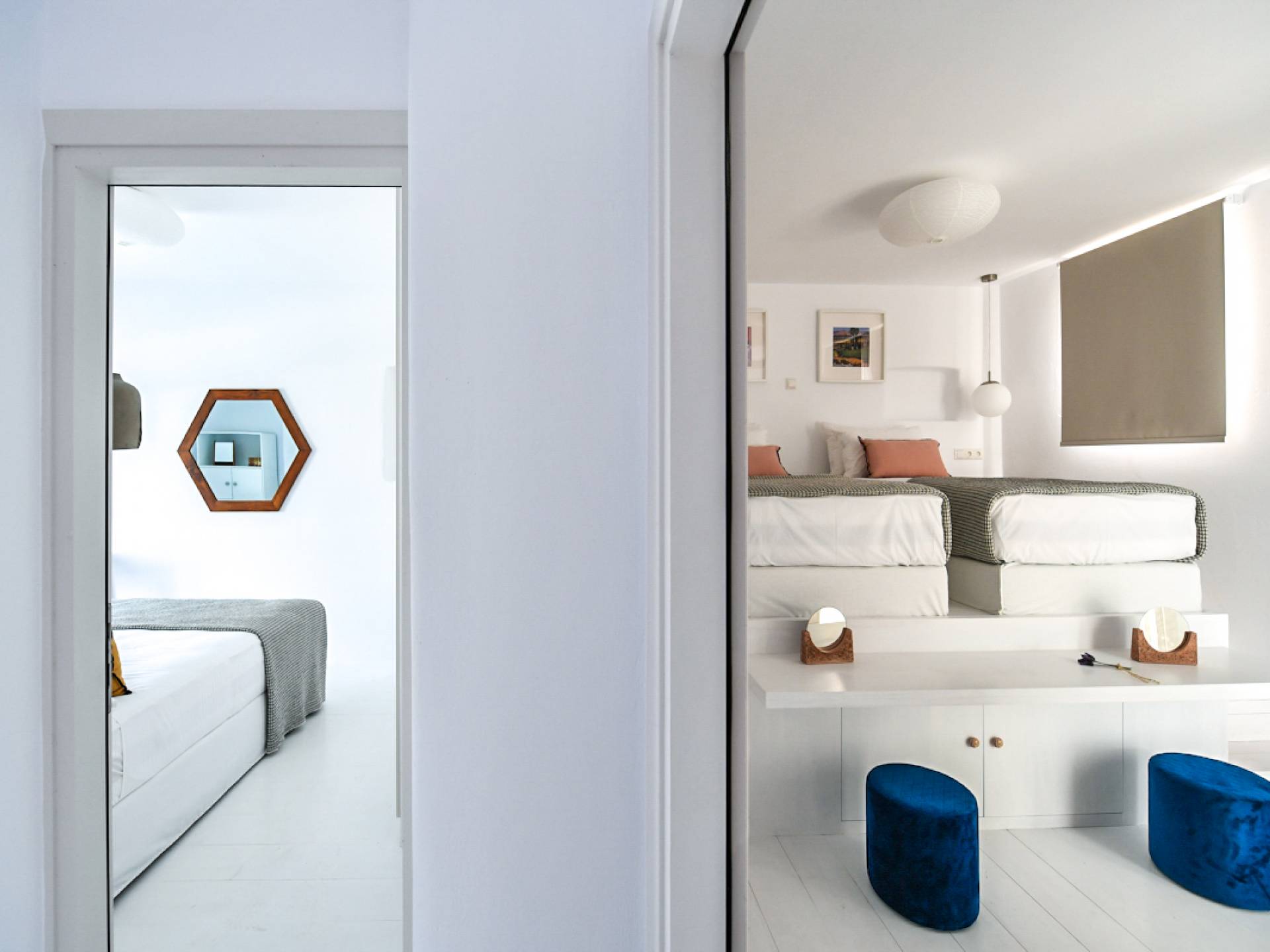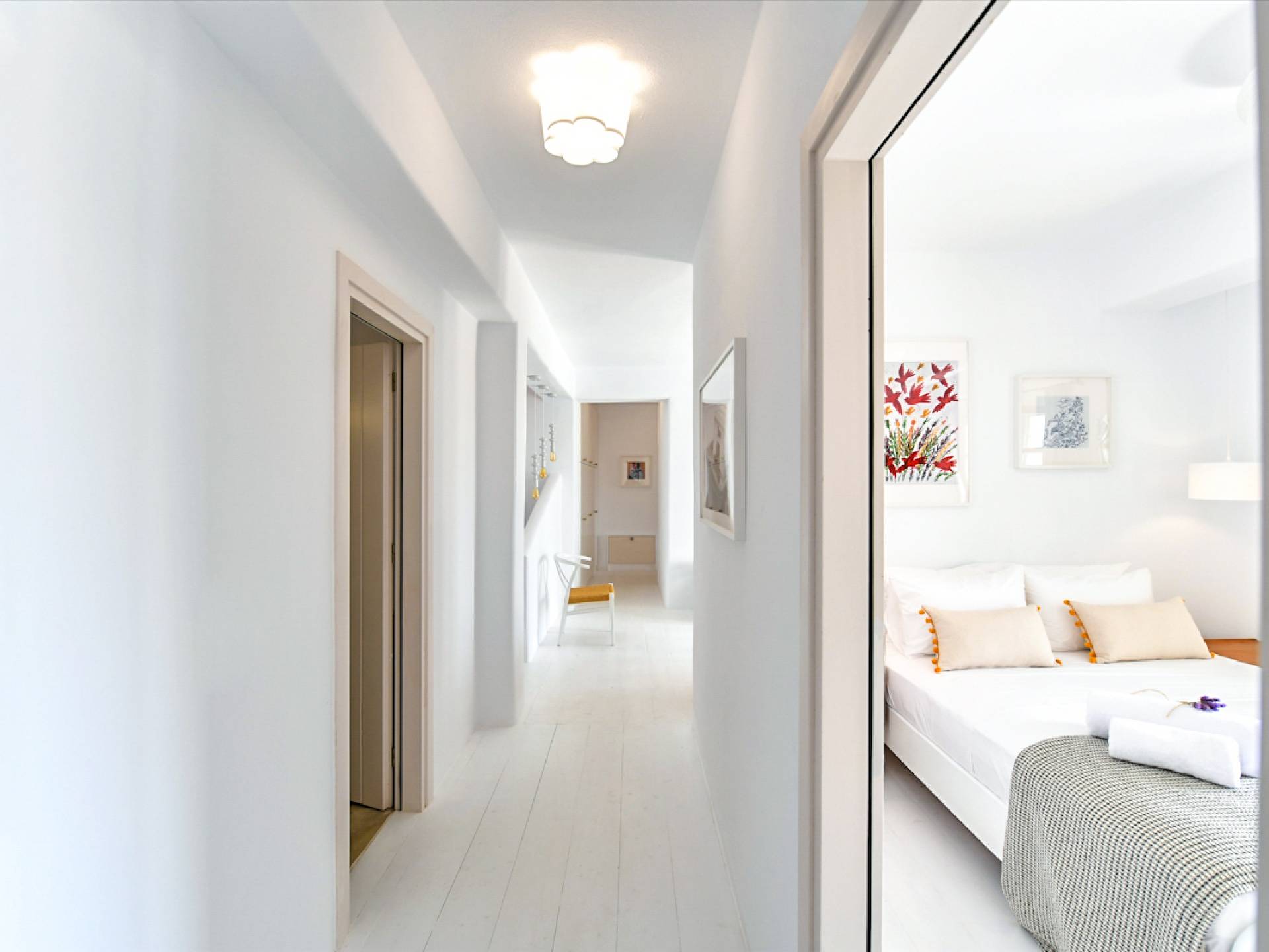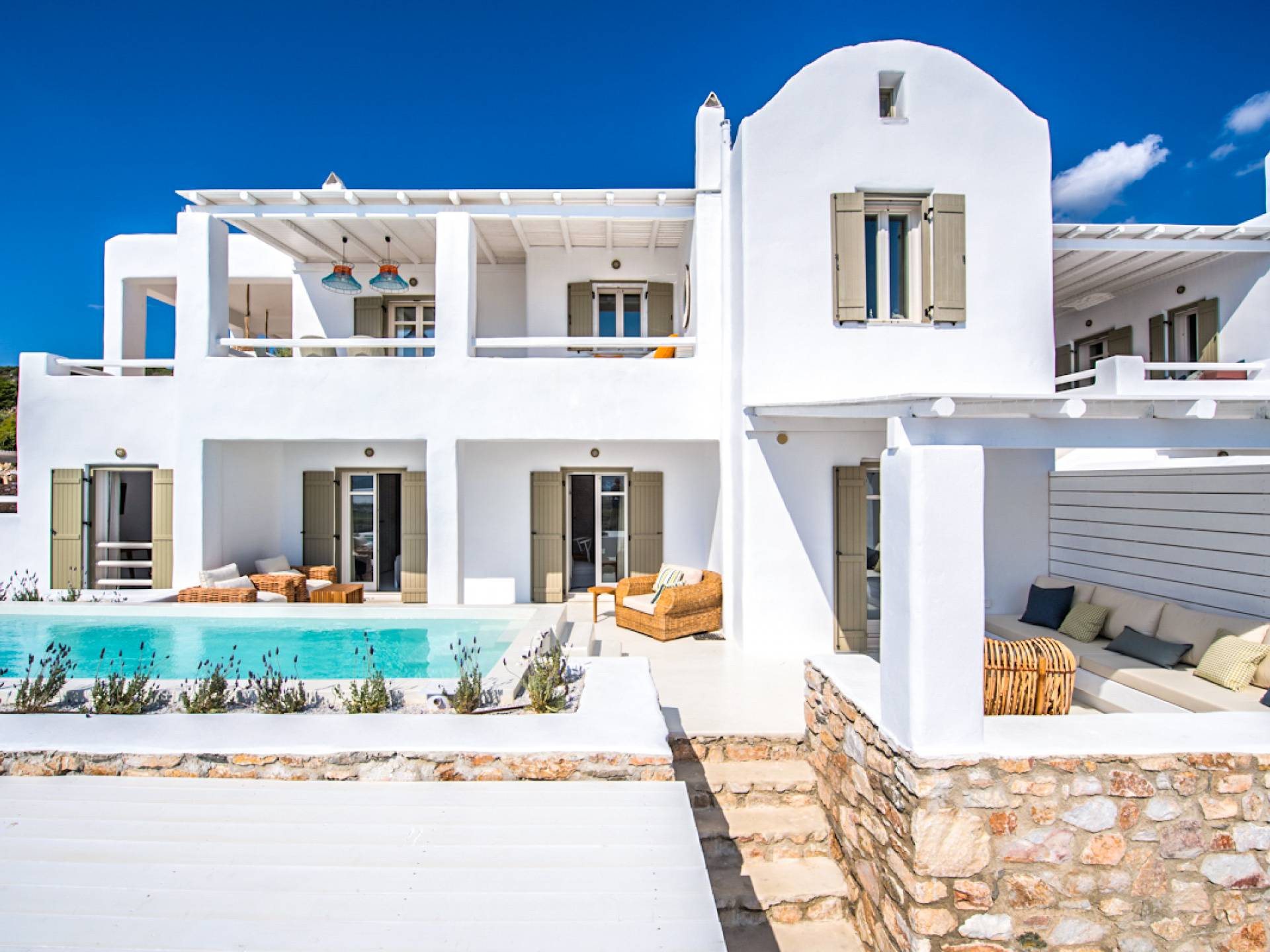 Pour les clients qui souhaitent se détendre dans le luxe et l'intimité, ne cherchez pas plus loin. Les cinq chambres de Khallirhoe sont situées au premier niveau. Un lit queen-size domine la première chambre principale avec une salle de bain attenante et une porte donnant sur le patio. La deuxième chambre a un lit queen-size, une salle de bain attenante et une fenêtre avec une vue imprenable sur la mer. La troisième chambre a des lits jumeaux habillés de draps en coton fin pour assurer un sommeil profond et ininterrompu et une salle de bain attenante. La quatrième chambre a un lit queen-size et un balcon privé meublé avec une vue magnifique. La cinquième chambre a un lit king-size et un balcon. Ces deux chambres partagent une salle de bain complète. Le salon est composé d'un canapé-lit, d'un bureau d'ordinateur, d'une armoire commune, d'un espace de rangement et d'une buanderie. La Kallirhoe Villa est la maison loin de chez vous que vous souhaiterez ne jamais quitter.