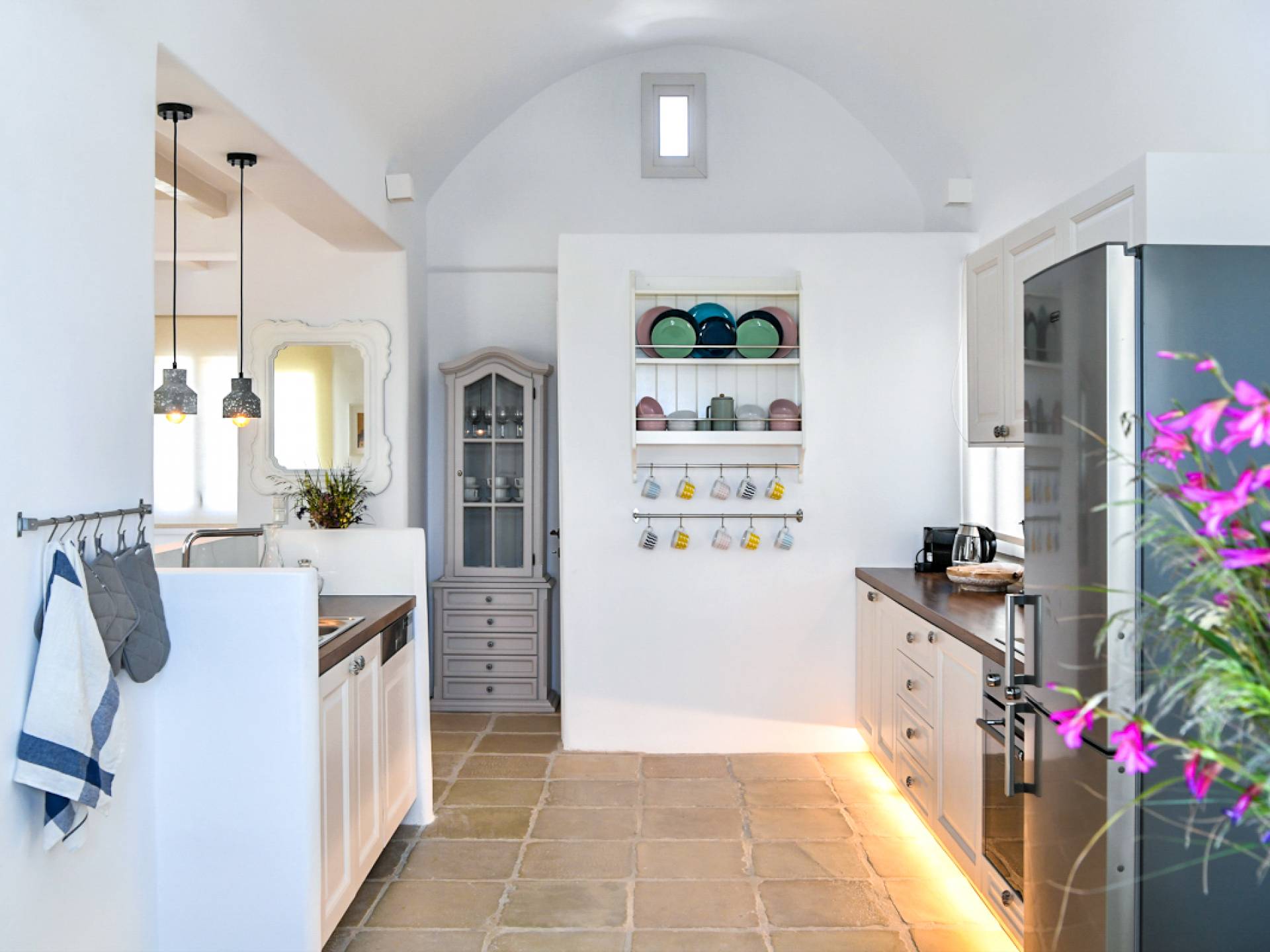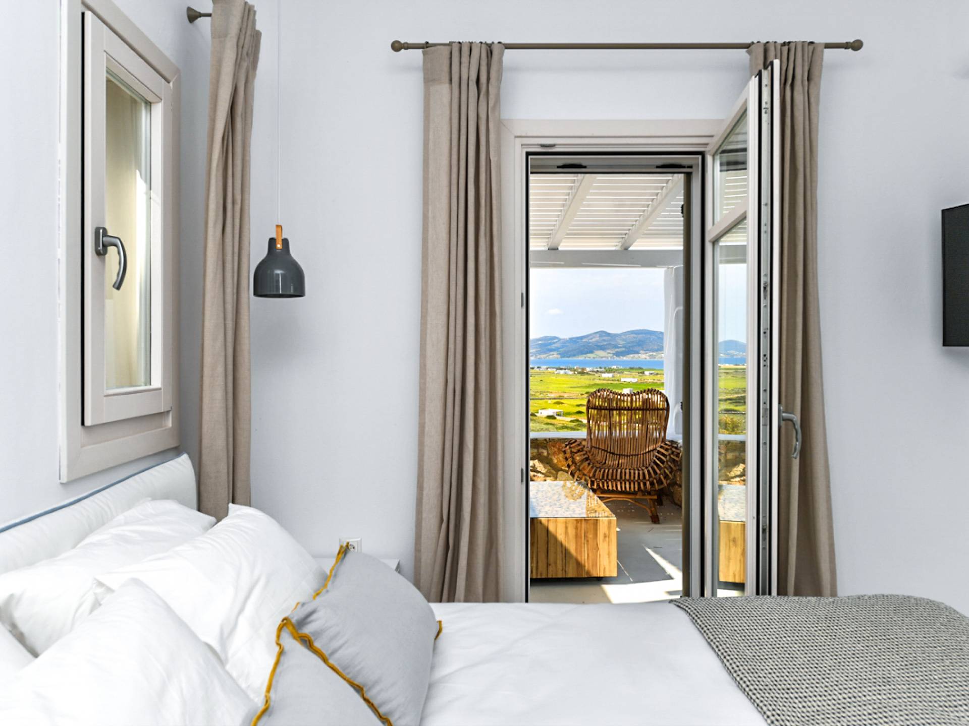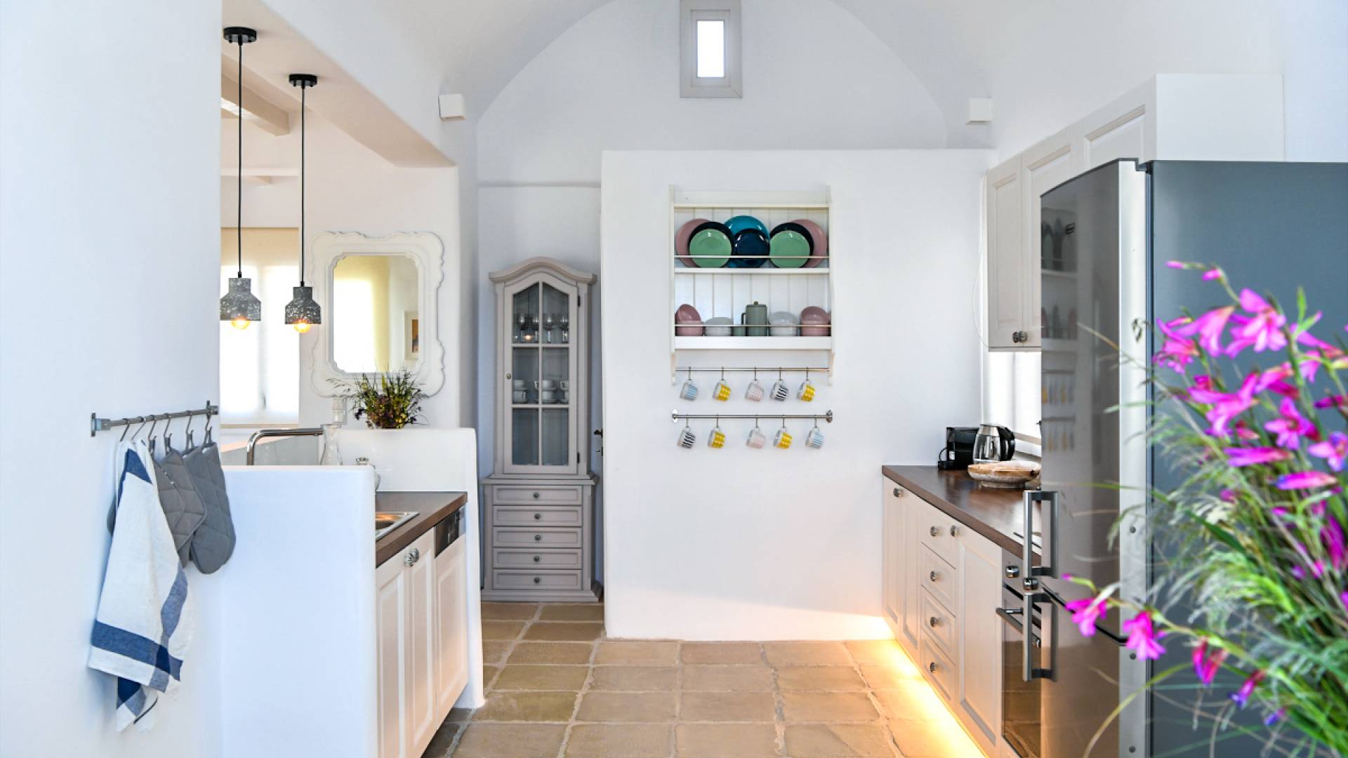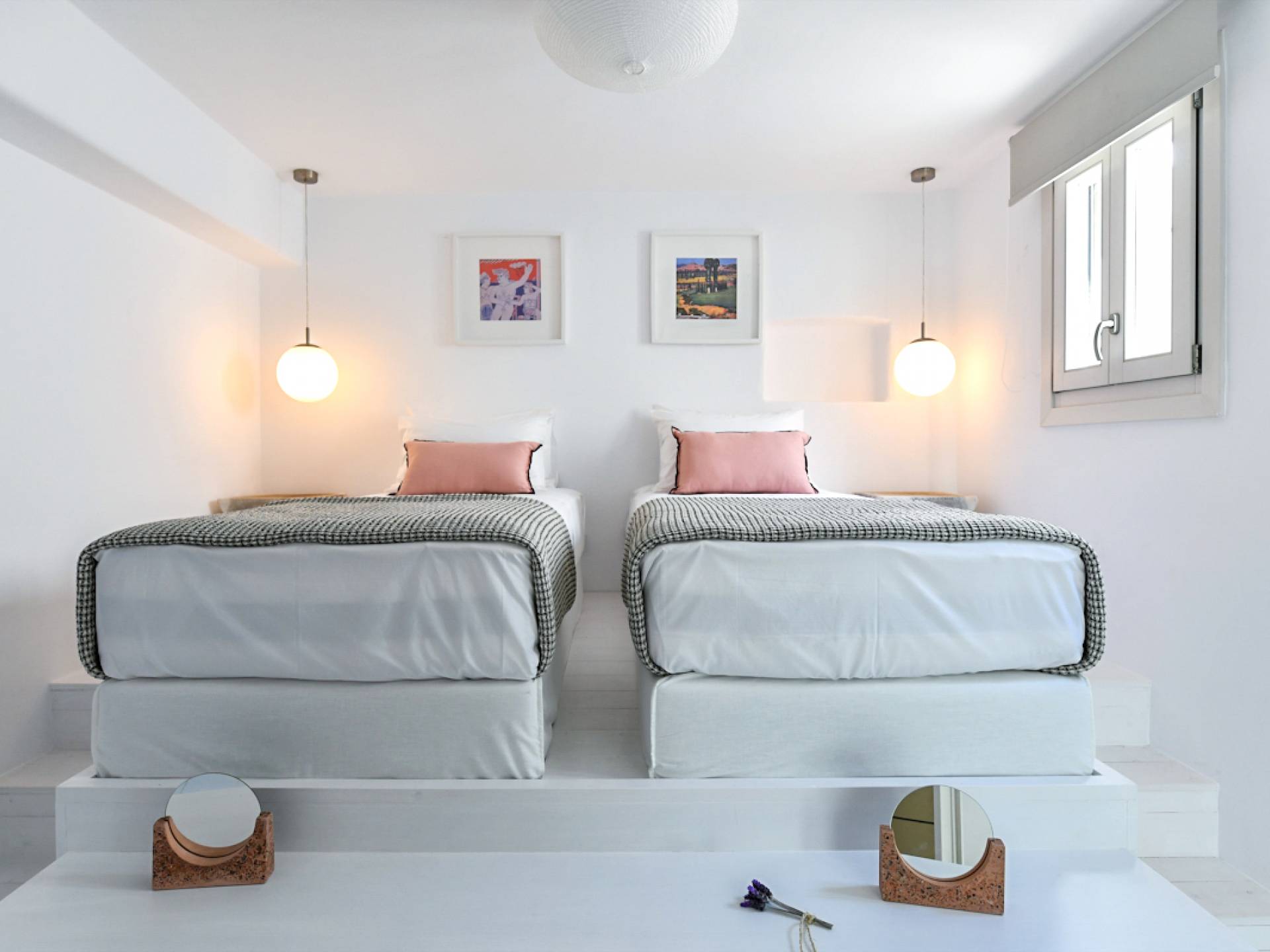 Pour les clients qui souhaitent se détendre dans le luxe et l'intimité, ne cherchez pas plus loin. Les cinq chambres de Khallirhoe sont situées au premier niveau. Un lit queen-size domine la première chambre principale avec une salle de bain attenante et une porte donnant sur le patio. La deuxième chambre a un lit queen-size, une salle de bain attenante et une fenêtre avec une vue imprenable sur la mer. La troisième chambre a des lits jumeaux habillés de draps en coton fin pour assurer un sommeil profond et ininterrompu et une salle de bain attenante. La quatrième chambre a un lit queen-size et un balcon privé meublé avec une vue magnifique. La cinquième chambre a un lit king-size et un balcon. Ces deux chambres partagent une salle de bain complète. Le salon est composé d'un canapé-lit, d'un bureau d'ordinateur, d'une armoire commune, d'un espace de rangement et d'une buanderie. La Kallirhoe Villa est la maison loin de chez vous que vous souhaiterez ne jamais quitter.
