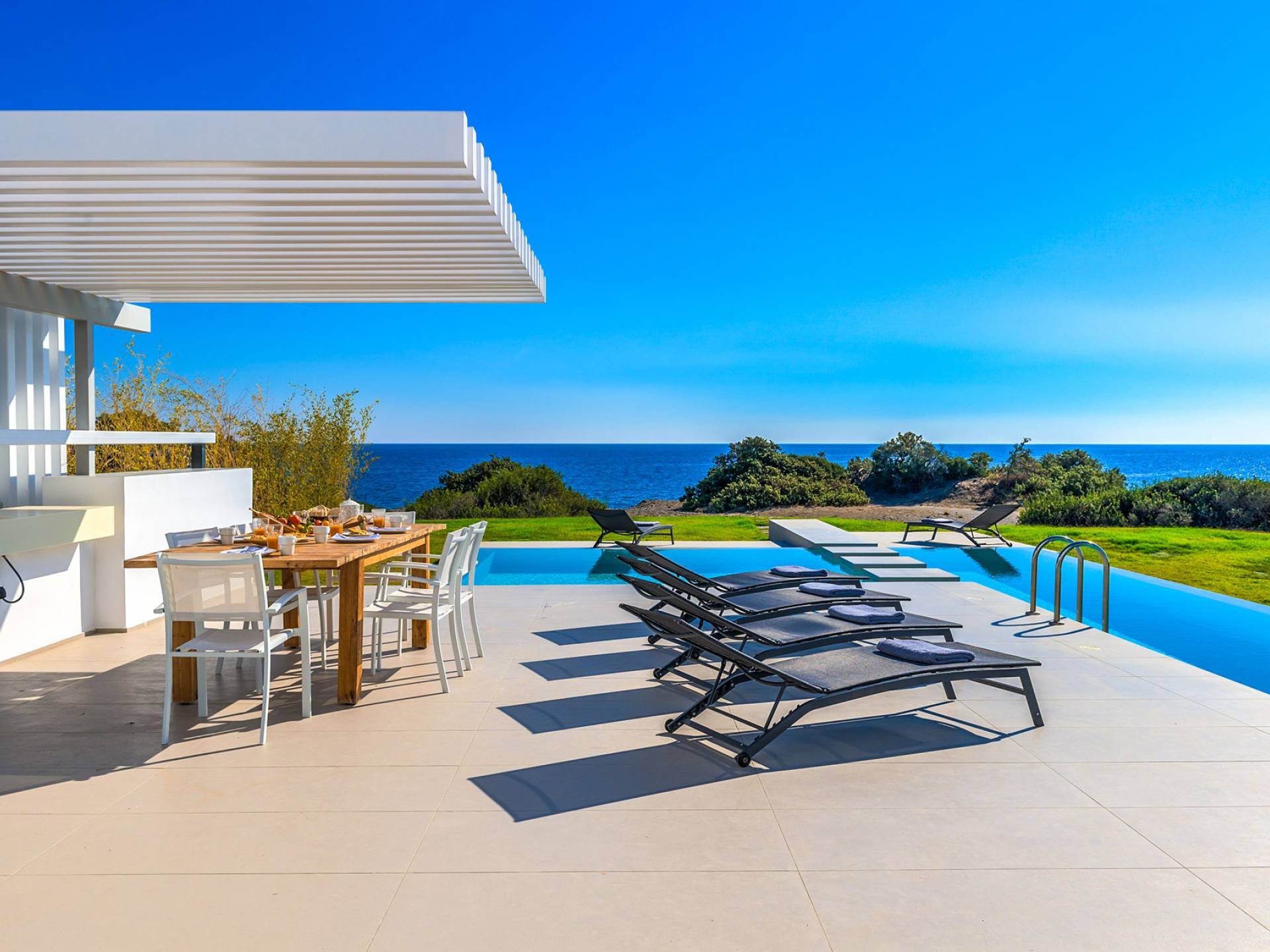 La Royal Albatross Villa est tout aussi impressionnante à l'extérieur où le jardin dispose d'une grande terrasse avec vue panoramique sur la mer, équipée d'un barbecue et d'un coin repas idéal pour les soirées en famille et entre amis. Il propose également une grande piscine d'eau salée, équipée de chaises longues et de parasols pour que vous puissiez profiter des chaudes journées d'été dont Rhodes a été bénie.