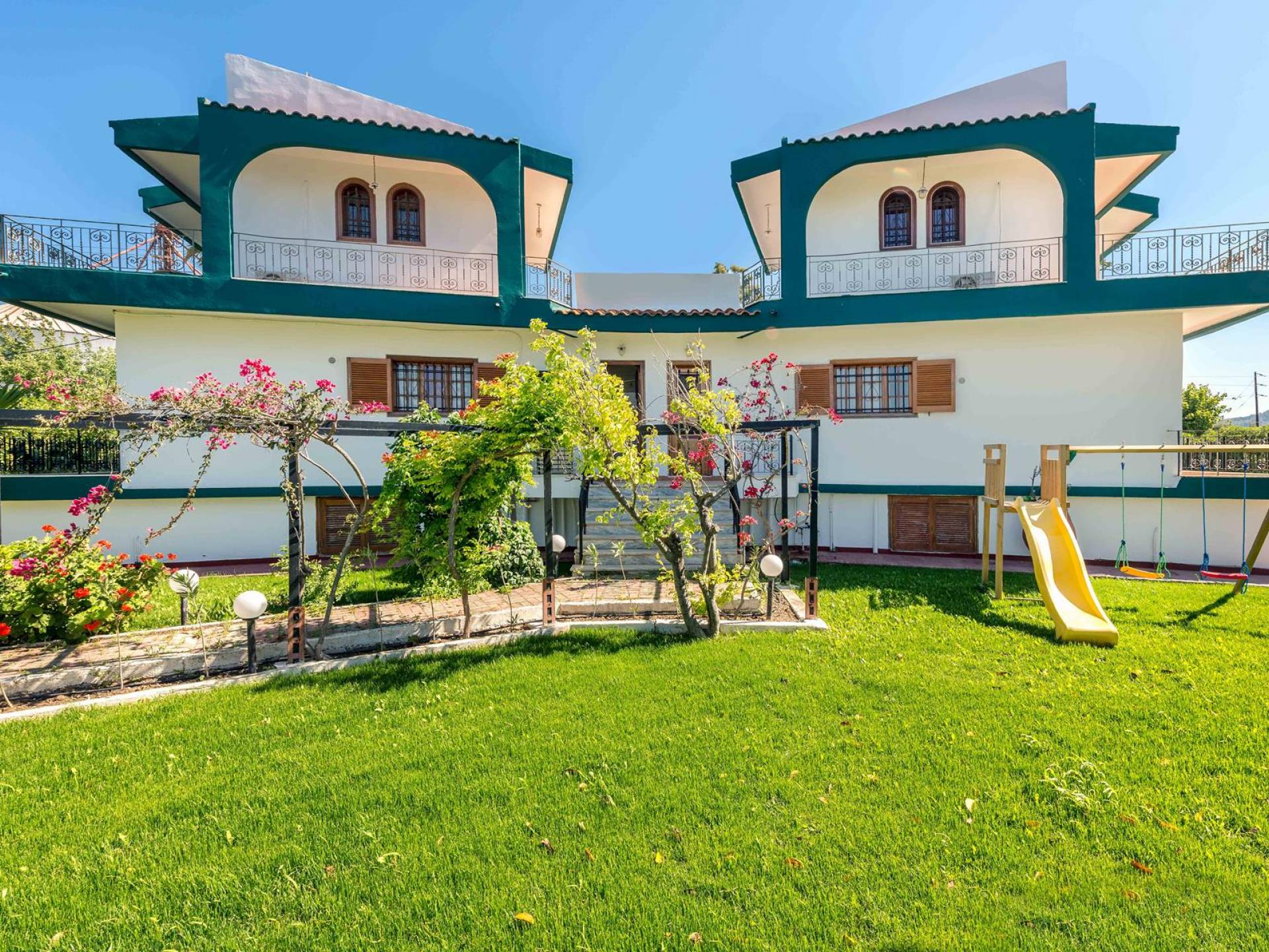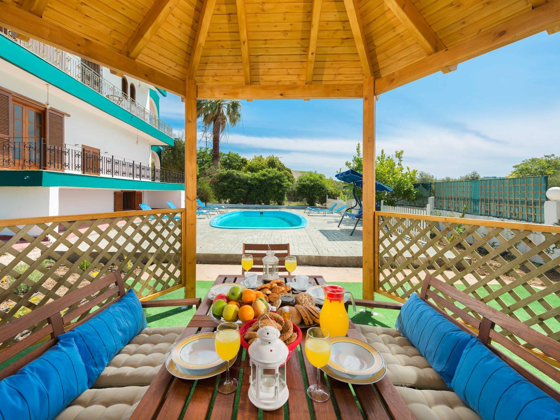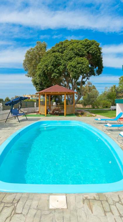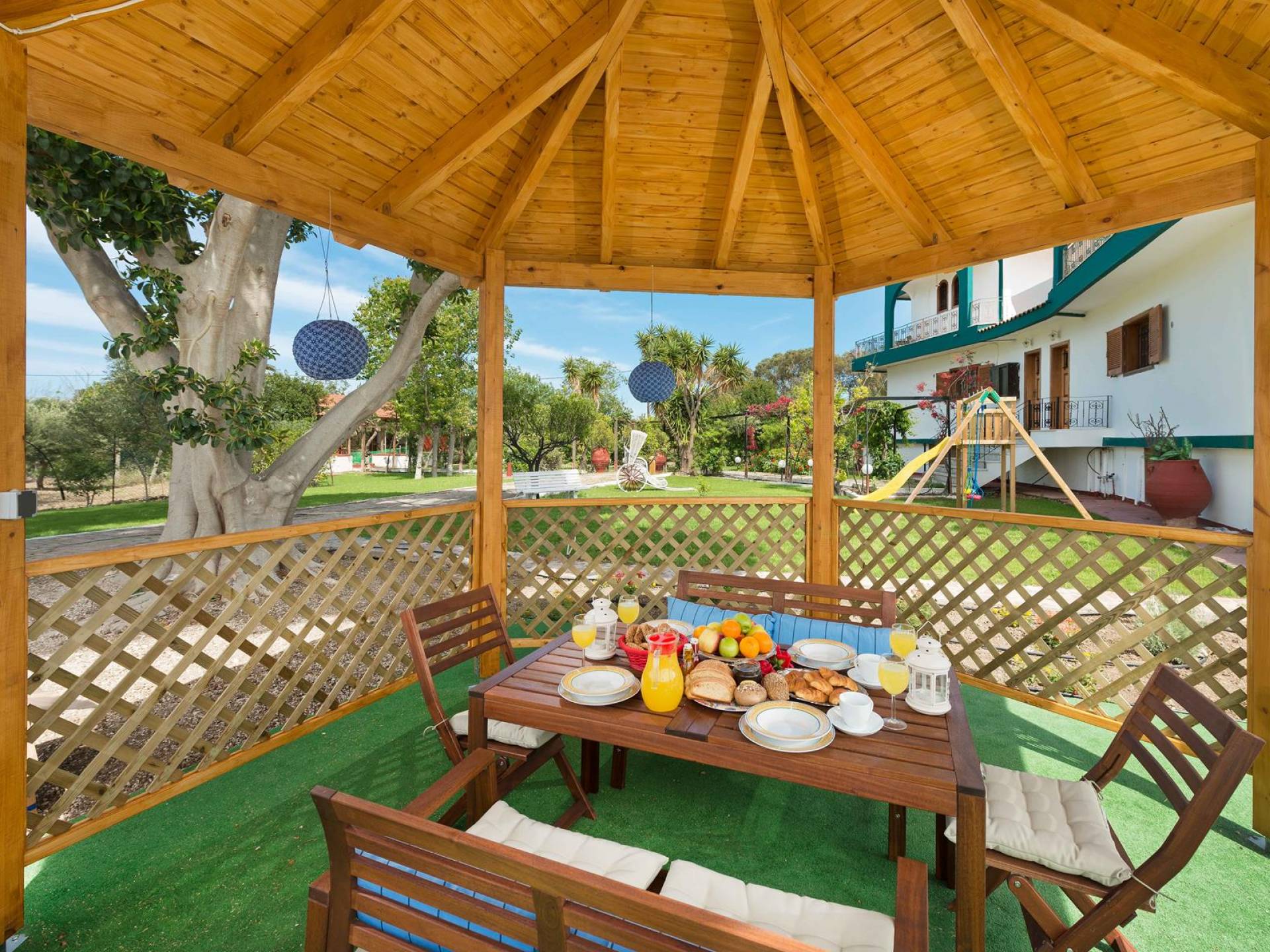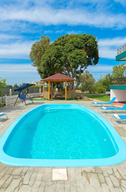 Marianna Villa 1 Rhodes dispose d'un grand jardin de 600m2 avec une piscine privée de 32 m2. Il y a un kiosque en bois près de la piscine avec une table à manger, où vous pourrez prendre votre repas ou vous détendre avec un livre. Nos plus jeunes pourront y jouer avec nos jeux de société. Dans la zone de la piscine, il y a des meubles de salon. En vue de la piscine et du belvédère, il y a une toute nouvelle aire de jeux, faite de bois et de couleurs vertes et adaptée aux enfants de 6 mois à 12 ans. Ainsi, les parents peuvent profiter de moments de détente au bord de la piscine tout en surveillant leurs enfants. La zone est clôturée. Un barbecue et un four à bois sont également disponibles. Des soirées spéciales avec des plats traditionnels rhodiens cuits au four à bois peuvent être organisées pour vous.